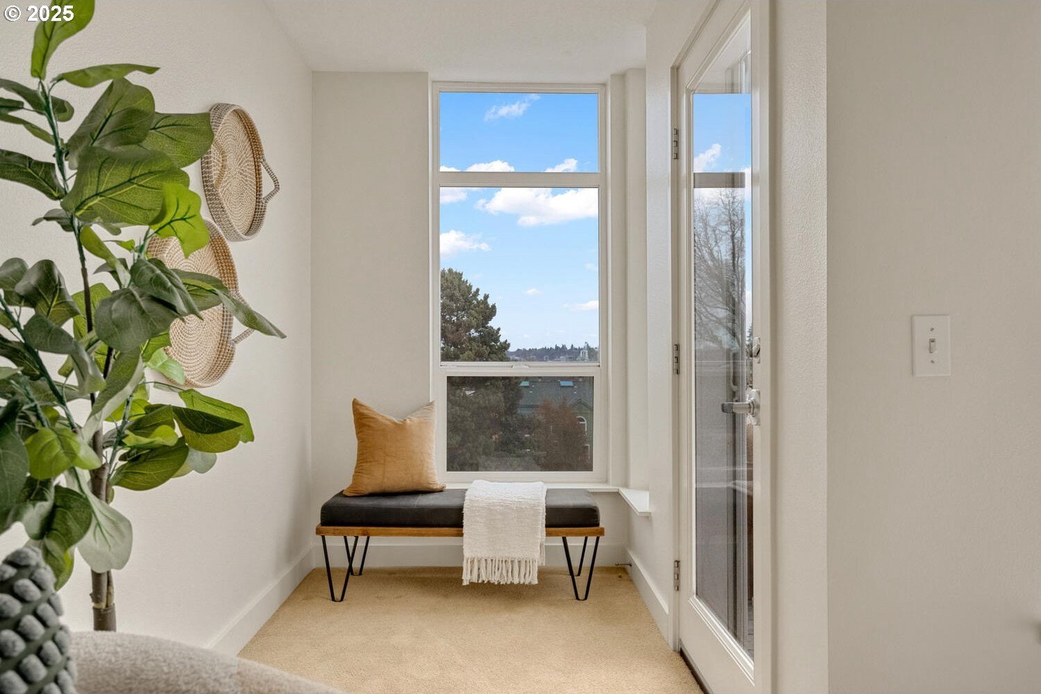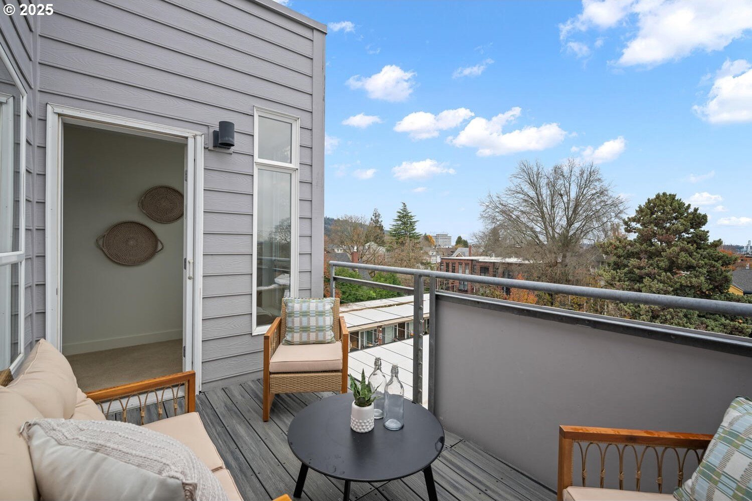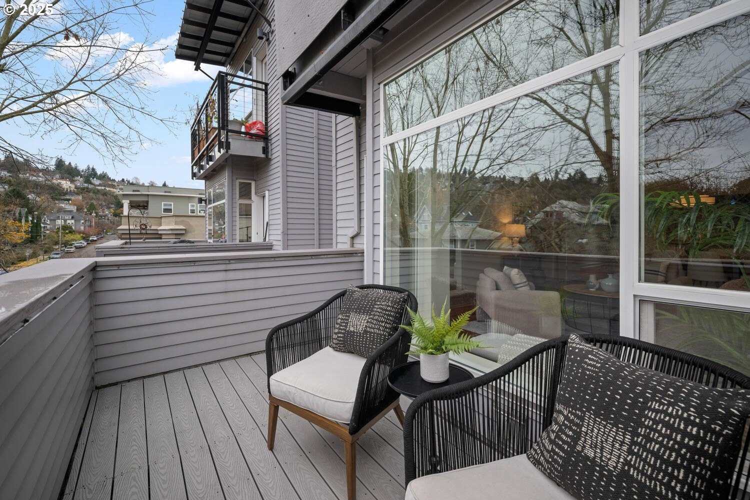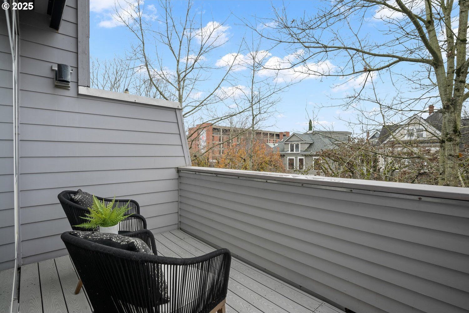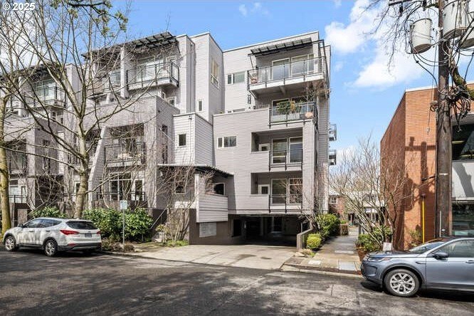 Welcome to this penthouse-level condo in Northrup Commons. Definitely not a "cookie cutter" floor plan, this unique unit offers both south and north exposures, 3 private balconies, its own dedicated common-area alcove and has extensive custom updates.Designed by award-winning Sienna Architects, led by Gary Reddick, known locally & internationally for a diverse portfolio. Sunlight pours in the 19 ft of front windows illuminating the 2 floors of living areas.Interior Designer Karen Karns orchestrated updates to the kitchens and baths with an eye to efficiency, style and pleasing coastal colors in the hand selected glass, tile and pentalquartz. Stainless steel Jenn-air appliances, rare African Anige custom cabinets, & specialty lighting are a refreshing departure from the ordinary. Contractor William Ballard oversaw the permitted to-the-studs kitchen and primary bath remodels in 2016. They also teamed up on the luxurious primary bath with gorgeous tilework, a spacious walk-in shower and heated tile floor. Recent updates include refinished #1 grade cherry floors, interior paint, high quality carpet, Trane furnace, heat pump for cooling and new light fixtures. The main floor bedroom includes a half bath and is open to the hall, ideal as a guest bedroom, media room or library. This condo enjoys a connection to the outdoors from it's 3 decks- each with differing views that provide 3 different microclimates for plants & varying temperatures throughout the day- North to Mt St Helens and the Fremont Bridge and South to cityscape, historic neighborhood homes & the West Hills. In the heart of Portland's NW District with a walk score of 98, you can leave the car in the garage and explore NW 23rd, shopping at New Seasons and Trader Joe's, coffee shops, cafes & local parks. Take the streetcar or MAX. Northrup Commons stands as a model of integration & stainability creating much-needed housing through mindful planning.This is the carefree urban lifestyle you've been dreaming about.
