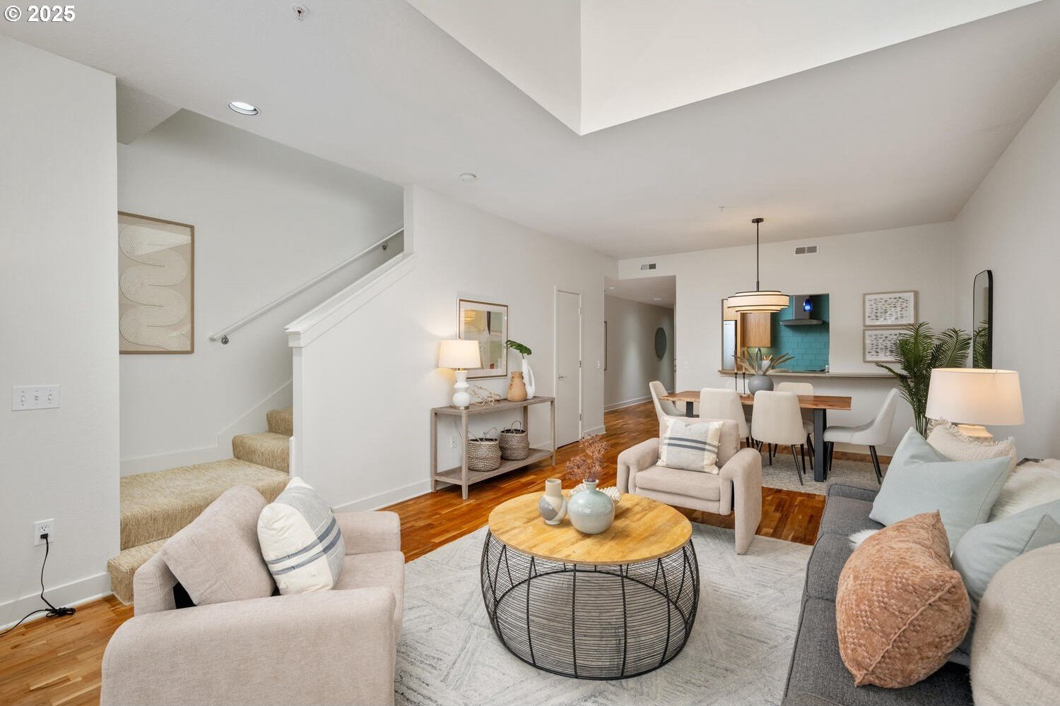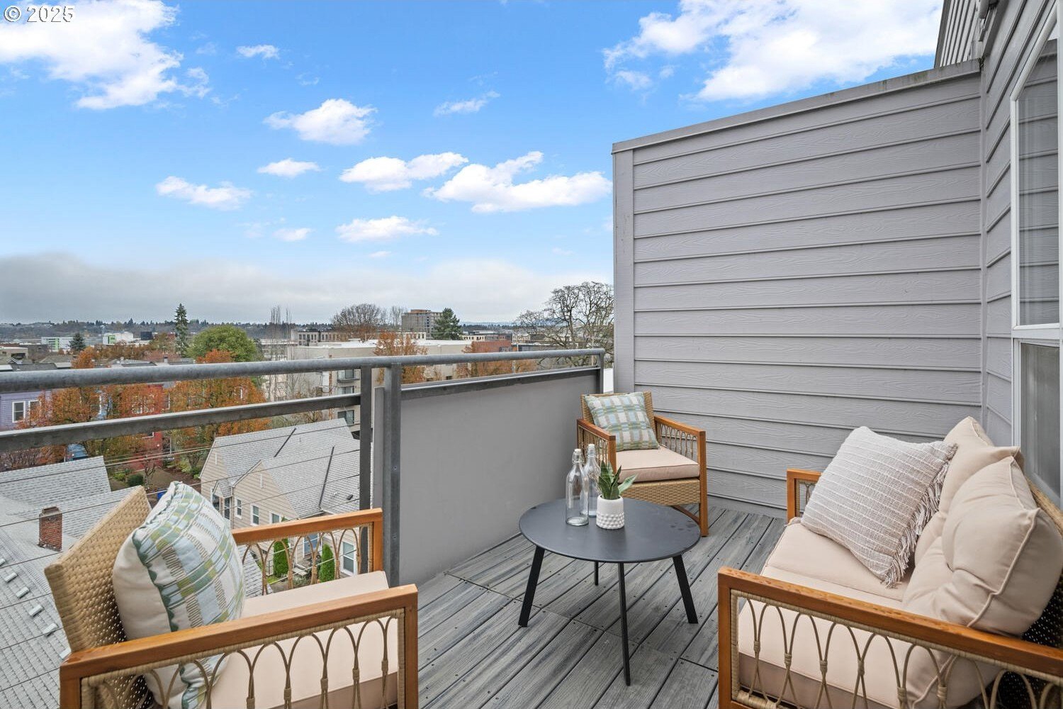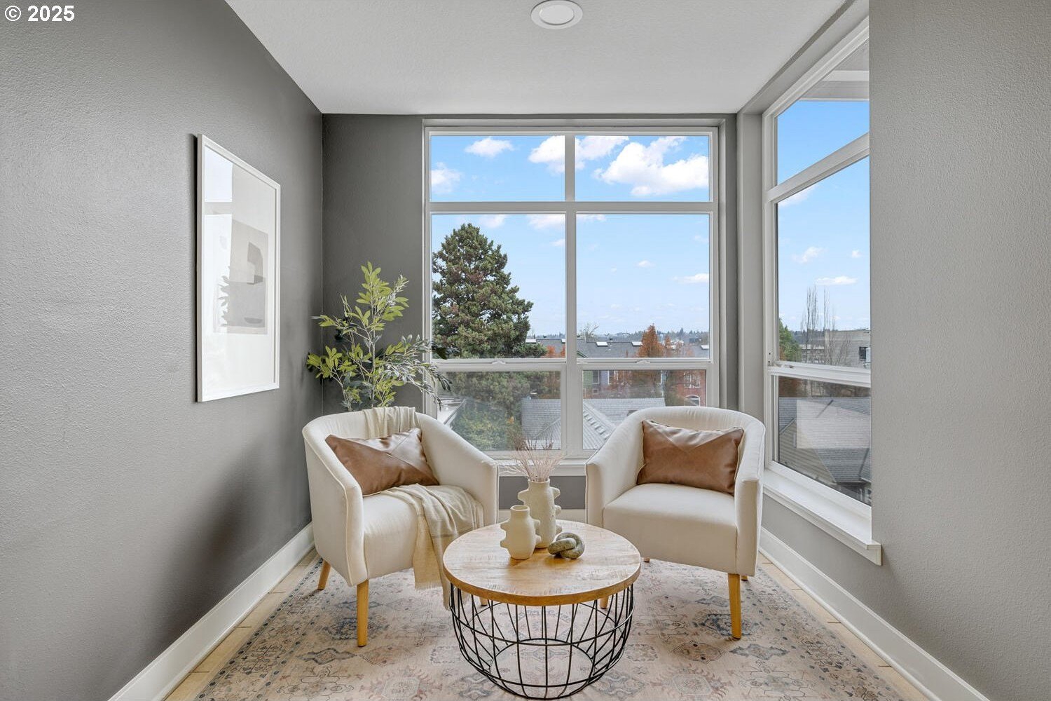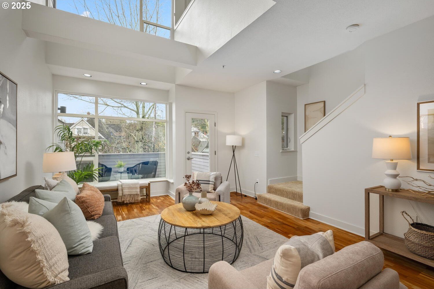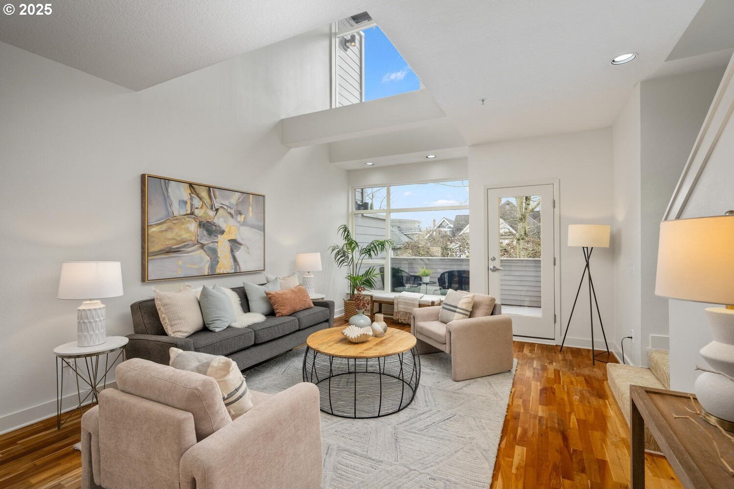 Welcome to this penthouse-level condo in Northrup Commons. Definitely not a "cookie cutter" floor plan, this unique unit offers both south and north exposures, 3 private balconies, its own dedicated common-area alcove and has extensive custom updates.Designed by award-winning Sienna Architects, led by Gary Reddick, known locally & internationally for a diverse portfolio. Sunlight pours in the 19 ft of front windows illuminating the 2 floors of living areas.Interior Designer Karen Karns orchestrated updates to the kitchens and baths with an eye to efficiency, style and pleasing coastal colors in the hand selected glass, tile and pentalquartz. Stainless steel Jenn-air appliances, rare African Anige custom cabinets, & specialty lighting are a refreshing departure from the ordinary. Contractor William Ballard oversaw the permitted to-the-studs kitchen and primary bath remodels in 2016. They also teamed up on the luxurious primary bath with gorgeous tilework, a spacious walk-in shower and heated tile floor. Recent updates include refinished #1 grade cherry floors, interior paint, high quality carpet, Trane furnace, heat pump for cooling and new light fixtures. The main floor bedroom includes a half bath and is open to the hall, ideal as a guest bedroom, media room or library. This condo enjoys a connection to the outdoors from it's 3 decks- each with differing views that provide 3 different microclimates for plants & varying temperatures throughout the day- North to Mt St Helens and the Fremont Bridge and South to cityscape, historic neighborhood homes & the West Hills. In the heart of Portland's NW District with a walk score of 98, you can leave the car in the garage and explore NW 23rd, shopping at New Seasons and Trader Joe's, coffee shops, cafes & local parks. Take the streetcar or MAX. Northrup Commons stands as a model of integration & stainability creating much-needed housing through mindful planning.This is the carefree urban lifestyle you've been dreaming about.