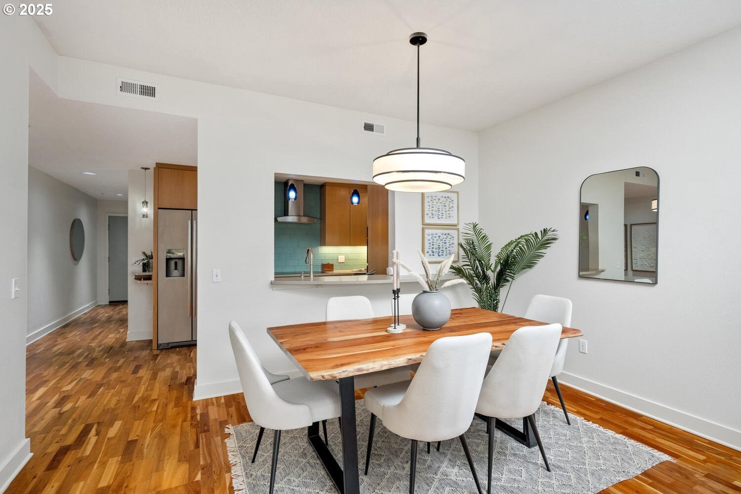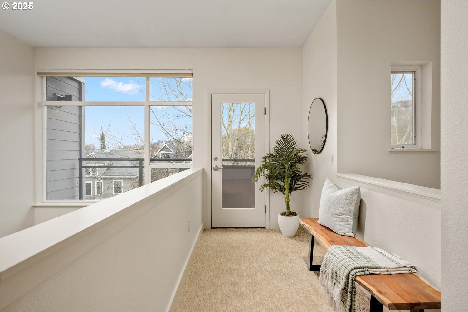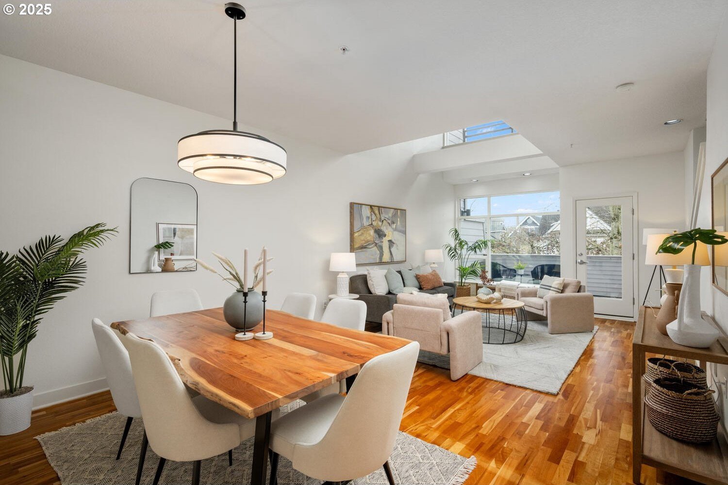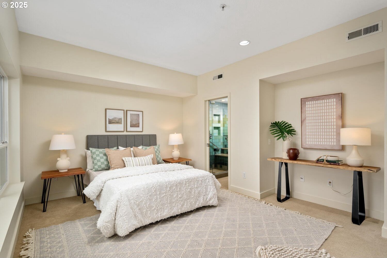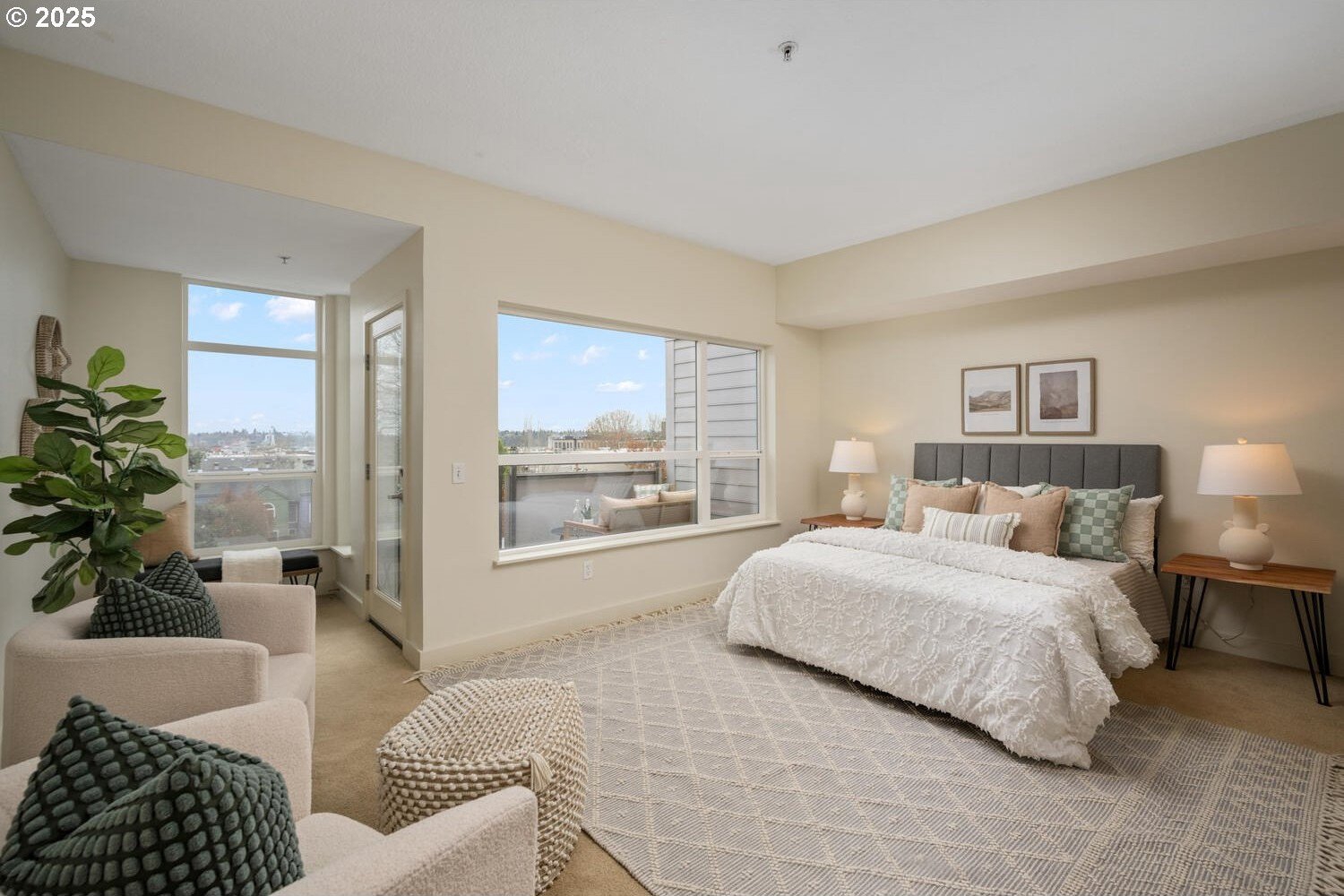 Welcome to this penthouse-level condo in Northrup Commons. Definitely not a "cookie cutter" floor plan, this unique unit offers both south and north exposures, 3 private balconies, its own dedicated common-area alcove and has extensive custom updates.Designed by award-winning Sienna Architects, led by Gary Reddick, known locally & internationally for a diverse portfolio. Sunlight pours in the 19 ft of front windows illuminating the 2 floors of living areas.Interior Designer Karen Karns orchestrated updates to the kitchens and baths with an eye to efficiency, style and pleasing coastal colors in the hand selected glass, tile and pentalquartz. Stainless steel Jenn-air appliances, rare African Anige custom cabinets, & specialty lighting are a refreshing departure from the ordinary. Contractor William Ballard oversaw the permitted to-the-studs kitchen and primary bath remodels in 2016. They also teamed up on the luxurious primary bath with gorgeous tilework, a spacious walk-in shower and heated tile floor. Recent updates include refinished #1 grade cherry floors, interior paint, high quality carpet, Trane furnace, heat pump for cooling and new light fixtures. The main floor bedroom includes a half bath and is open to the hall, ideal as a guest bedroom, media room or library. This condo enjoys a connection to the outdoors from it's 3 decks- each with differing views that provide 3 different microclimates for plants & varying temperatures throughout the day- North to Mt St Helens and the Fremont Bridge and South to cityscape, historic neighborhood homes & the West Hills. In the heart of Portland's NW District with a walk score of 98, you can leave the car in the garage and explore NW 23rd, shopping at New Seasons and Trader Joe's, coffee shops, cafes & local parks. Take the streetcar or MAX. Northrup Commons stands as a model of integration & stainability creating much-needed housing through mindful planning.This is the carefree urban lifestyle you've been dreaming about.