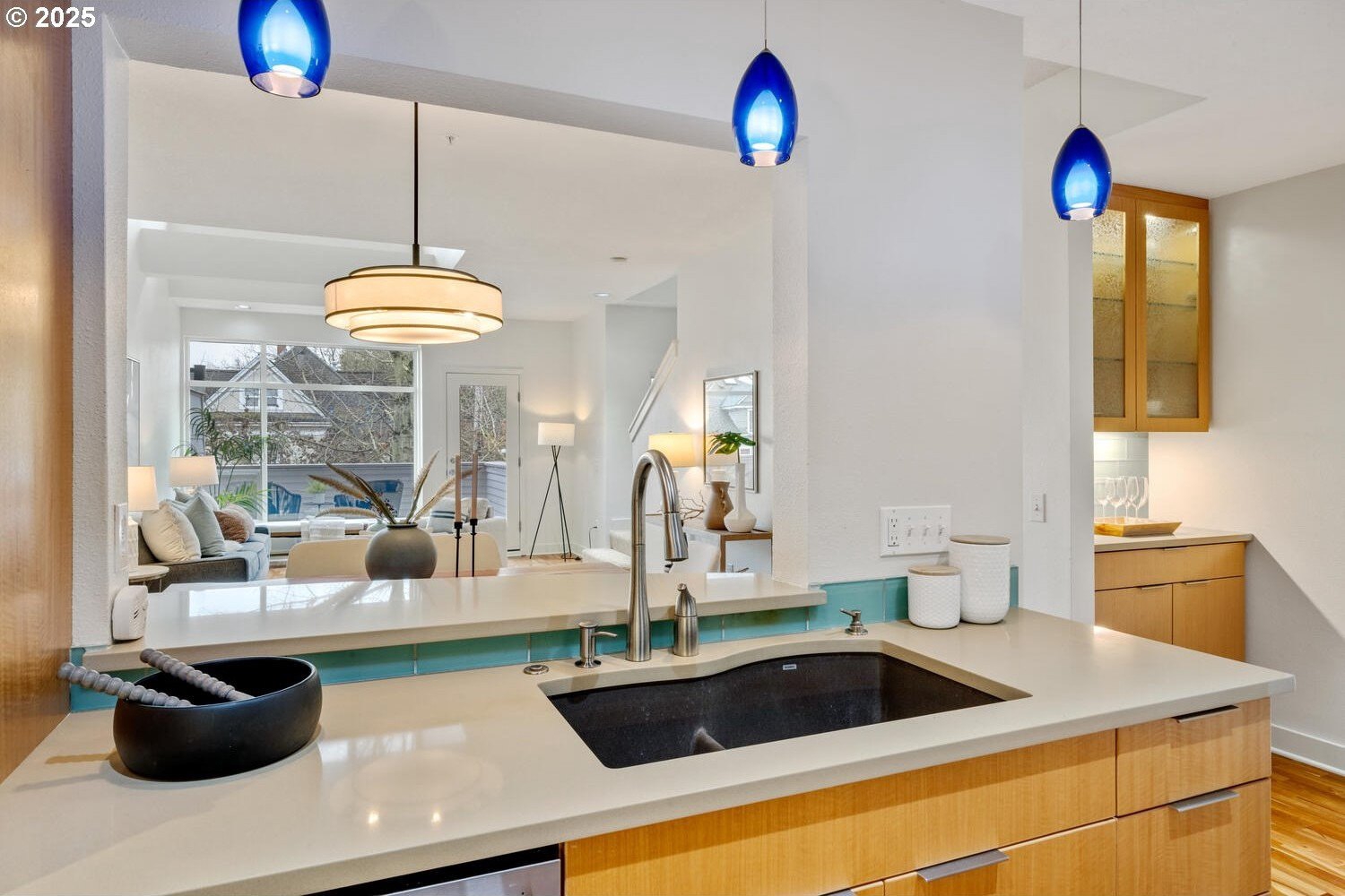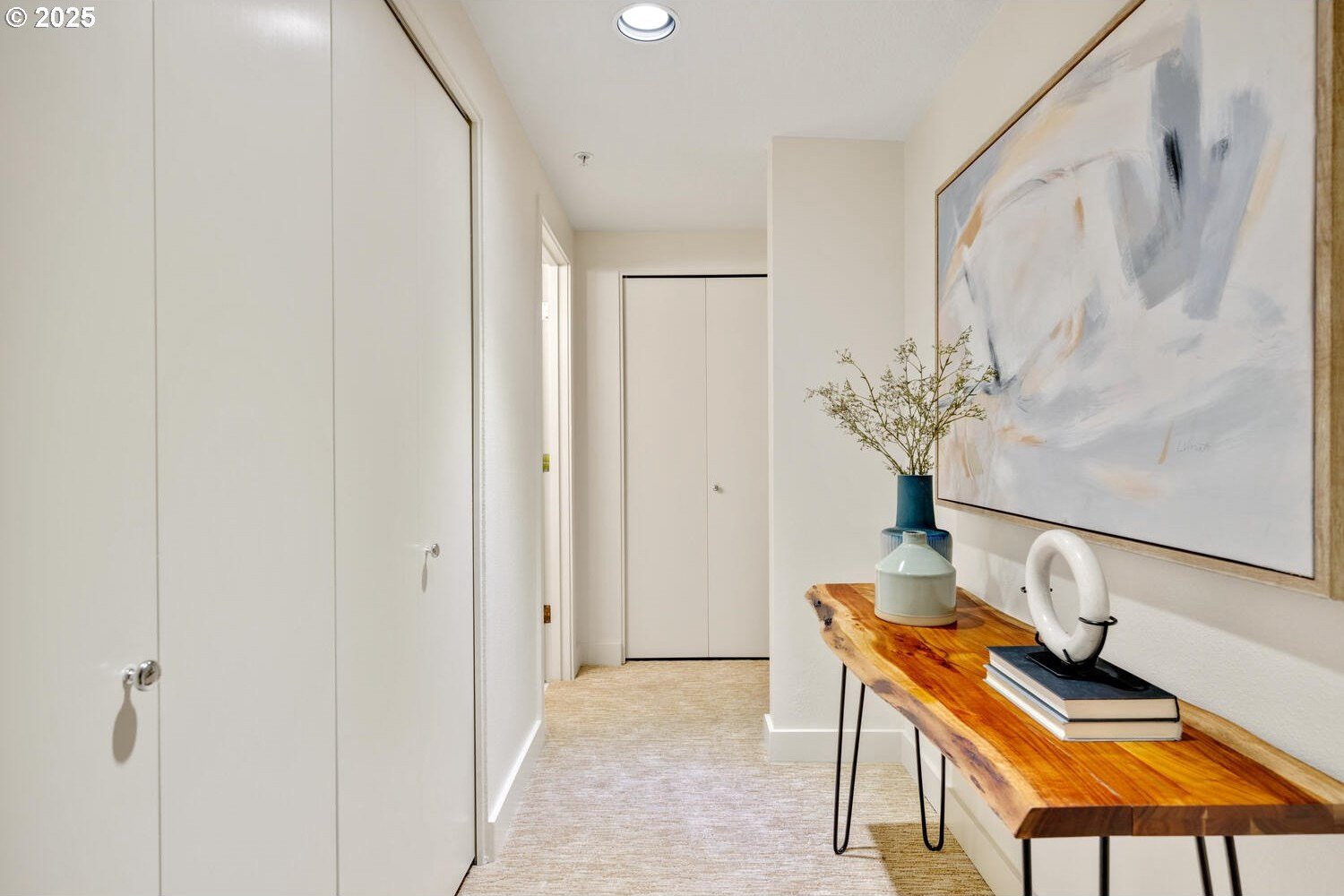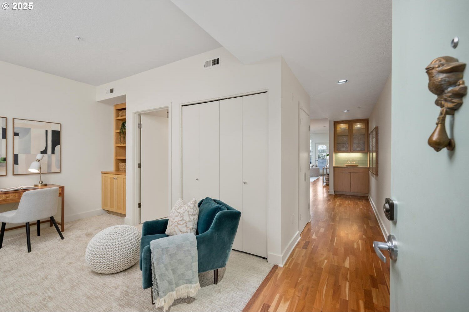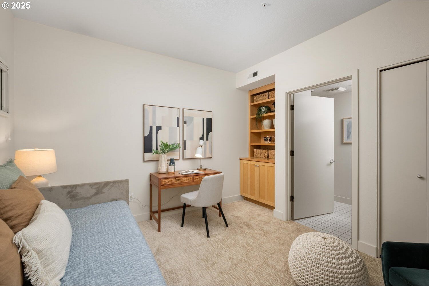 Welcome to this penthouse-level condo in Northrup Commons. Definitely not a "cookie cutter" floor plan, this unique unit offers both south and north exposures, 3 private balconies, its own dedicated common-area alcove and has extensive custom updates.Designed by award-winning Sienna Architects, led by Gary Reddick, known locally & internationally for a diverse portfolio. Sunlight pours in the 19 ft of front windows illuminating the 2 floors of living areas.Interior Designer Karen Karns orchestrated updates to the kitchens and baths with an eye to efficiency, style and pleasing coastal colors in the hand selected glass, tile and pentalquartz. Stainless steel Jenn-air appliances, rare African Anige custom cabinets, & specialty lighting are a refreshing departure from the ordinary. Contractor William Ballard oversaw the permitted to-the-studs kitchen and primary bath remodels in 2016. They also teamed up on the luxurious primary bath with gorgeous tilework, a spacious walk-in shower and heated tile floor. Recent updates include refinished #1 grade cherry floors, interior paint, high quality carpet, Trane furnace, heat pump for cooling and new light fixtures. The main floor bedroom includes a half bath and is open to the hall, ideal as a guest bedroom, media room or library. This condo enjoys a connection to the outdoors from it's 3 decks- each with differing views that provide 3 different microclimates for plants & varying temperatures throughout the day- North to Mt St Helens and the Fremont Bridge and South to cityscape, historic neighborhood homes & the West Hills. In the heart of Portland's NW District with a walk score of 98, you can leave the car in the garage and explore NW 23rd, shopping at New Seasons and Trader Joe's, coffee shops, cafes & local parks. Take the streetcar or MAX. Northrup Commons stands as a model of integration & stainability creating much-needed housing through mindful planning.This is the carefree urban lifestyle you've been dreaming about.