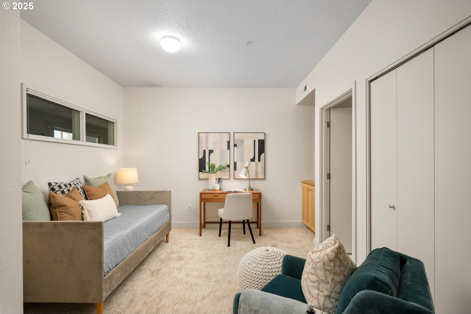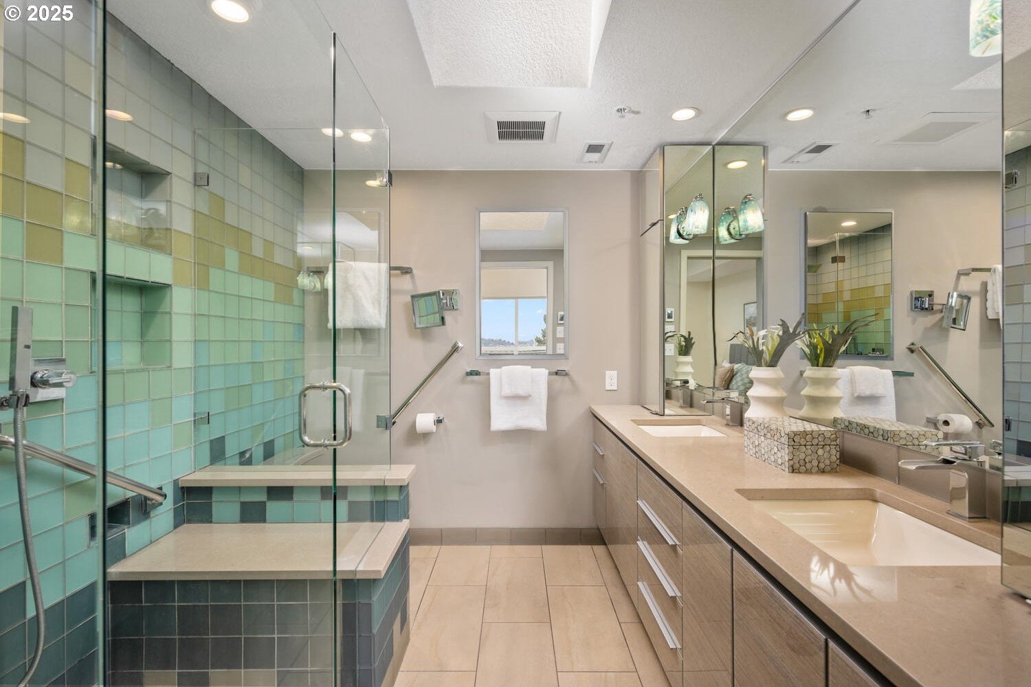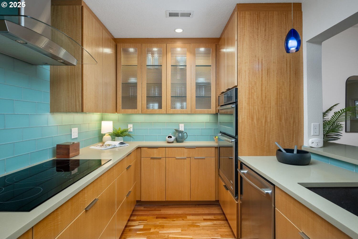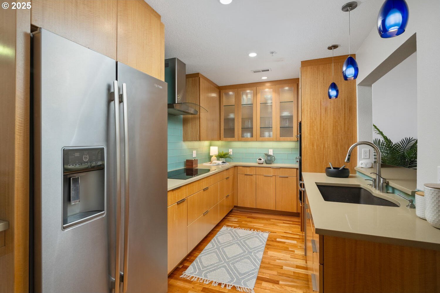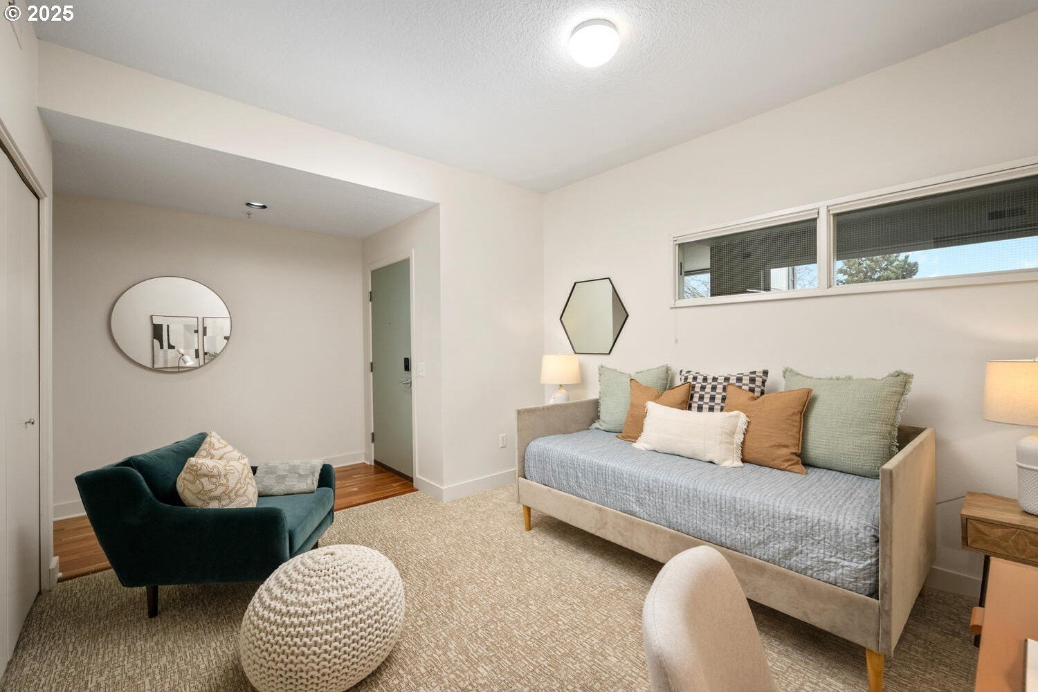 Welcome to this penthouse-level condo in Northrup Commons. Definitely not a "cookie cutter" floor plan, this unique unit offers both south and north exposures, 3 private balconies, its own dedicated common-area alcove and has extensive custom updates.Designed by award-winning Sienna Architects, led by Gary Reddick, known locally & internationally for a diverse portfolio. Sunlight pours in the 19 ft of front windows illuminating the 2 floors of living areas.Interior Designer Karen Karns orchestrated updates to the kitchens and baths with an eye to efficiency, style and pleasing coastal colors in the hand selected glass, tile and pentalquartz. Stainless steel Jenn-air appliances, rare African Anige custom cabinets, & specialty lighting are a refreshing departure from the ordinary. Contractor William Ballard oversaw the permitted to-the-studs kitchen and primary bath remodels in 2016. They also teamed up on the luxurious primary bath with gorgeous tilework, a spacious walk-in shower and heated tile floor. Recent updates include refinished #1 grade cherry floors, interior paint, high quality carpet, Trane furnace, heat pump for cooling and new light fixtures. The main floor bedroom includes a half bath and is open to the hall, ideal as a guest bedroom, media room or library. This condo enjoys a connection to the outdoors from it's 3 decks- each with differing views that provide 3 different microclimates for plants & varying temperatures throughout the day- North to Mt St Helens and the Fremont Bridge and South to cityscape, historic neighborhood homes & the West Hills. In the heart of Portland's NW District with a walk score of 98, you can leave the car in the garage and explore NW 23rd, shopping at New Seasons and Trader Joe's, coffee shops, cafes & local parks. Take the streetcar or MAX. Northrup Commons stands as a model of integration & stainability creating much-needed housing through mindful planning.This is the carefree urban lifestyle you've been dreaming about.