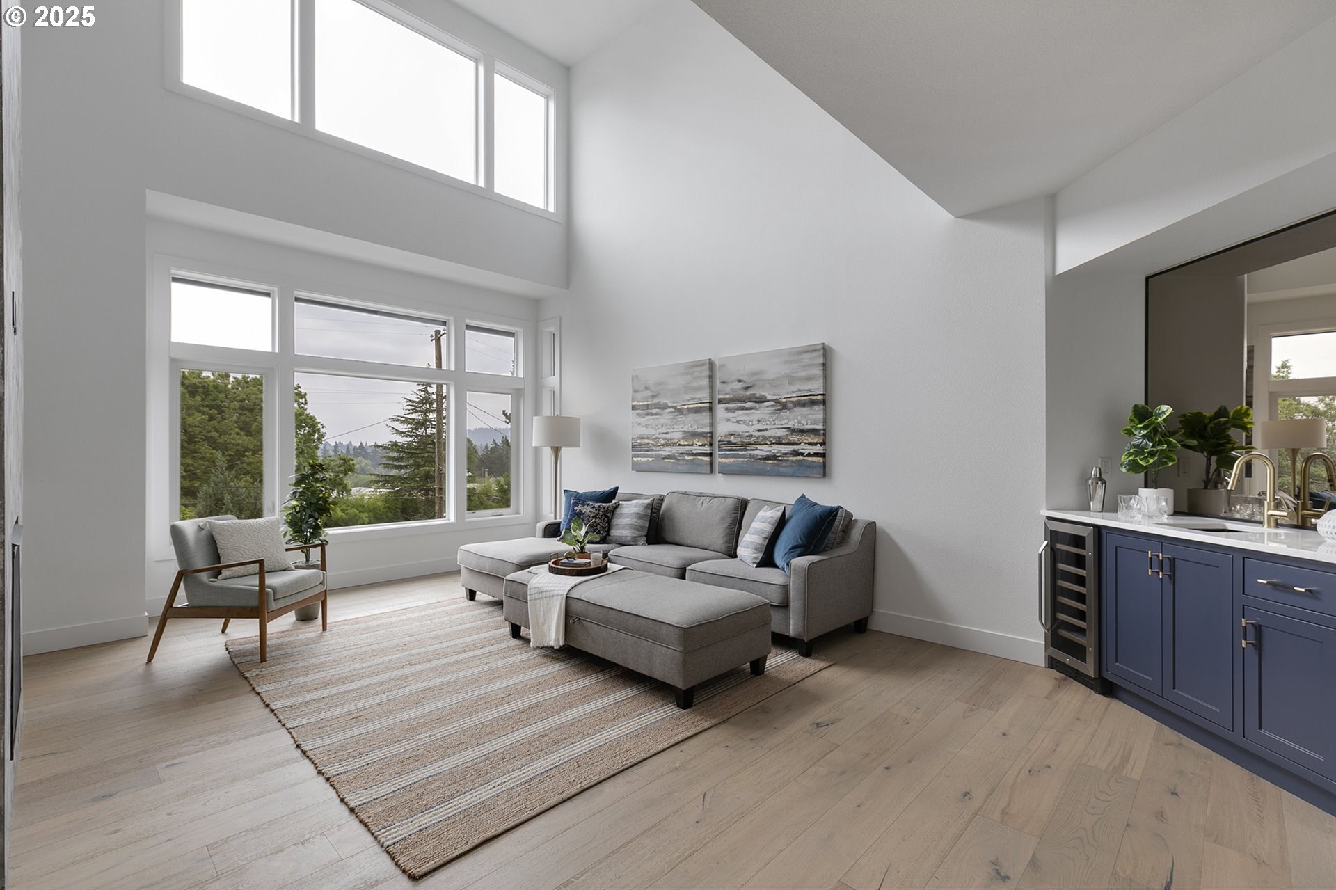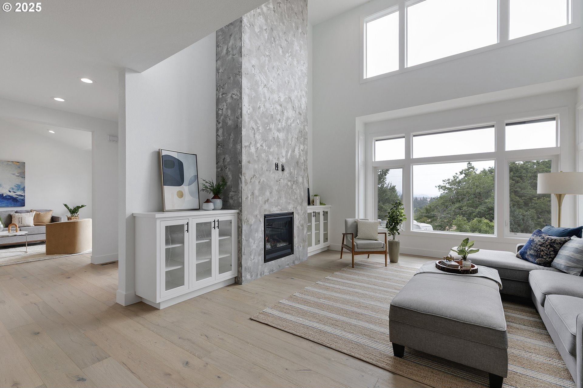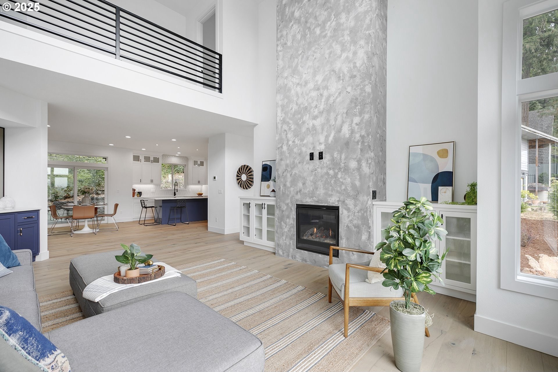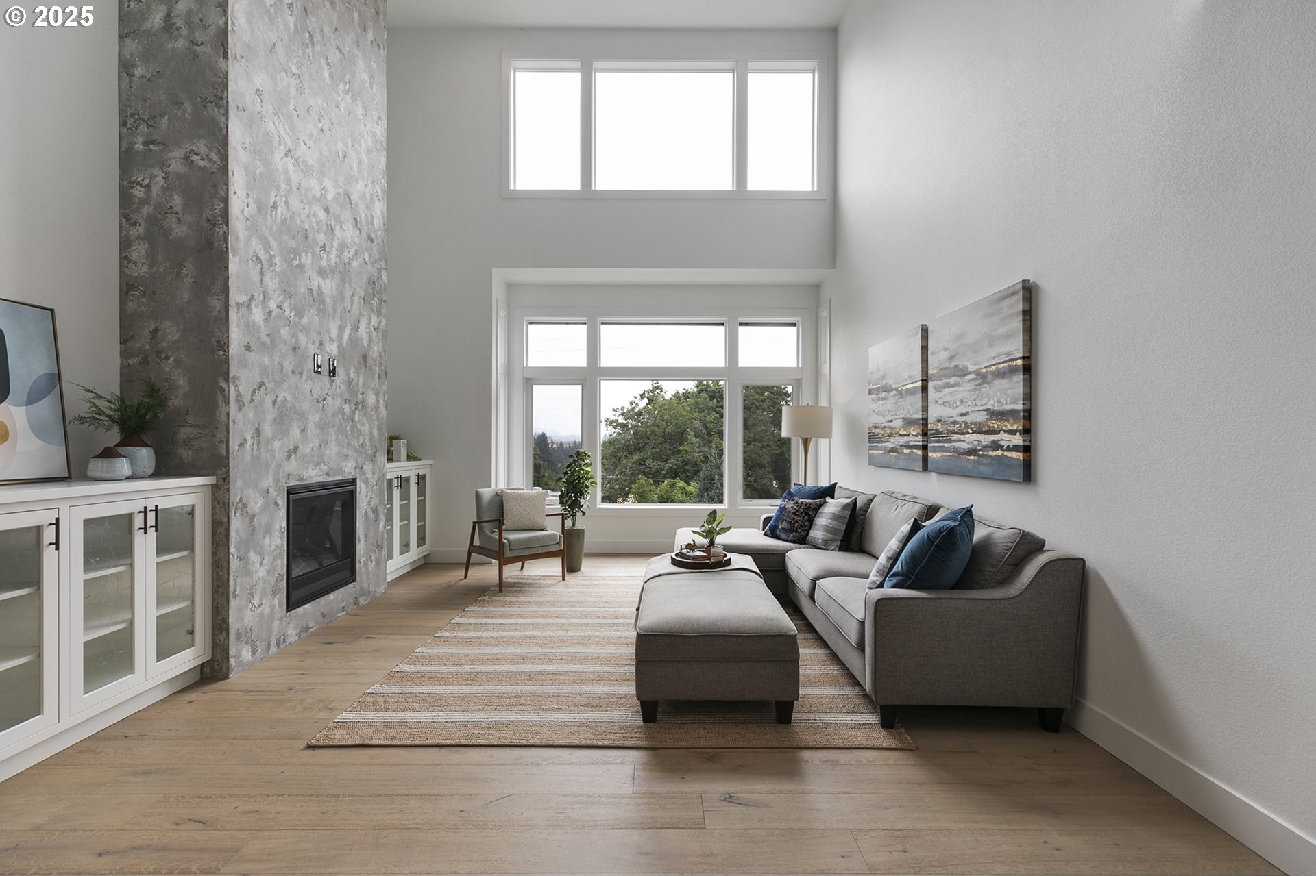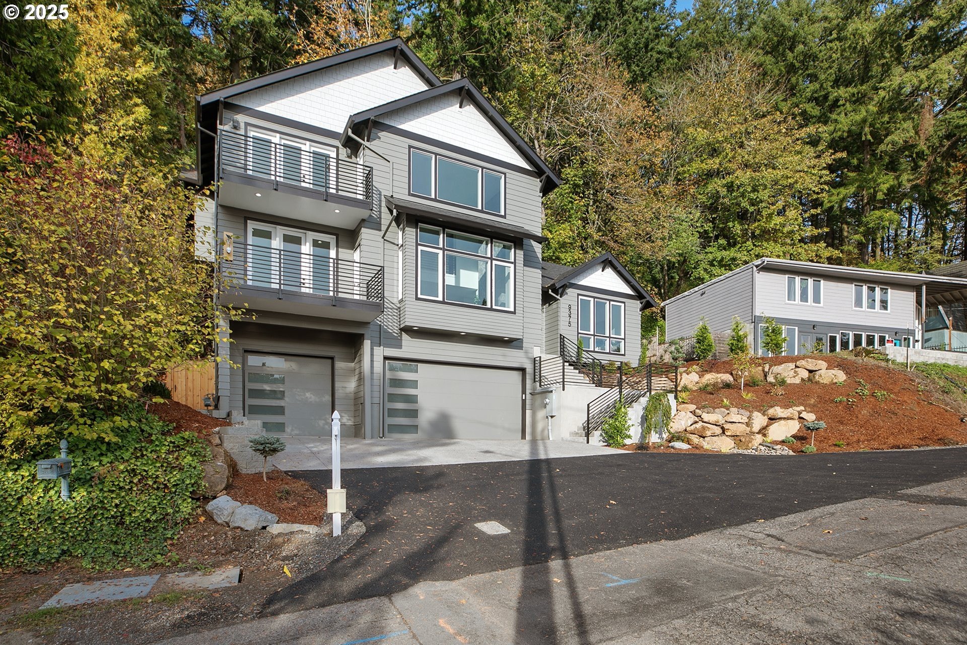 Welcome to this newly built home, perfectly situated on a quiet cul-de-sac in Portland's desirable Madison neighborhood. This outstanding custom residence masterfully blends timeless style with sustainable living. The smartly designed floor plan enhances the feeling of openness, highlighting spacious living areas flooded with natural light, soaring ceilings, wide plank hardwood floors, and a dramatic two-story gas fireplace that serves as a stunning focal point on the main floor. This level also includes a bedroom and full bathroom, perfect for guests, multi-generational living, or a home office. The gourmet kitchen boasts a large quartz island ideal for entertaining, alongside a built-in oven, microwave, refrigerator, cooktop, and pantry. Additional features on the main floor include a wet bar, family room, laundry space, and a full bathroom. Upstairs, the primary suite provides a luxurious retreat complete with a walk-in closet and a lavish bathroom featuring a soaking tub, heated floors, dual vanities, and an impressive walk-in shower. This level also hosts two more bedrooms and a shared bathroom. Enjoy private decks with stunning views accessible from both the primary bedroom and the office. Enhancing this home are central air conditioning, a three-car garage, and a generous private back patio overlooking a serene wooded area with a charming gazebo. Numerous other amenities offer unparalleled comfort and convenience. The purchase includes a one-year builder's warranty, ensuring your peace of mind.