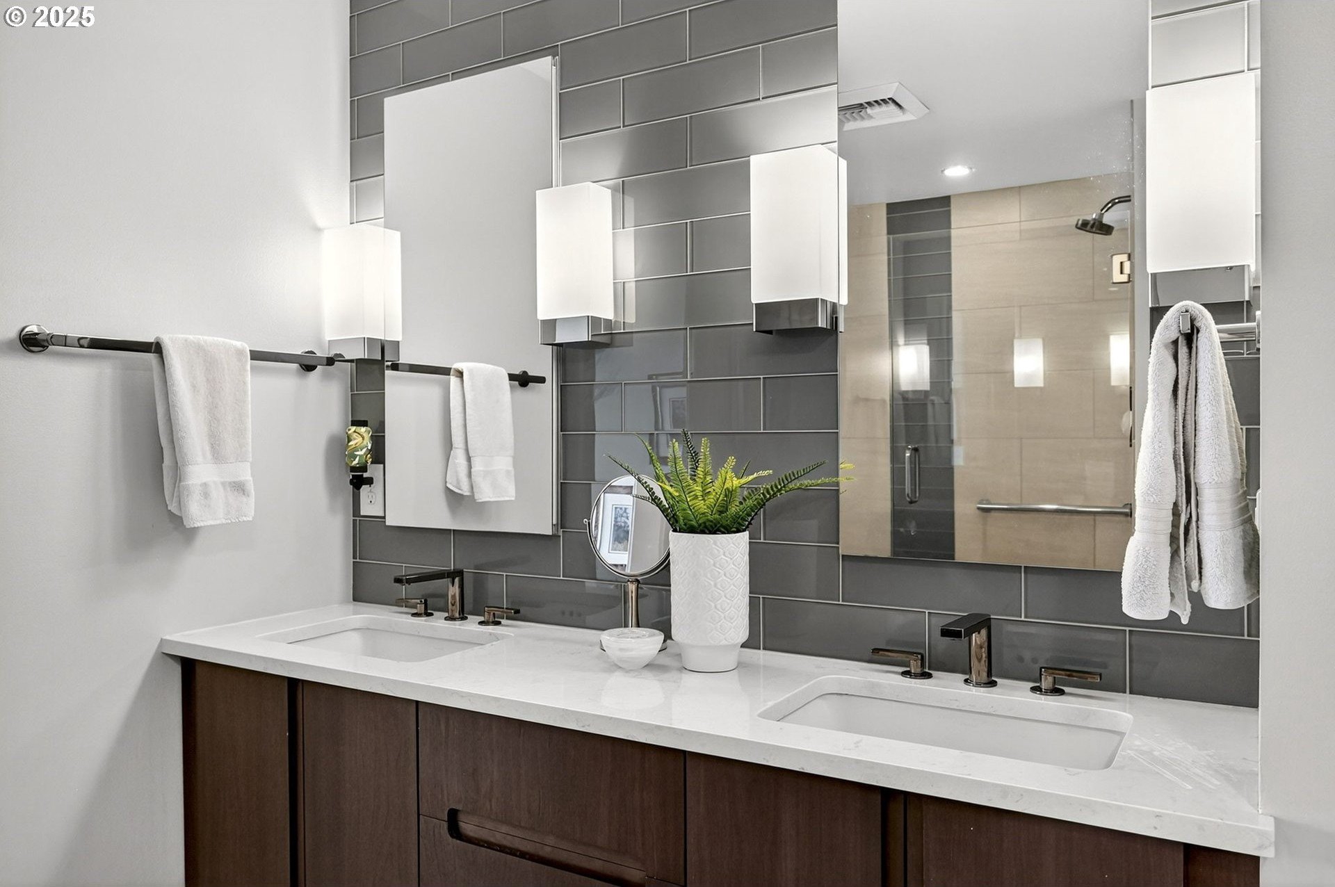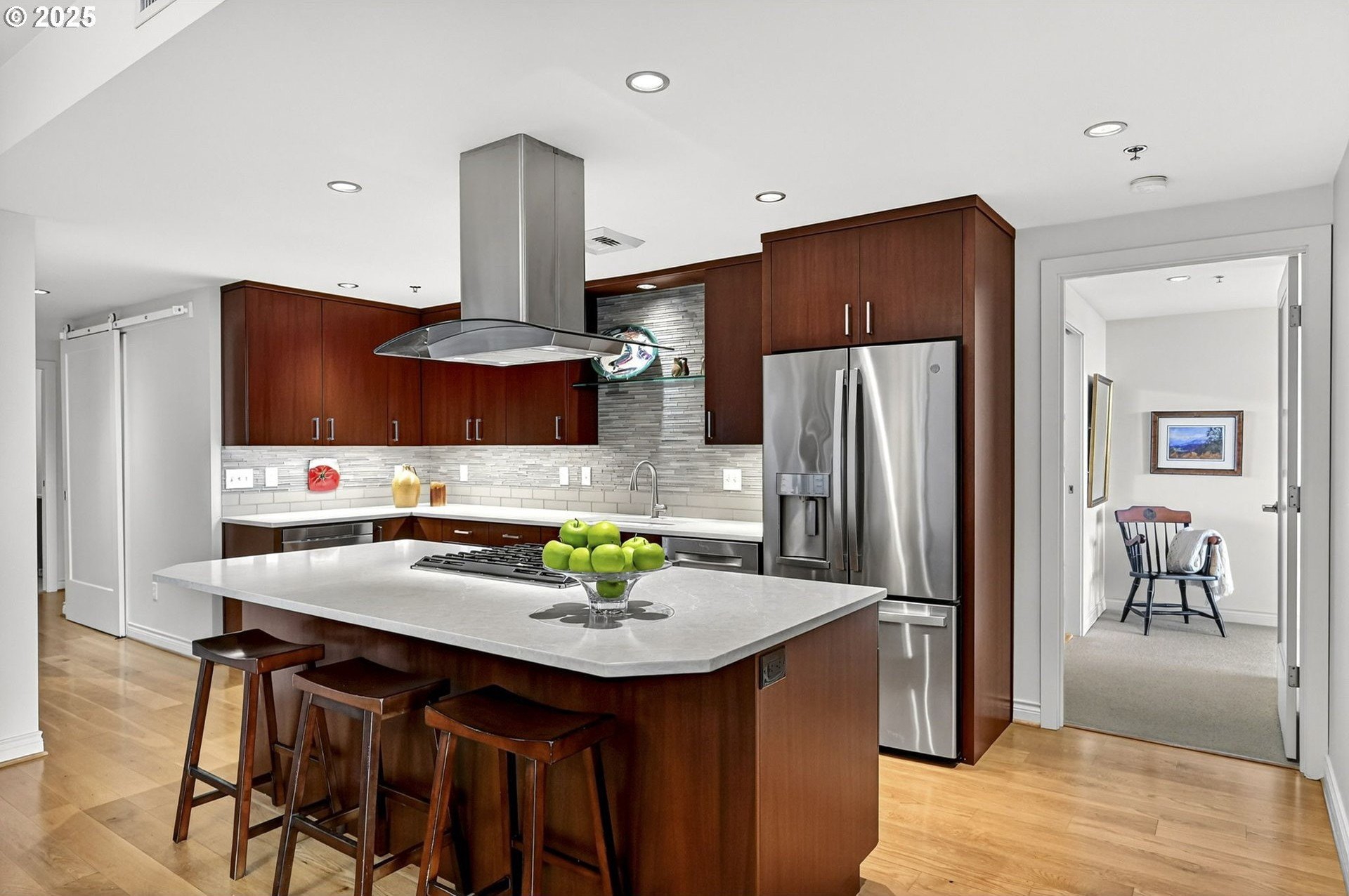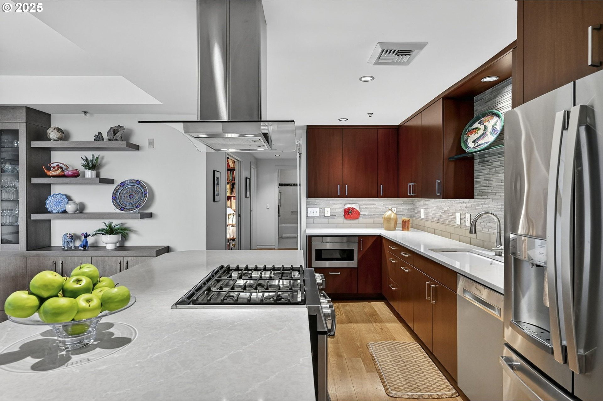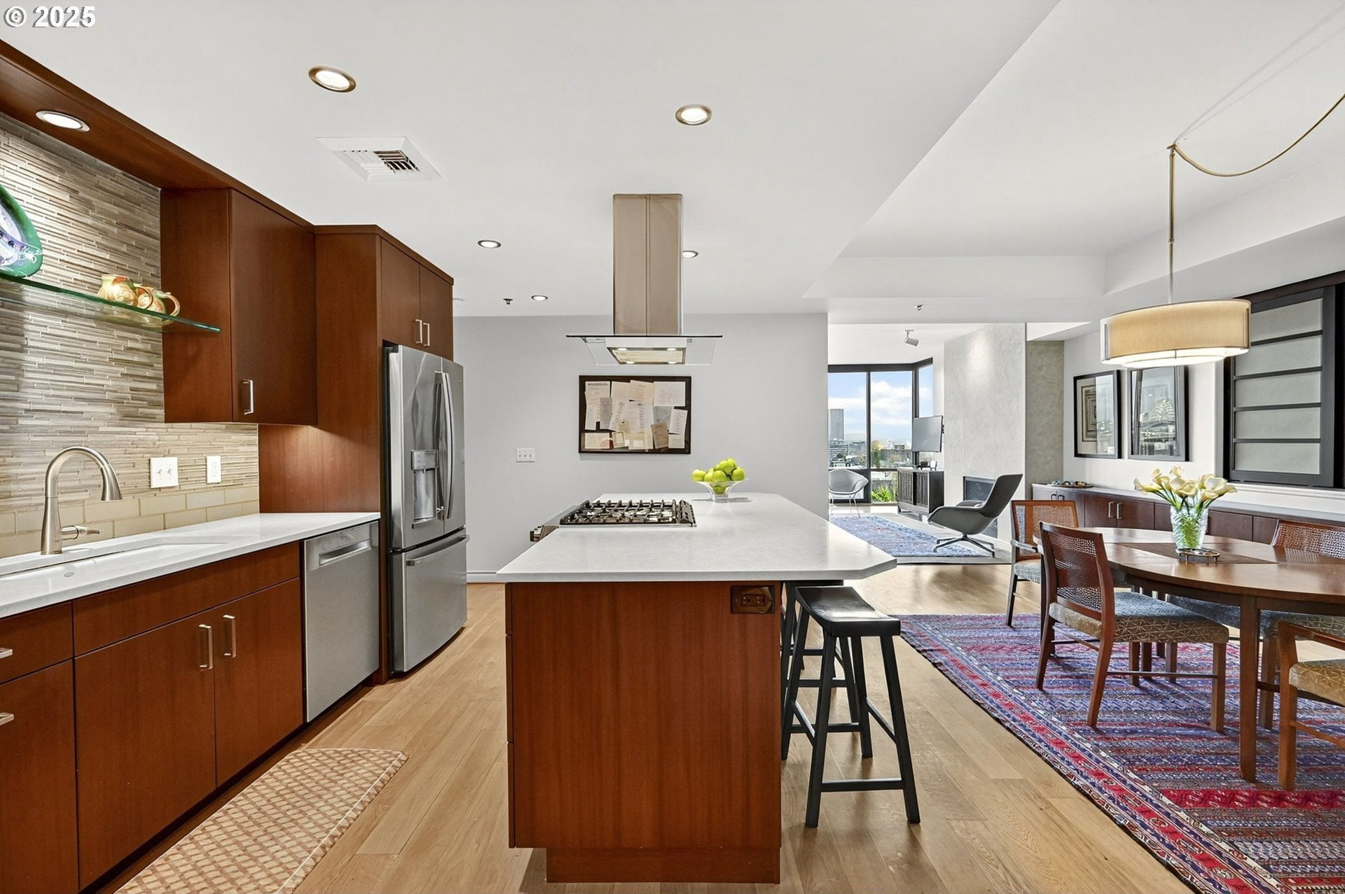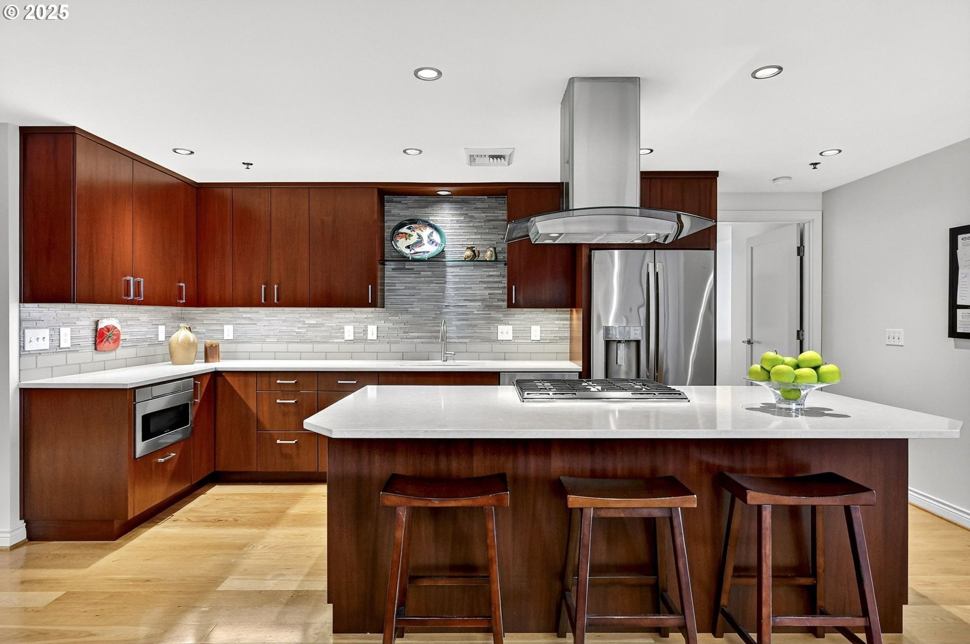 Portland living in The Cambridge on NW Westover, perfectly situated in the heart of the Nob Hill / Northwest District; it is one of Portland's most desirable neighborhoods. This beautifully updated condo combines classic NW style with modern upgrades, offering high end finishes and a flexible floor plan. Enjoy unobstructed mountain views of Mt. Hood, Mt. Adams, Mt. St. Helens, and Mt. Rainier; a rare vantage point that brings the best of Oregon and Washington's skyline right into your home. Positioned above the city for exceptional privacy and quiet, yet minutes from NW 23rd Avenue dining, shopping, parks, and transit. This location delivers the ideal Portland lifestyle.The remodeled kitchen features updated appliances and a clean, contemporary aesthetic; making this condo move-in ready from day one. Two full bedrooms and an office along with two bathrooms make this a roomy retreat! You'll love the covered patio with outdoor space for lounging or dining and an additional patio for grilling with gas hookup. Additional amenities include two deeded parking spaces and a private storage unit, offering convenience and extra space that's hard to find in the West Hills. For frequent travelers or anyone seeking a low maintenance home, this property provides effortless lock-and-leave living. A unique blend of urban energy and peaceful retreat, The Cambridge stands out as one of NW Portland's premier condos. These views rarely come to market, come see for yourself.