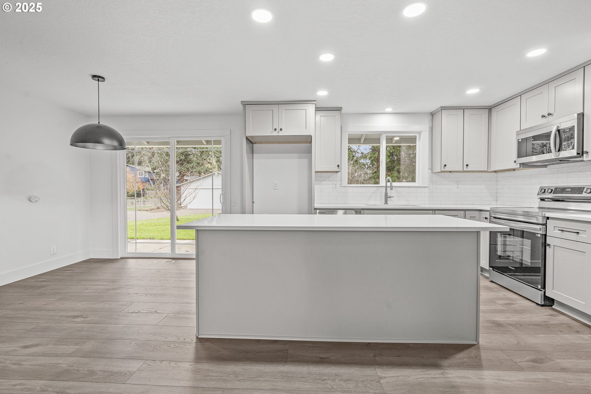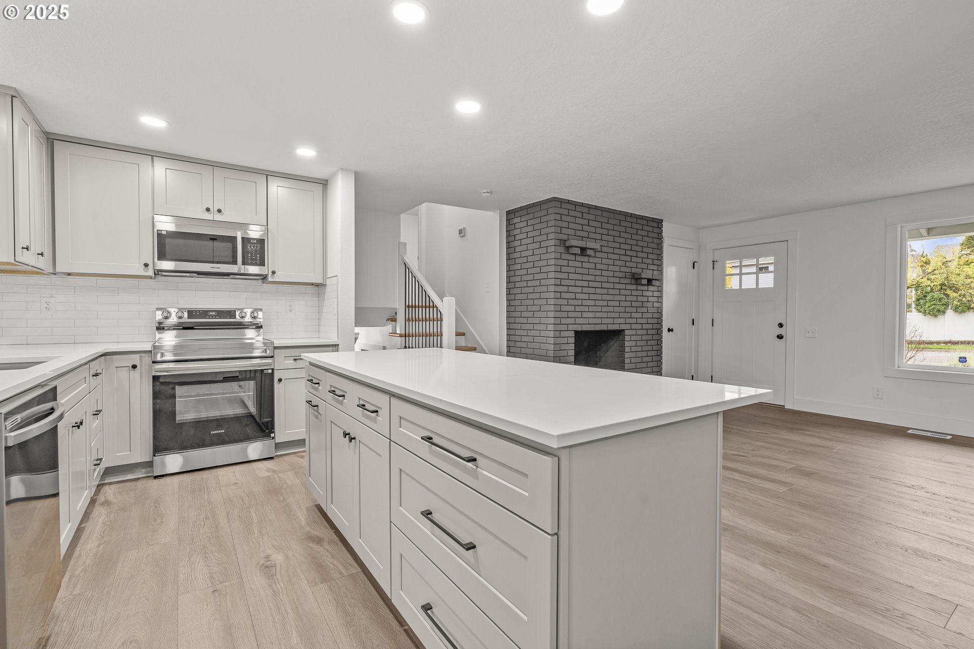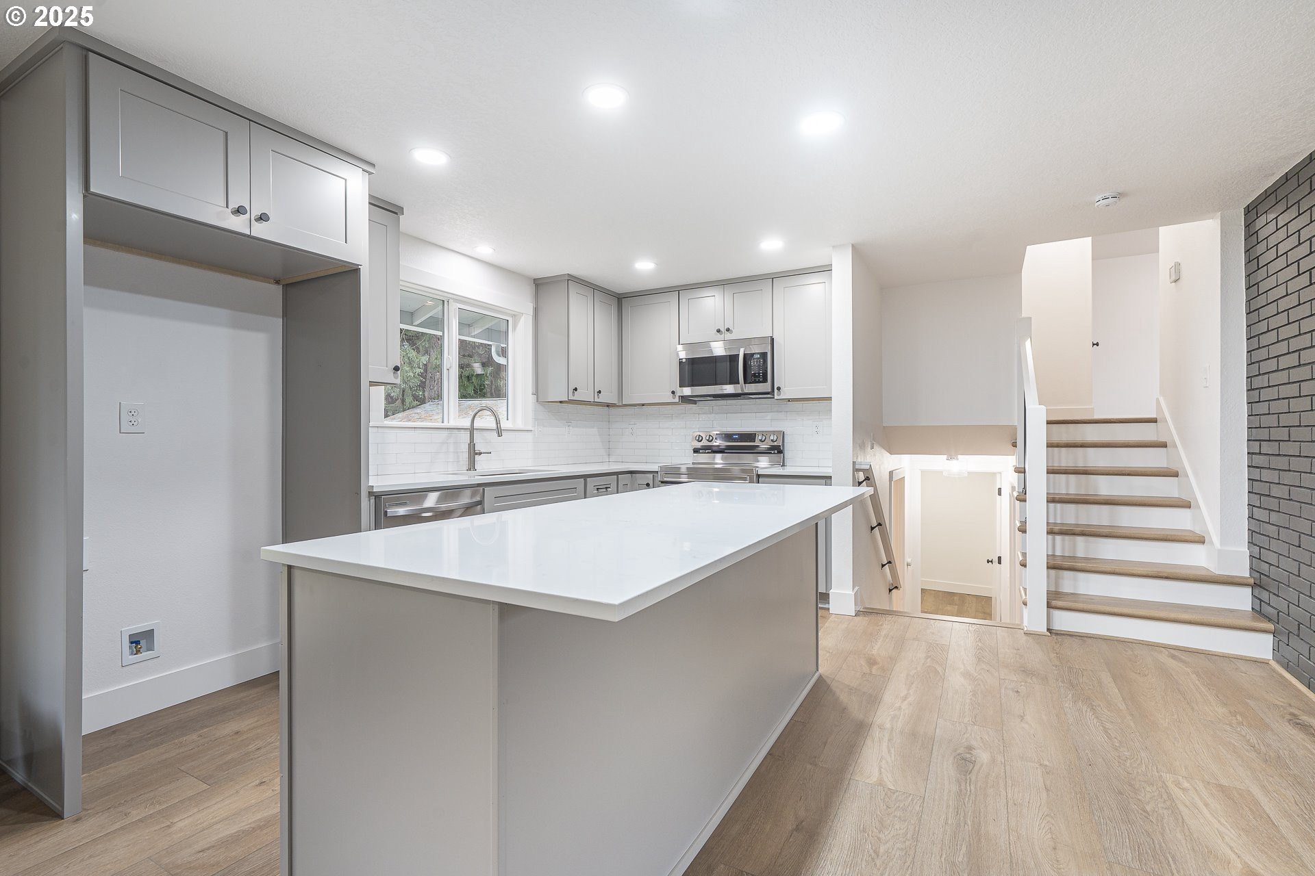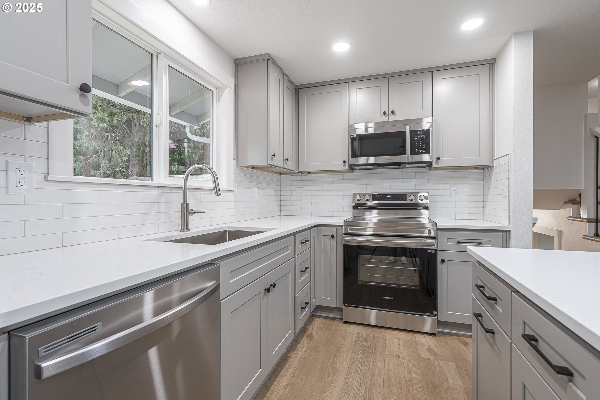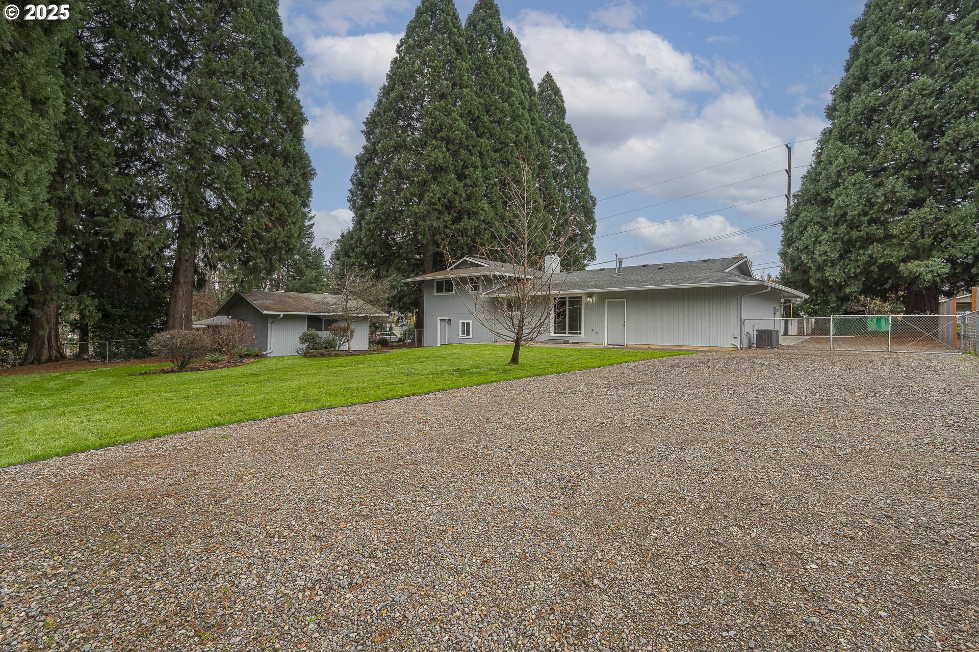 Welcome to this stunning, fully renovated tri-level home in the desirable Hillendale neighborhood. Sitting on an expansive lot, this property features a spacious 33x28 shop with 220v power plus an additional 18x16 shop, perfect for hobbies, storage, or small business needs.The gated driveway offers abundant parking for RVs, boats, and multiple vehicles, while the parklike, fully fenced yard with towering trees creates a peaceful retreat from the bustle of daily life. Inside, you'll find meticulous updates and quality finishes throughout. The inviting living room features a cozy wood-burning fireplace and flows seamlessly into the beautifully updated kitchen and dining area, complete with access to the backyard-ideal for entertaining. Upstairs, there are three comfortable bedrooms and a full bathroom. The lower level, with its own exterior access, is perfect for multi-generational living or guest quarters, featuring a fourth bedroom, second bathroom, and a large family room with another wood-burning fireplace. Conveniently located near parks, shopping, major highways, and the historic downtown Oregon City, this home offers both comfort and convenience.Notable 2025 Updates: Full Interior & Exterior Paint; New Kitchen Cabinets & Quartz Countertops with Subway Tile Backsplash; Updated Bathroom (toilets, sinks, bathtub, vanity, mirrors); New Lighting Fixtures Throughout; Millwork; New Luxury Vinyl Plank Flooring & Carpet; New Stainless Steel Dishwasher, Range, & Microwave