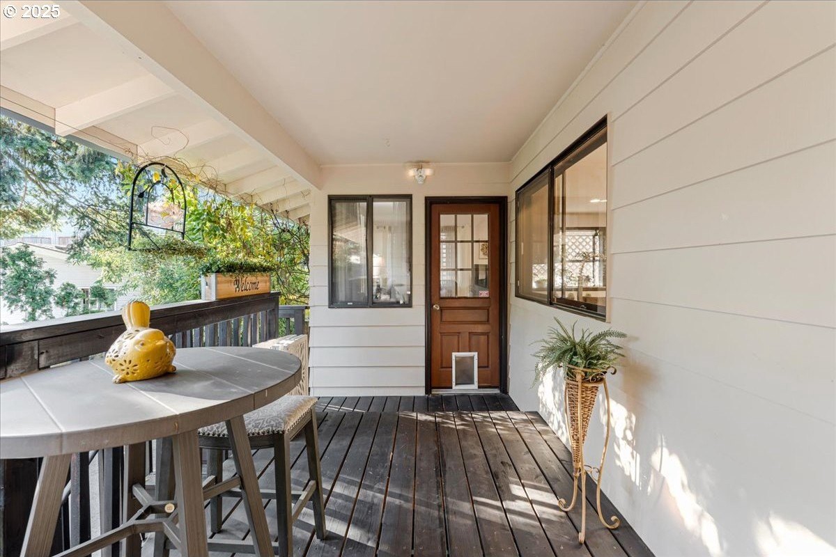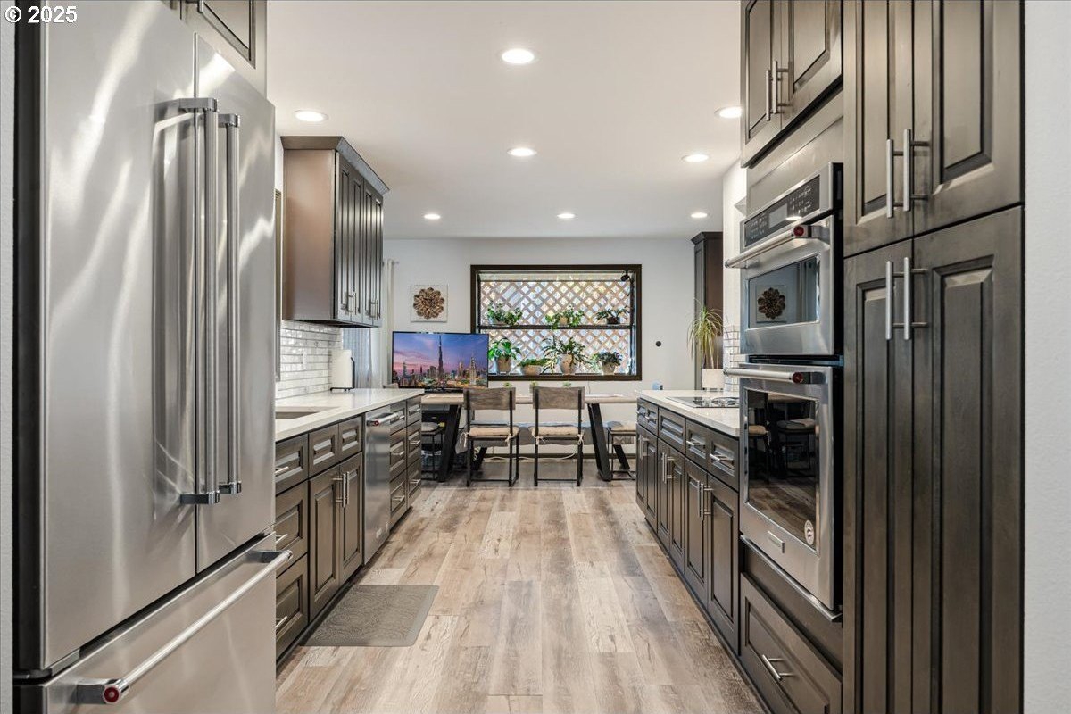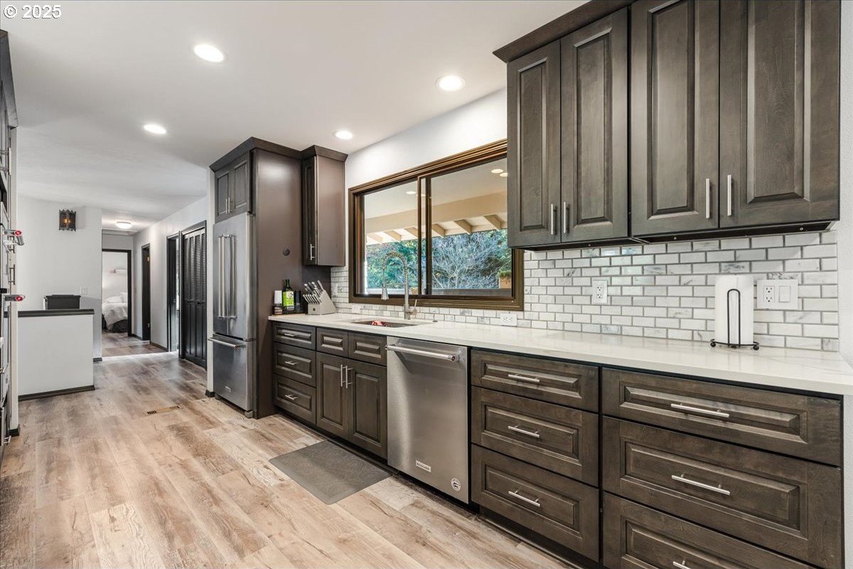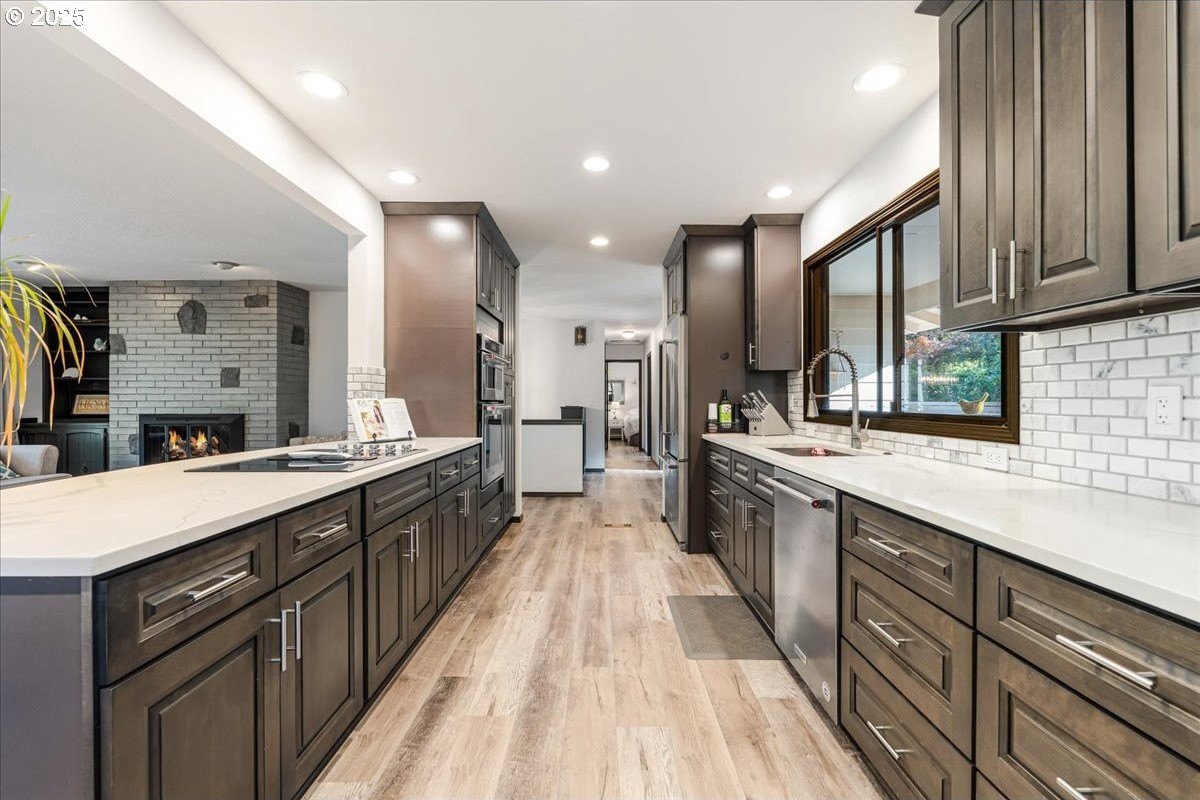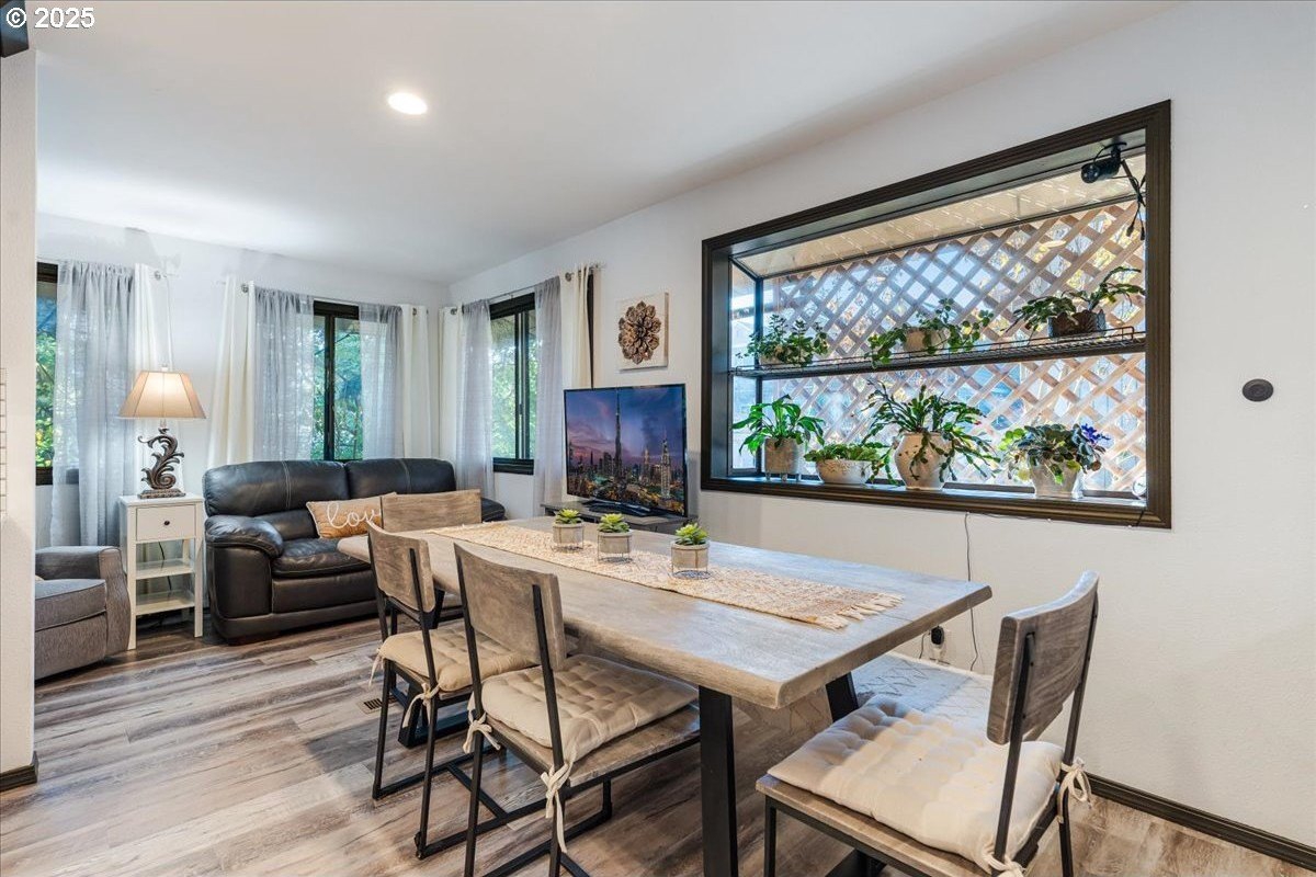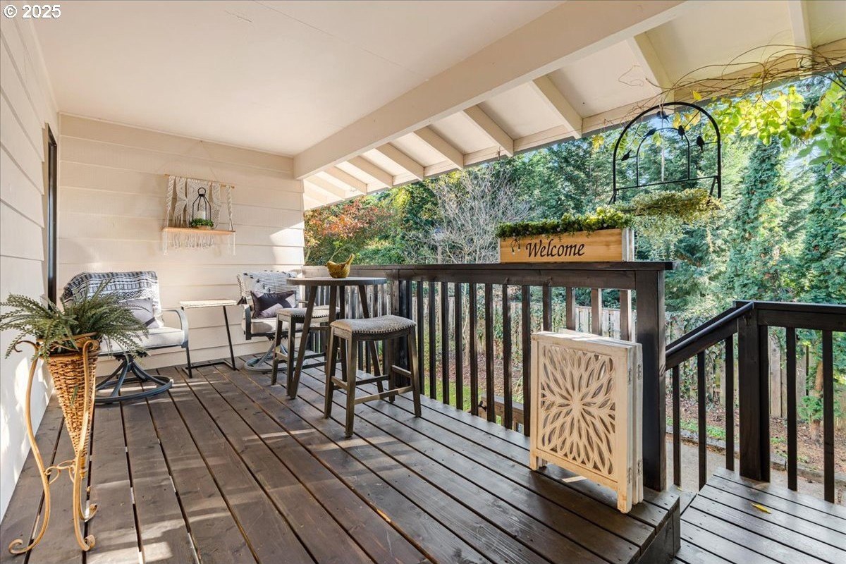 This lovingly maintained home offers modern updates and versatile living spaces throughout. The fully remodeled 2021 kitchen features quartz countertops, new cabinetry, updated fixtures, and stainless-steel appliances - plus a charming eating nook and lounge area. The kitchen opens seamlessly to the dining and living room spaces, creating an inviting open floorplan feel. A coffee bar and additional cabinets off the dining area provide extra room for kitchen storage and functionality.Upstairs you'll find luxury vinyl flooring.Lower level has a convenient laundry room with new cabinets and counters. The lower level includes a spacious family room with a fireplace & a 3rd lower level bedroom and bathroom are ideal for multi-generational living. Enjoy year-round comfort with newer air conditioning, PEX plumbing, and a freshly repainted exterior with new gutters. House has redwood cedar siding and 3-foot overhang rafters. Relax outdoors on the newer covered deck, and take advantage of the oversized two-car garage with a workbench and storage. Located on a quiet end street, this home offers both privacy and practicality - truly move-in ready with thoughtful updates and exceptional care throughout. [Home Energy Score = 2. HES Report