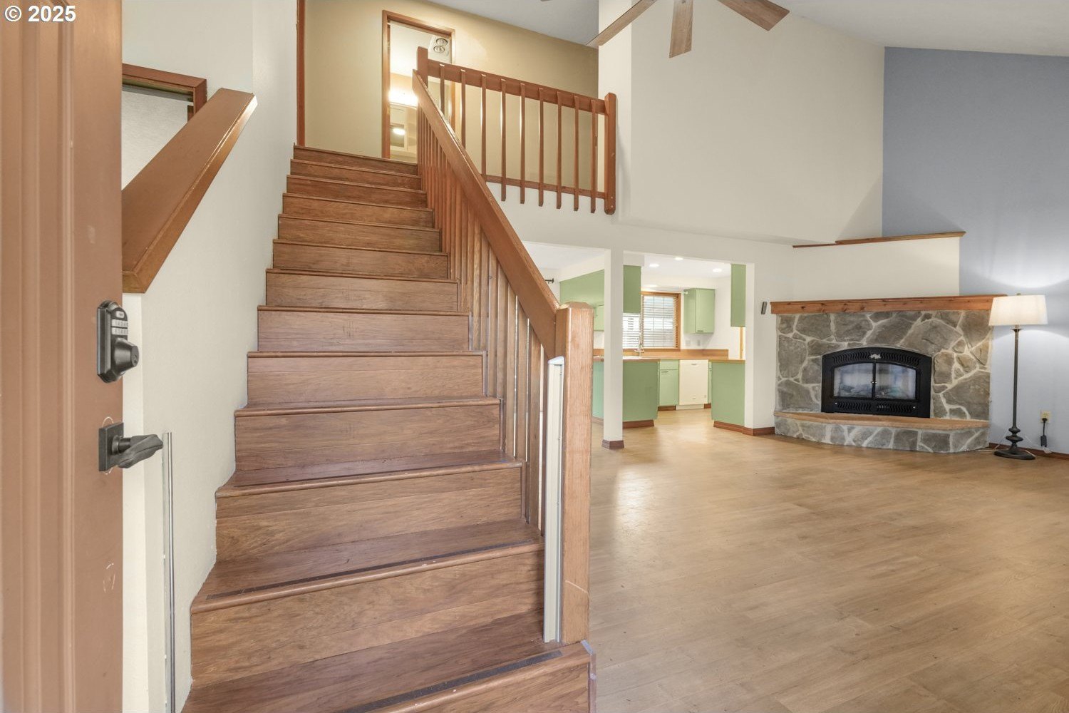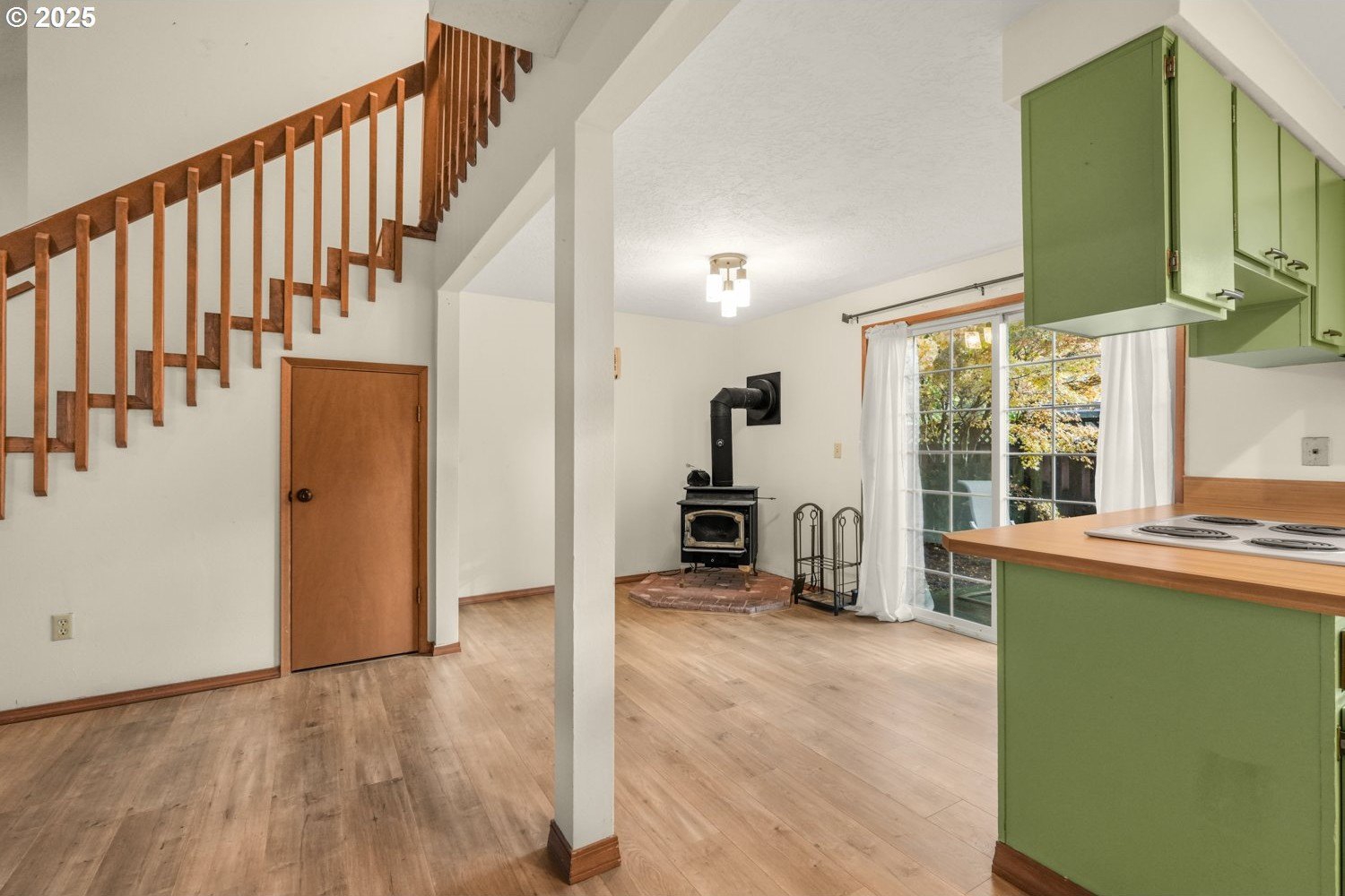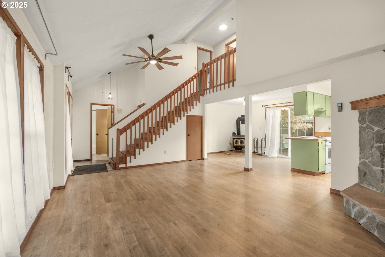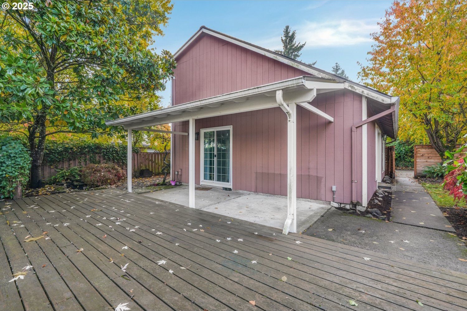 Move-in Ready Gem on Private Flag Lot! Tucked away on a peaceful flag lot, this 3-bedroom, 2-bath home sits on a generous .22-acre lot and offers an inviting open-concept layout. The spacious, bright living room features vaulted ceilings and a stunning stone fireplace, flowing seamlessly into the dining area with sliders leading to a sunny patio that's perfect for indoor/outdoor living. The main-level primary suite includes sliders to a covered patio and an expansive deck ideal for morning coffee or evening relaxation. Upstairs, you'll find two comfortably sized bedrooms and a full guest bath. The large, fenced backyard is designed for entertaining with multiple outdoor spaces, a patio, covered patio, and deck, all ready for gatherings or quiet enjoyment. Recent updates include a replaced roof, new hot water heater, new sink, new living room fan, new refrigerator/freezer, and new washer and dryer. Conveniently located just minutes from dining, shopping, schools, and neighborhood parks, with a great bike score, this home offers comfort, style, and convenience all in one. ** [Home Energy Score = 6. HES Report