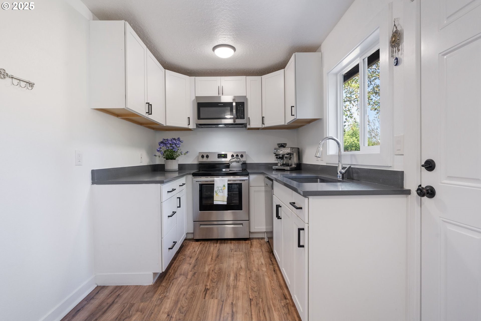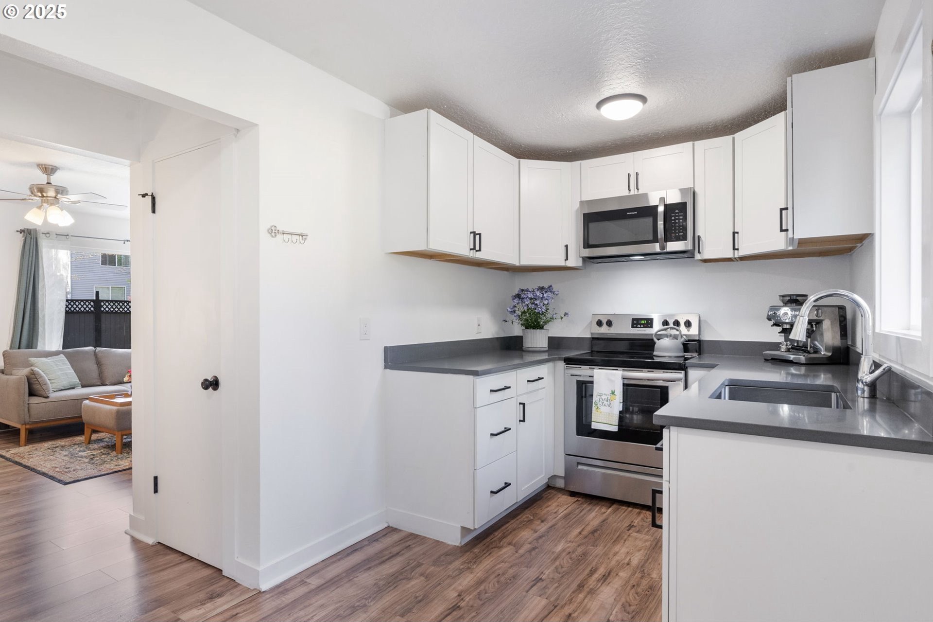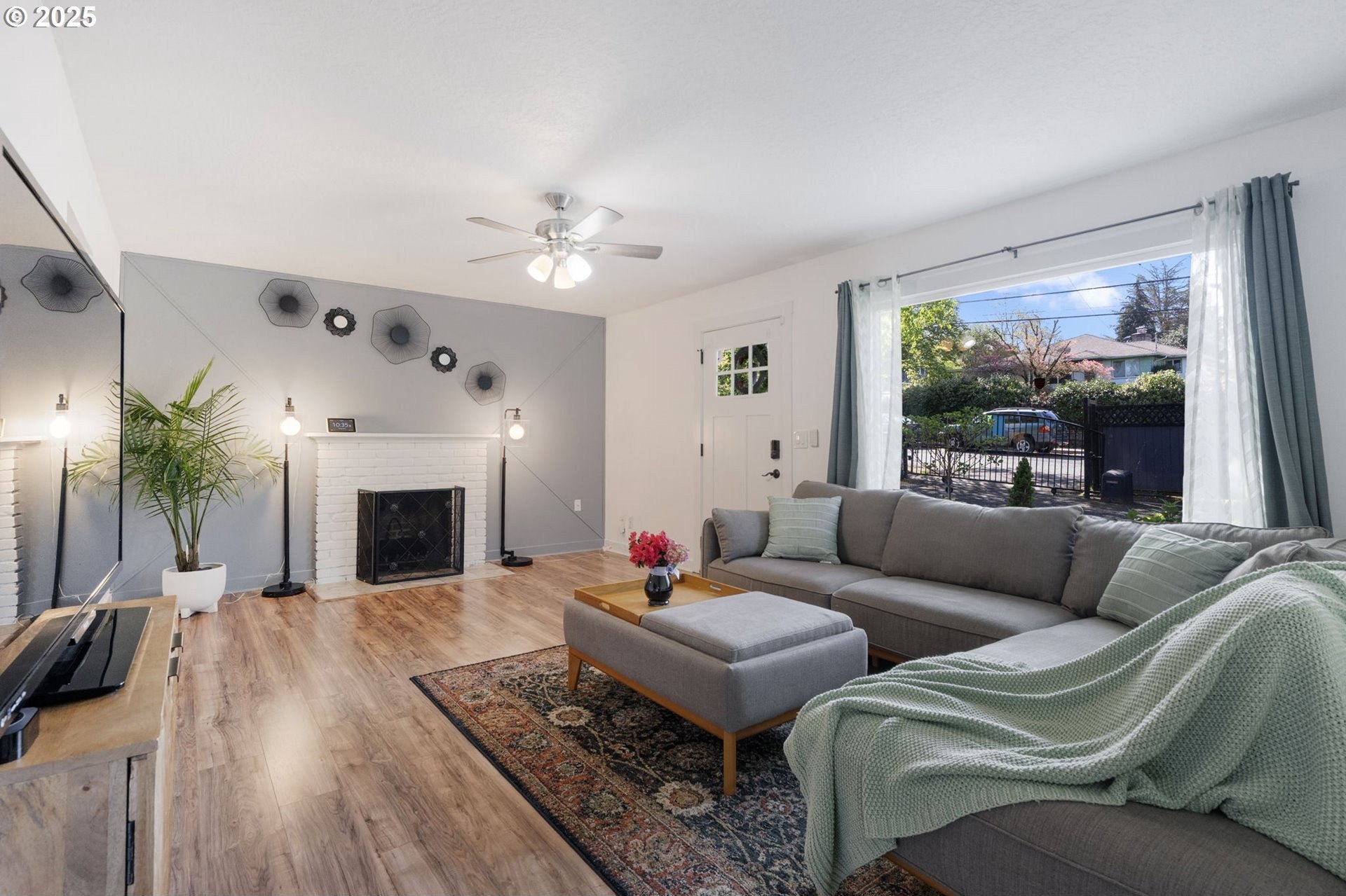 Welcome to your dream home! This beautifully updated home boasts modern upgrades throughout, including a new roof (2022), engineered hardwood floors, plush carpeting, and fresh interior/ exterior paint. The heart of the home-a stunning kitchen-was tastefully remodeled in 2022 and features quartz countertops, elegant white shaker cabinets, and stainless steel appliances. All appliances purchased in 2022 including Electric stove, dishwasher, microwave, refrigerator and garbage disposal. The bathroom renovation (2022) offers a tiled tub/shower combo, contemporary vanity, and dual-flush toilet. With three spacious bedrooms plus a versatile bonus space, this home perfectly balances style and functionality. The inviting living area is anchored by a cozy wood-burning fireplace, ideal for relaxation on these cold nights. This house is set on a private lot surrounded by lush greenery with no neighbors to the right or behind; the property ensures peace and tranquility. Added features include a security system and a custom automated gate with remote and keypad entry. Ample parking is available with a specious and secured driveway for up to 4 vehicles. The expansive, fenced backyard is a true retreat, showcasing gorgeous garden beds, a concrete patio perfect for entertaining, and low-maintenance landscaping tailored to both the front and back. Additional updates in 2022 include a new washer/dryer, baseboard heating, water heater, and energy-efficient windows. This turnkey beauty is ready to welcome you home! [Home Energy Score = 1. HES Report