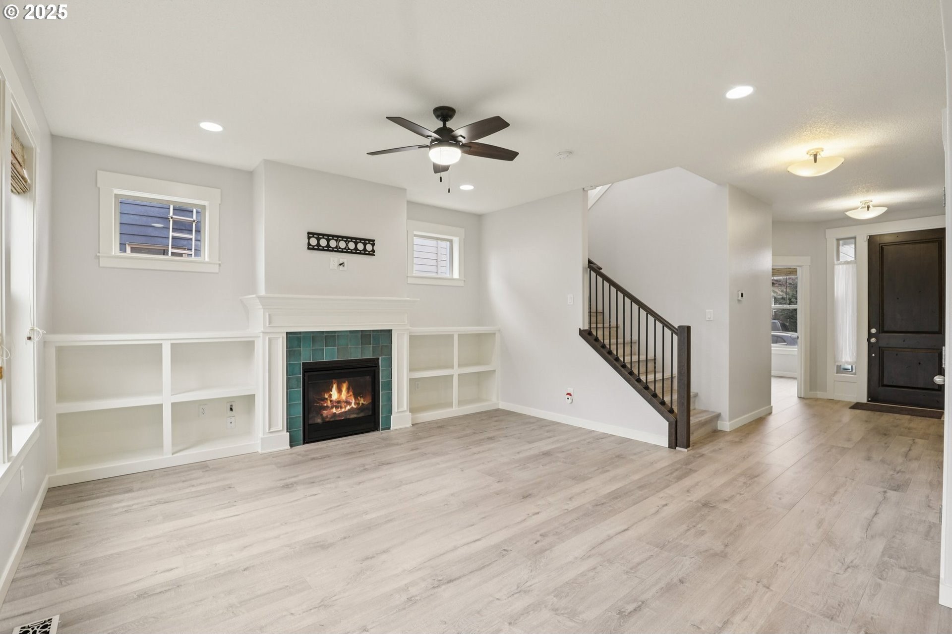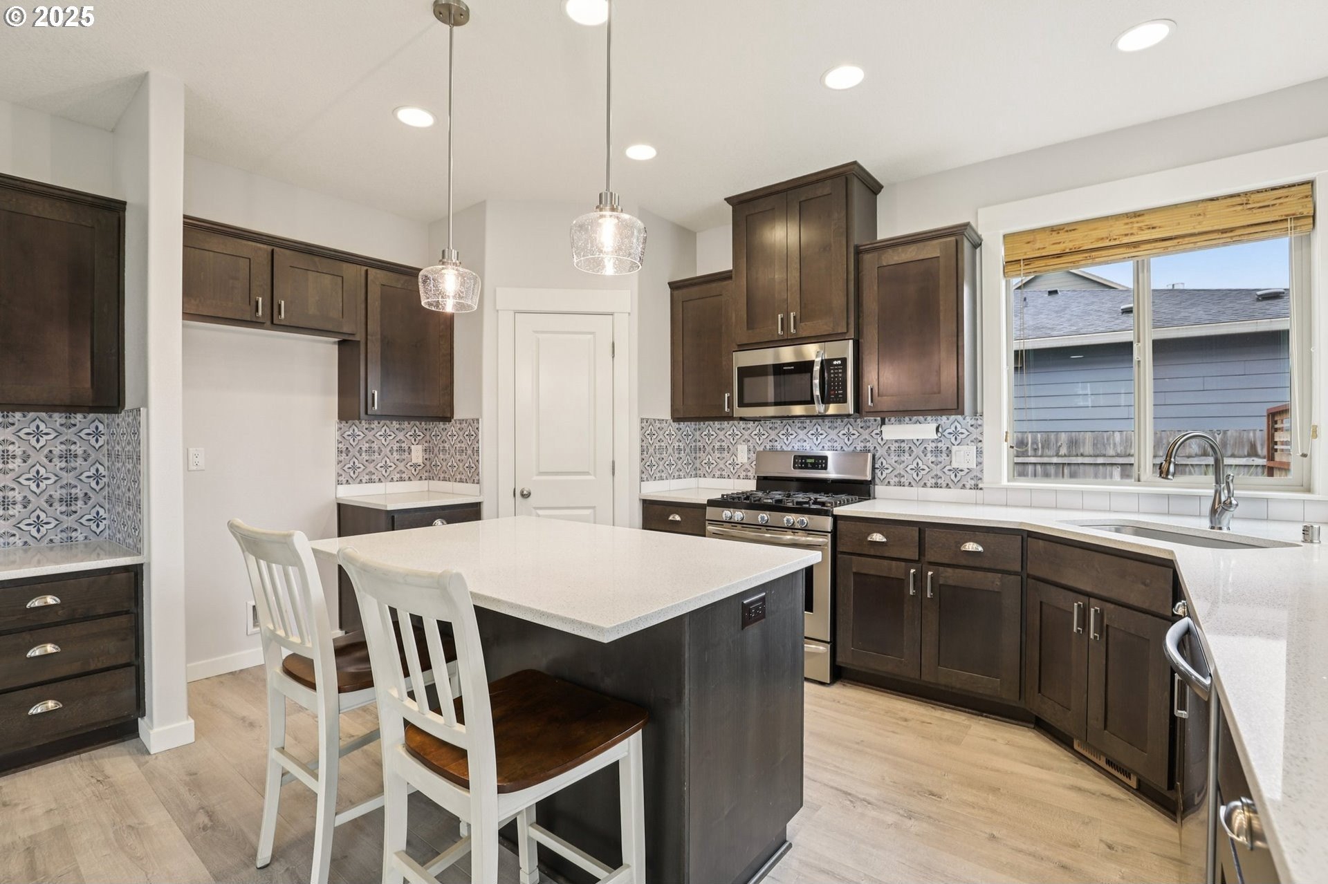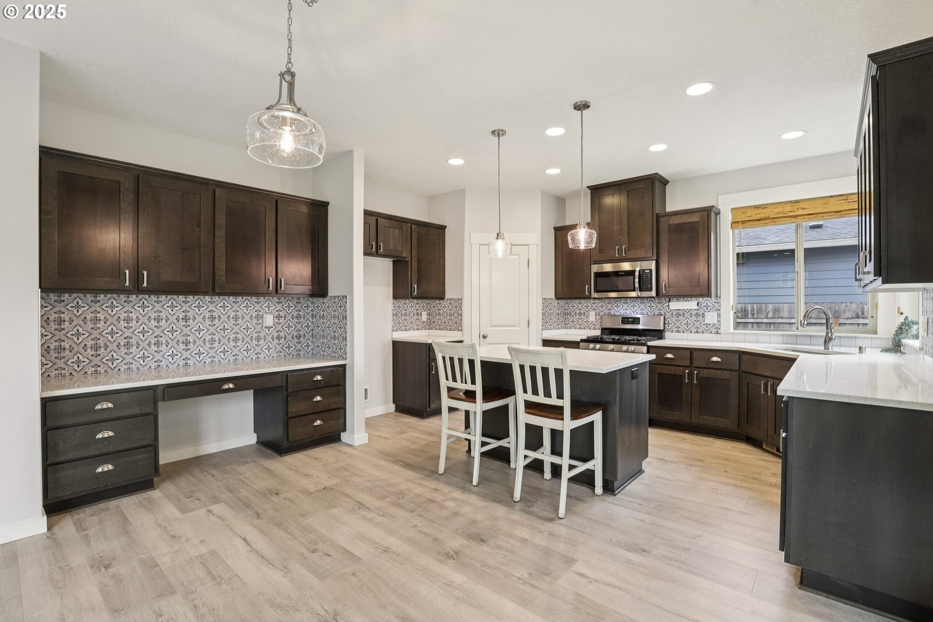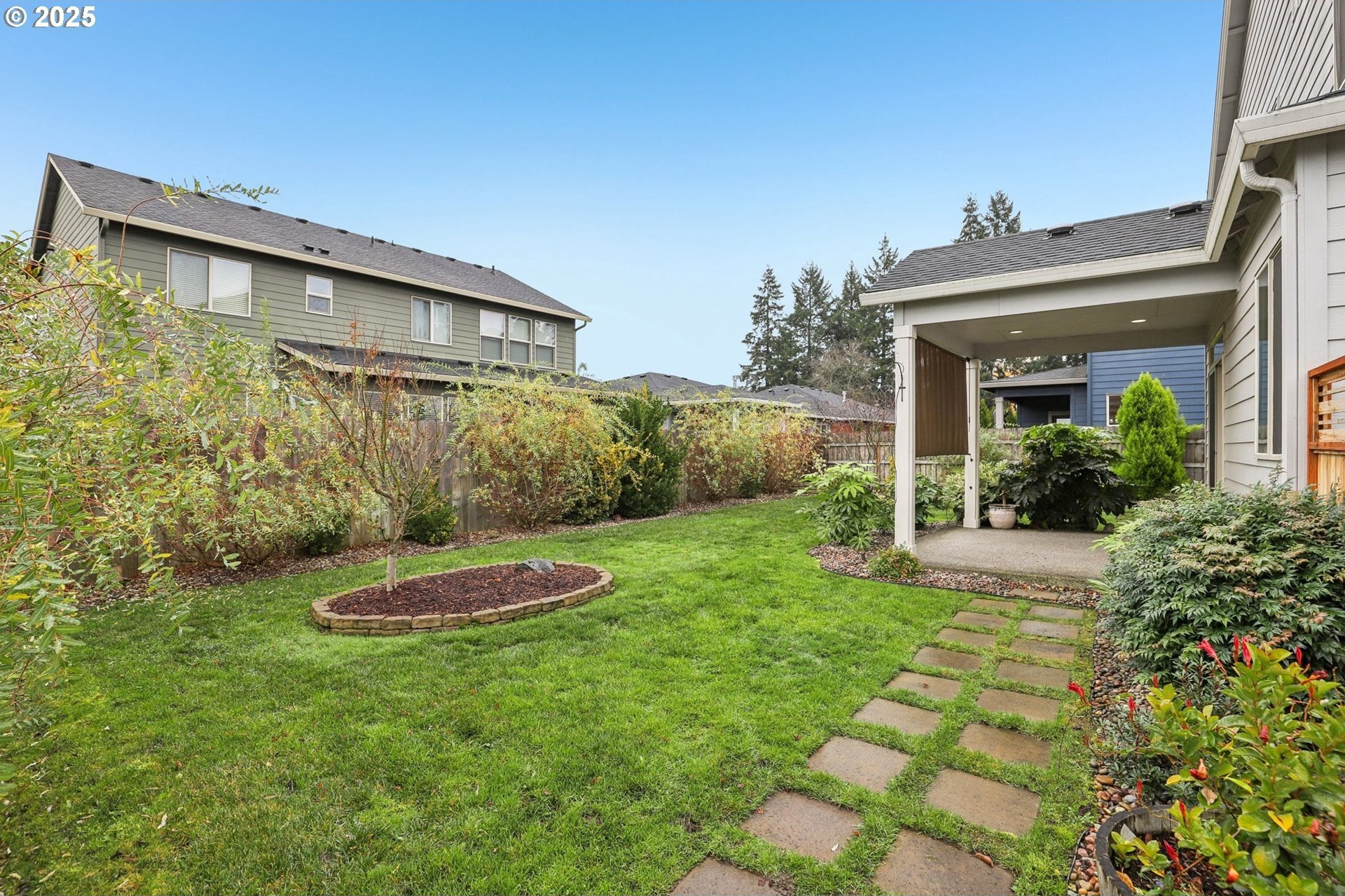 Custom - Not Builder Grade Home! Welcoming covered porch leads to an 8-ft front entry door with sidelite, opening into a wide entryway with high ceiling. Great room features a family room with tile surround gas fireplace, mantle, built-ins, clerestory windows, and ceiling light fan, flowing seamlessly into the gourmet kitchen. The kitchen offers stainless appliances including a built-in dishwasher and newer microwave, 5-burner gas range, complemented by quartz counters and tile backsplash, abundant cabinetry with space above for accessories, cornered walk-in pantry, and island/breakfast bar with generous storage, built-in desk area with quartz counter, pendant and recessed lighting, and high ceilings enhance the space. Dining area with slider access to the covered patio and backyard. Upstairs, the primary suite includes a ceiling fan, an spacious walk-in closet with organizer, and bath with dual quartz vanity with tile backsplash up to ceiling, free-standing soak tub with wainscoting surround, and separate shower tiled up to ceiling. Additional bedrooms include a main-level bedroom or den/office with full-lite entry door, walk-in closet, and under-stair storage, plus three additional upper-level bedrooms, two with walk-in closets and clerestory windows. The upper-level laundry room offers built-ins, clothes hang rod, plumbed for utility sink. A main-level powder room features a granite vanity, glass tile backsplash, and floating shelves, while the upper full bath includes a quartz vanity with tiled backsplash up to ceiling, and combo soak tub and shower. Interior highlights include New LVP flooring throughout, New tile flooring in upper baths, linen closet, utility closet, high main-level ceilings, freshly painted interior, and security system. Outside, enjoy a covered front porch, covered back patio with gas hookups, fully landscaped, sprinklers and drip system. 3-car garage with man door and built-ins. Mortgage savings may be available for buyers of this listing.
