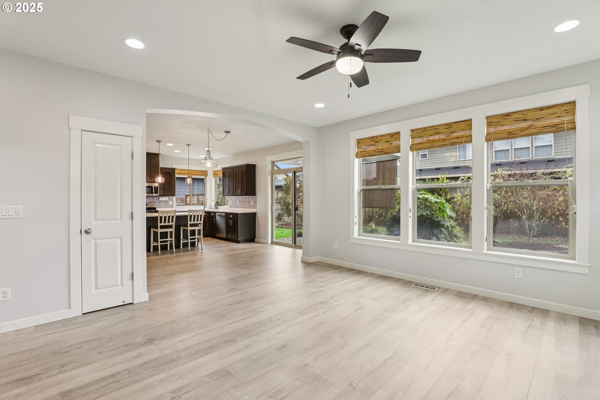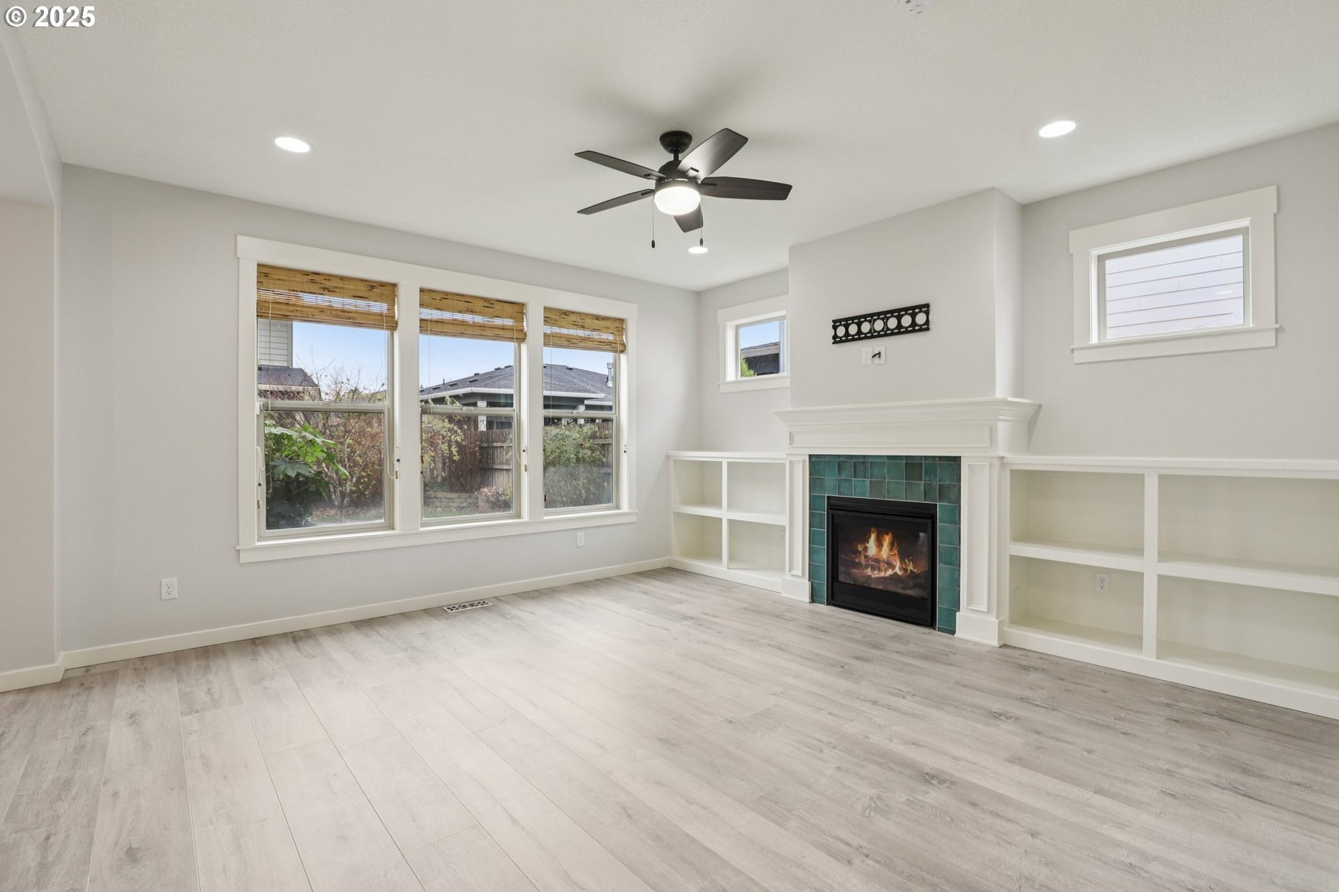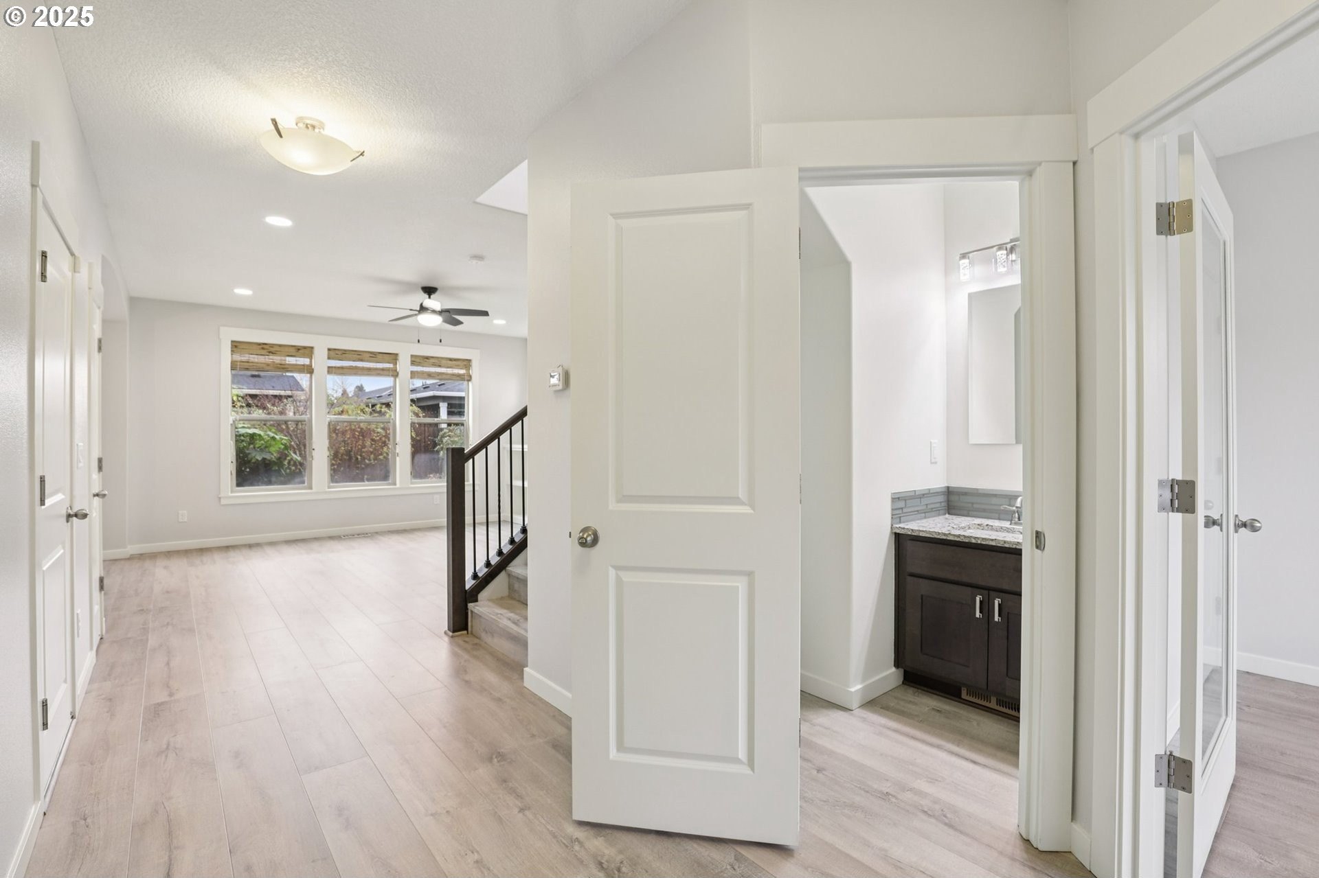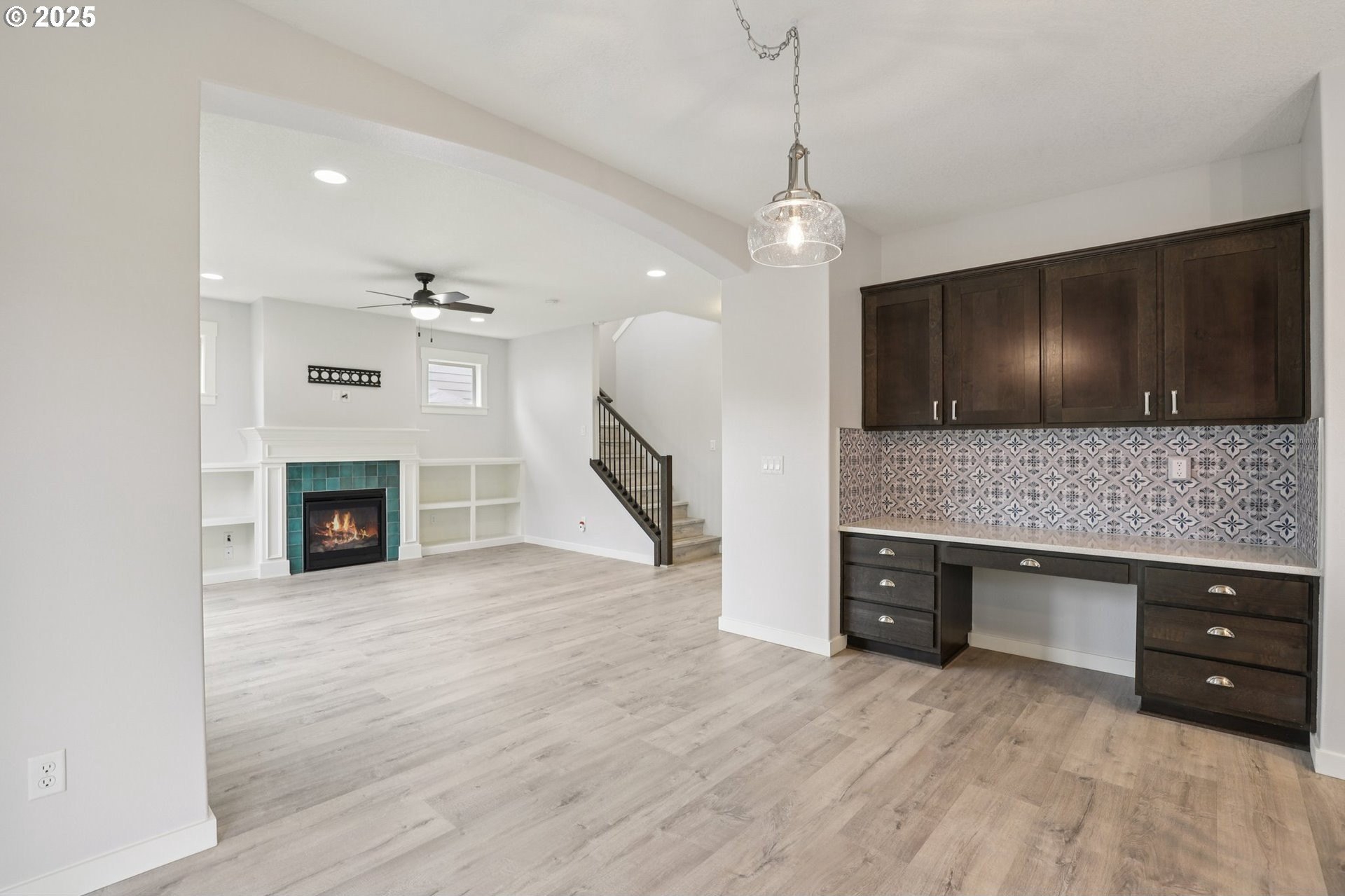 Custom - Not Builder Grade Home! Welcoming covered porch leads to an 8-ft front entry door with sidelite, opening into a wide entryway with high ceiling. Great room features a family room with tile surround gas fireplace, mantle, built-ins, clerestory windows, and ceiling light fan, flowing seamlessly into the gourmet kitchen. The kitchen offers stainless appliances including a built-in dishwasher and newer microwave, 5-burner gas range, complemented by quartz counters and tile backsplash, abundant cabinetry with space above for accessories, cornered walk-in pantry, and island/breakfast bar with generous storage, built-in desk area with quartz counter, pendant and recessed lighting, and high ceilings enhance the space. Dining area with slider access to the covered patio and backyard. Upstairs, the primary suite includes a ceiling fan, an spacious walk-in closet with organizer, and bath with dual quartz vanity with tile backsplash up to ceiling, free-standing soak tub with wainscoting surround, and separate shower tiled up to ceiling. Additional bedrooms include a main-level bedroom or den/office with full-lite entry door, walk-in closet, and under-stair storage, plus three additional upper-level bedrooms, two with walk-in closets and clerestory windows. The upper-level laundry room offers built-ins, clothes hang rod, plumbed for utility sink. A main-level powder room features a granite vanity, glass tile backsplash, and floating shelves, while the upper full bath includes a quartz vanity with tiled backsplash up to ceiling, and combo soak tub and shower. Interior highlights include New LVP flooring throughout, New tile flooring in upper baths, linen closet, utility closet, high main-level ceilings, freshly painted interior, and security system. Outside, enjoy a covered front porch, covered back patio with gas hookups, fully landscaped, sprinklers and drip system. 3-car garage with man door and built-ins. Mortgage savings may be available for buyers of this listing.