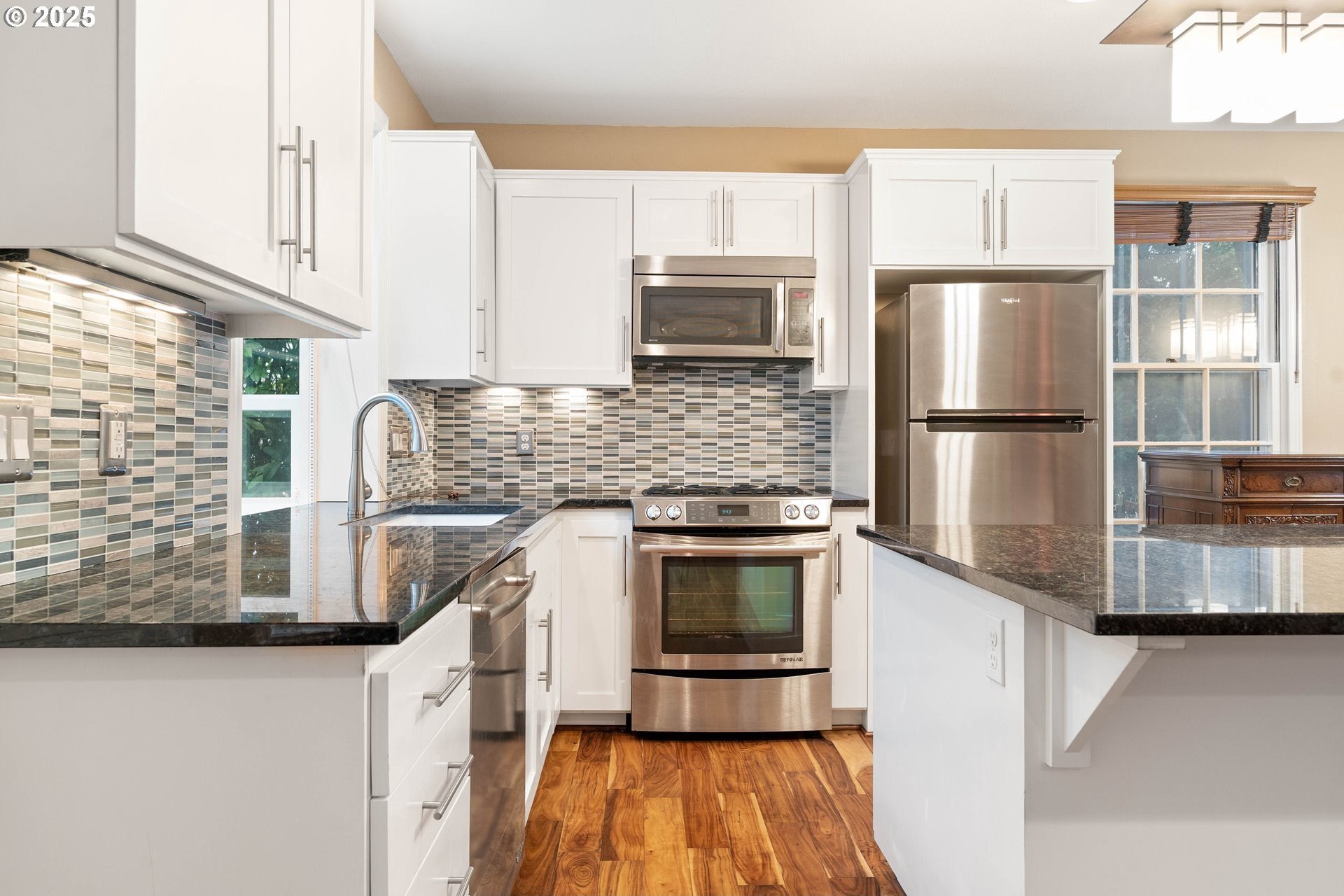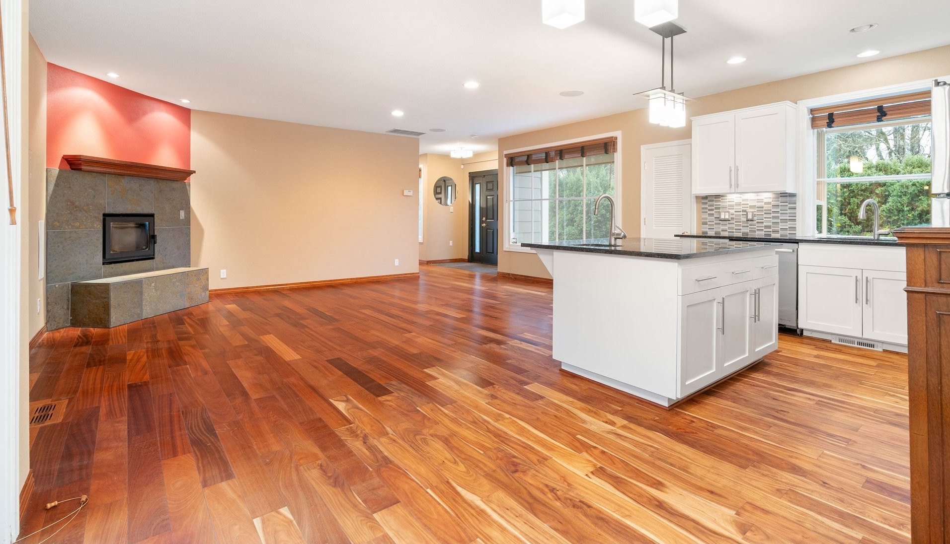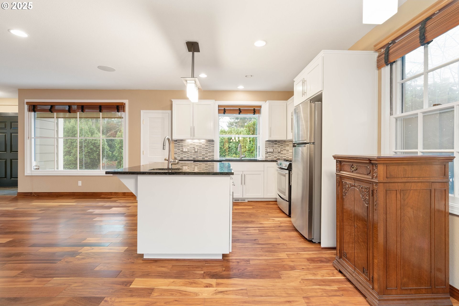 Located in the desirable Montclair neighborhood of Raleigh Hills, this beautifully remodeled bungalow offers excellent parking and a detached two-car garage. Inside, hardwood floors flow through the kitchen, dining room, family room, and hall. The fully updated kitchen features new cabinets, quartz countertops, stainless steel appliances, and an island with an eating bar. The kitchen, dining, and family rooms connect seamlessly, with a deck off the dining room and a gas fireplace in the family room.The primary suite has been thoughtfully remodeled with a no-step shower, new cabinetry, counters, and fixtures. The hall bath includes a tub/shower combination, updated cabinet, and quartz countertop. Outside, the large deck and usable yard provide plenty of space for entertaining. The detached garage includes built-in rooms and currently accommodates one car.