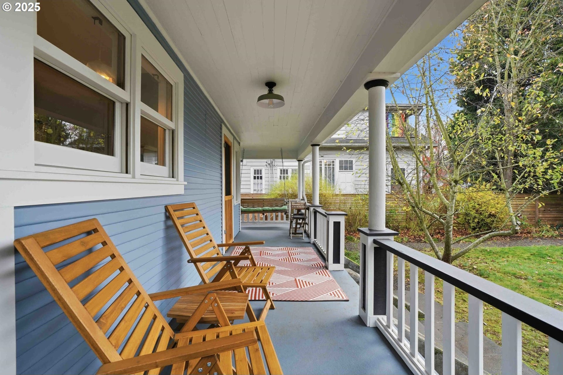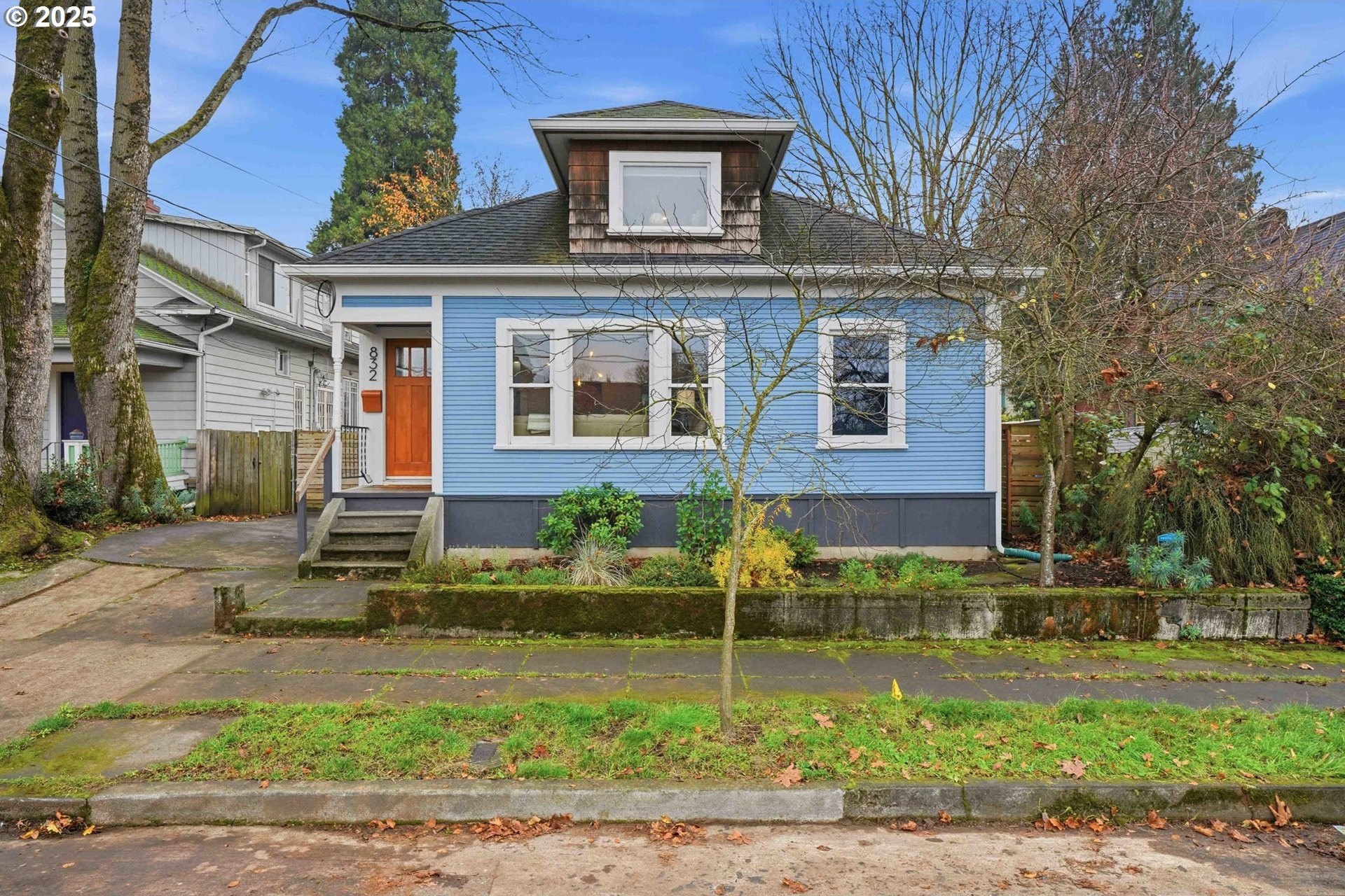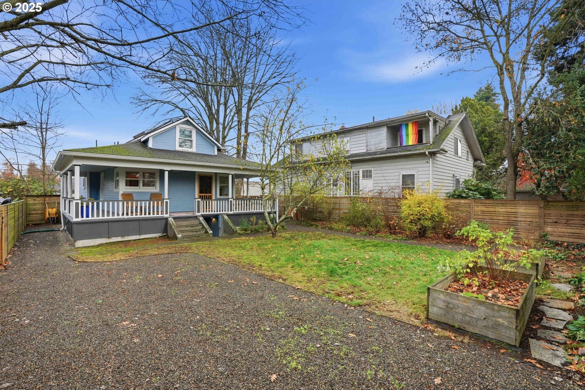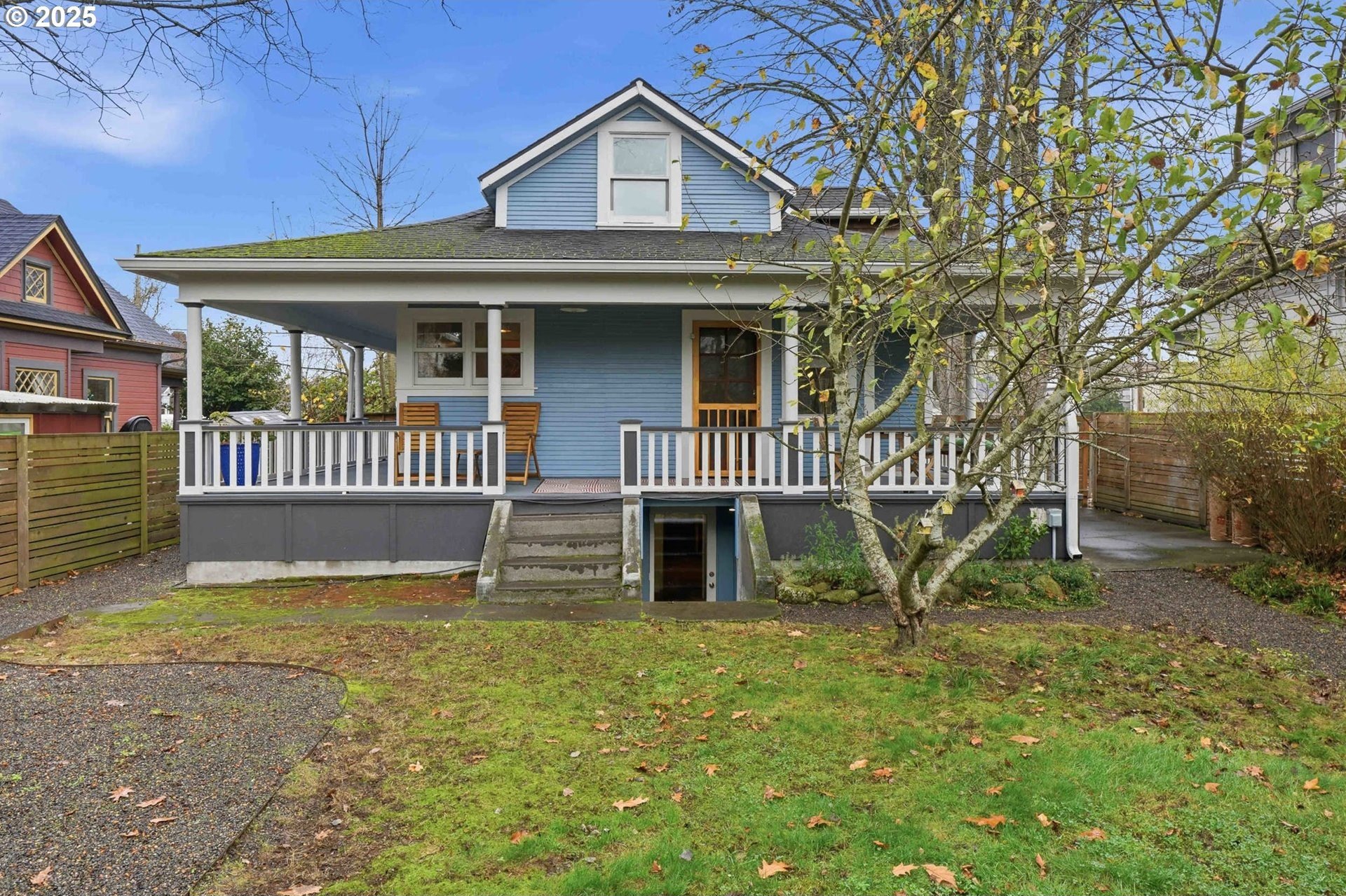 Classic 1902 North Portland bungalow with modern updates - a light, bright home in the historic Humboldt neighborhood, known for its tree-lined streets, historic architecture, and strong community character. Inside, a beautifully renovated kitchen features a striking tile backsplash that catches the morning light and opens directly to the south-facing wrap-around covered porch, creating an easy indoor-outdoor flow. Both bathrooms have been updated with clean, modern tile surrounds, and the upper-level primary suite includes built-ins and a versatile bonus room suitable for a variety of uses. Large windows throughout give the home an open, airy feel. Radiant floor heating with a tankless boiler and double-pane windows provide efficient year-round comfort. An exterior entry leads to a spacious basement offering abundant storage, workshop potential, or project space. The fully fenced yard includes garden boxes and mature plantings that will burst with color in the spring. Established blueberry and raspberry bushes and apple and plum trees round out this urban oasis. Fresh exterior paint and the classic bungalow facade highlight the home's long-standing charm and thoughtful upkeep. Humboldt offers convenient access to nearby shops, dining, transit, parks, and neighborhood amenities. Known for its historic roots and creative energy, the area continues to be one of North Portland's most engaging and well-loved communities. A rare blend of early-century architecture, contemporary updates, bright interiors, generous outdoor space, and a location with everyday conveniences close at hand. Ready for its next chapter.