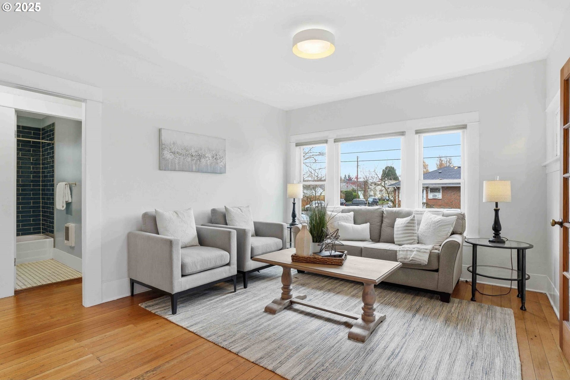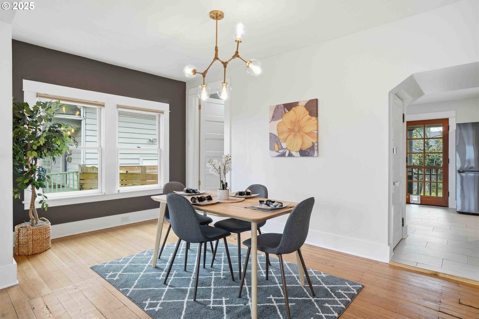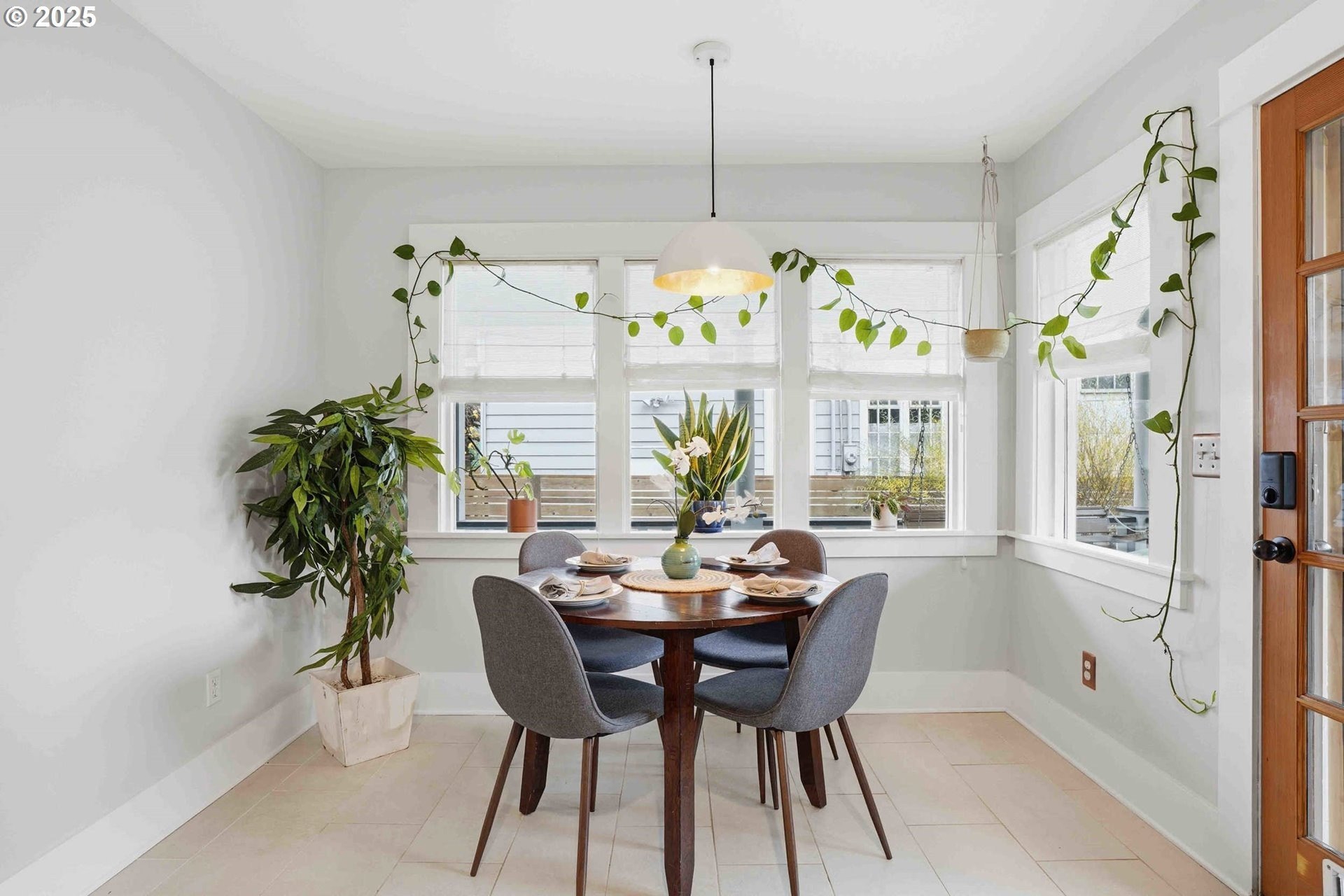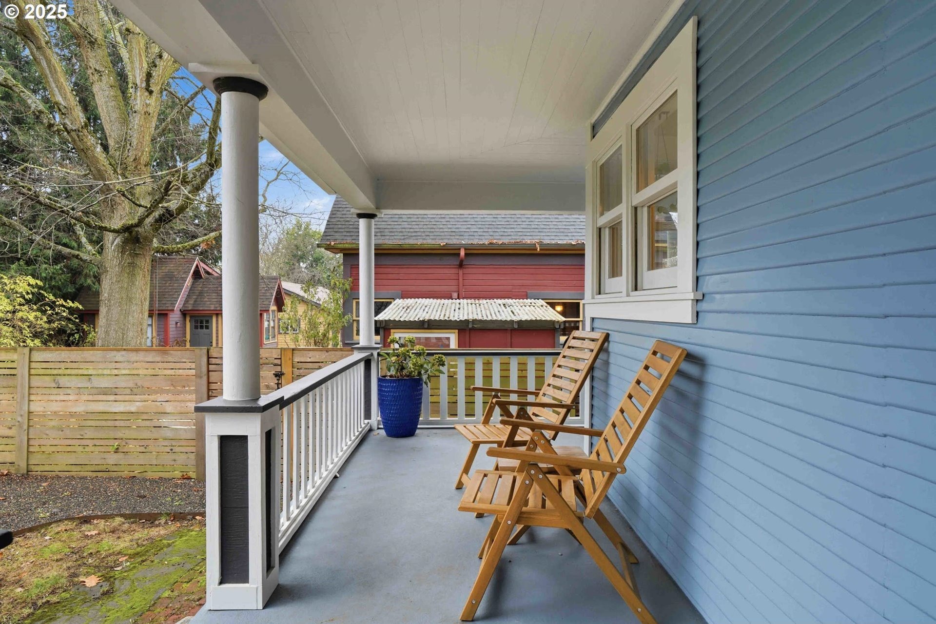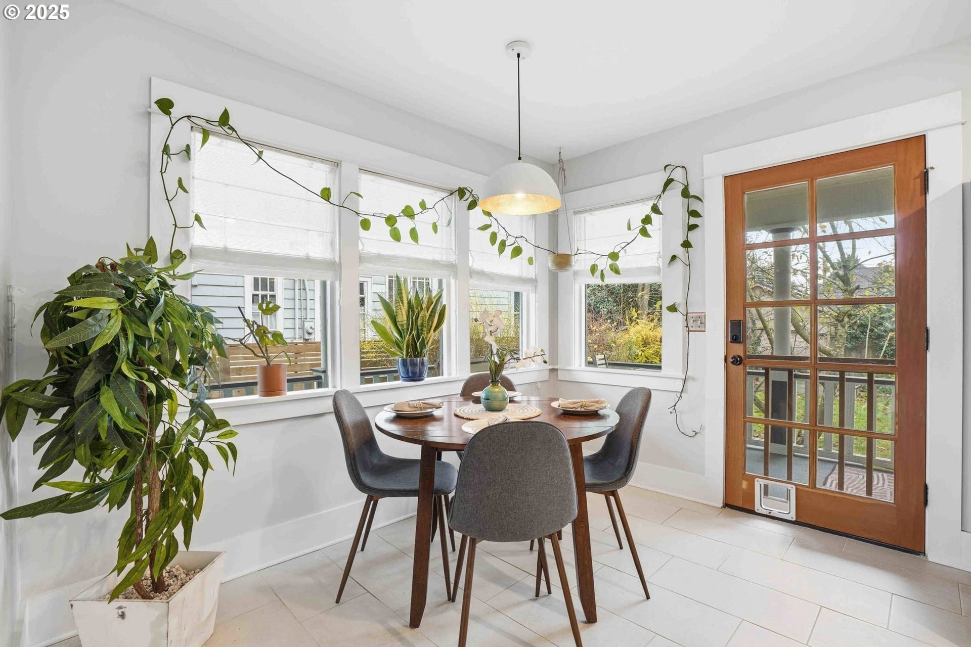 Classic 1902 North Portland bungalow with modern updates - a light, bright home in the historic Humboldt neighborhood, known for its tree-lined streets, historic architecture, and strong community character. Inside, a beautifully renovated kitchen features a striking tile backsplash that catches the morning light and opens directly to the south-facing wrap-around covered porch, creating an easy indoor-outdoor flow. Both bathrooms have been updated with clean, modern tile surrounds, and the upper-level primary suite includes built-ins and a versatile bonus room suitable for a variety of uses. Large windows throughout give the home an open, airy feel. Radiant floor heating with a tankless boiler and double-pane windows provide efficient year-round comfort. An exterior entry leads to a spacious basement offering abundant storage, workshop potential, or project space. The fully fenced yard includes garden boxes and mature plantings that will burst with color in the spring. Established blueberry and raspberry bushes and apple and plum trees round out this urban oasis. Fresh exterior paint and the classic bungalow facade highlight the home's long-standing charm and thoughtful upkeep. Humboldt offers convenient access to nearby shops, dining, transit, parks, and neighborhood amenities. Known for its historic roots and creative energy, the area continues to be one of North Portland's most engaging and well-loved communities. A rare blend of early-century architecture, contemporary updates, bright interiors, generous outdoor space, and a location with everyday conveniences close at hand. Ready for its next chapter.
