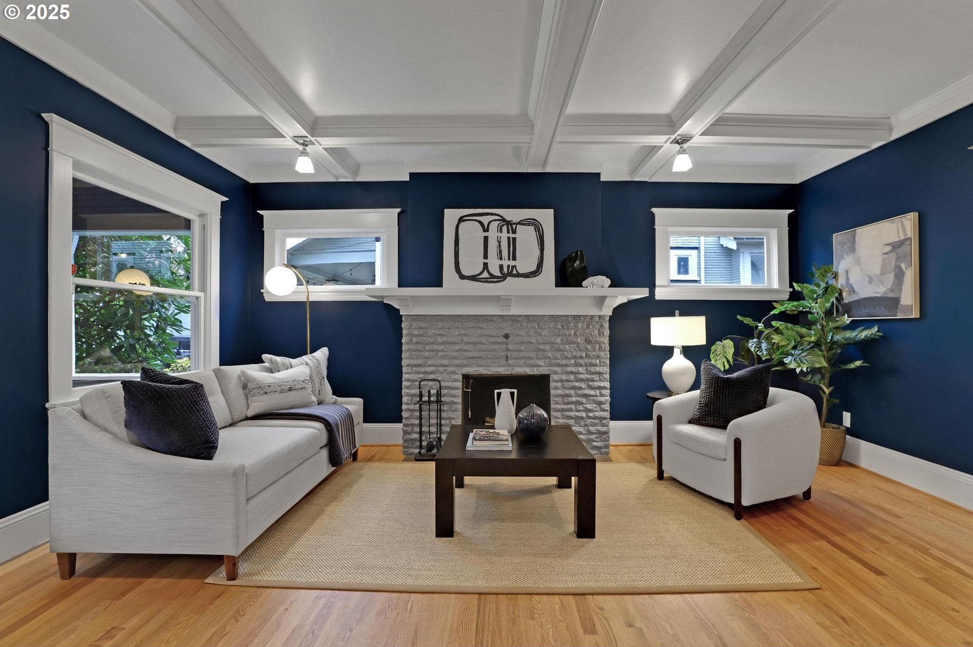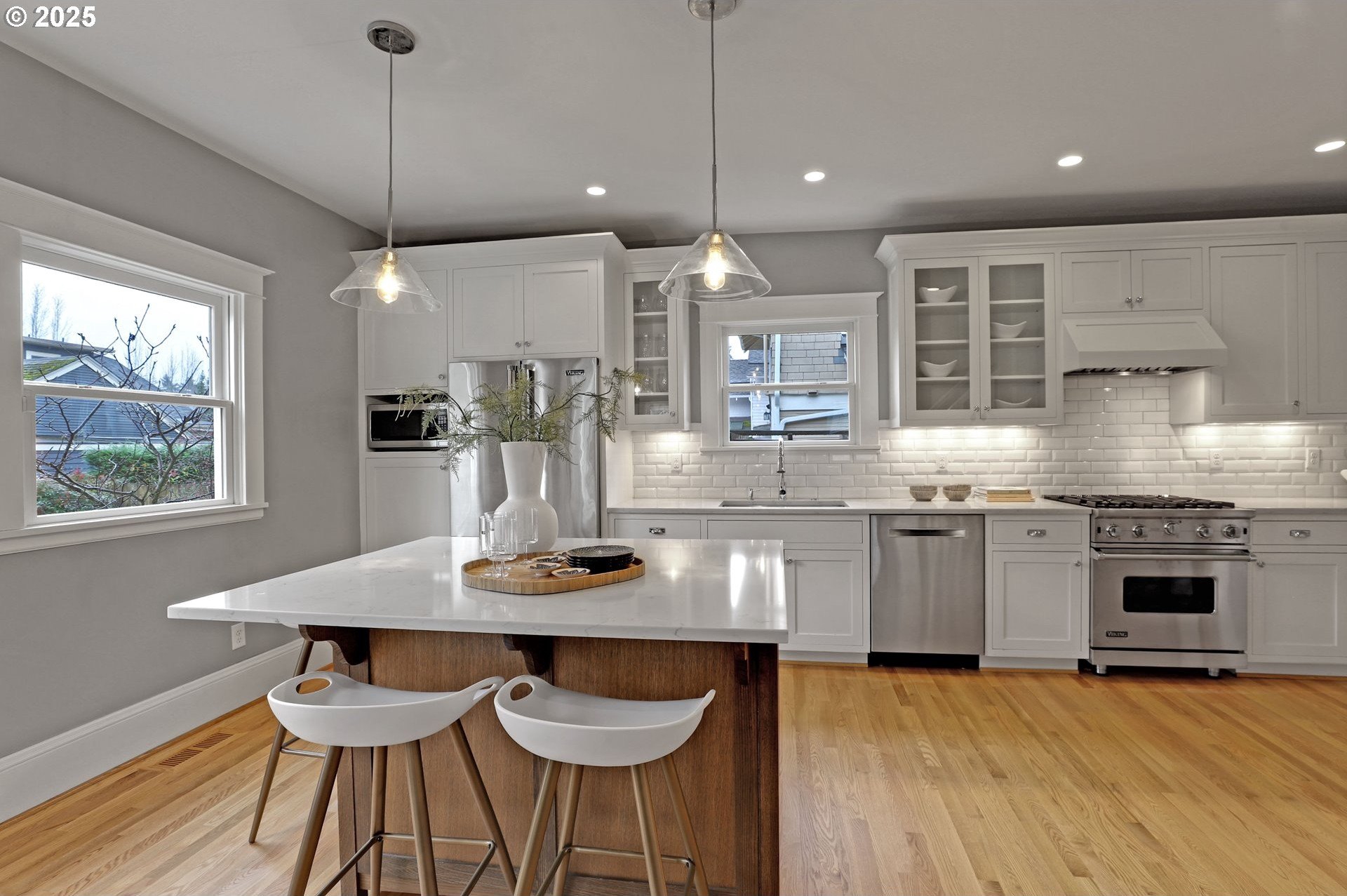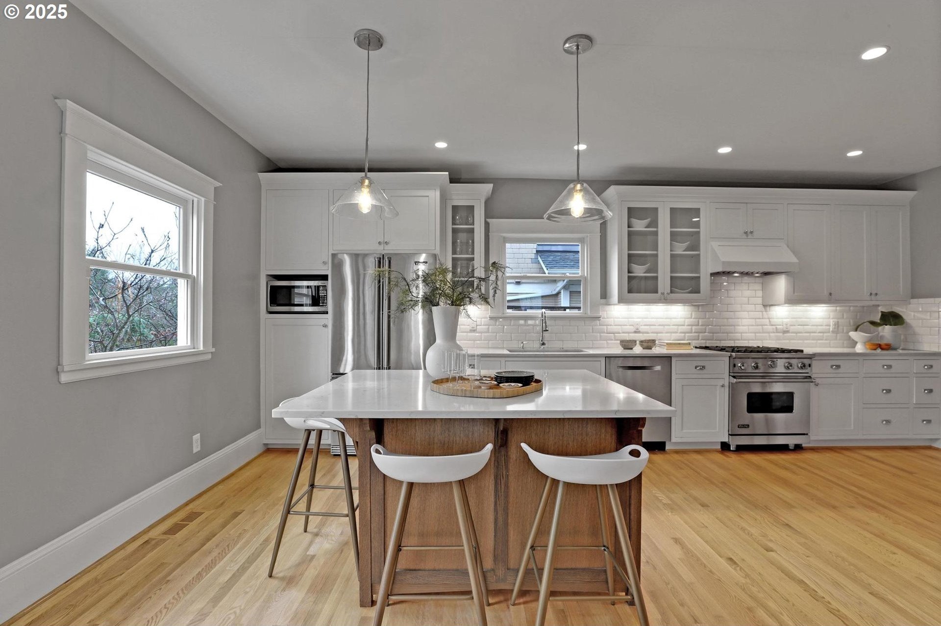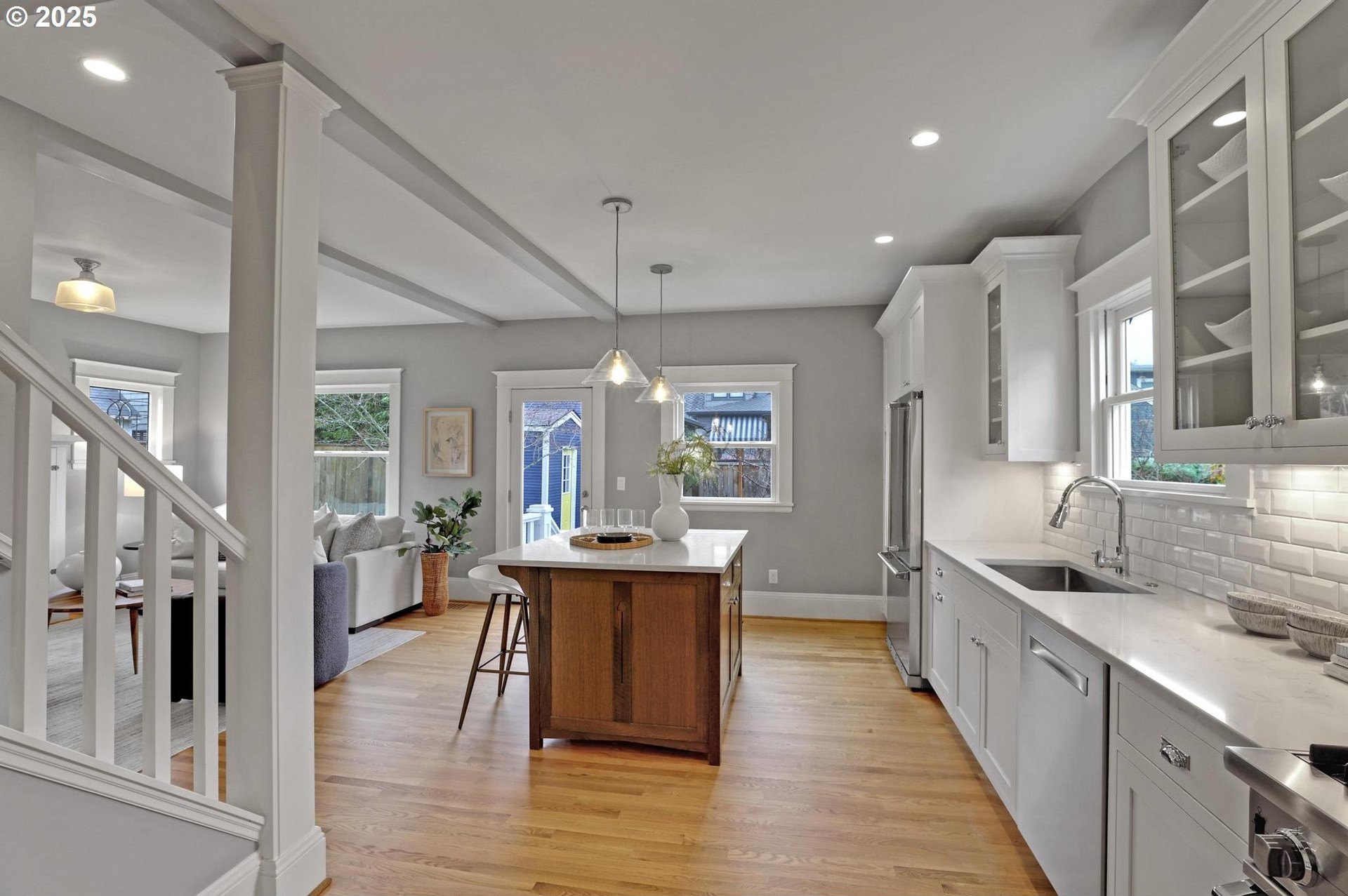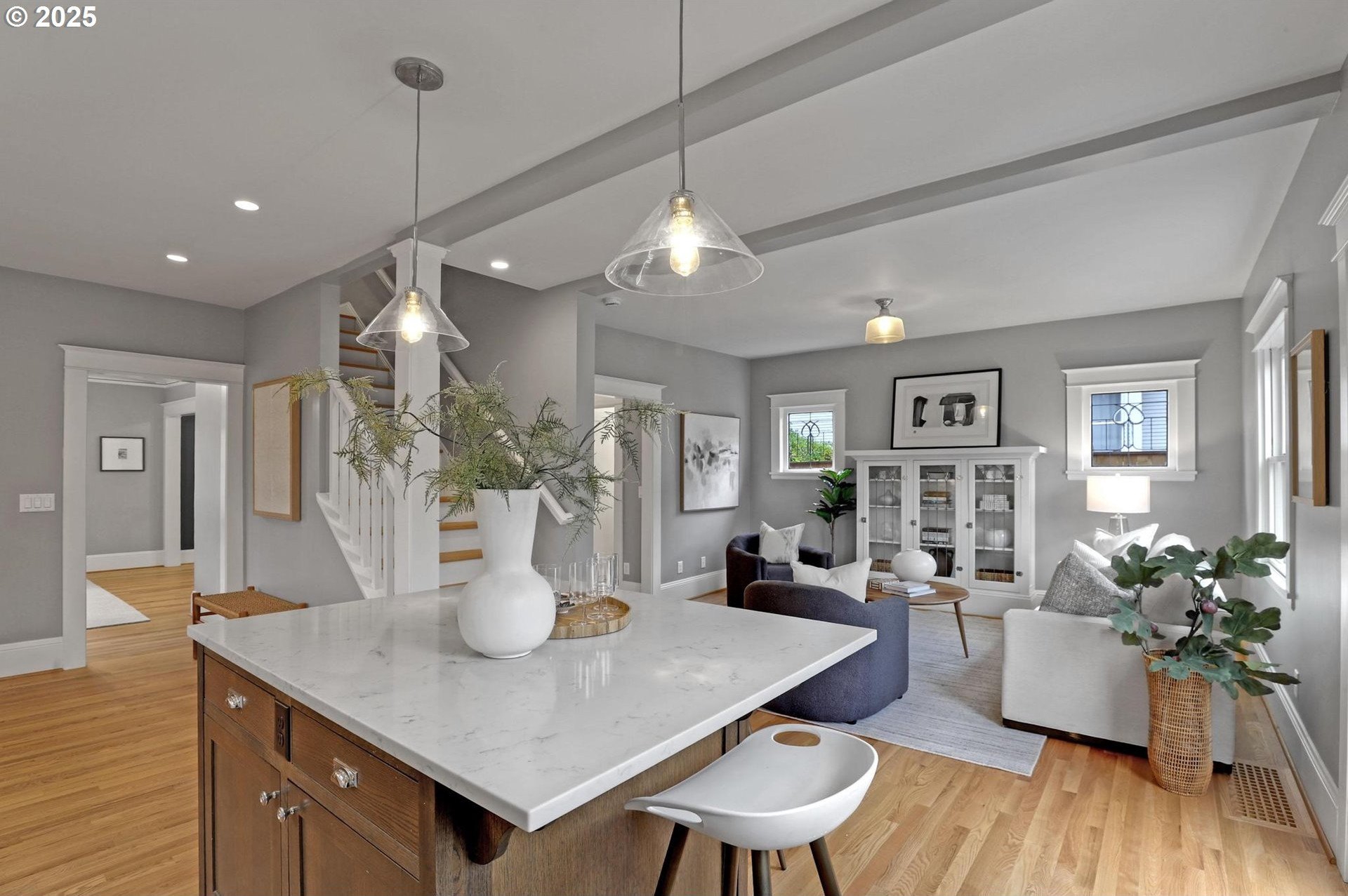 Nestled in the heart of Portland's sought-after Alameda neighborhood, this beautifully remodeled home blends timeless charm with modern comfort. This gorgeous light-filled home sits graciously above the ideal, quiet and tree-lined street. Fabulous covered front porch to enjoy the view. With brand new exterior paint, the curb appeal is welcoming and wonderful. The entryway opens to newly refinished hardwoods on the entire main floor, and an elegant formal living room with chic wood-burning fireplace and boxed beamed ceilings. The formal dining room features charming original leaded-glass built-ins, a large bay window with bench seating and more boxed beam ceilings. Big picture windows and natural light everywhere! Enter the big, beautiful and open kitchen with seamless connection to most fabulous great room. Perfect area for everyday family togetherness and entertaining large groups. The heart of this gourmet kitchen is a large cook's island with quartz countertops, custom cabinetry and seating for four. Stainless-steel appliances include Viking professional gas range and ZEPH'R range hood, Viking refrigerator and a Bosch dishwasher. The great room features the original charming leaded glass windows and built-ins. Easy outdoor access from the kitchen and great room into a large, fully fenced backyard, ideal for barbecues and watching kids play while you cook. Lovely half bath off the hallway for easy circular flow of entire main floor. Upstairs there are three generous bedrooms and two bathrooms, including a stunning vaulted primary suite with walk-in closet and private bath. The entire ensuite lives large and beautifully! The finished lower level adds flexibility for guests with a fourth bedroom, full bath, ideal office space, laundry room, along with a family room everyone will love. Please see impressive "Home Improvements & Highlights" list and carefully curated "What's Nearby" list for all the fun restaurants, cafes, parks and shopping. Open 12/6 & 12/7, 1-3 pm. [Home Energy Score = 3. HES Report