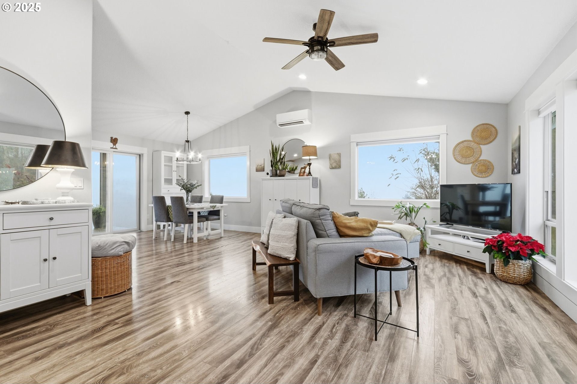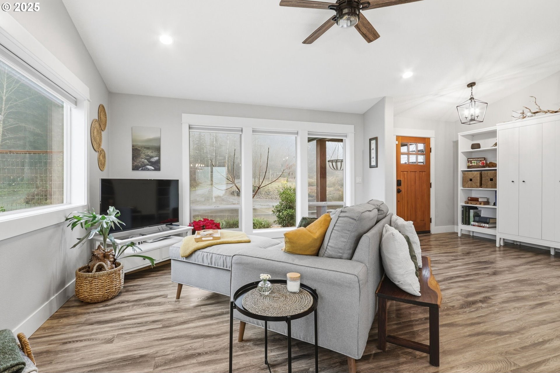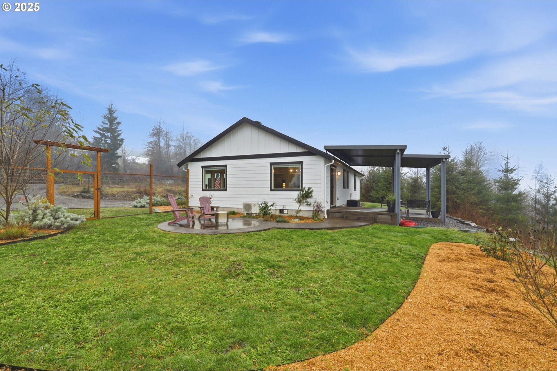 Welcome to this beautiful 3-bedroom, 2-bathroom home situated on just over 8 private, sloped acres of wooded land in Yacolt. Inside, the bright, open-concept floor plan is instantly inviting, with vaulted ceilings and abundant windows that fill the space with natural light and showcase serene year-round tree views. The property is an outdoor enthusiast's and homesteader's dream. It features invaluable direct river front access and a highly productive outdoor setup, including an established orchard, ready-to-use raised garden beds, a functional chicken coop, and a large hoop house for extended-season growing. All of this is protected within a fully enclosed, deer-fenced yard. The beautiful outdoor patio with a view is perfect for relaxation, and the spacious 20x24 detached garage provides excellent secure parking and outstanding potential for a dedicated workshop
