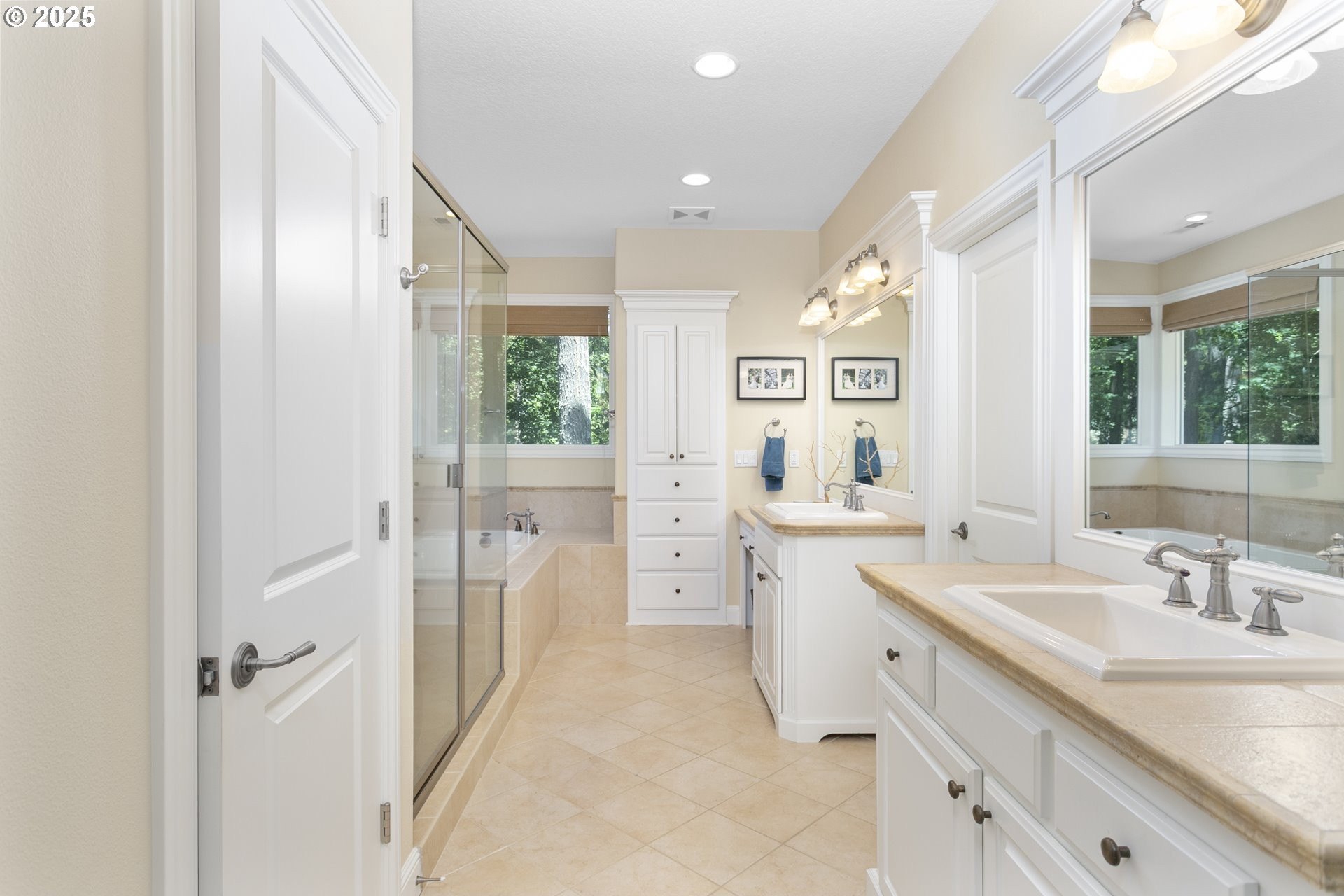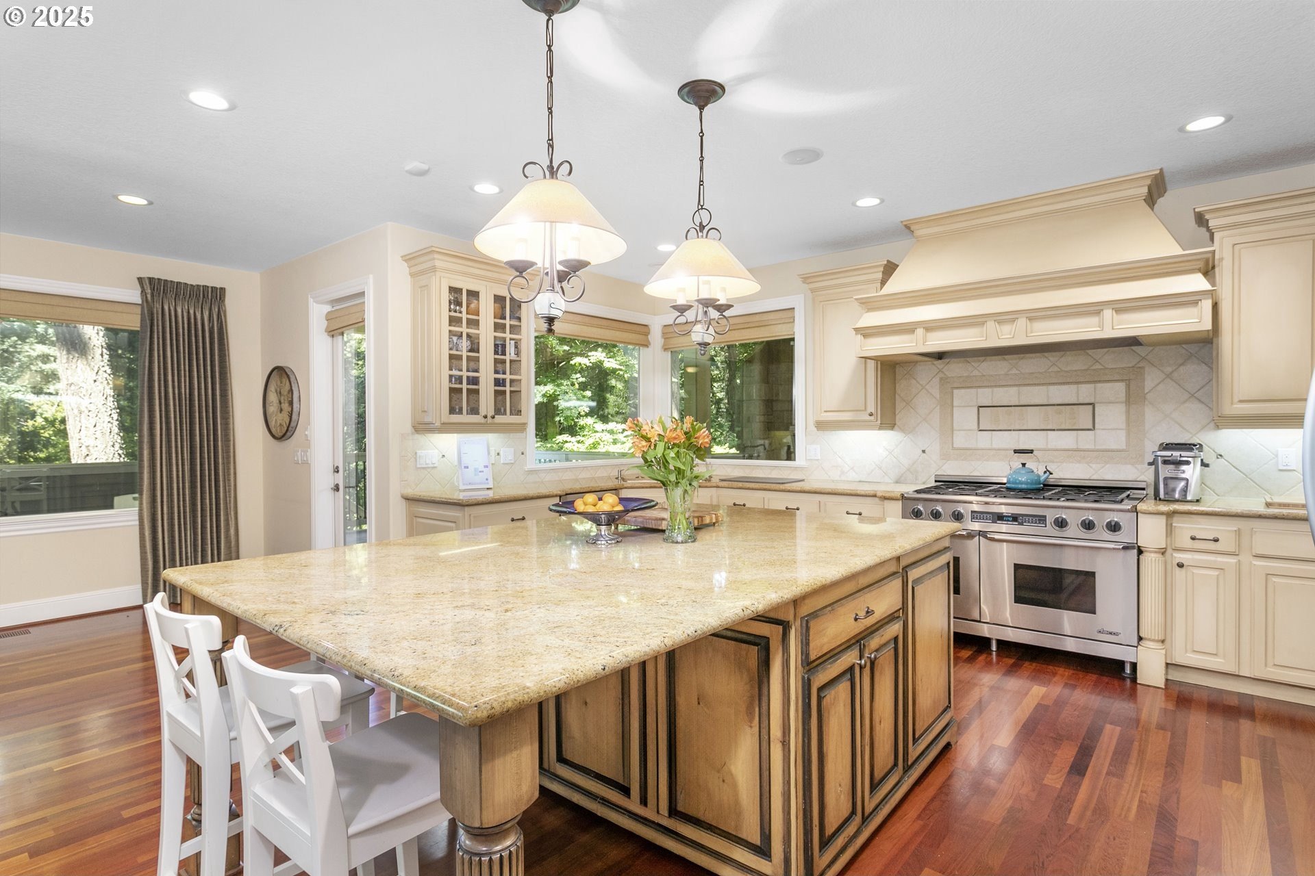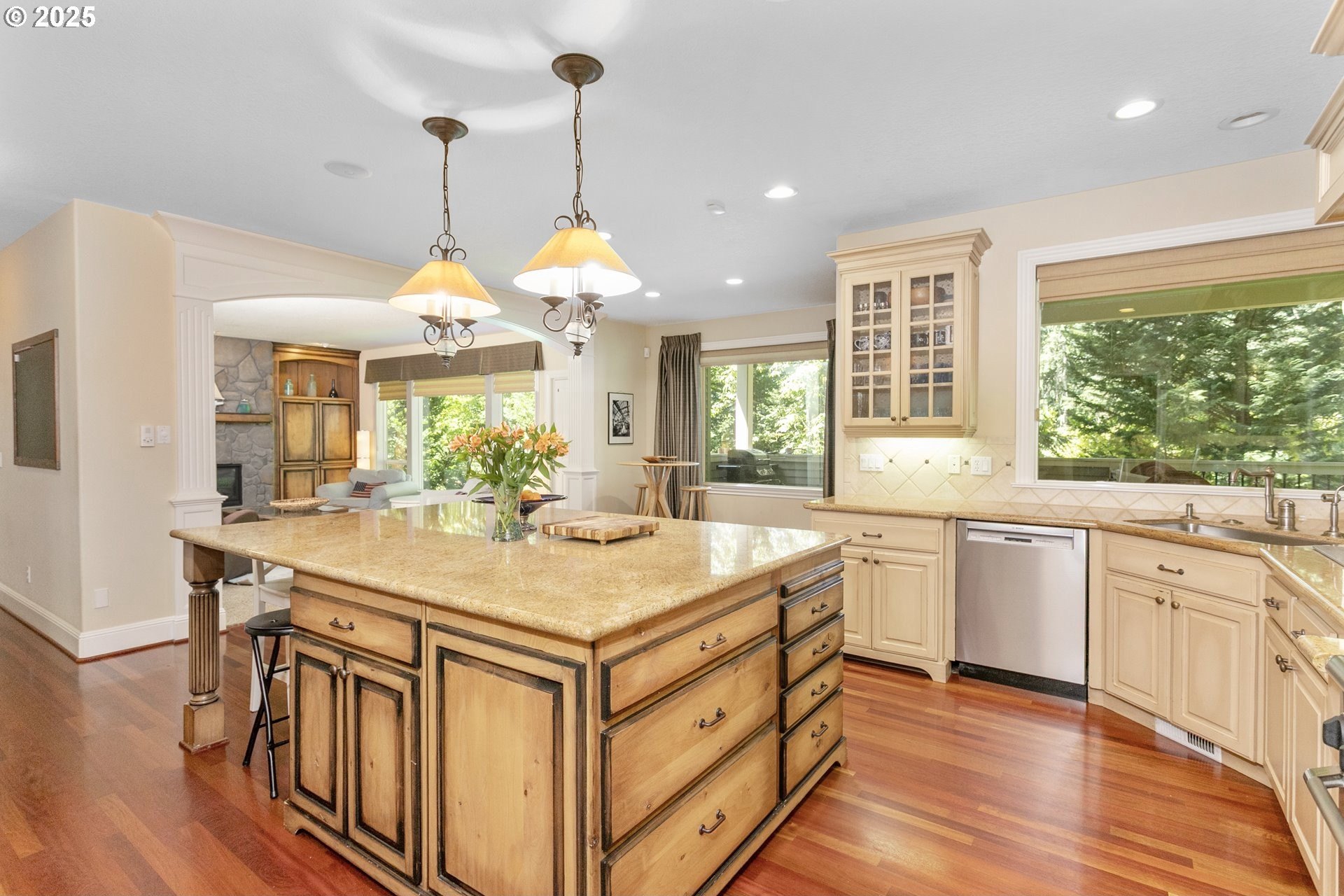 Welcome to a stunning traditional residence nestled in Lake Oswego's coveted Westridge neighborhood, complete with exclusive Lake Easement privileges. Designed for generational living, this exceptional residence offers approximately 5,531 sq. ft. of finished luxury plus 1,105 sq. ft. of unfinished lower-level space ideal for storage, hobbies, or a workshop; all accessible by a three-story elevator. Built in 2003 and thoughtfully crafted across three levels, the home blends timeless elegance with modern functionality. The heart of the home is the expansive, open concept kitchen featuring a granite island with eating bar, double ovens, instant hot water, a butler's pantry, and a wet bar, perfect for everyday living and effortless entertaining. The formal dining room opens to a covered patio with an outdoor fireplace, creating a seamless indoor/outdoor gathering space. The inviting family room showcases a gas fireplace and large windows that fill the space with natural light, while a separate formal living room and a main level office with custom built-ins provide flexible and refined living areas. Upstairs, the vaulted primary suite offers a serene retreat with a spa inspired ensuite bathroom featuring a soaking tub, dual vanities, a tiled shower, and an oversized walk-in closet. The second and third bedrooms each enjoy their own ensuite bathrooms and walk-in closets, offering privacy and comfort for family or guests. The lower level includes a dedicated home theater with reclined seating, along with abundant storage options. Set on a .62-acre, fully fenced lot, the property offers exceptional space and privacy. The 4-car garage, finished with classic black and white tile, built-in storage, workbench, and compressor, is a hobbyist's dream. A true standout, this home unites elegance, space, and modern convenience in an unbeatable Lake Oswego location.