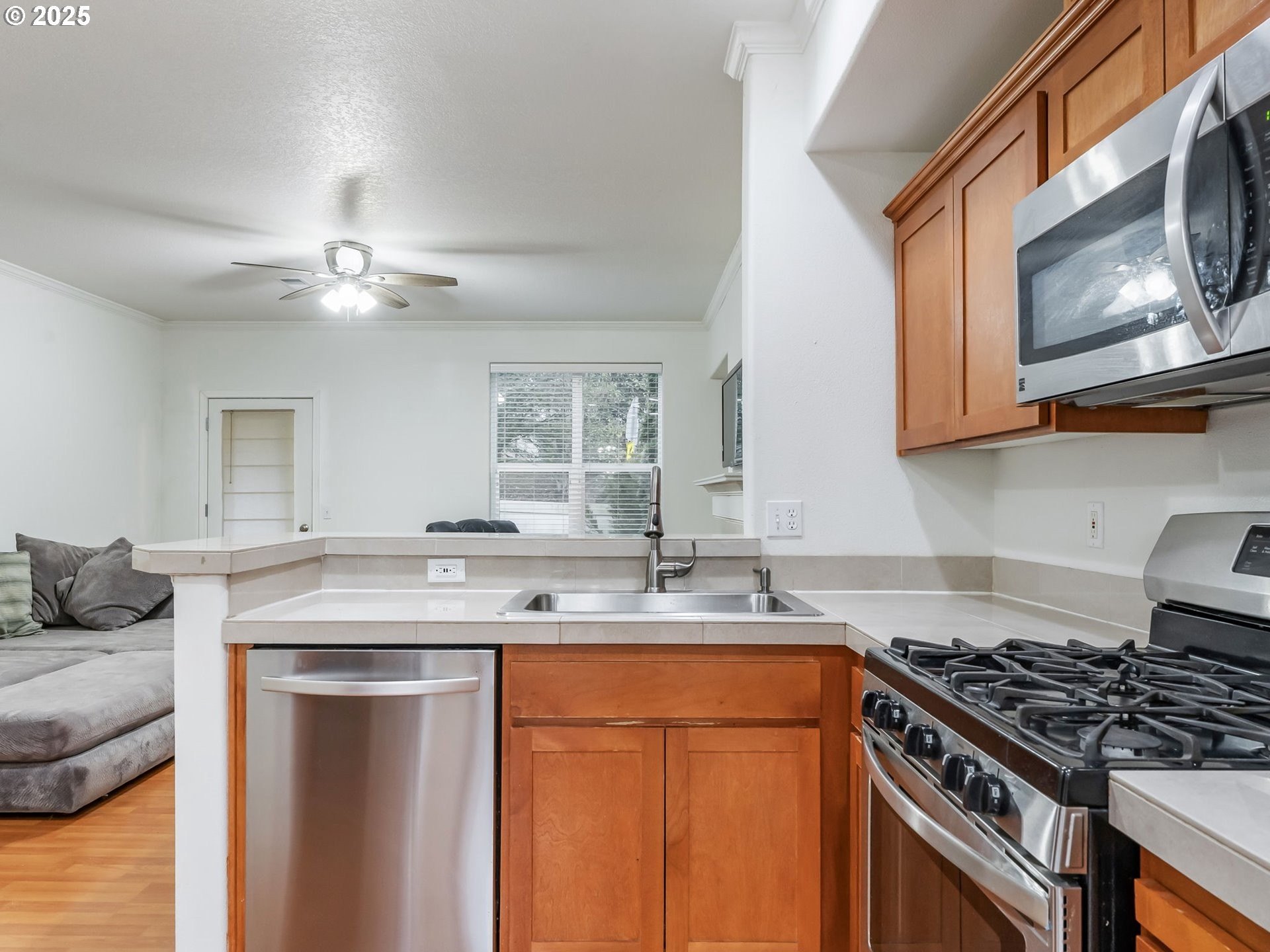 Townhome-Style Condo in Highly Desired NW Portland - Live in an Upscale Area at an Attainable Price! An incredible opportunity to own a home in Coveted Forest Heights! This home offers the ideal blend of privacy and convenience. The flowing layout includes a comfortable living room with gas fireplace, a formal dining room and a functional kitchen including all SS appliances; dishwasher, microwave, 5 burner gas range and a fridge, tile countertops and ample cabinets. Upstairs has 2 Bedrooms that are well-sized, offering flexibility for work, guests. An in-closet laundry space with washer/dryer. Update includes new carpet throughout, paired with durable laminate flooring on the main level and linoleum in the bathrooms. Recent system upgrades add peace of mind, including a new gas water heater and newer HVAC system. Enjoy a low maintenance backyard featuring covered patio, garden, patio-ideal for entertaining, gardening. Attached 1-car garage with additional storage. Nearby parks include Forest Heights City Park and Bonny Slope Park. Close to schools, trails & running errands. This home is clean and move-in ready, yet offers plenty of potential for cosmetic updates to build equity and make it your own. A wonderful opportunity to own your slice of NW Portland living! [Home Energy Score = 9. HES Report