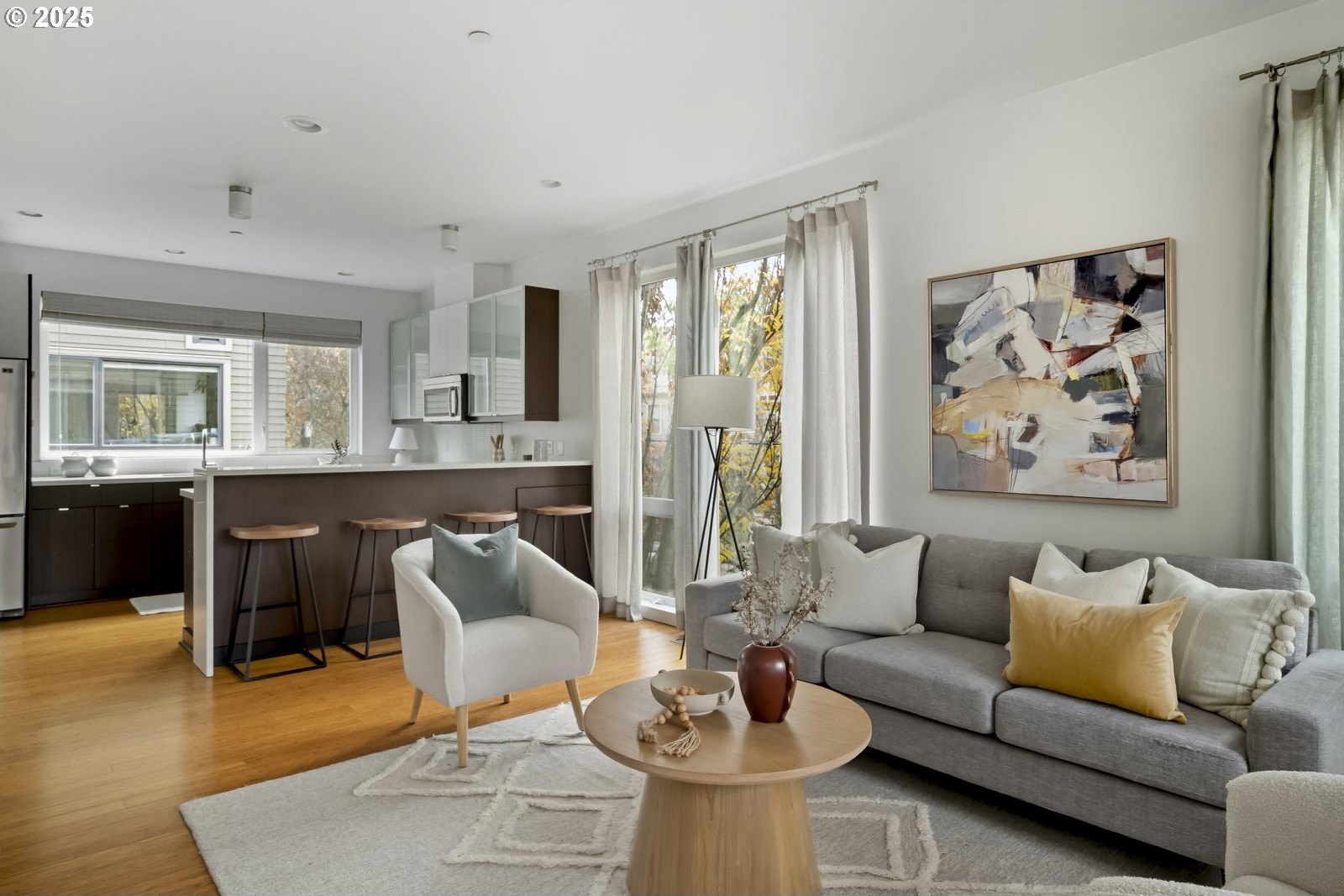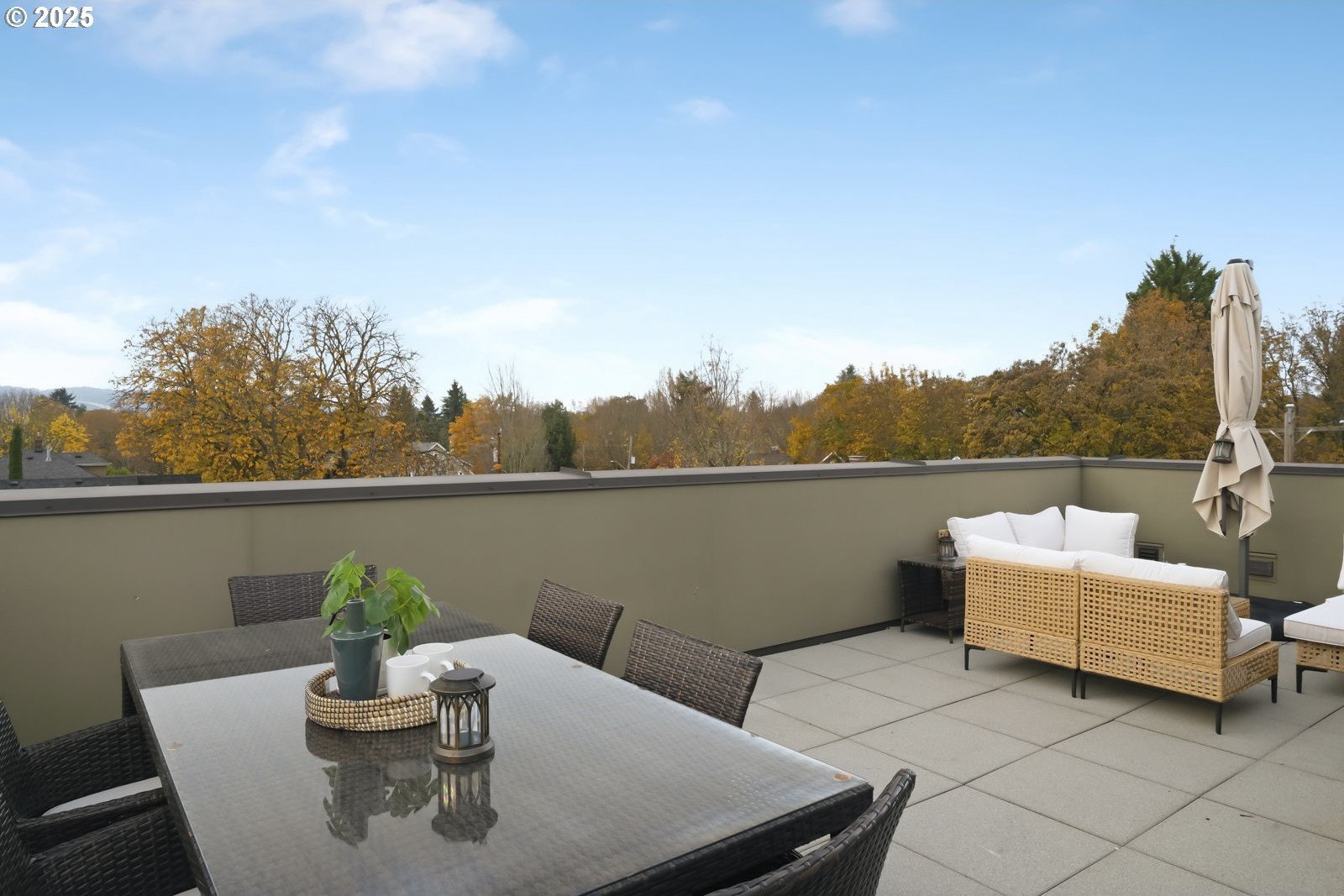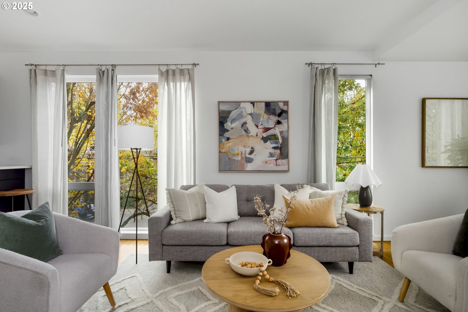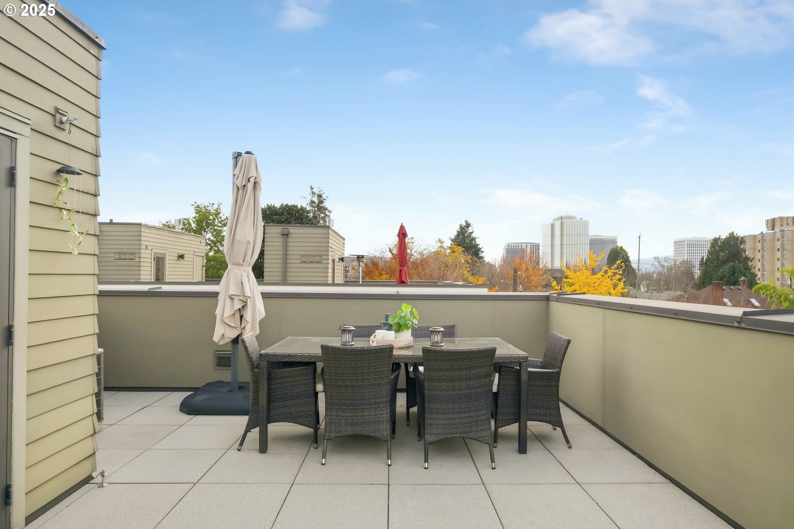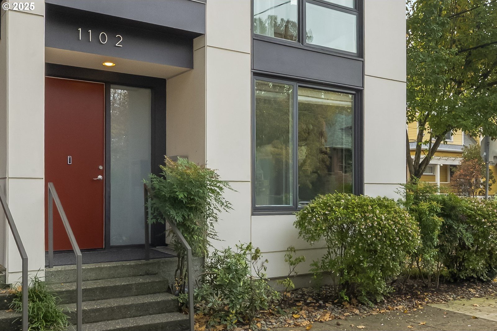 Located in the heart of historic Irvington, this rare end-unit townhouse-style condo offers modern comfort within one of Portland's most beloved neighborhoods. It truly lives like a detached home with its own front door, attached garage, and thoughtful upgrades throughout. The cook's kitchen is a true centerpiece-Neil Kelly cabinetry, deep drawers, quartz counters, pantry, and a generous eating bar that flows into an open living and dining area. Floor-to-ceiling windows on three sides bathe the home in natural light, creating a warm, inviting feel in every season. A gas fireplace and balcony with gas/water hookups make indoor-outdoor living effortless. Upstairs, two luminous primary suites feature wool carpet, Neil Kelly closets, and spa-inspired baths-one with an oversized soaking tub, the other with double shower heads. The larger suite offers a private balcony that catches the morning light and feels made for coffee, calm and a little container garden magic. Flexible laundry options include hookups upstairs or in the oversized garage with abundant storage. A Home Energy Score of 10 reflects the home's efficiency and low-impact design. And then-there's the rooftop. Nearly 500 sq ft of open sky, framed by views of the city, the West Hills, and winter views of Mt. Hood. An established garden with mature plantings and a drip system creates a sanctuary that feels both elevated and grounded, like a modern treehouse above the neighborhood. Sunsets here are unforgettable-golden light settling over the rooftops, the soft shimmer of "komorebi" as sunlight filters through nearby cherry trees. It's a place for long summer dinners, peaceful mornings, and quiet, starlit evenings. Set within a warm, connected community and surrounded by parks, grocery stores, cafes, restaurants, and transit-plus Grant School District-this home offers a rare blend of privacy, light, beauty, and effortless city living. [Home Energy Score = 9. HES Report