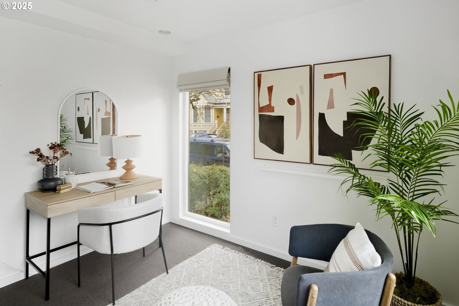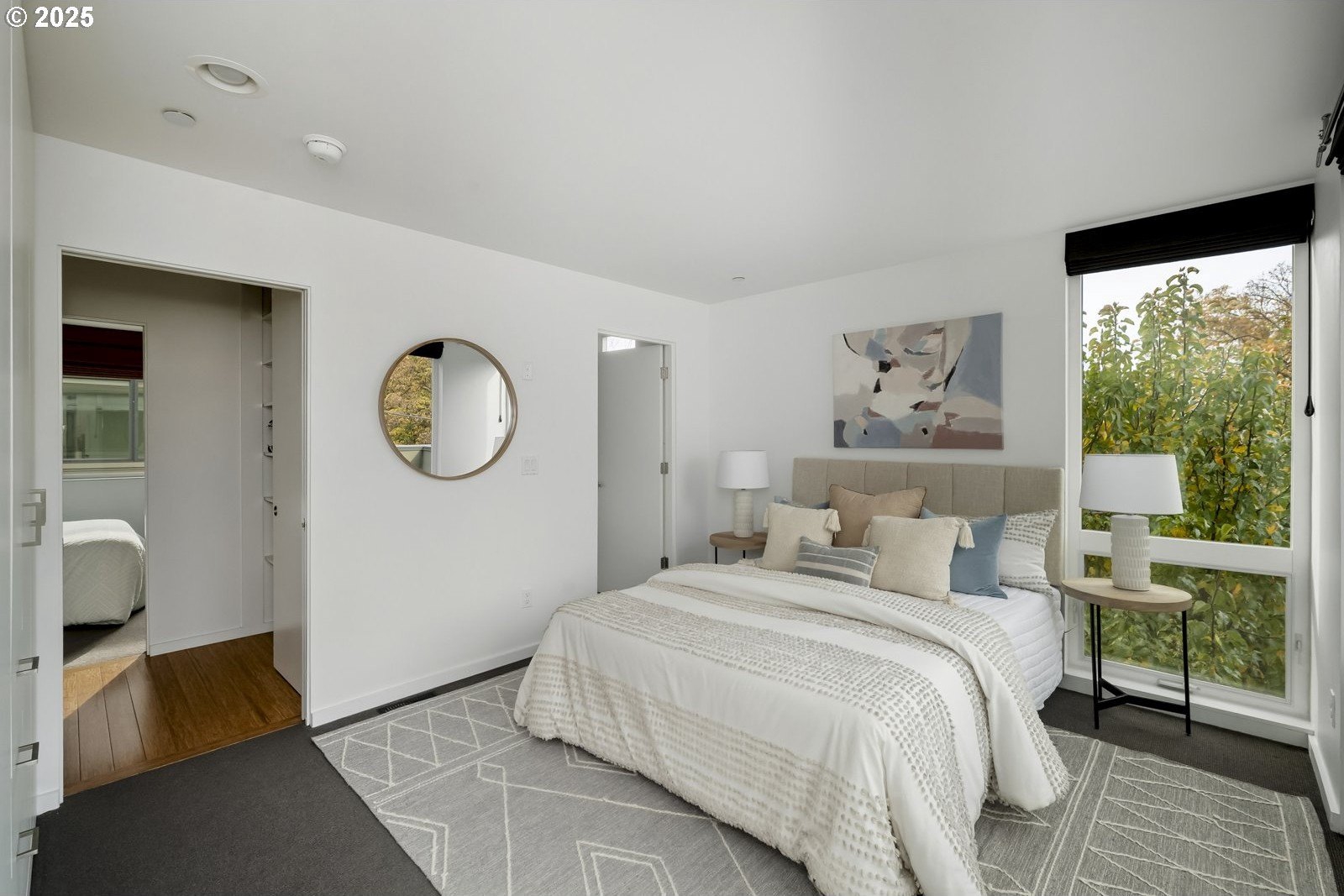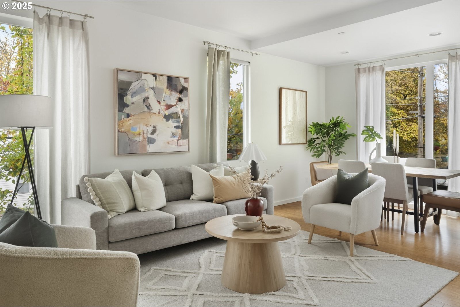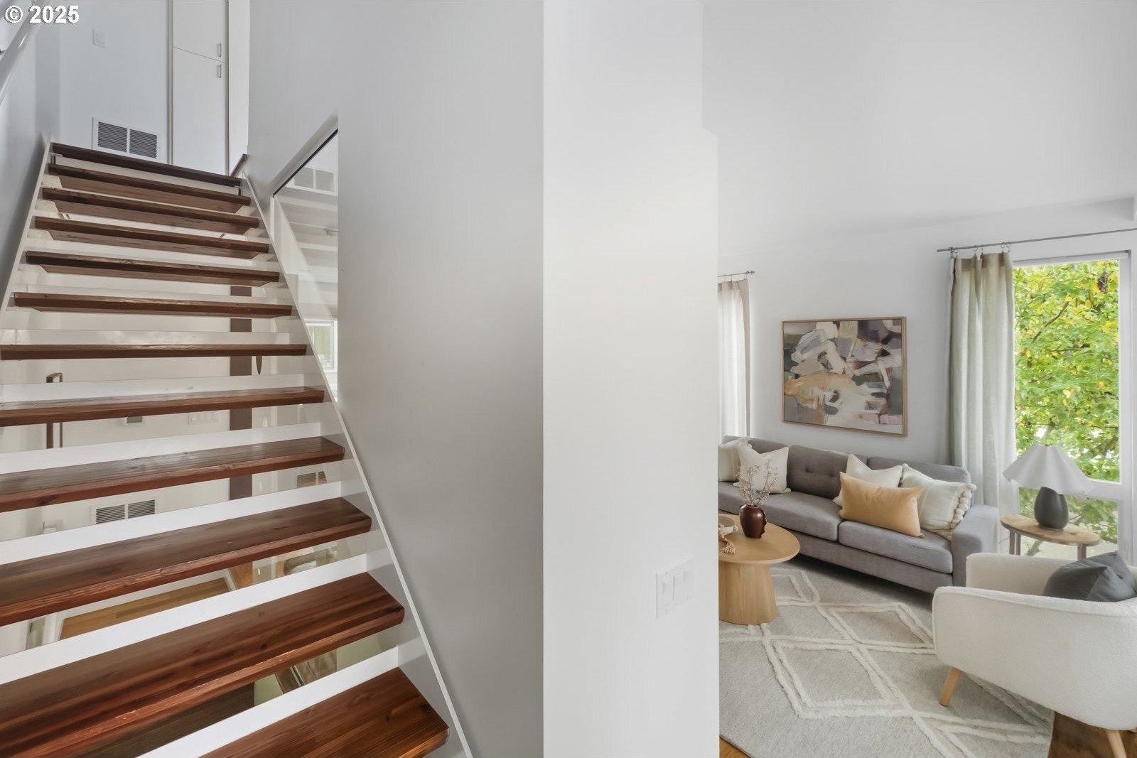 Located in the heart of historic Irvington, this rare end-unit townhouse-style condo offers modern comfort within one of Portland's most beloved neighborhoods. It truly lives like a detached home with its own front door, attached garage, and thoughtful upgrades throughout. The cook's kitchen is a true centerpiece-Neil Kelly cabinetry, deep drawers, quartz counters, pantry, and a generous eating bar that flows into an open living and dining area. Floor-to-ceiling windows on three sides bathe the home in natural light, creating a warm, inviting feel in every season. A gas fireplace and balcony with gas/water hookups make indoor-outdoor living effortless. Upstairs, two luminous primary suites feature wool carpet, Neil Kelly closets, and spa-inspired baths-one with an oversized soaking tub, the other with double shower heads. The larger suite offers a private balcony that catches the morning light and feels made for coffee, calm and a little container garden magic. Flexible laundry options include hookups upstairs or in the oversized garage with abundant storage. A Home Energy Score of 10 reflects the home's efficiency and low-impact design. And then-there's the rooftop. Nearly 500 sq ft of open sky, framed by views of the city, the West Hills, and winter views of Mt. Hood. An established garden with mature plantings and a drip system creates a sanctuary that feels both elevated and grounded, like a modern treehouse above the neighborhood. Sunsets here are unforgettable-golden light settling over the rooftops, the soft shimmer of "komorebi" as sunlight filters through nearby cherry trees. It's a place for long summer dinners, peaceful mornings, and quiet, starlit evenings. Set within a warm, connected community and surrounded by parks, grocery stores, cafes, restaurants, and transit-plus Grant School District-this home offers a rare blend of privacy, light, beauty, and effortless city living. [Home Energy Score = 9. HES Report