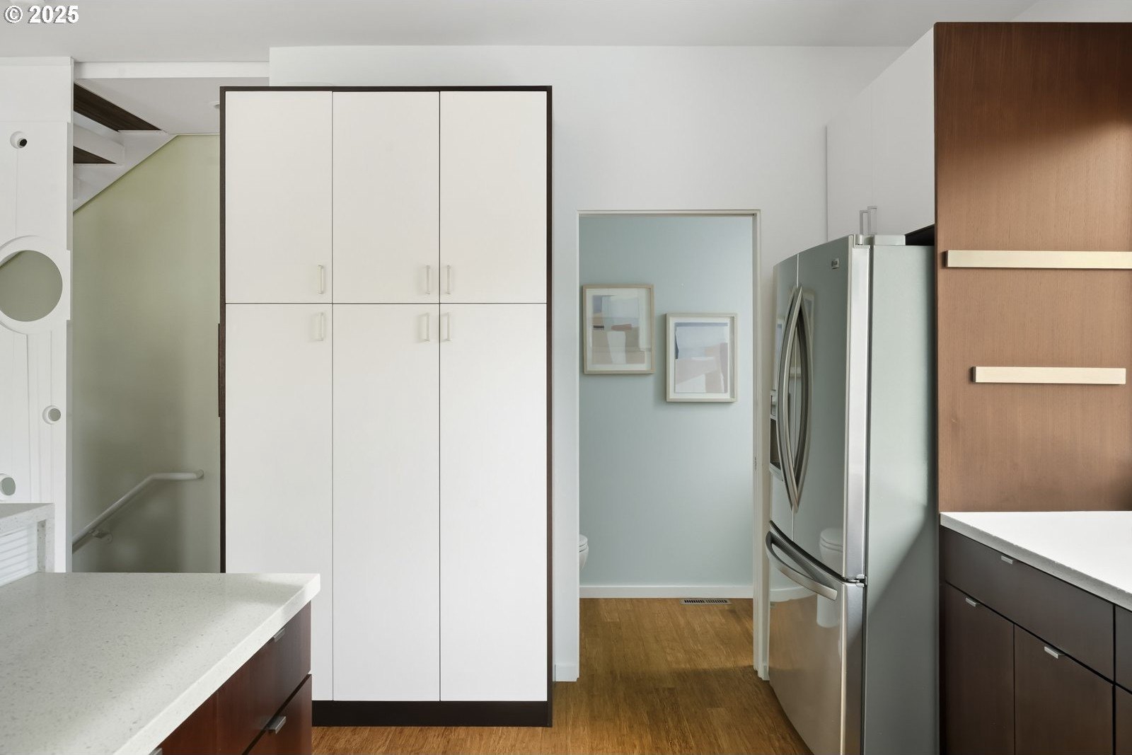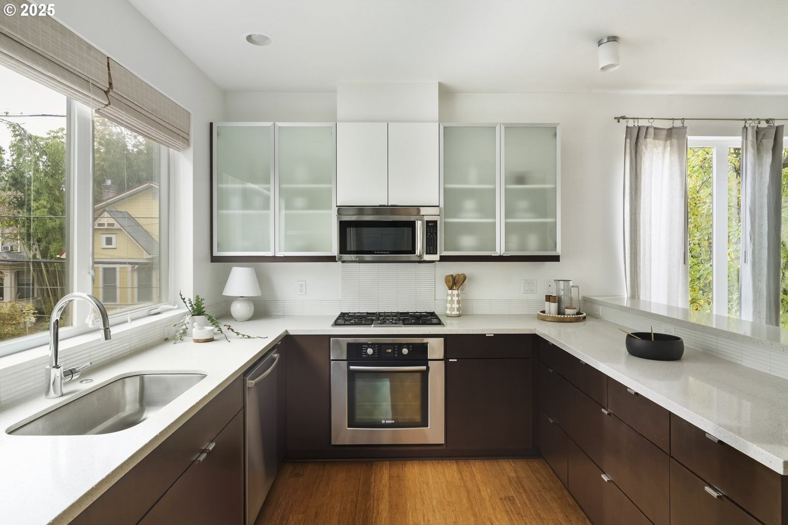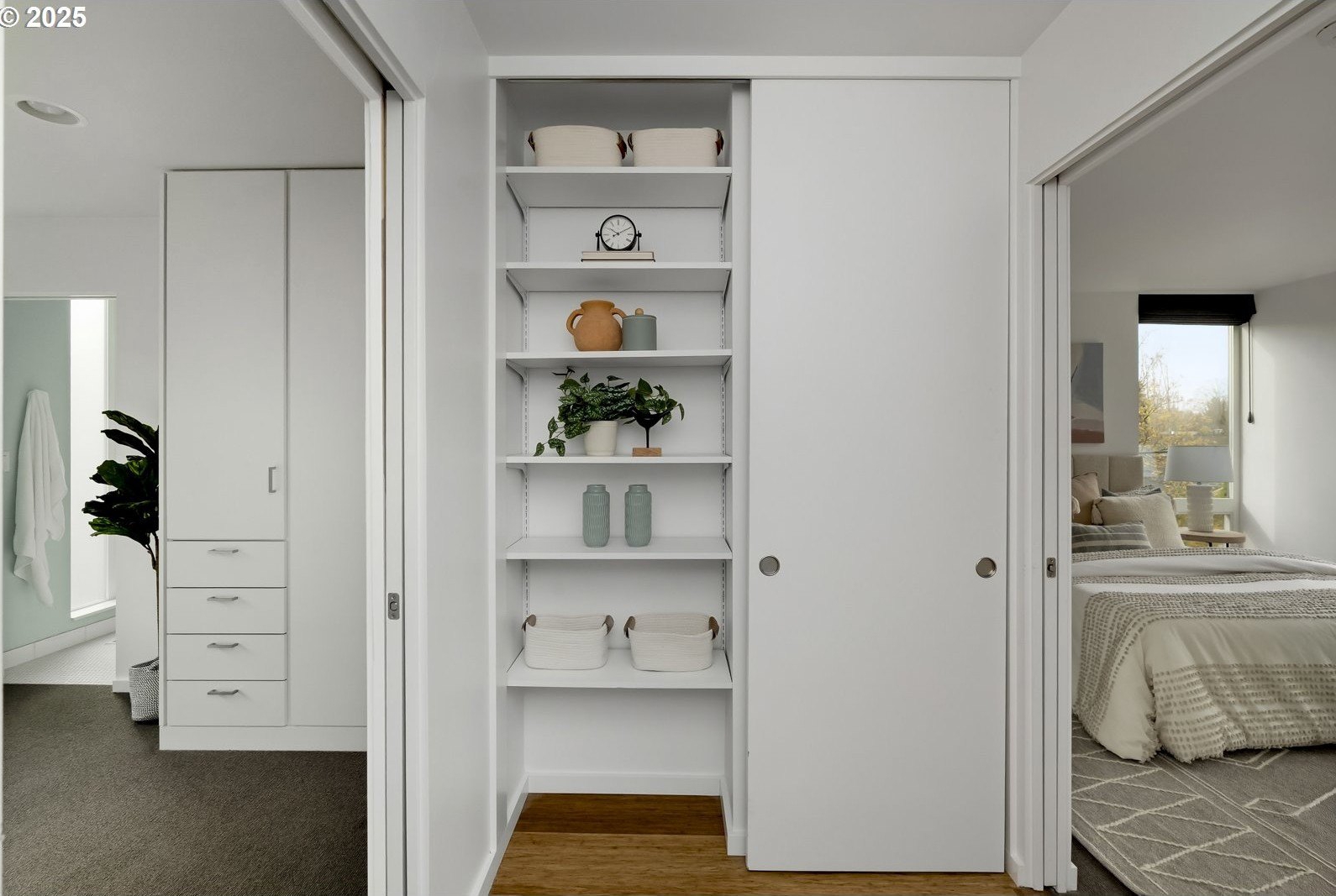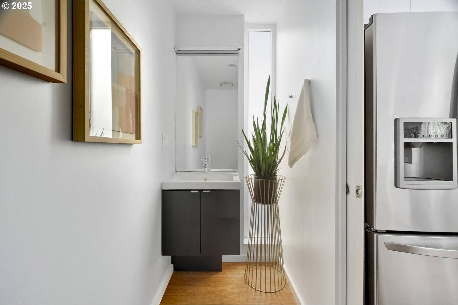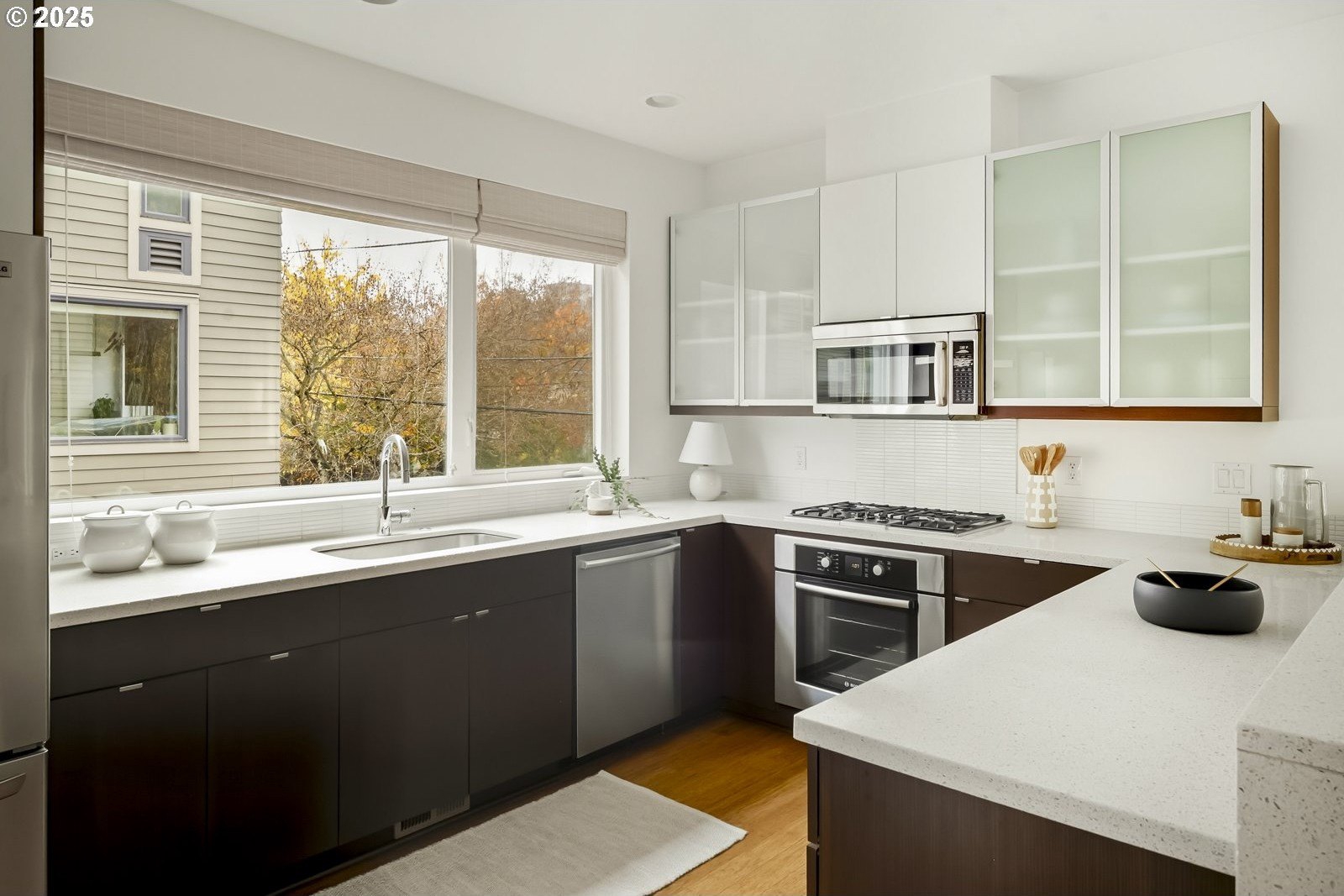 Located in the heart of historic Irvington, this rare end-unit townhouse-style condo offers modern comfort within one of Portland's most beloved neighborhoods. It truly lives like a detached home with its own front door, attached garage, and thoughtful upgrades throughout. The cook's kitchen is a true centerpiece-Neil Kelly cabinetry, deep drawers, quartz counters, pantry, and a generous eating bar that flows into an open living and dining area. Floor-to-ceiling windows on three sides bathe the home in natural light, creating a warm, inviting feel in every season. A gas fireplace and balcony with gas/water hookups make indoor-outdoor living effortless. Upstairs, two luminous primary suites feature wool carpet, Neil Kelly closets, and spa-inspired baths-one with an oversized soaking tub, the other with double shower heads. The larger suite offers a private balcony that catches the morning light and feels made for coffee, calm and a little container garden magic. Flexible laundry options include hookups upstairs or in the oversized garage with abundant storage. A Home Energy Score of 10 reflects the home's efficiency and low-impact design. And then-there's the rooftop. Nearly 500 sq ft of open sky, framed by views of the city, the West Hills, and winter views of Mt. Hood. An established garden with mature plantings and a drip system creates a sanctuary that feels both elevated and grounded, like a modern treehouse above the neighborhood. Sunsets here are unforgettable-golden light settling over the rooftops, the soft shimmer of "komorebi" as sunlight filters through nearby cherry trees. It's a place for long summer dinners, peaceful mornings, and quiet, starlit evenings. Set within a warm, connected community and surrounded by parks, grocery stores, cafes, restaurants, and transit-plus Grant School District-this home offers a rare blend of privacy, light, beauty, and effortless city living. [Home Energy Score = 9. HES Report