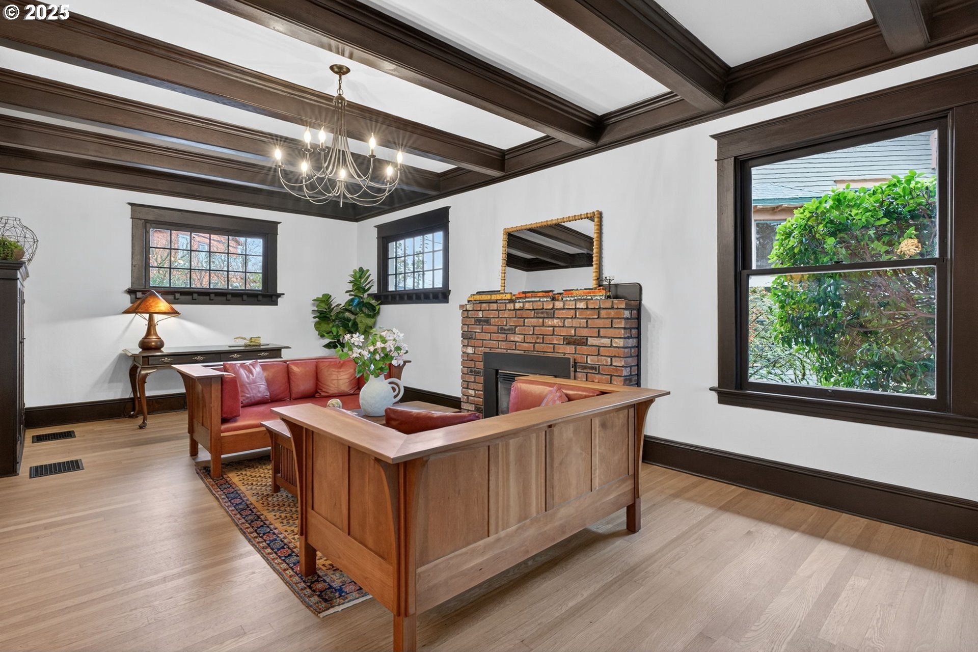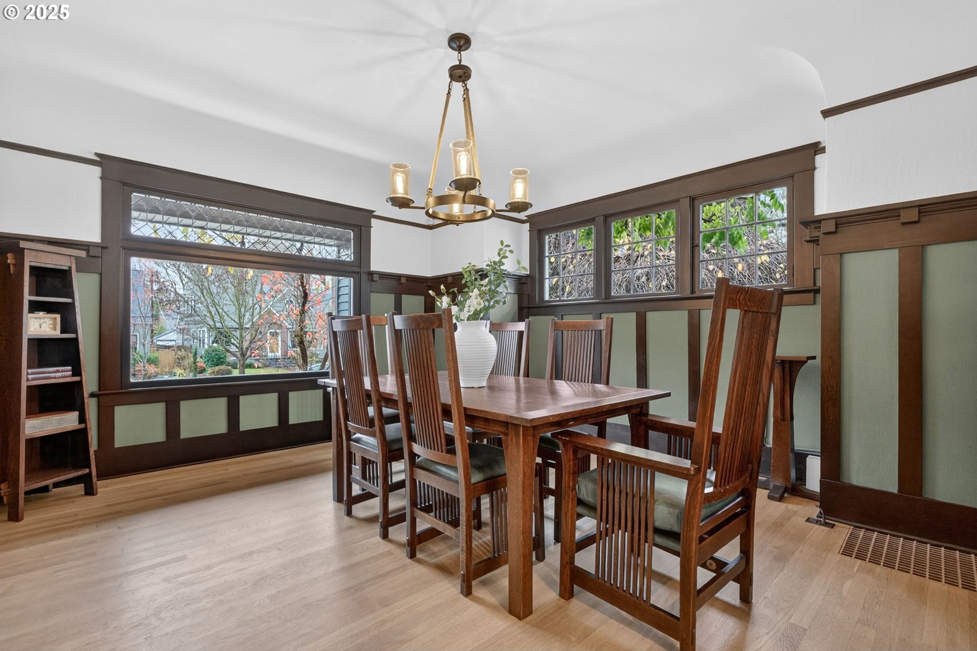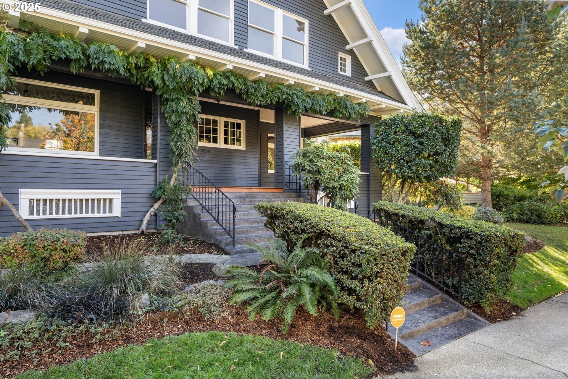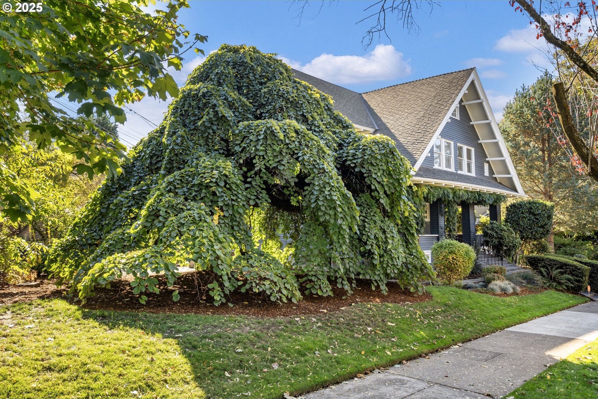OPEN HOUSE SATURDAY 11-1 & SUNDAY 2-4! Located in historic Ladd's Addition, this distinguished 1908 residence embodies the timeless character of a Craftsman-influenced Portland Foursquare. Its front-gable roofline, wide overhanging eaves, and broad covered porch reflect early-Portland craftsmanship, complemented by original millwork and multi-pane windows highlighting its graceful facade. Set on a distinctive unique lot with rare, wide frontage for the neighborhood, the property offers a sense of privacy, lush mature landscaping, and the beauty of a designated Portland Heritage Tree #287. A spacious, detached three-car garage offers room for vehicles, storage, and versatile use. Inside, beautifully maintained period features include rich woodwork, leaded glass, original hardwood floors, beamed ceilings, and classic built-ins. Bright, spacious rooms flow effortlessly from the welcoming entry through the living and dining areas, with large picture windows framing tree-lined street views. The upper level features four comfortably sized bedrooms, a full bath, and a sunroom ideal for reading, office use, or creative pursuits. The expansive finished lower level adds even more versatility with generous bonus/living space, a full bathroom, and direct exterior access. With its quiet, friendly, village-like atmosphere and proximity to neighborhood markets, local eateries and more, Ladd's Addition offers an unmatched blend of history, charm, and convenience. A truly inviting place to live. [Home Energy Score = 1. HES Report