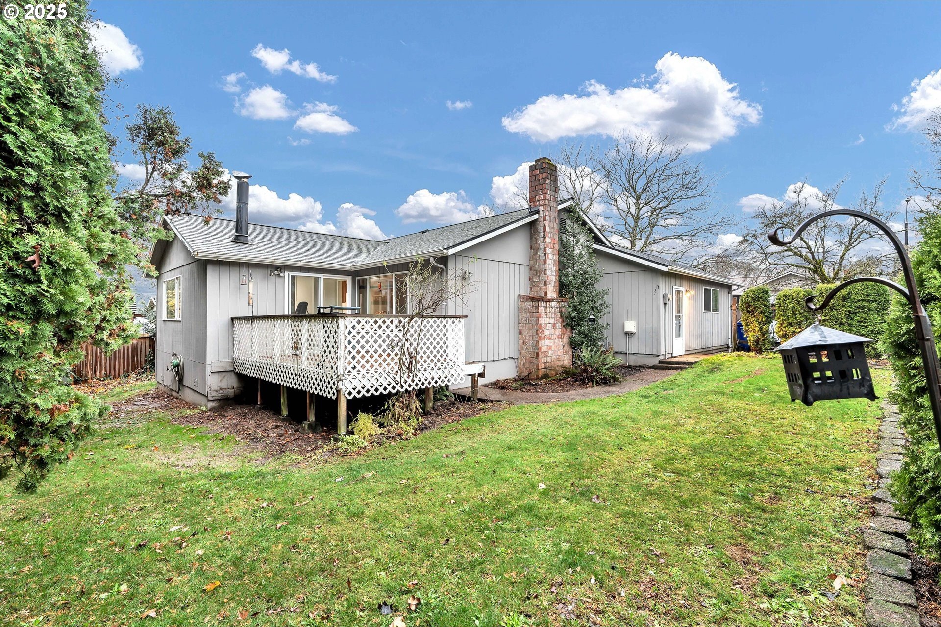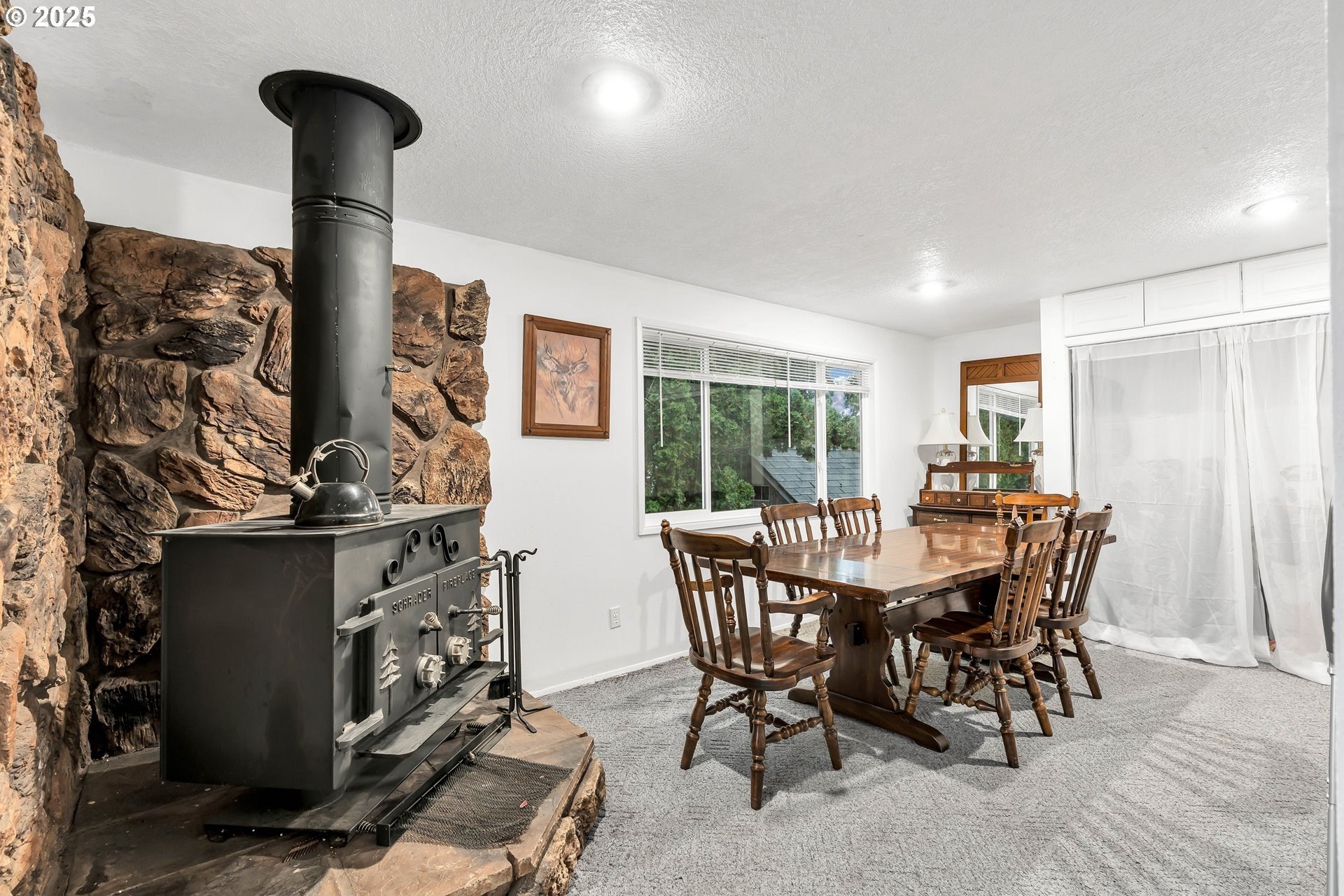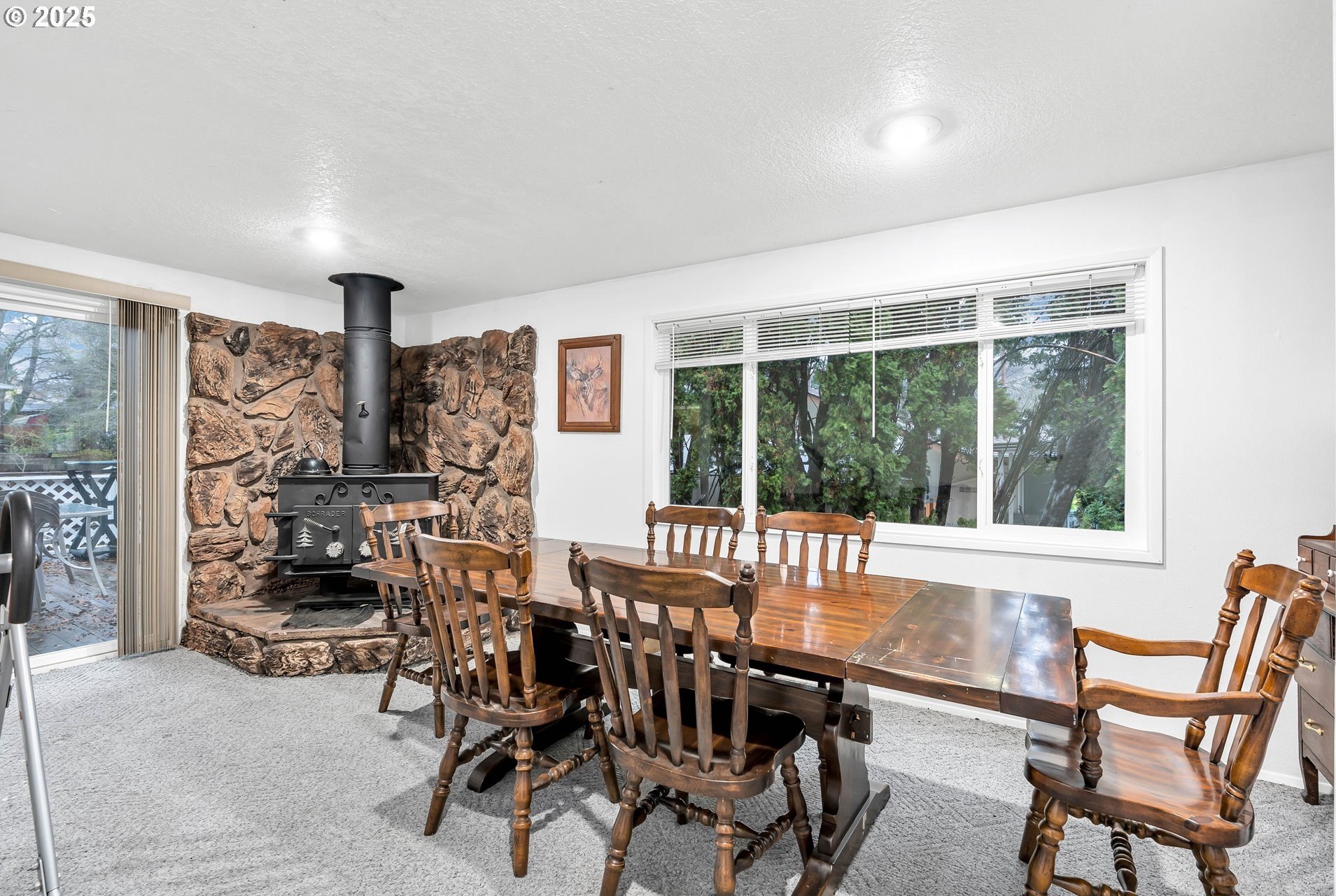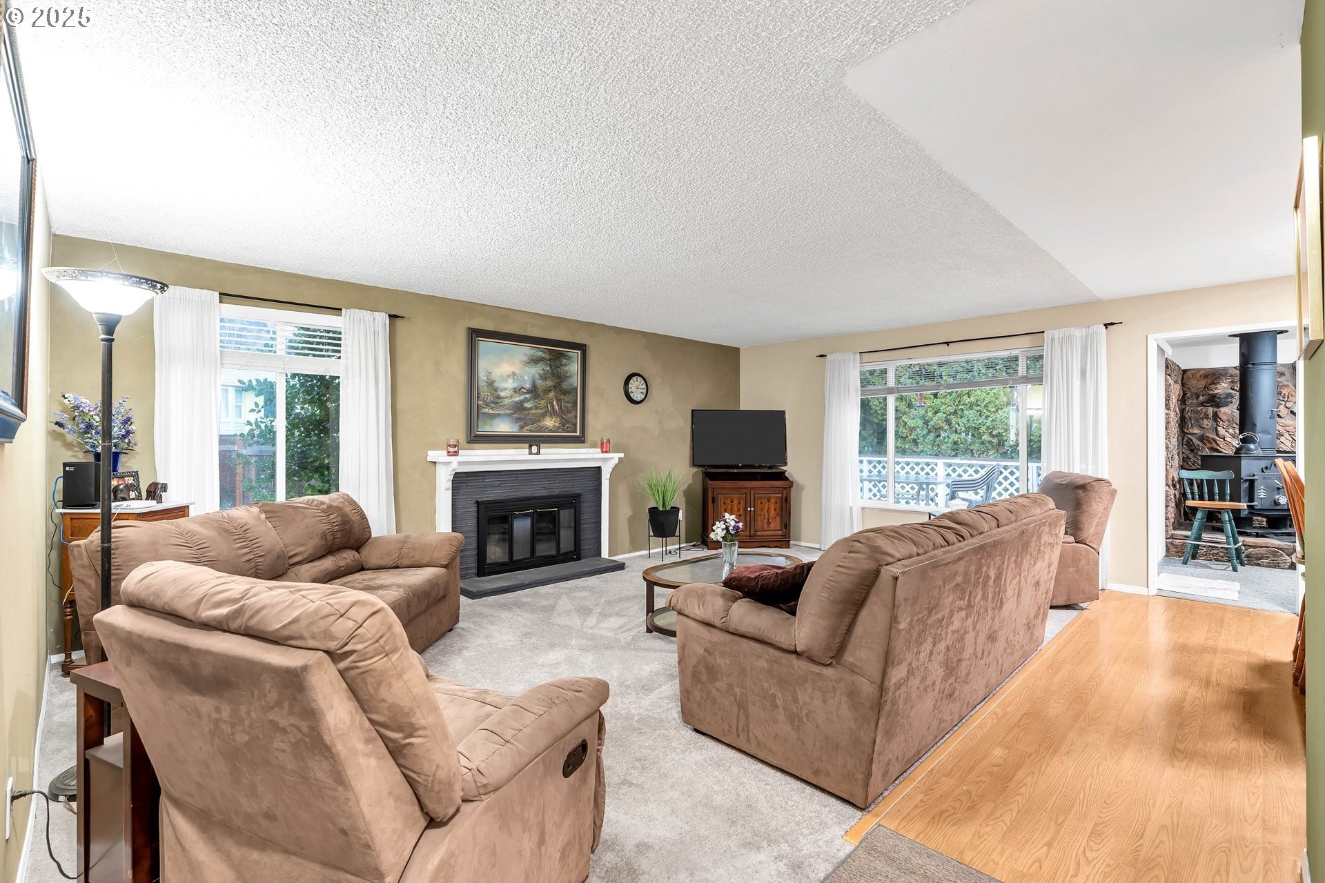 Charming single-level home with 3 spacious bedrooms and multiple living areas. The living room features wall-to-wall carpet, a fireplace, and oversized windows that fill the space with natural light. The L-shaped kitchen and dining area boast laminate flooring and an open-concept layout, perfect for cooking and entertaining. A cozy family room with wall-to-wall carpet, wood-burning stove, oversized window, and sliding doors opens to a back deck. All bedrooms are generously sized, with the primary suite offering a ceiling fan, oversized window, and ensuite bath with walk-in shower. Additional features include washer and dryer hookups in the garage and a large fenced backyard-ideal for relaxing or entertaining.
