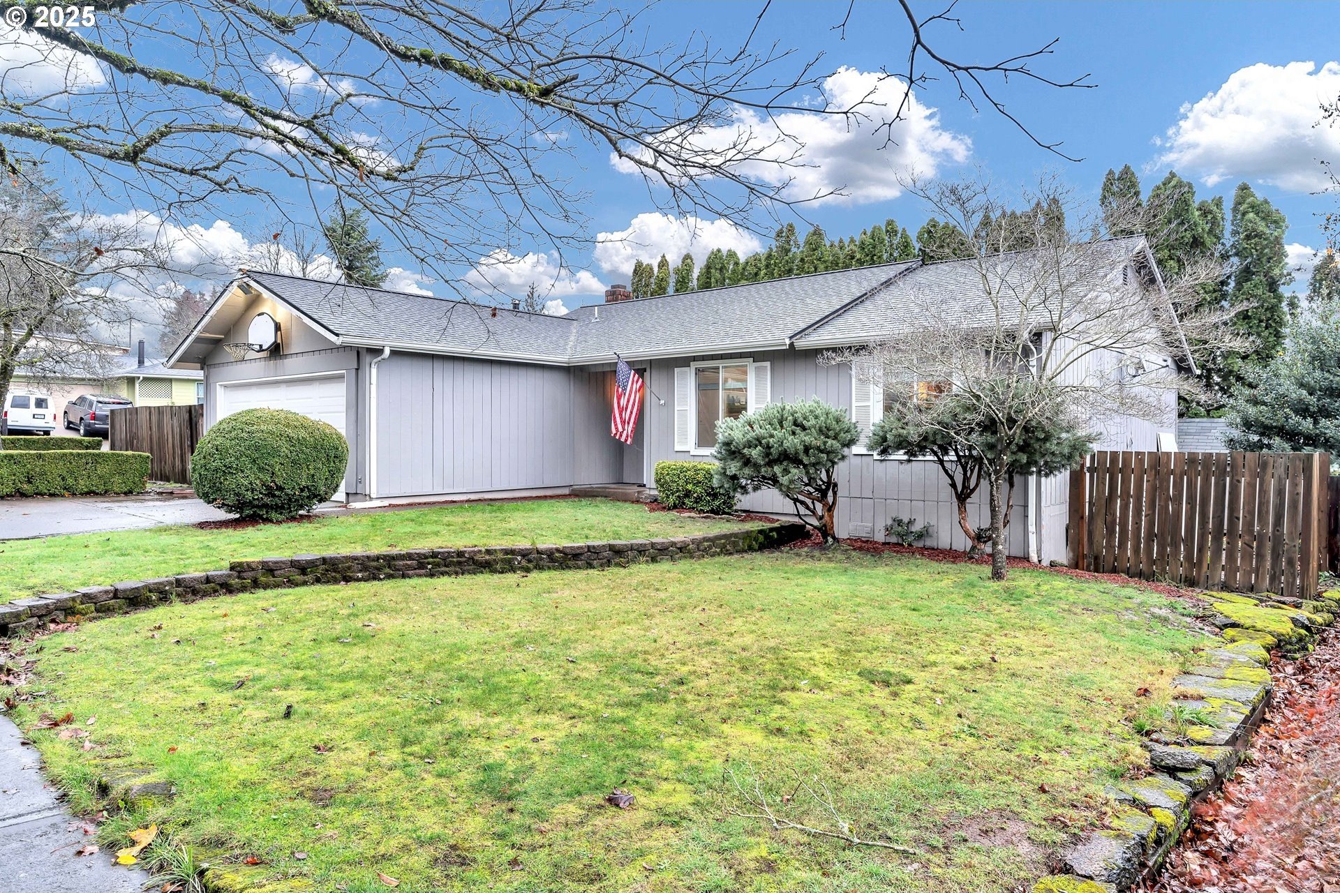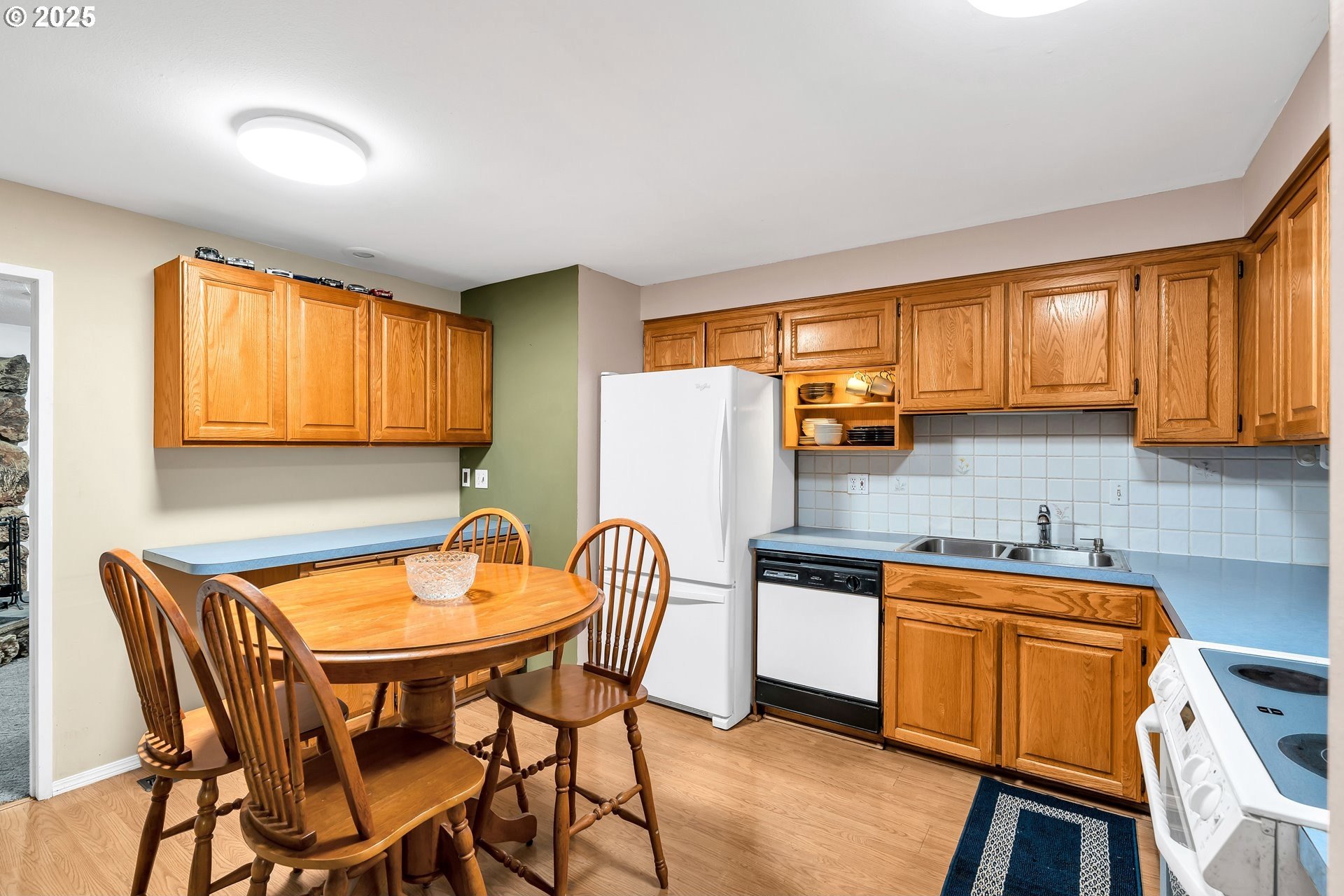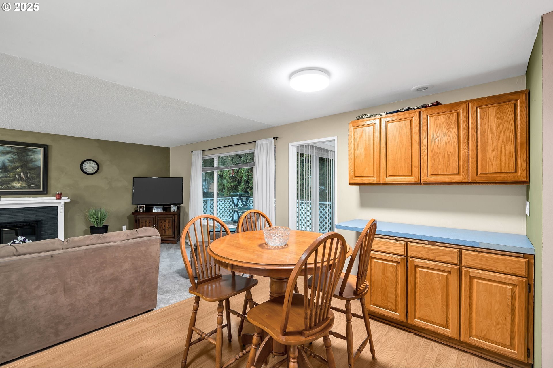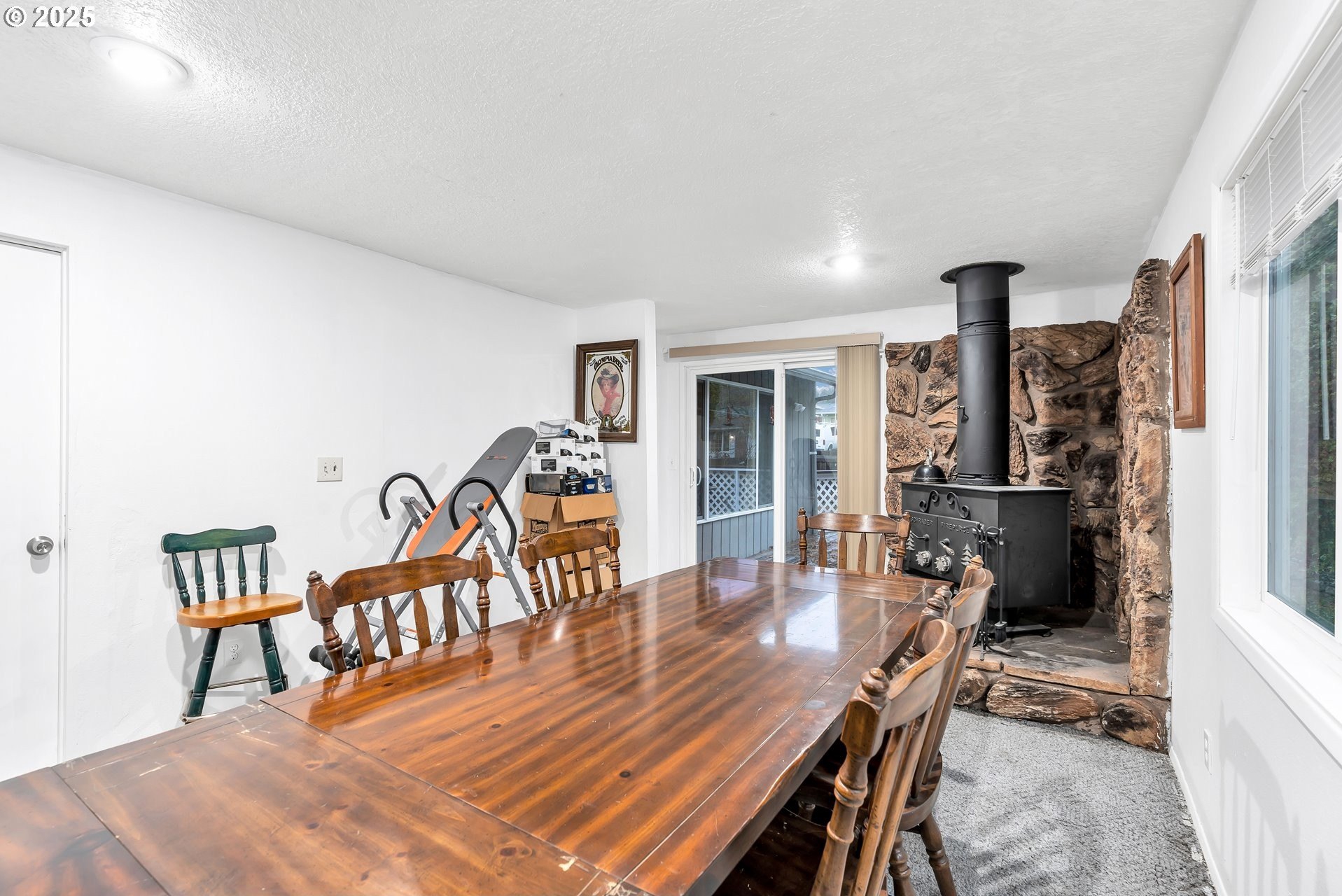 Charming single-level home with 3 spacious bedrooms and multiple living areas. The living room features wall-to-wall carpet, a fireplace, and oversized windows that fill the space with natural light. The L-shaped kitchen and dining area boast laminate flooring and an open-concept layout, perfect for cooking and entertaining. A cozy family room with wall-to-wall carpet, wood-burning stove, oversized window, and sliding doors opens to a back deck. All bedrooms are generously sized, with the primary suite offering a ceiling fan, oversized window, and ensuite bath with walk-in shower. Additional features include washer and dryer hookups in the garage and a large fenced backyard-ideal for relaxing or entertaining.