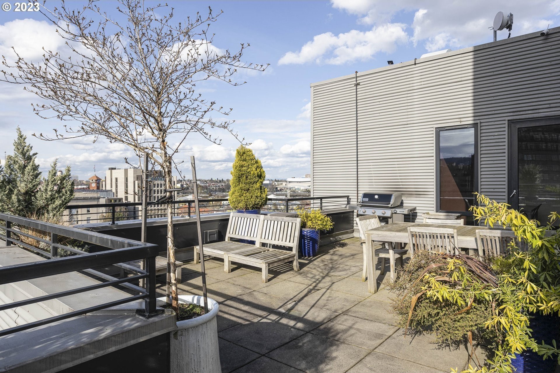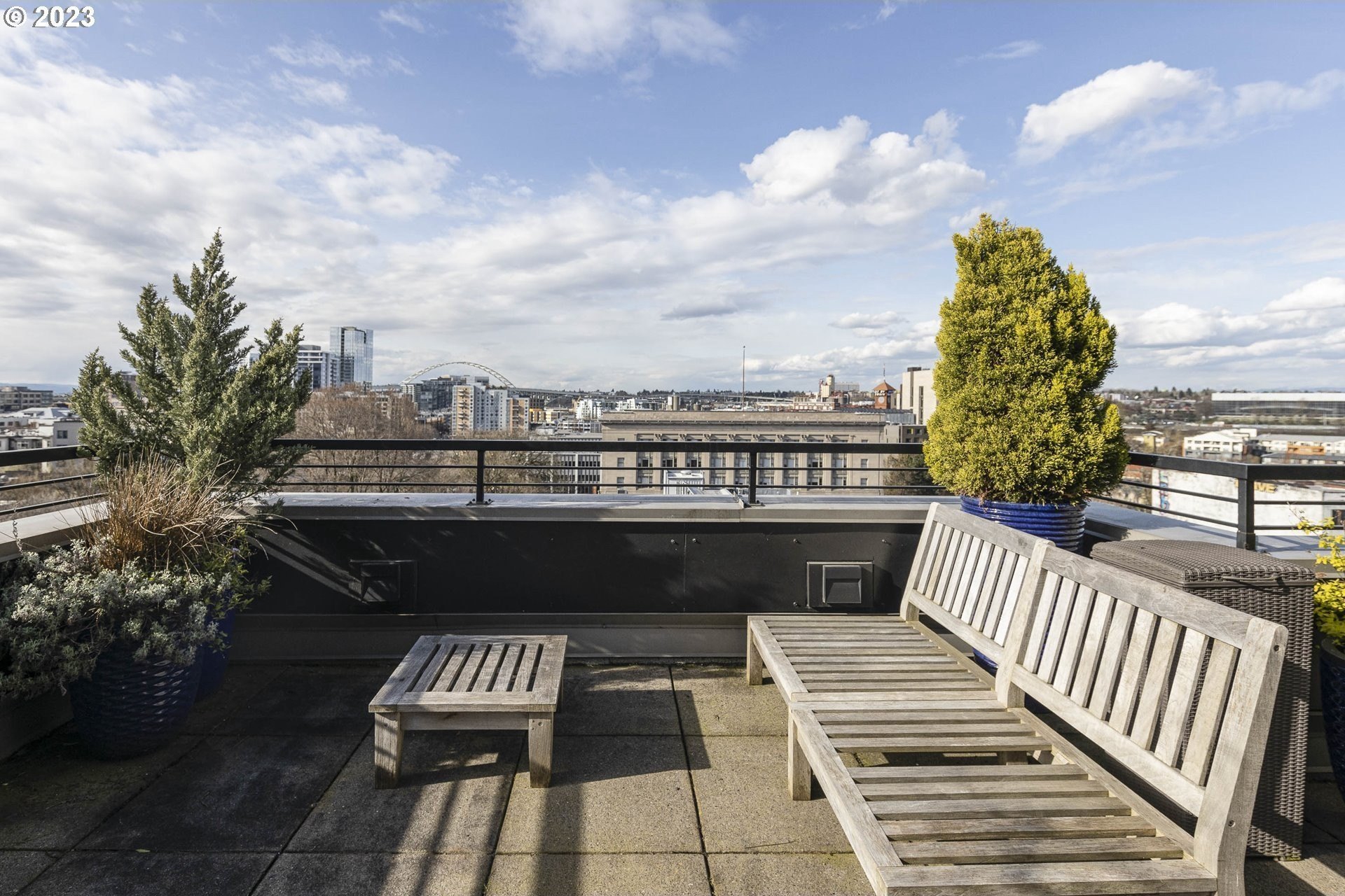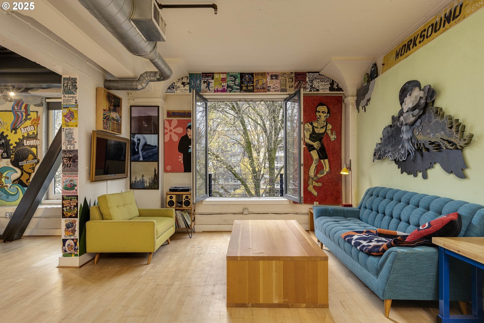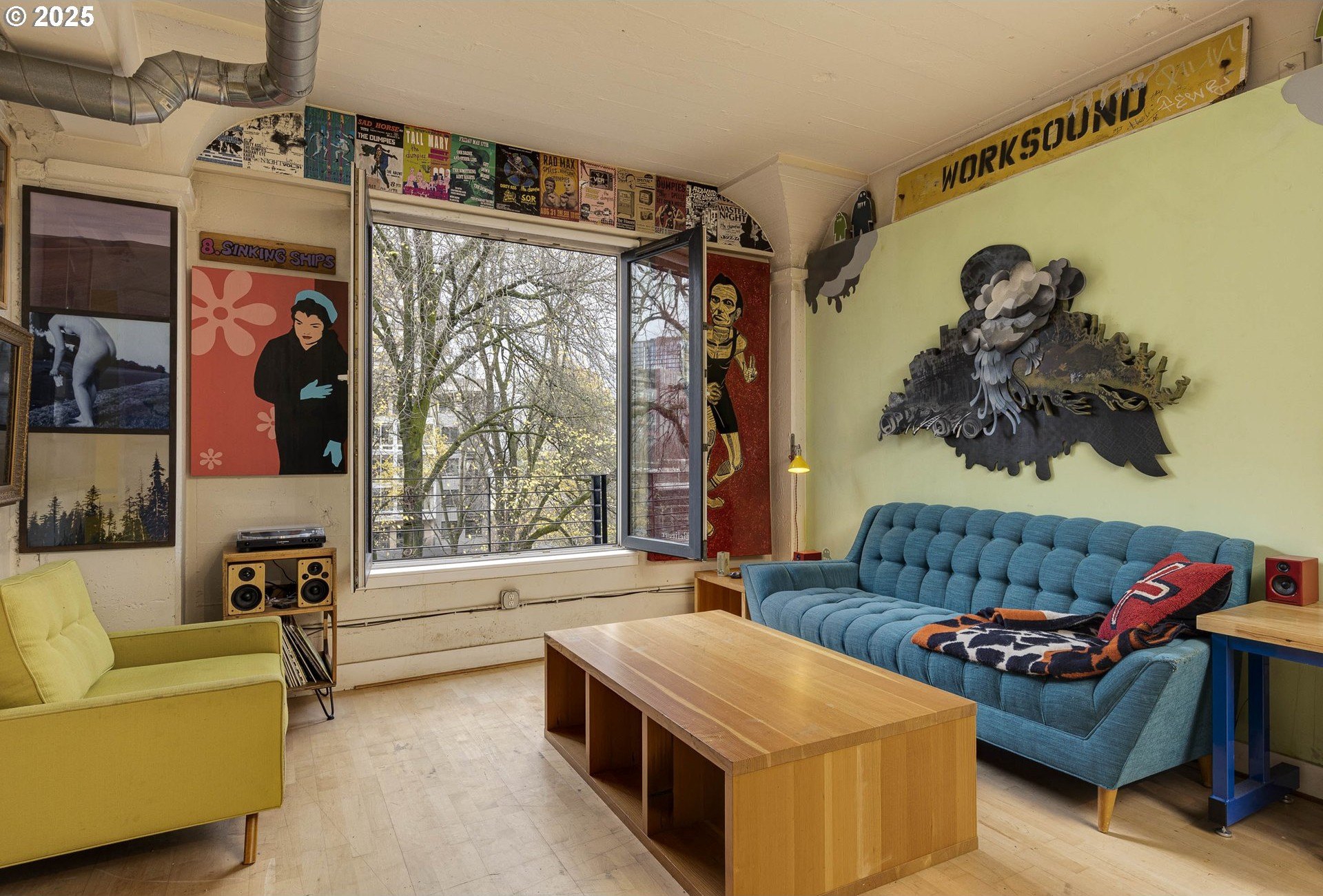 Step into a true artist's loft where raw architectural character meets modern comfort. This striking 4th-floor space channels unmistakable Andy Warhol "Factory" vibes, bringing that iconic NYC loft energy right into the heart of Stumptown. Concrete, steel, soaring ceilings, and an infusion of urban texture create a home that's equal parts creative and contemporary. Set within a historic 1909 warehouse converted into lofts, the unit faces the venerable North Park Blocks, offering a peaceful green canopy just outside your massive European windows. Open them wide and enjoy your own urban treehouse moment. Inside, you'll find all the essentials: A/C, in-unit washer/dryer, granite surfaces, custom tile, stainless appliances, and deeded secure garage parking. The building also features an outstanding rooftop common area and party room with breathtaking city views. With a 99 Walk Score and 99 Bike Score, plus a strong, well-funded HOA with no special assessments, this loft delivers effortless urban living in one of Portland's most vibrant locations.
