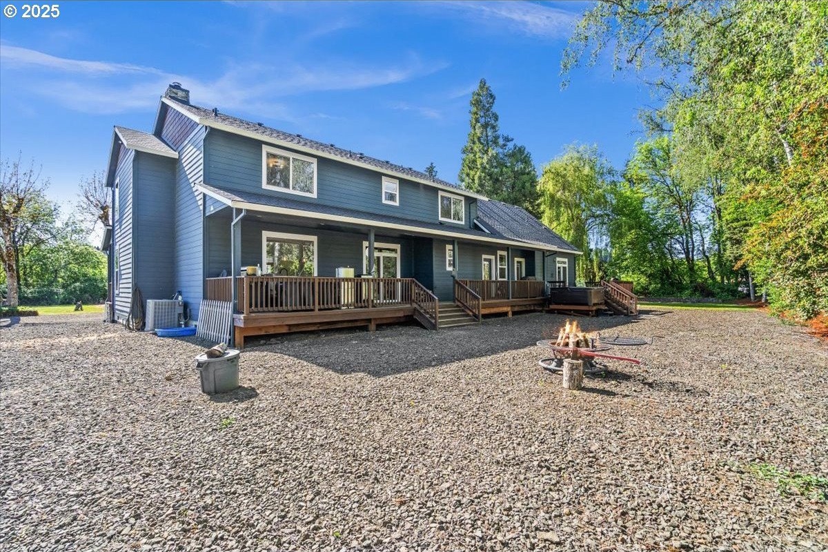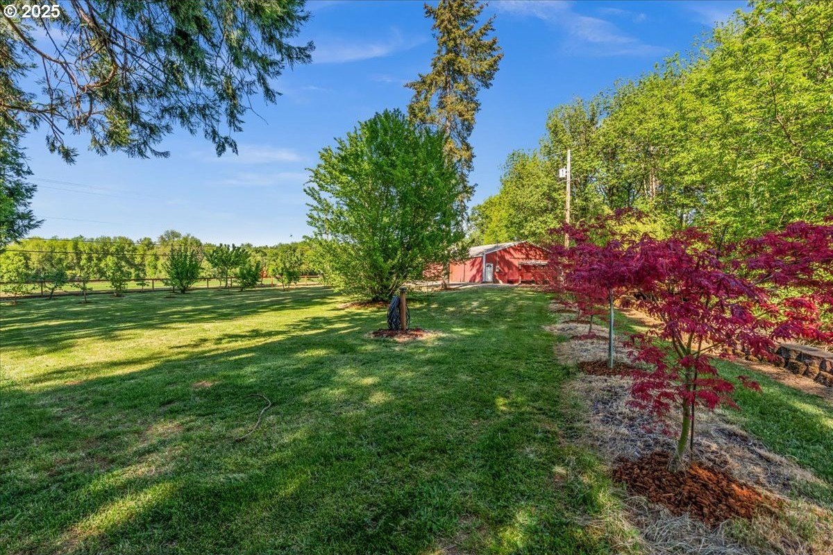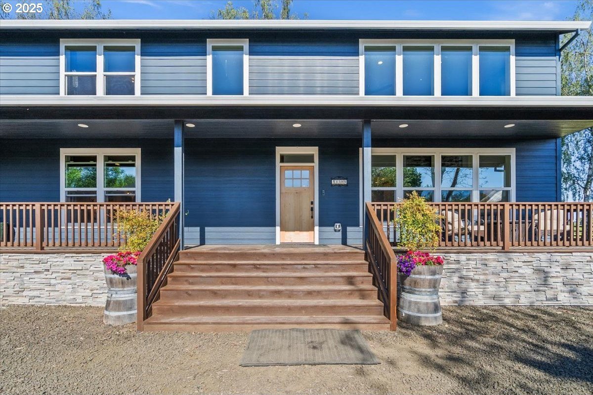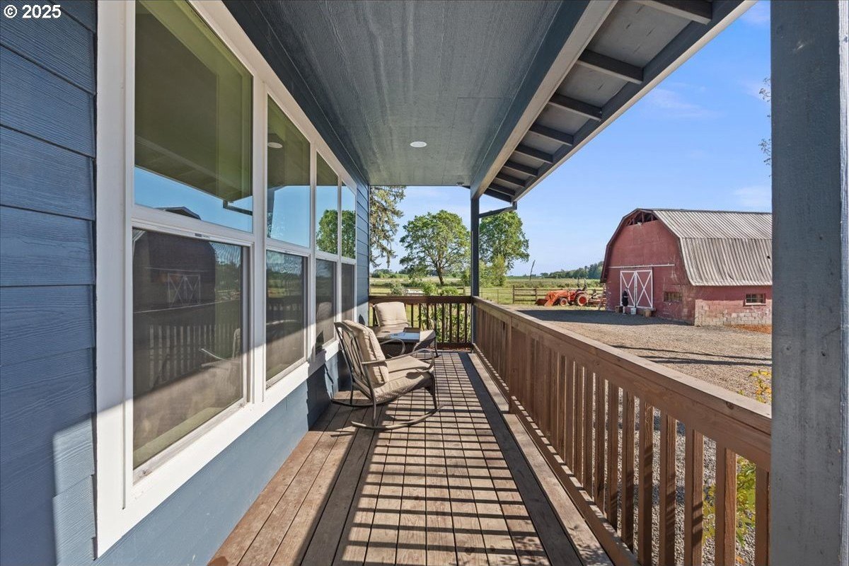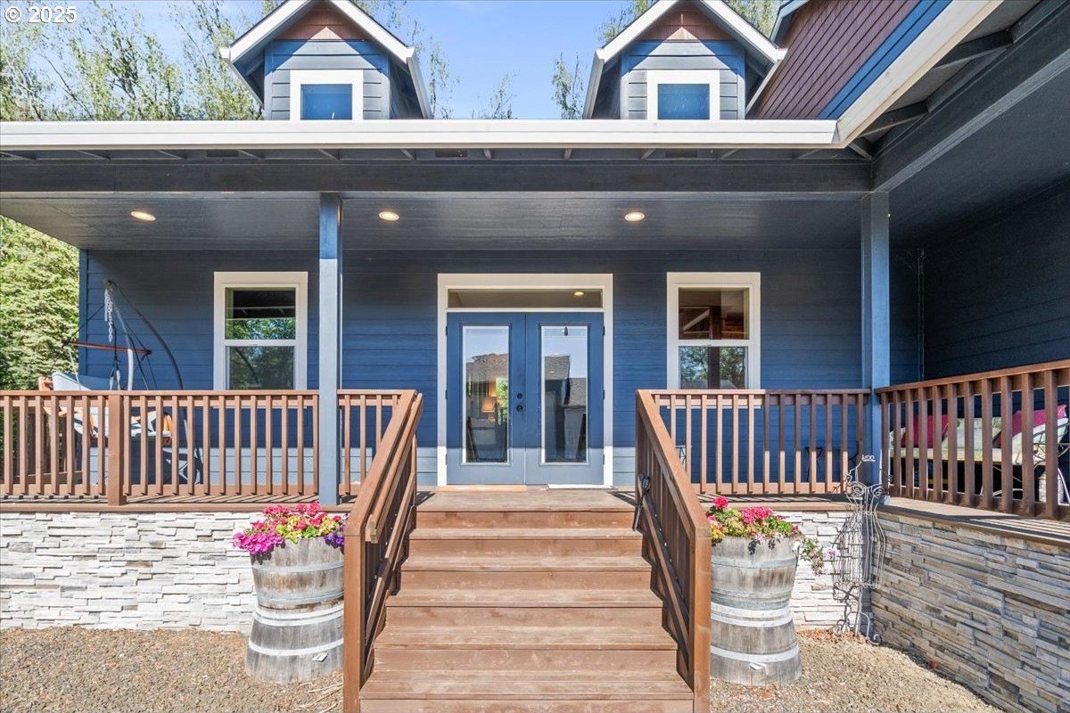 Gorgeous custom craftsman home with in-law quarters on a beautiful private level 7.77 acres of land. You will be overjoyed when you drive up to this property, with the flourishing fruit orchard, bridge overlooking the year-round creek,36x72 4 bay shop, barn & pretty blooms. 360 views of trees, farmland & rolling hills surrounding this property. The welcoming covered front porch offers a warm place to drink your coffee & watch the kids & animals run & play. Step into the 26 ft entry way with open stairwell, an abundance of sun filled windows & a dramatic floor to ceiling stone wall with custom reclaimed wood mantel & cozy wood stove to enjoy all year round. Tastefully designed chefs kitchen features quartz countertops, island with breakfast bar, stainless steel appliances, induction cook top, butlers pantry with wine cooler, & a lovely picture window above the kitchen sink letting the outside in. Slide open the barn door to the laundry/ mud room with utility sink, built in storage cabinets & door to the backyard. Main floor master suite boasts high ceilings, spacious walk in closet, double sink vanity, soaking tub & custom tile shower with bench seat. The beautiful iron rod stairwell leads you up to the second floor with 3 generous sized bedrooms all with closet organizers & a large bonus room with wet bar & walk in closet. The attached separate in law quarters has high ceilings & a beautiful open concept design with hickory cabinetry in the kitchen, quartz countertops, propane gas cooking & stainless steel appliances. High ceilings in living room with gas fireplace with stone surround & a glass door opening up to a private covered deck. Primary bedroom has a built-in closet & sliding glass door out to the deck. Second bedroom has a nice closet & a stackable washer & dryer. The scenery of the property is right out of a story book with the private meadow overlooking Dairy creek, plenty of pasture to enjoy farm animals, & wonderful shop to store your RV, boat & toys!