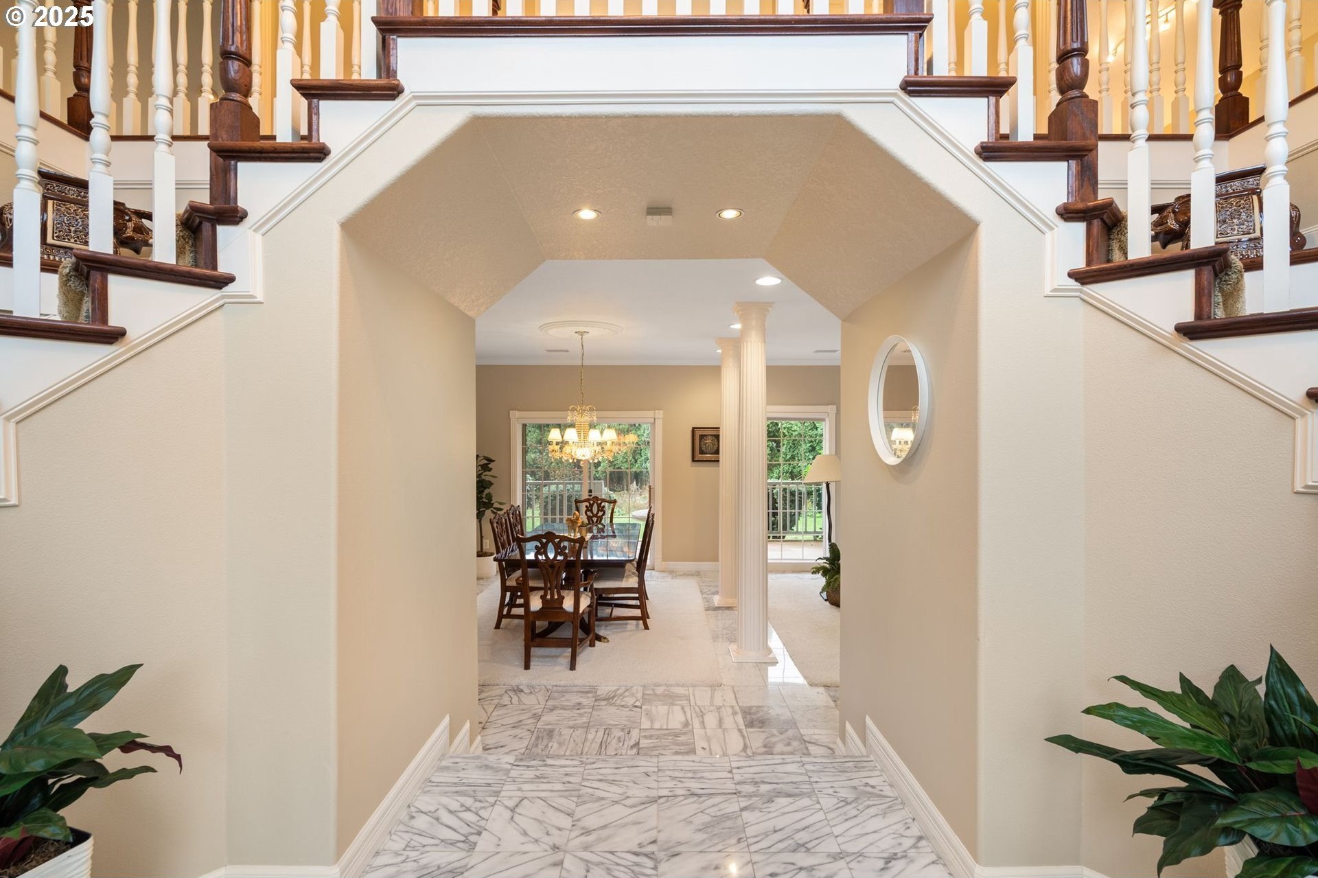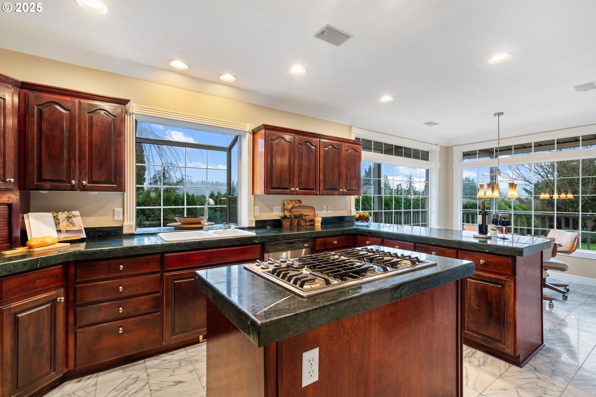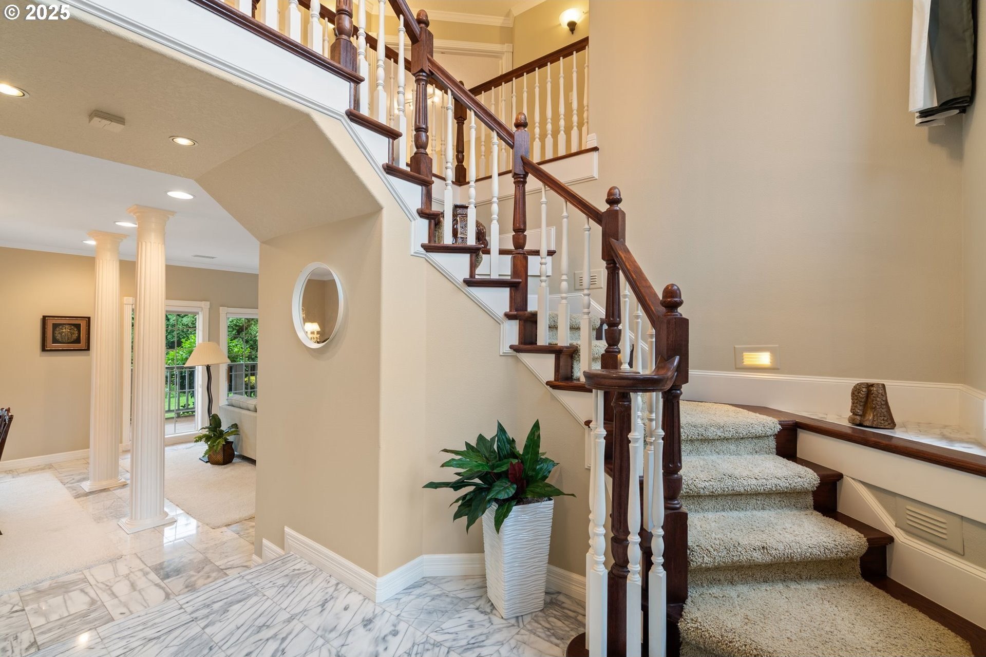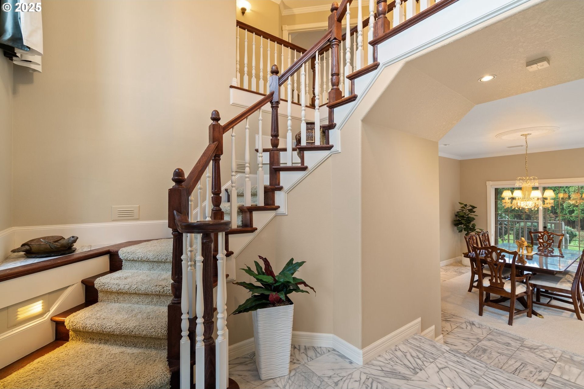 Step into timeless beauty in this spacious 3,561 sq ft home, perfectly situated on a level 0.37-acre lot with sweeping views of Lacamas Lake, the surrounding mountains, and lush evergreens. This residence offers both grandeur and comfort, starting with a dramatic double staircase in the entryway and a wraparound deck on two levels-ideal for morning coffee or evening stargazing.The gourmet kitchen is a chef's dream: granite countertops, cherry wood cabinetry, stainless steel appliances, and tons of cupboard space. Whether it's a weekday breakfast or a weekend gathering, this kitchen was designed for connection and convenience.The main level boasts a spacious "junior" primary suite with its own en-suite bath, perfect for guests or multigenerational living. Upstairs, the true primary suite is a serene retreat featuring a cozy fireplace, expansive en-suite bath, and access to the upper deck. A massive bonus room with a cathedral window offers the perfect place for movie nights, homework hangouts, or a future game room.You'll love the elegant mix of marble, hardwood, and designer finishes throughout. The bright and inviting sunroom is fully enclosed, offering year-round enjoyment regardless of the weather.Located in the coveted Lacamas Shores neighborhood, residents enjoy exclusive access to a private park, recreational amenities, boat launch, and the Heritage Trail. With its welcoming sense of community, peaceful surroundings, and access to some of the region's most respected schools, this home offers something truly special for every stage of life.Lovingly maintained but lightly lived in over the years, this home offers exciting opportunities to add your own updates-and it's priced accordingly. Come experience the charm, space, and potential that awaits.