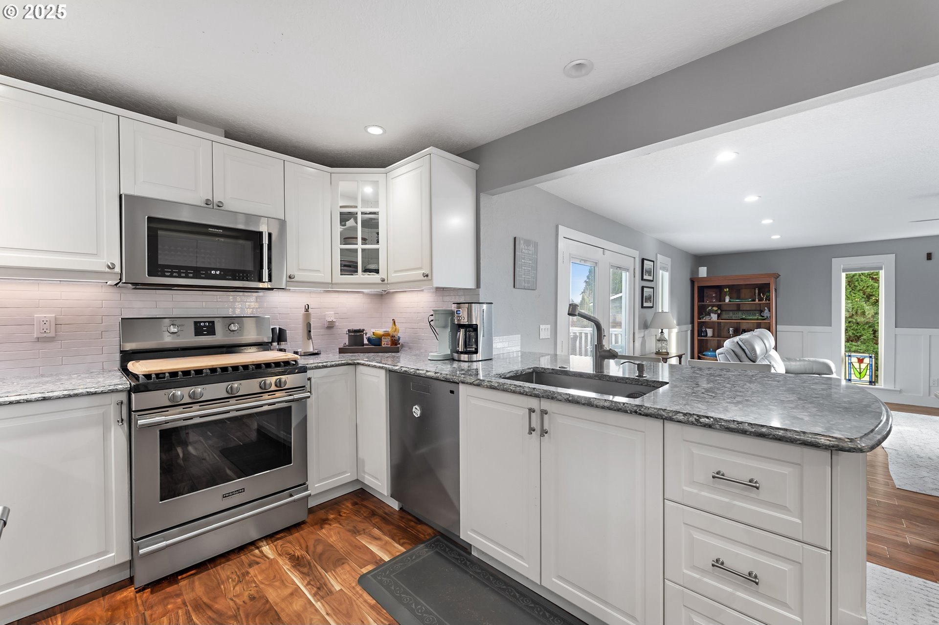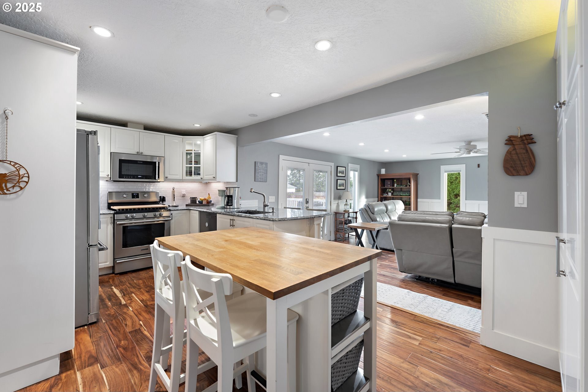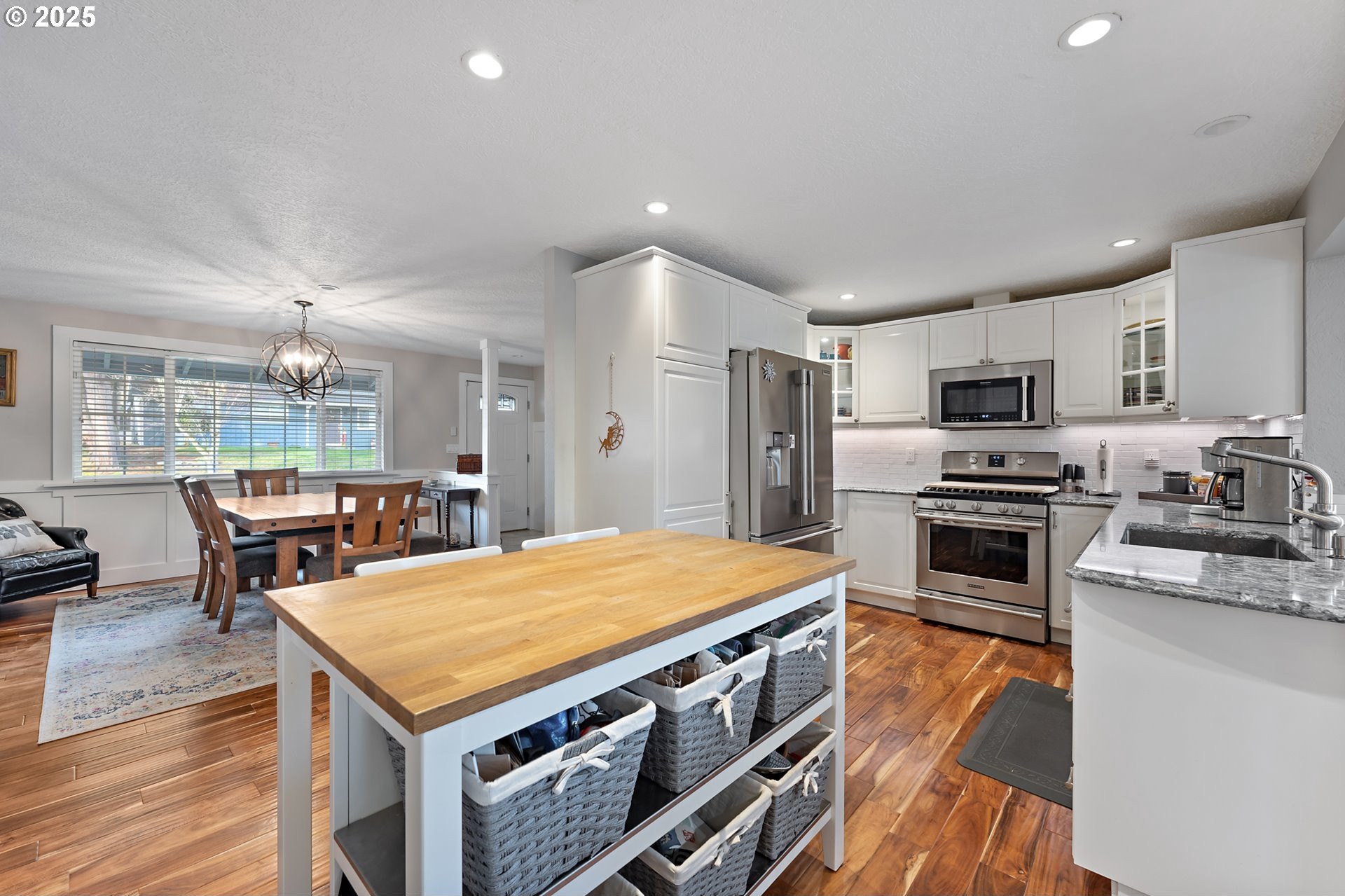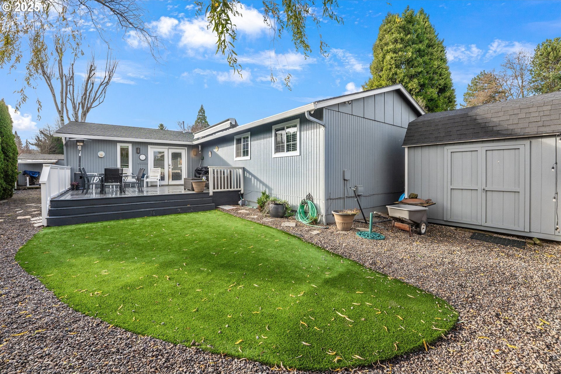 Beautiful one-level updated home on a corner lot in desirable Summerlake. $47K in 2 year old solar panels that covers almost all of your electric bill! Features a large, separate dining room and a newer kitchen with white cabinetry, soft-close drawers, side-by-side stainless steel refrigerator, quartz countertops, gas range, pantry, eat bar, and a removable island offering excellent storage and flexibility. Engineered flooring runs throughout the home. Massive family room open to the kitchen with French doors leading to a new deck. Private primary bedroom off the family room features its own ensuite walk-in closet, walk-in shower and quartz countertops. On the opposite side of the home are three additional bedrooms and one updated bathroom. One bedroom features a Murphy bed, built-in shelving, and a closet organizer. Another bedroom, currently used as an office, includes a nook that was previously a closet and can be easily converted back. Private fenced back yard with beautiful trex deck and 2 sheds. 2 car garage (1 car is used as a hair salon - easily convert back to garage) with tons of shelving. Rv parking!