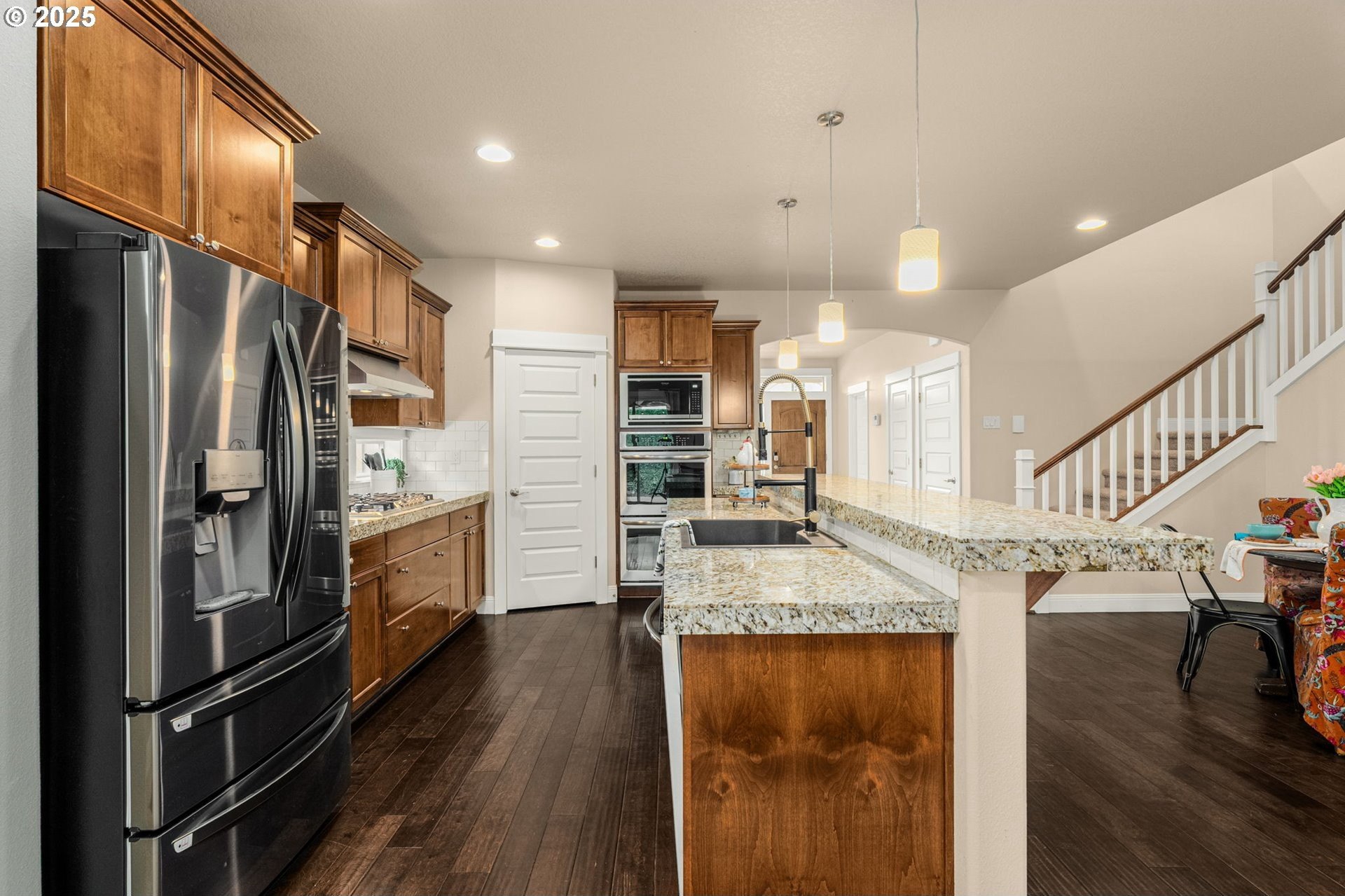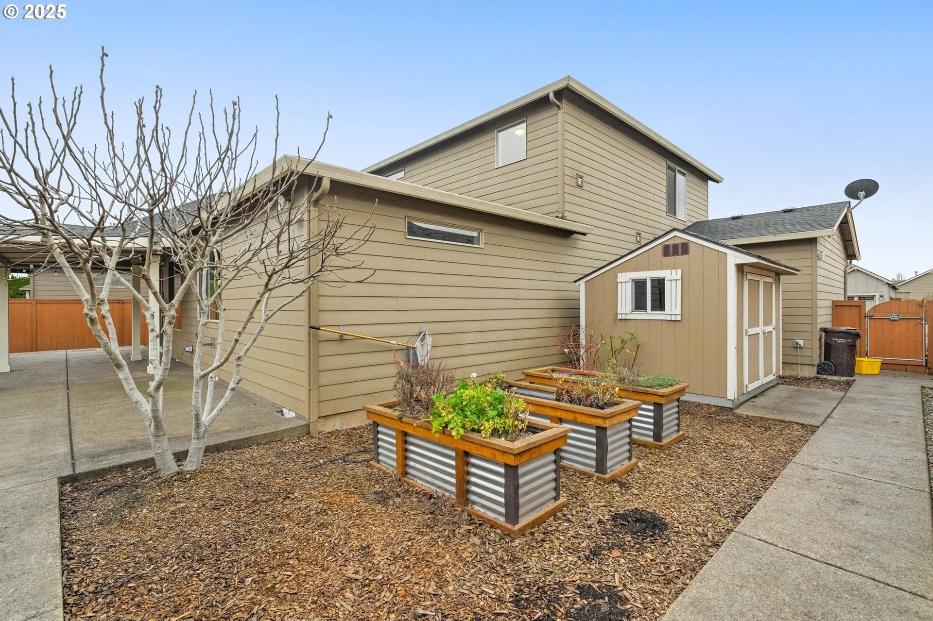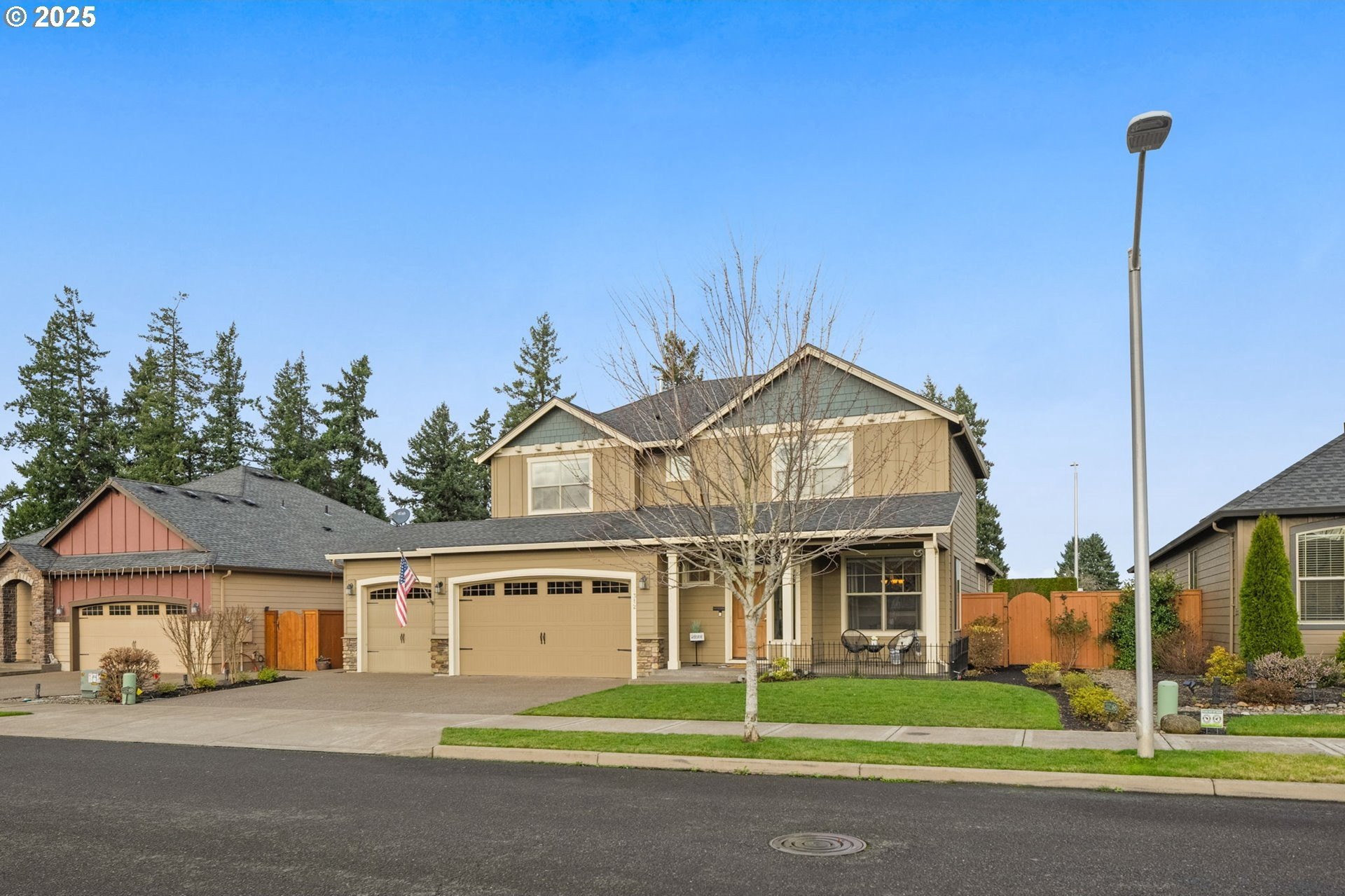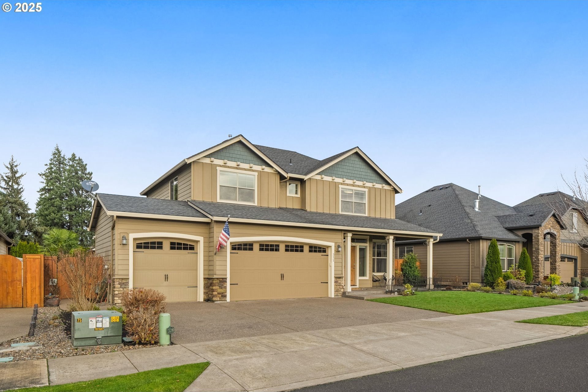 Charming Craftsman Oasis. Experience the perfect blend of modern elegance and cozy charm in this beautifully maintained 2015 traditional Craftsman home. This move-in-ready gem boasts 2,698 SQFT of thoughtfully designed living space, featuring 3 spacious bedrooms and 2.5 baths. Main level highlights include: Luxurious primary suite with ensuite bath, walk-in shower and closet. Closet also for stackable W/D if desired. Stunning kitchen with granite countertops, double ovens, gas range, pantry, and stainless-steel appliances. Formal dining room and high ceilings throughout. Kitchen, entry and dining all have lovely hand scraped engineered hardwood floors. A cozy family room with gas fireplace and built-ins. Effortless indoor-outdoor living with a sliding door to a manicured backyard and covered patio. Water feature, raised beds and tool shed all included in the backyard. Upstairs, discover spacious bedrooms and a versatile bonus nook perfect for work, play, or relaxation. The oversized garage offers extra storage and a third bay, providing ample space for all your needs. Conveniently located near dining, food carts, shopping, and all that Canby has to offer. Don't miss out on this incredible opportunity!