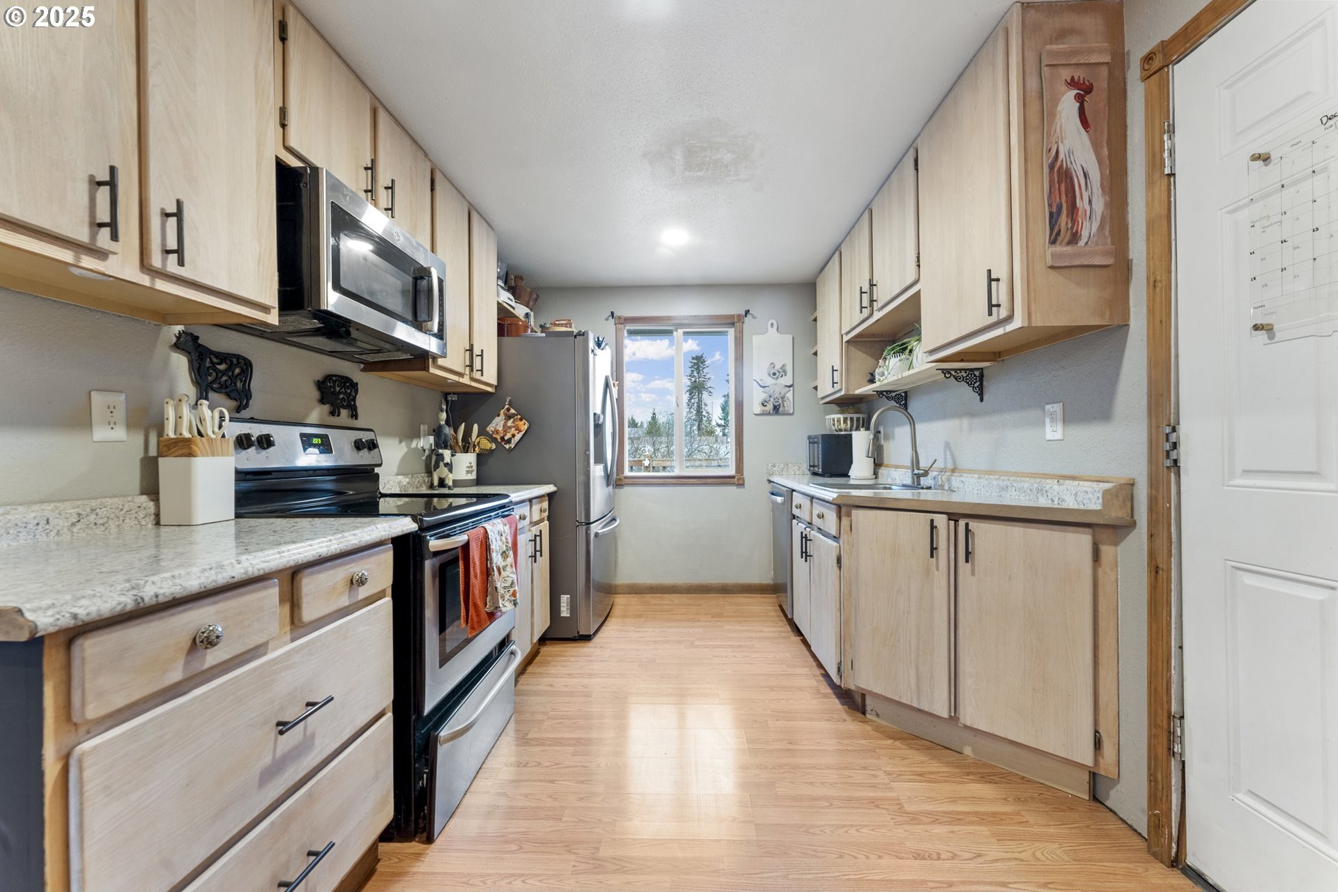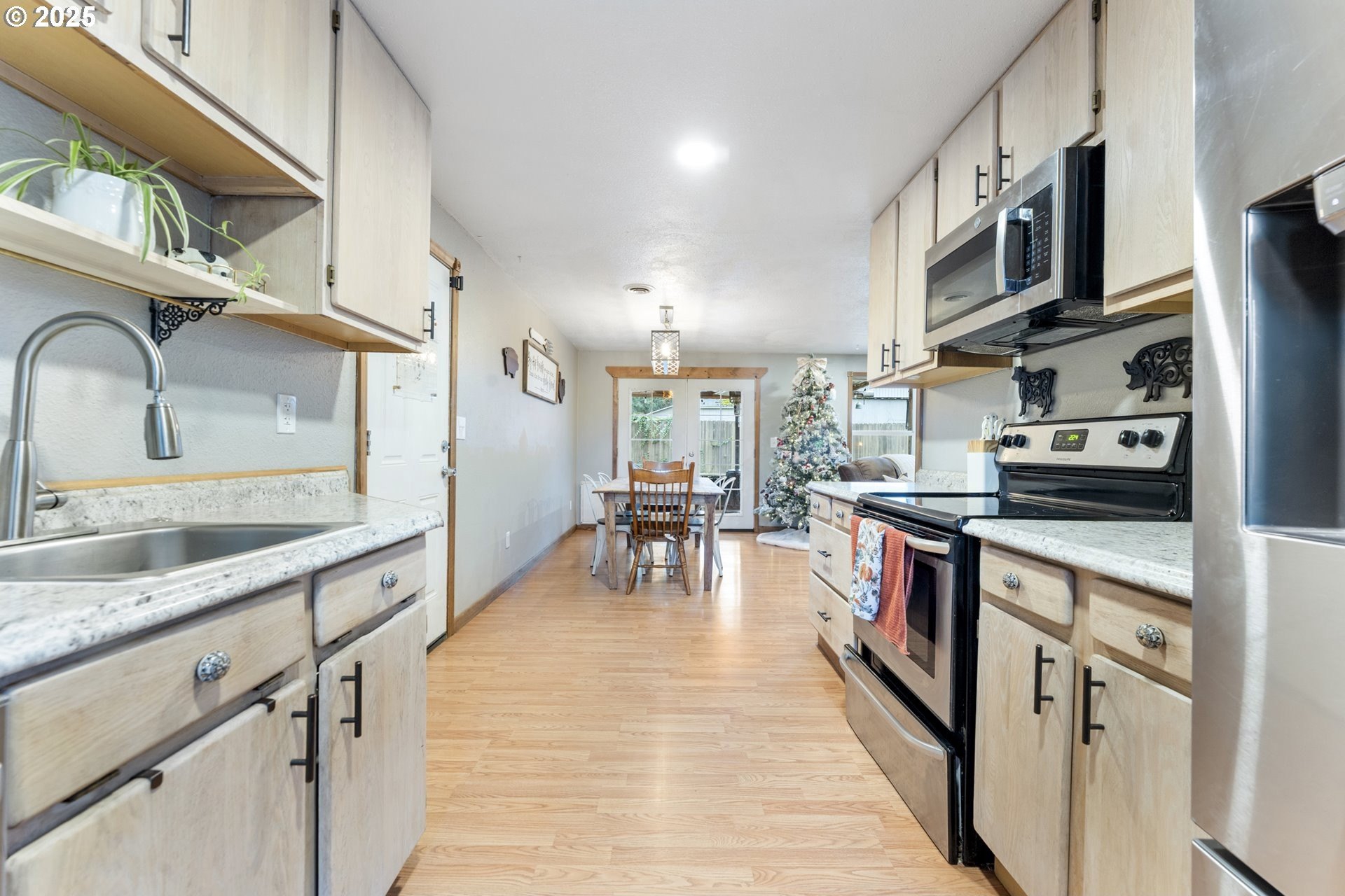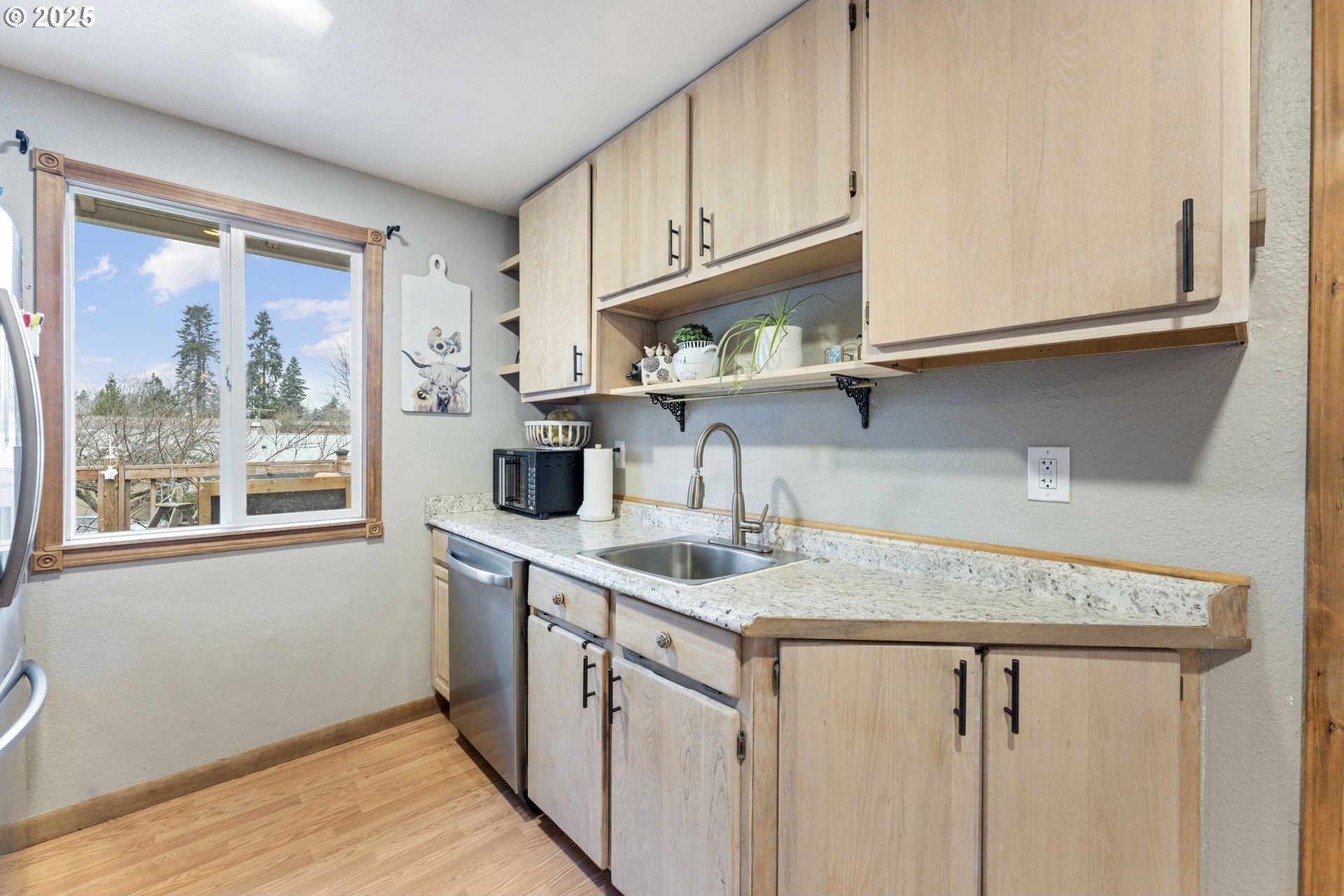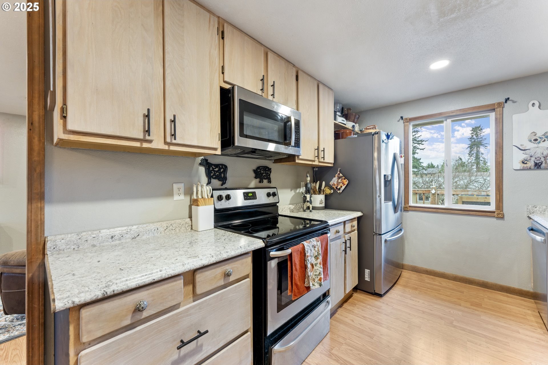 Welcome to this charming 3 bedroom, 1.5 bath single family home nestled in the desirable Franklin Heights neighborhood of Sandy. Offering 1,118 sq. ft. of comfortable living space, this well maintained residence combines functionality with inviting warmth. The thoughtful floor plan features light filled living areas, a practical kitchen, open concept for entertaining and spacious bedrooms designed for everyday comfort. A two-car garage provides ample parking and storage, while the fully usable yard offers room to relax, garden, or entertain. Enjoy the delicious fruit bearing peach trees in the summer too! Conveniently located near schools, parks, shopping, and outdoor recreation, this home presents a wonderful opportunity to enjoy small-town living with easy access to the beauty of the Pacific Northwest. New paint in dining room, living room and primary!