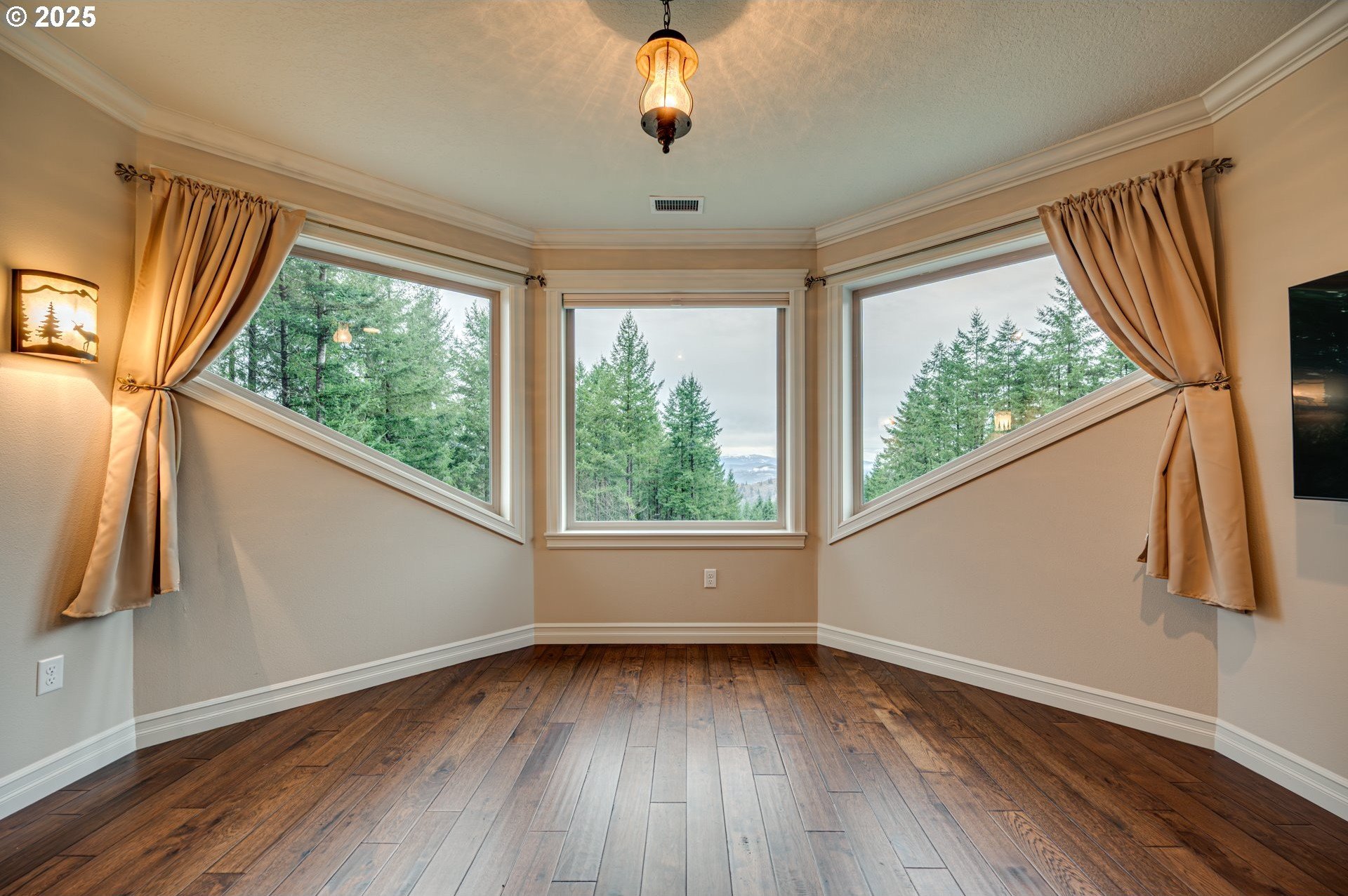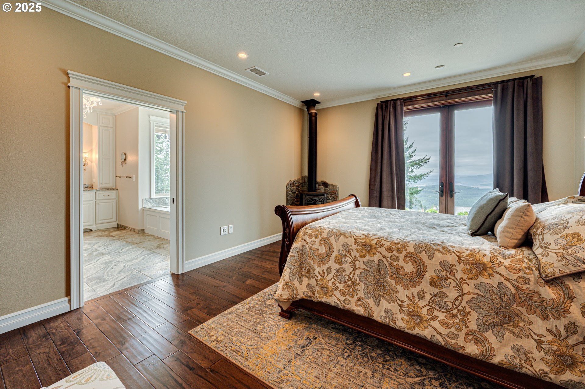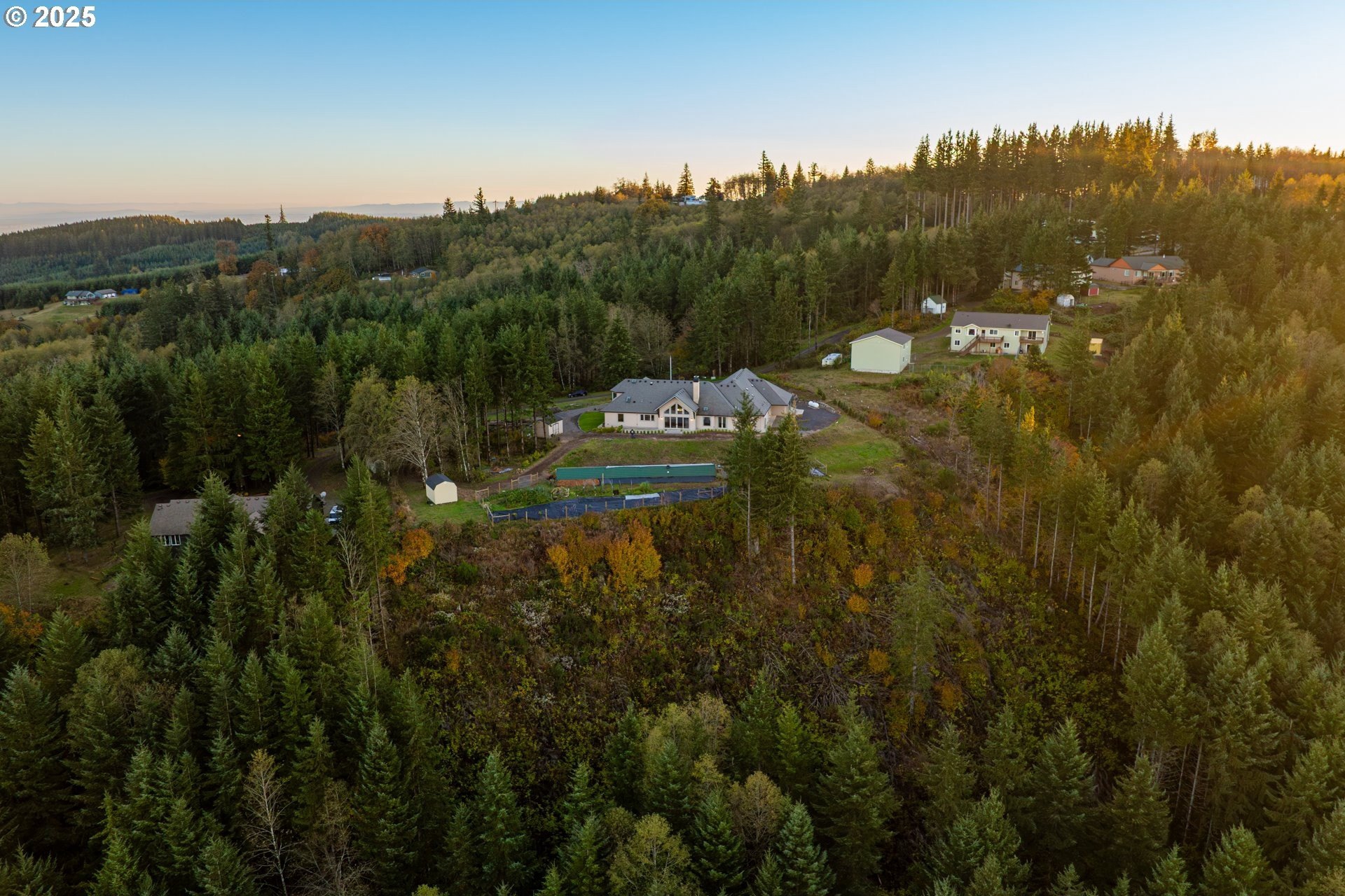 Panoramic mountain and territorial views with a custom-built 2019 luxury estate, offering 4,830 square feet on over 10 acres. Thoughtfully designed with hardwood floors throughout, vaulted timber framing, and a high efficiency wood-burning fireplace. The entertainer's kitchen features high-end built-in appliances and an oversized island. The primary suite is a private retreat with a propane fireplace, jetted tub, roll-in shower, and a spacious walk-in closet with custom built-ins. Flexible living spaces also include a music room, workout room, office, bonus room, a fully equipped theater room and tons of storage. Smart home technology pairs with environmentally conscious design, including low EMF wiring, a whole-house generator, advanced water and air purification systems, and exceptional energy efficiency. Outdoor amenities include a 17x84 geothermal greenhouse, organic fruit tree orchard and garden, 3 outdoor hydrants, dog run, EV charging in the oversized garage, and grounds designed for privacy and sustainability.