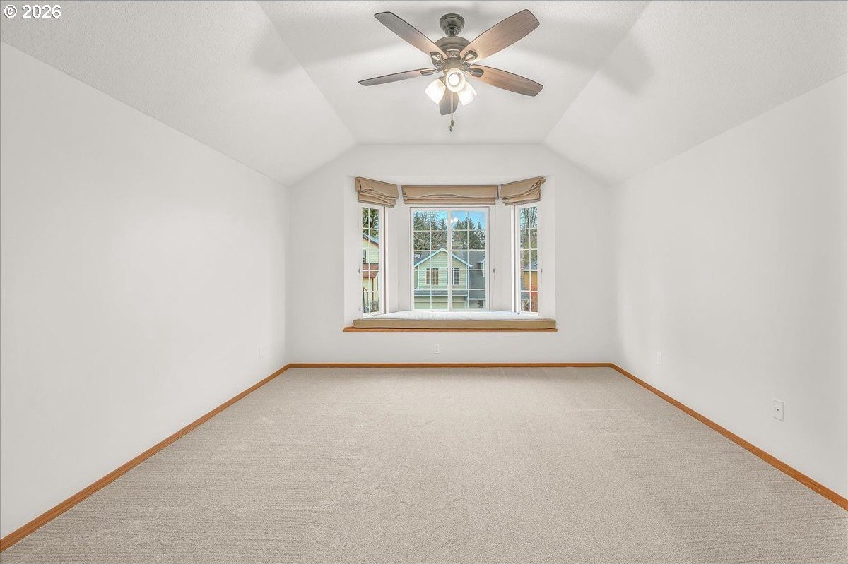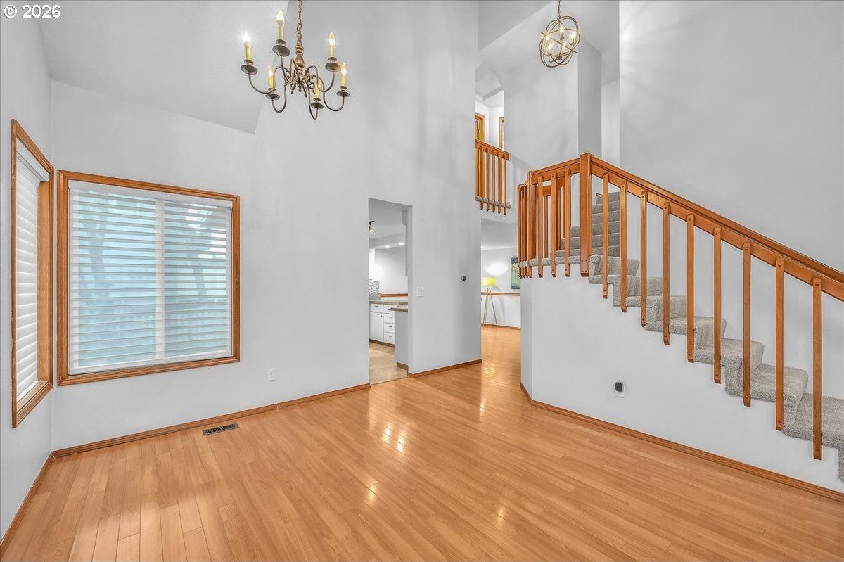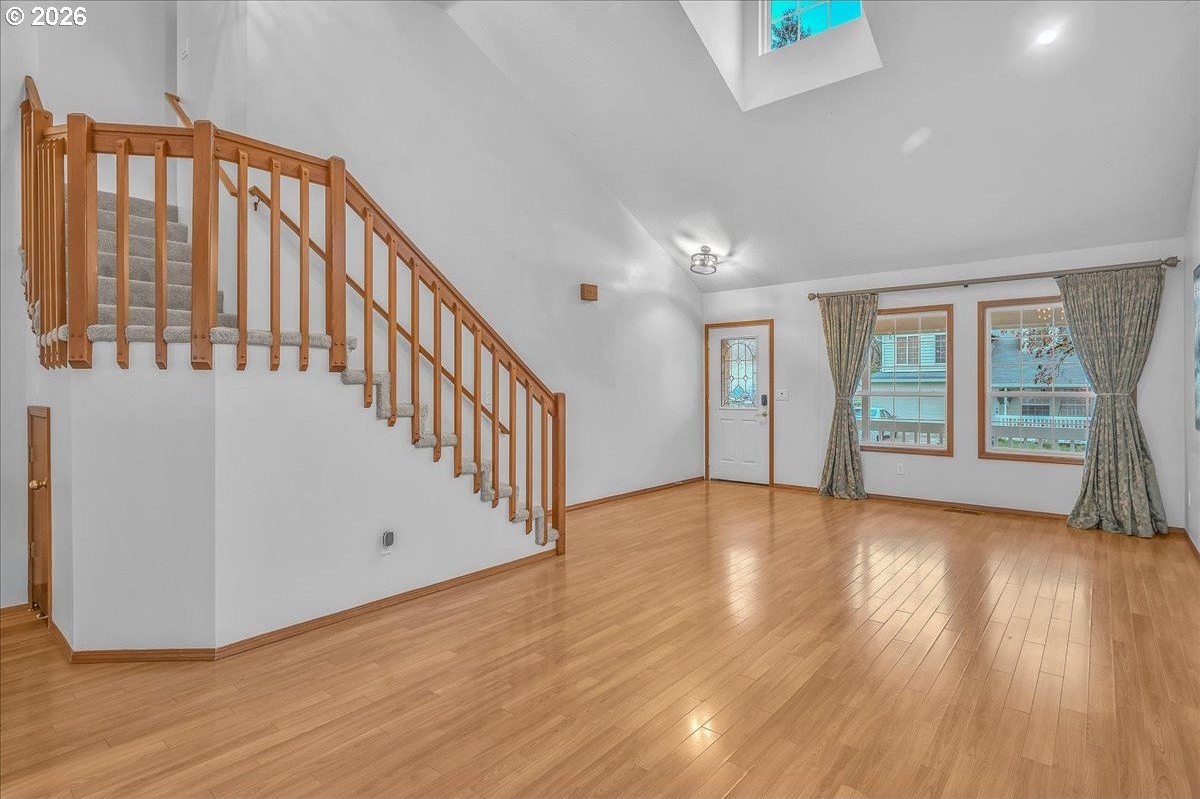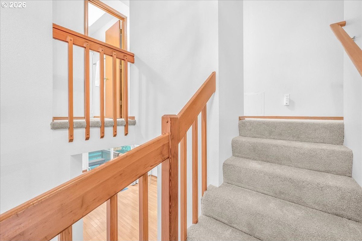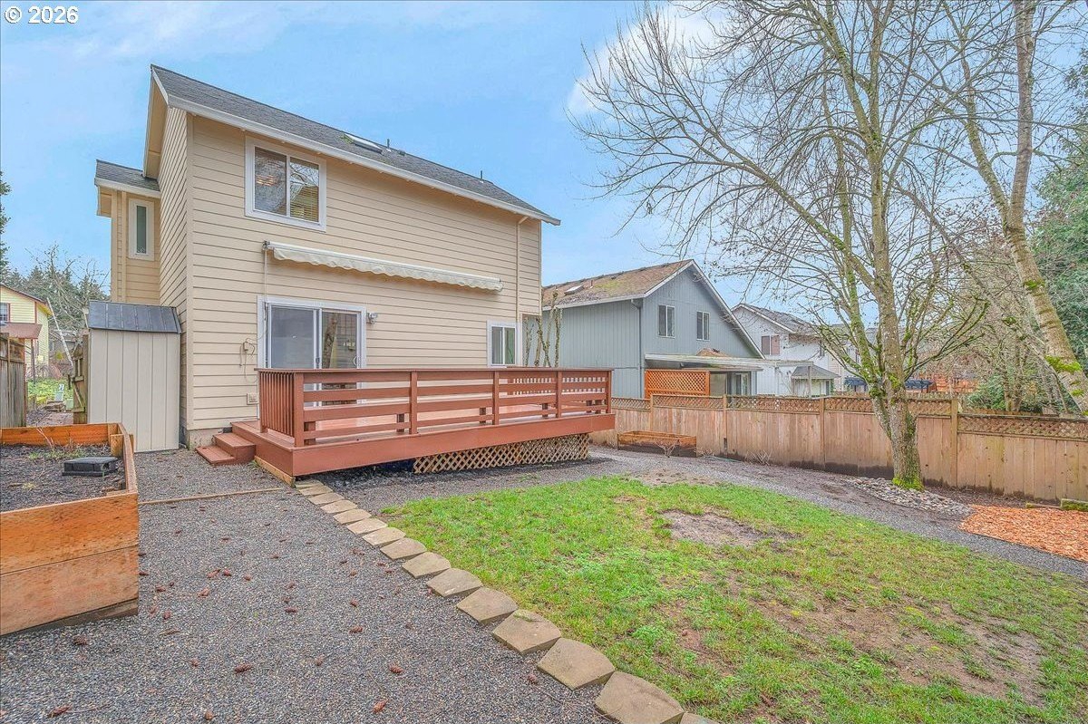 Soaring ceilings, abundant natural light, and an open, inviting layout make this Bethany home a standout value. This bright and welcoming 3-bedroom, 2.5-bath home offers a spacious, airy floor plan in a desirable location, featuring wood floors throughout the main level and brand-new carpet upstairs. A vaulted ceiling and open staircase create an impressive entry, with views from the upper level overlooking the expansive great room. The living and dining areas flow seamlessly into the kitchen, enhancing the home's open, connected feel. The updated kitchen features Corian countertops, freshly painted white cabinetry, and a breakfast bar that opens to an additional sitting area-perfect for casual living or entertaining. Upstairs, the oversized primary suite easily accommodates a king-sized bed and includes a walk-in closet, a charming window seat, and an en suite bath with dual sinks and a tub/shower combination. Two additional bedrooms are nicely sized and share a well-appointed hall bath. The home has been thoughtfully refreshed with fresh interior paint, roof and gutter cleaning, and a nicely updated yard. The west-facing backyard captures beautiful evening sunsets and features a newly stained deck with built-in seating, a fully fenced yard, raised garden space, and a grassy area for flexible use. A covered front porch adds to the inviting curb appeal, while a two-car garage and driveway provide ample parking and storage. Enjoy easy access to trails throughout Bethany, shopping along 185th and Tanasbourne, and Highway 26. A wonderful opportunity to own in a sought-after area.