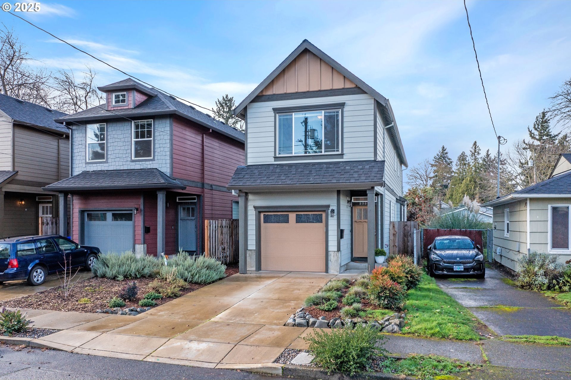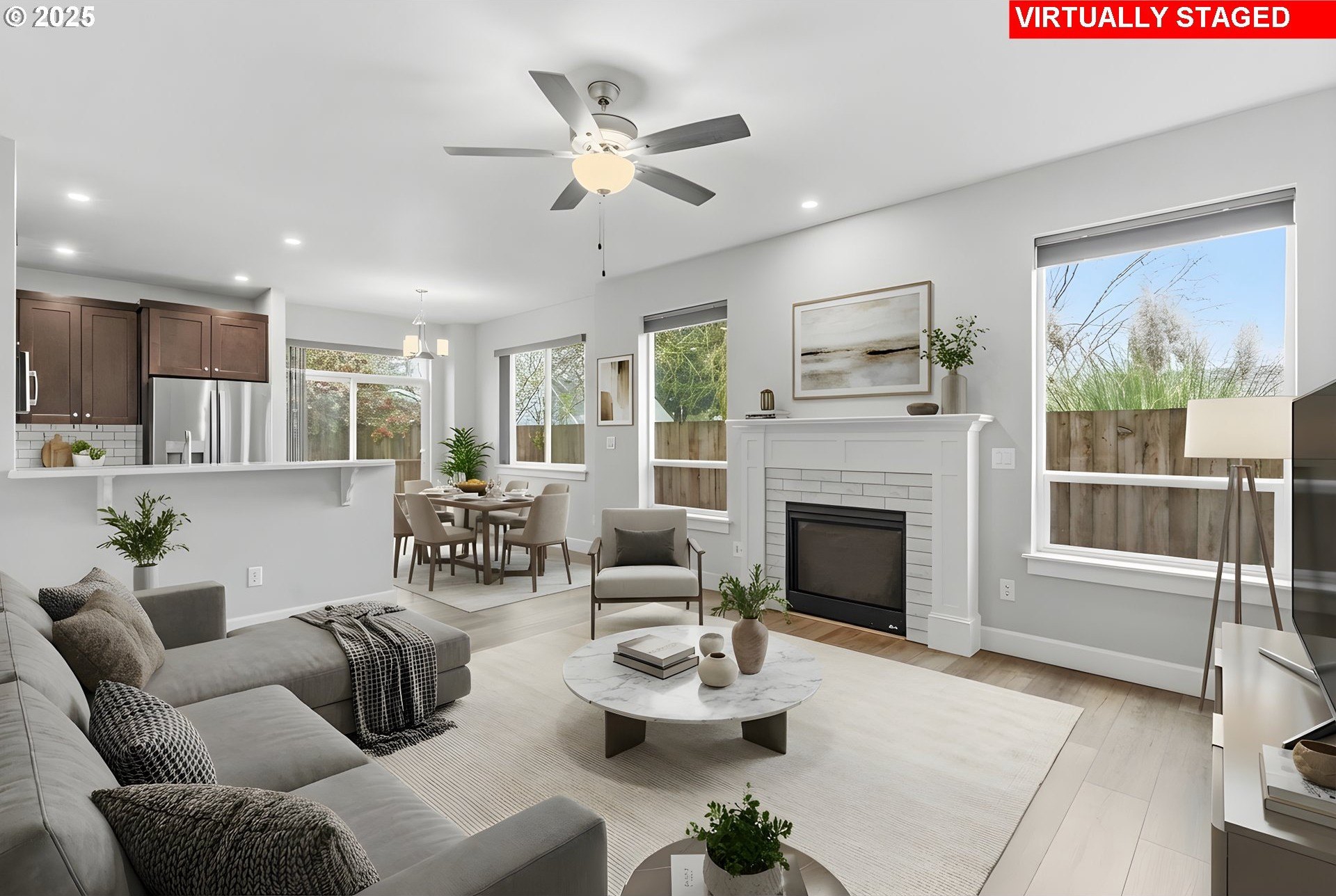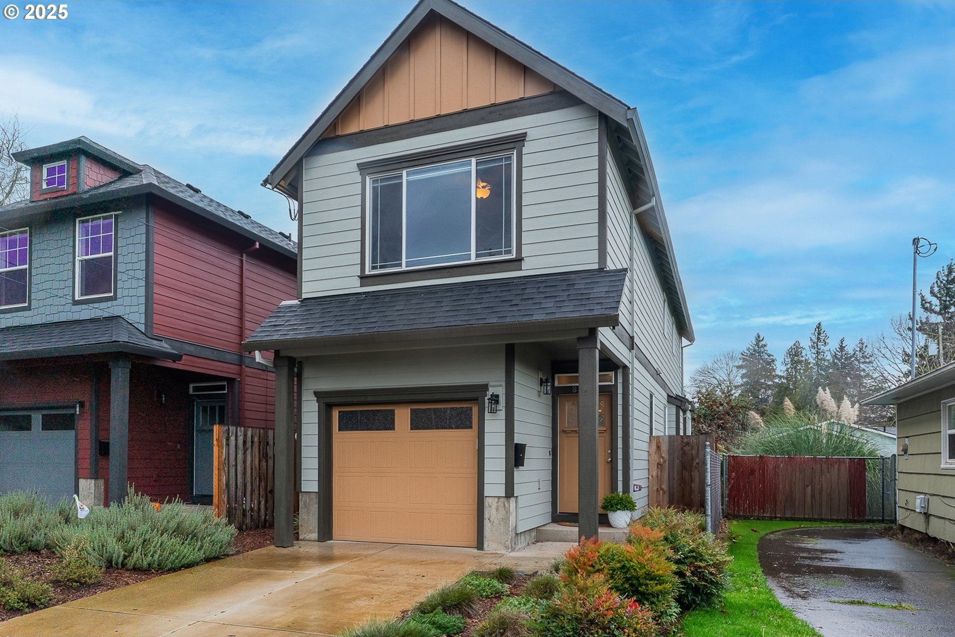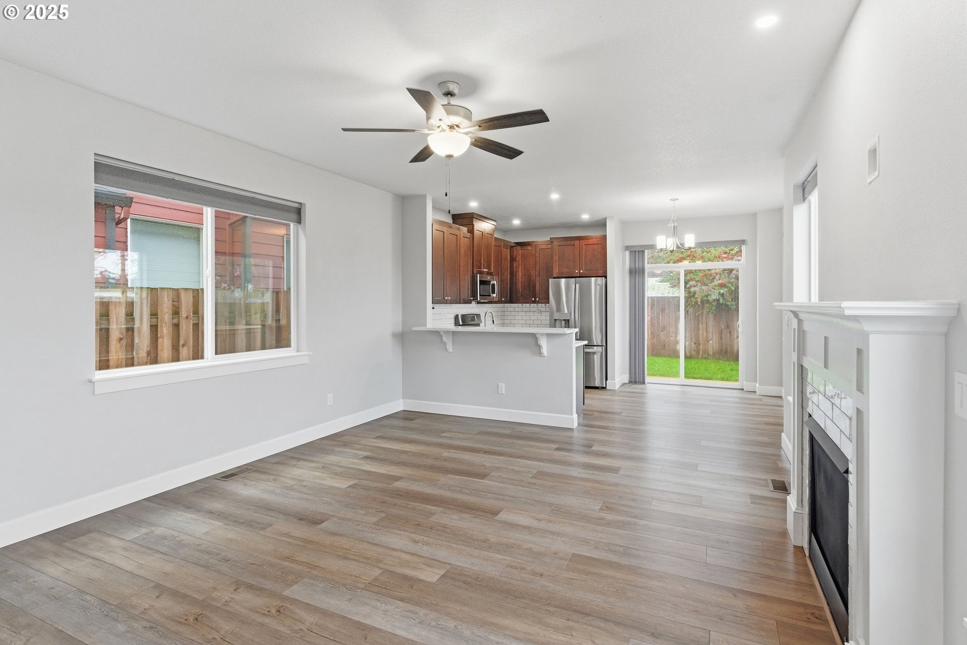 Tucked into a classic Portland neighborhood, this modern two-story home delivers clean lines, smart design, and effortless livability. The covered entry opens to a light-filled, open-concept main level where a statement fireplace anchors the living space and large windows bring the outdoors in. The kitchen blends style and function with stainless steel appliances, a tiled backsplash, an eat-up bar, and a dining nook made for slow mornings or lively dinners. Slide open the glass door to a fully fenced backyard with lush grass-your own private urban escape. Upstairs keeps things streamlined with all bedrooms on one level, a dedicated laundry room, a full hallway bath, and a generously sized primary suite complete with an ensuite soaking tub. An attached one-car garage adds everyday convenience to this polished, contemporary Portland home.