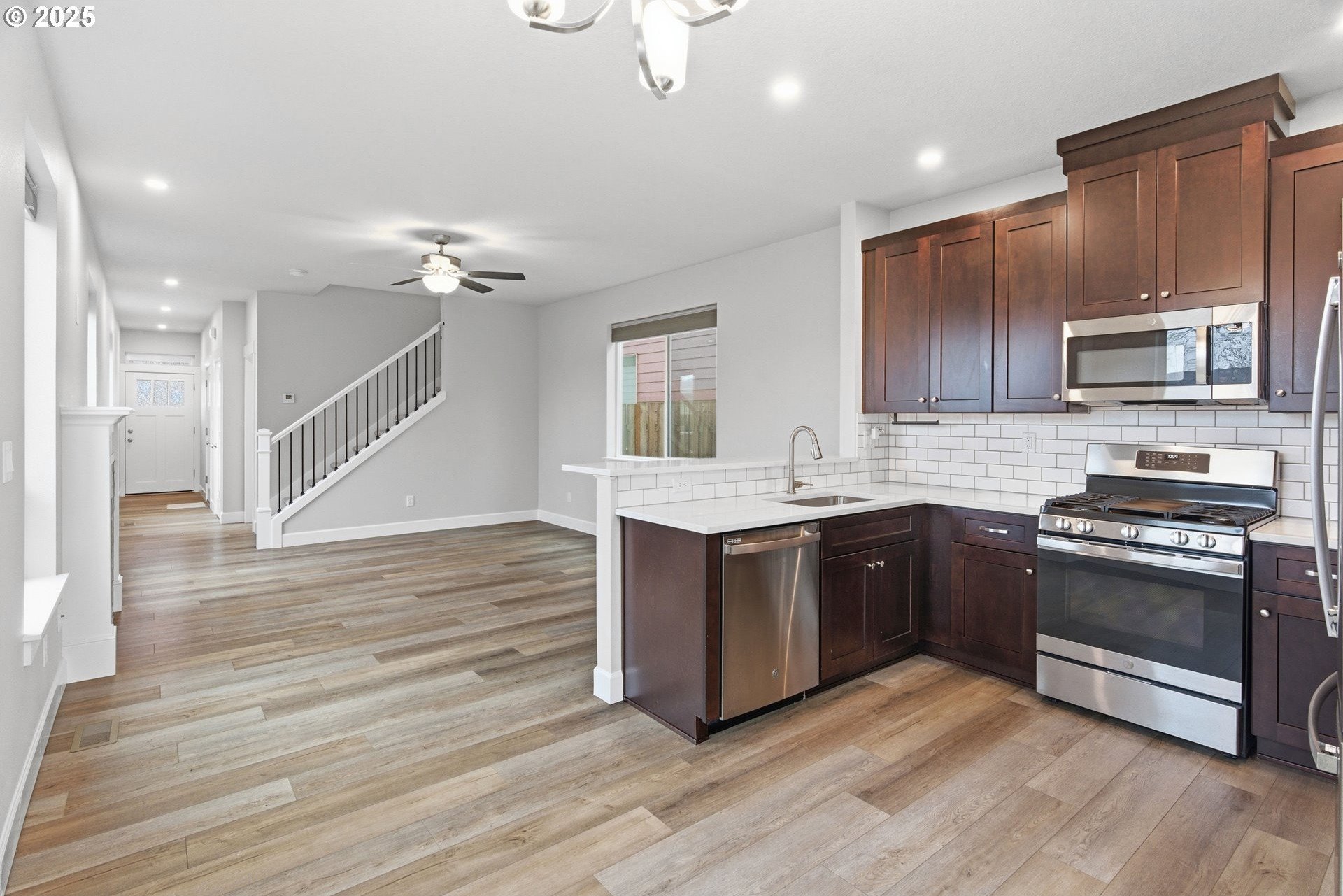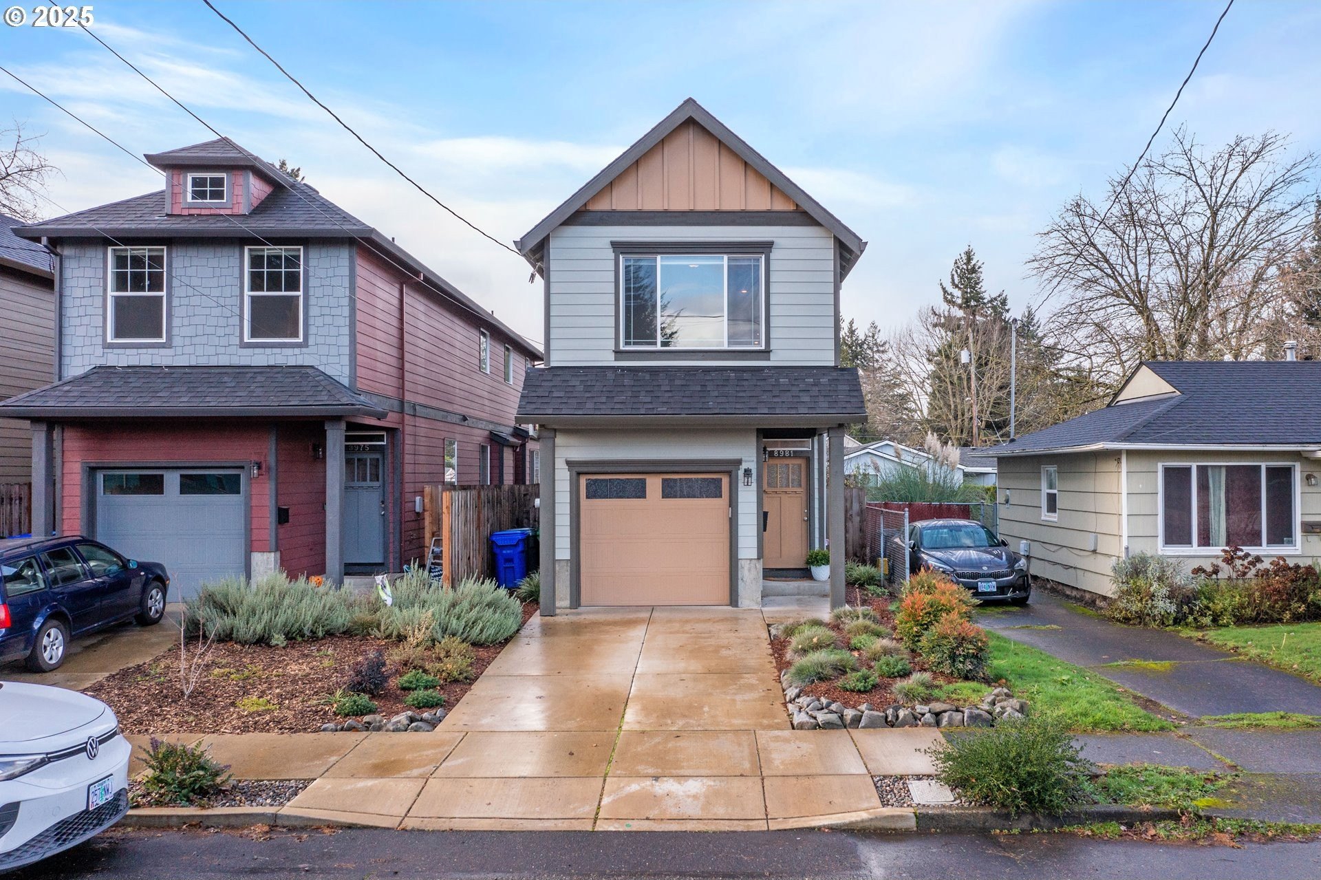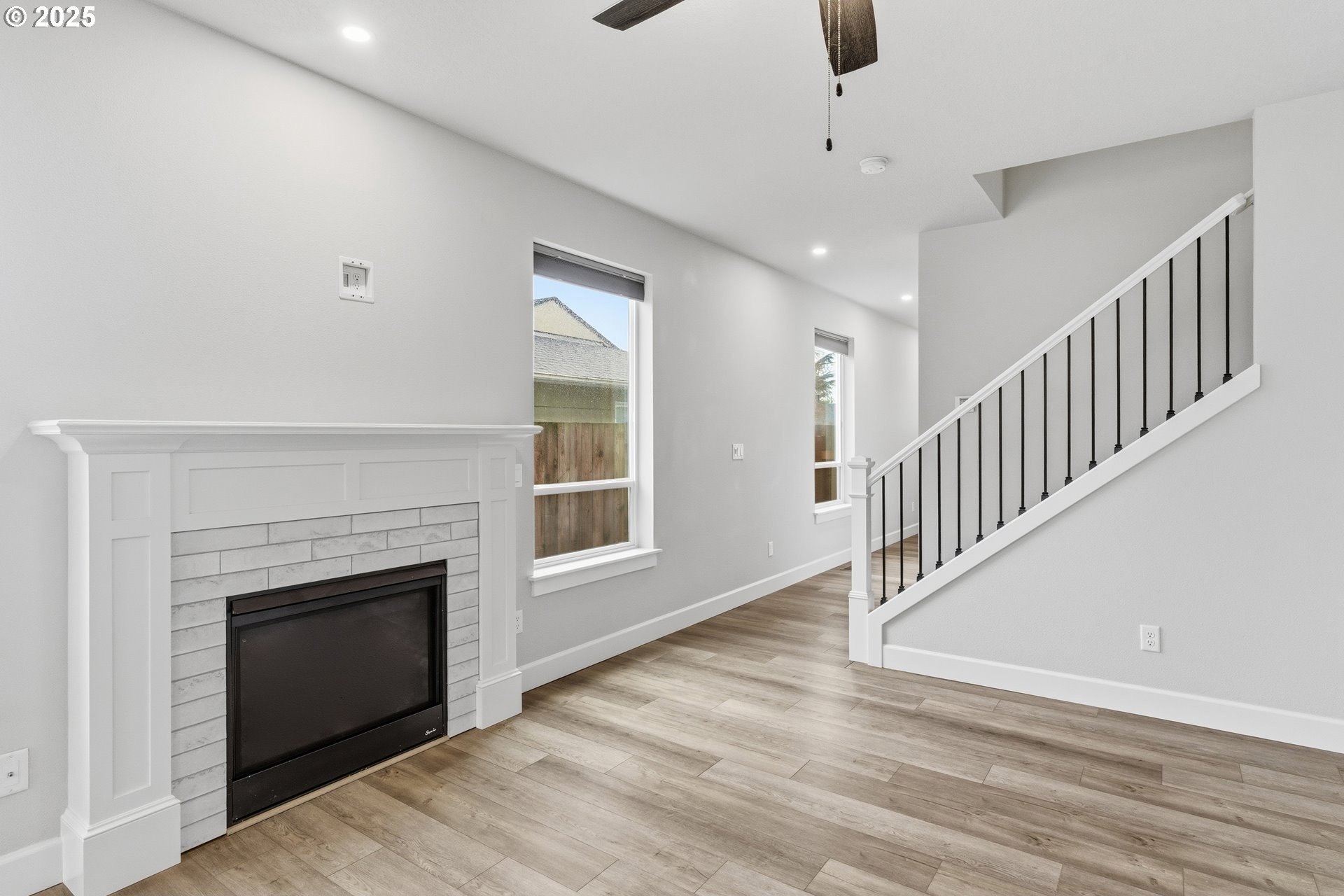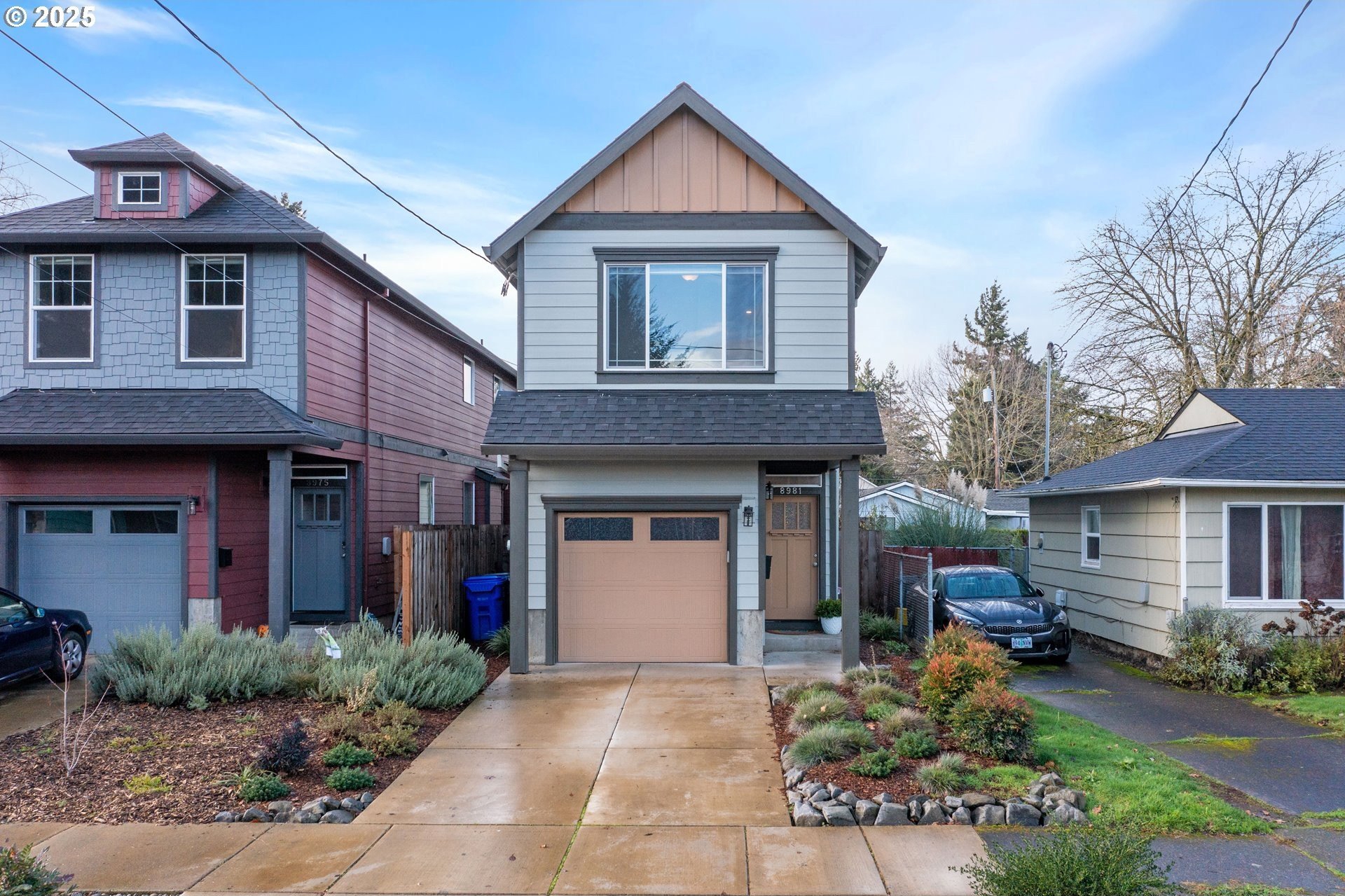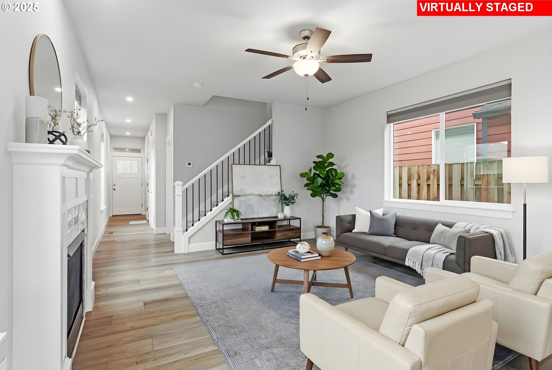 Tucked into a classic Portland neighborhood, this modern two-story home delivers clean lines, smart design, and effortless livability. The covered entry opens to a light-filled, open-concept main level where a statement fireplace anchors the living space and large windows bring the outdoors in. The kitchen blends style and function with stainless steel appliances, a tiled backsplash, an eat-up bar, and a dining nook made for slow mornings or lively dinners. Slide open the glass door to a fully fenced backyard with lush grass-your own private urban escape. Upstairs keeps things streamlined with all bedrooms on one level, a dedicated laundry room, a full hallway bath, and a generously sized primary suite complete with an ensuite soaking tub. An attached one-car garage adds everyday convenience to this polished, contemporary Portland home.