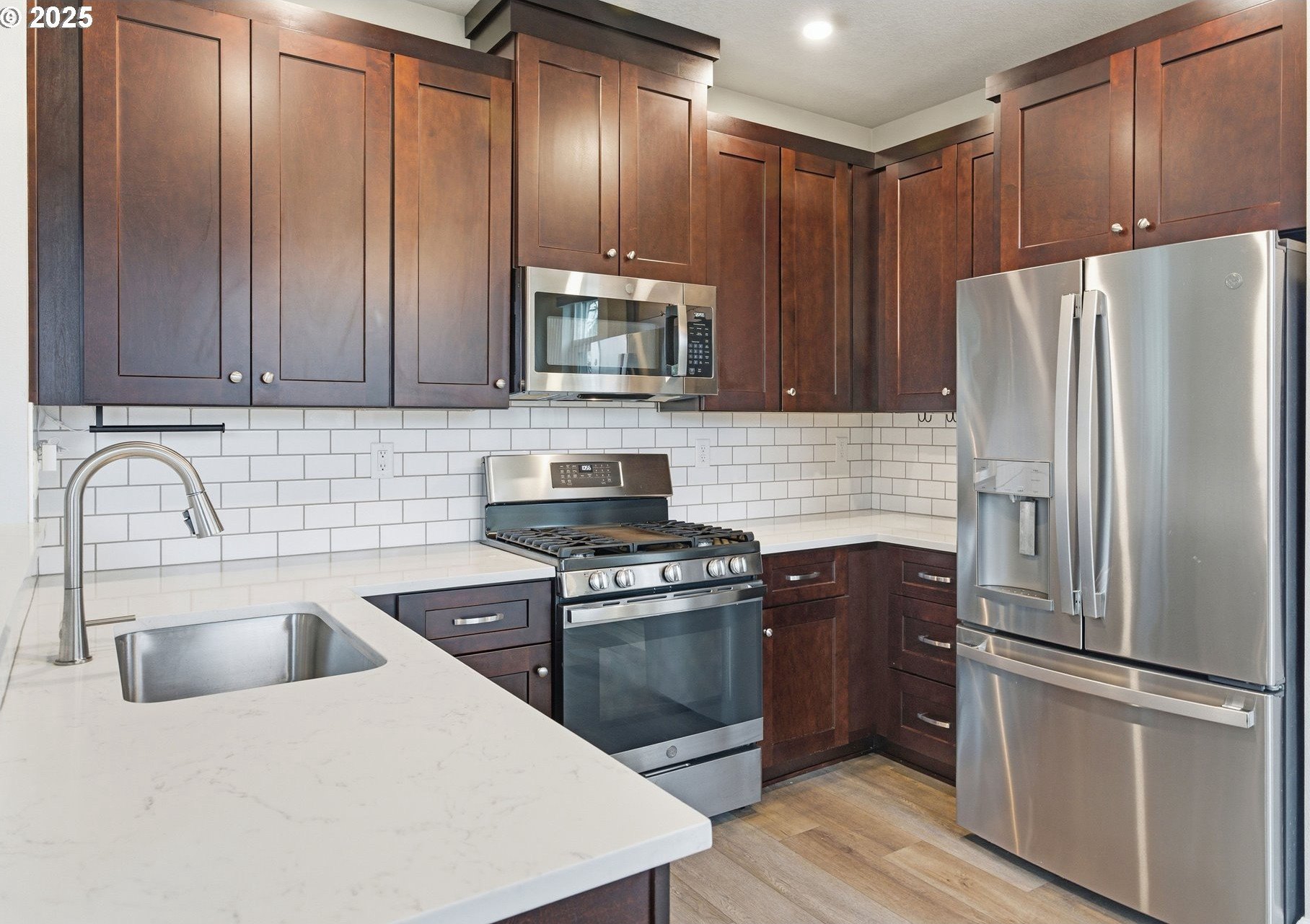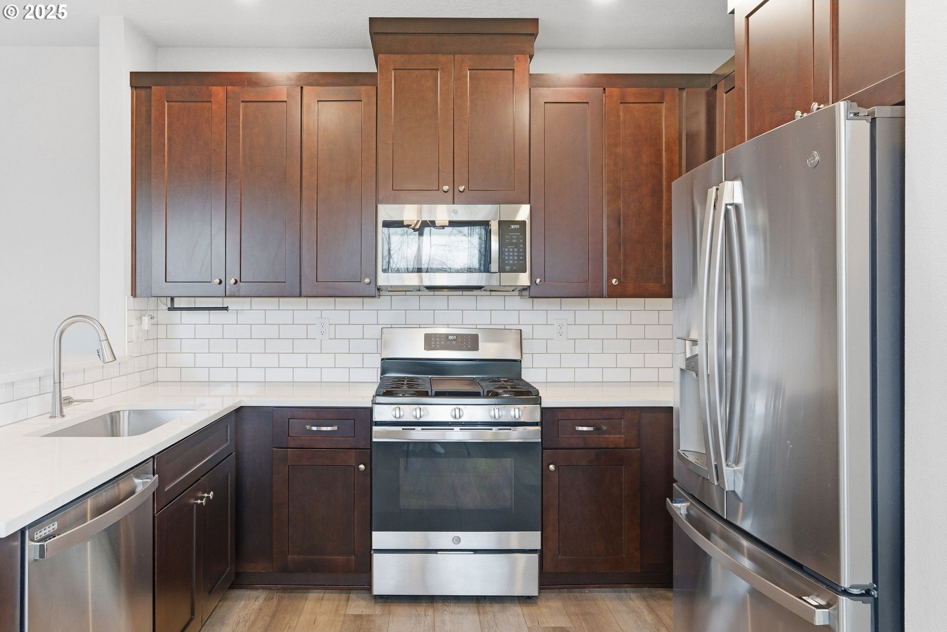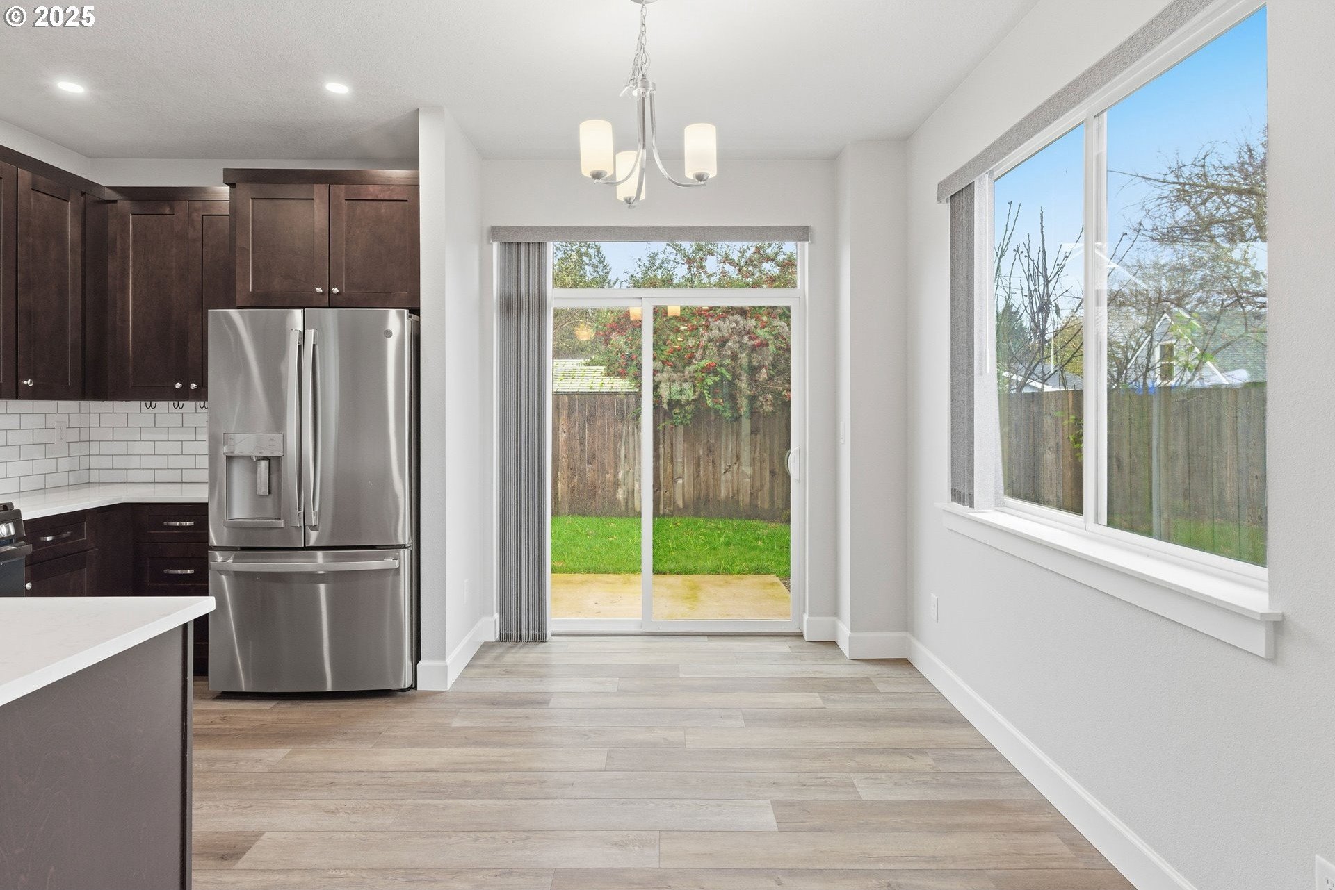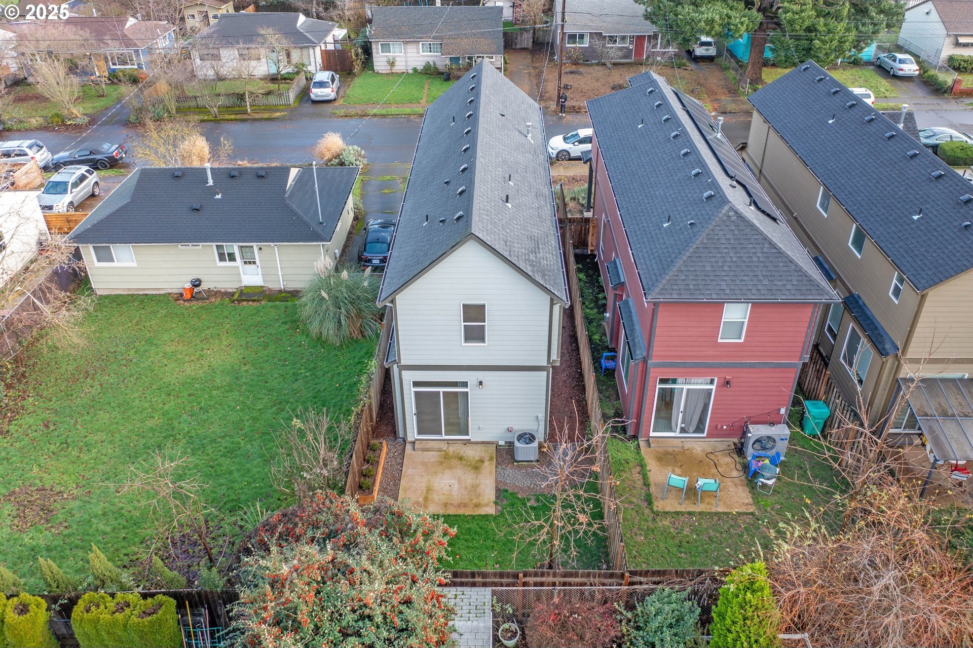 Tucked into a classic Portland neighborhood, this modern two-story home delivers clean lines, smart design, and effortless livability. The covered entry opens to a light-filled, open-concept main level where a statement fireplace anchors the living space and large windows bring the outdoors in. The kitchen blends style and function with stainless steel appliances, a tiled backsplash, an eat-up bar, and a dining nook made for slow mornings or lively dinners. Slide open the glass door to a fully fenced backyard with lush grass-your own private urban escape. Upstairs keeps things streamlined with all bedrooms on one level, a dedicated laundry room, a full hallway bath, and a generously sized primary suite complete with an ensuite soaking tub. An attached one-car garage adds everyday convenience to this polished, contemporary Portland home.