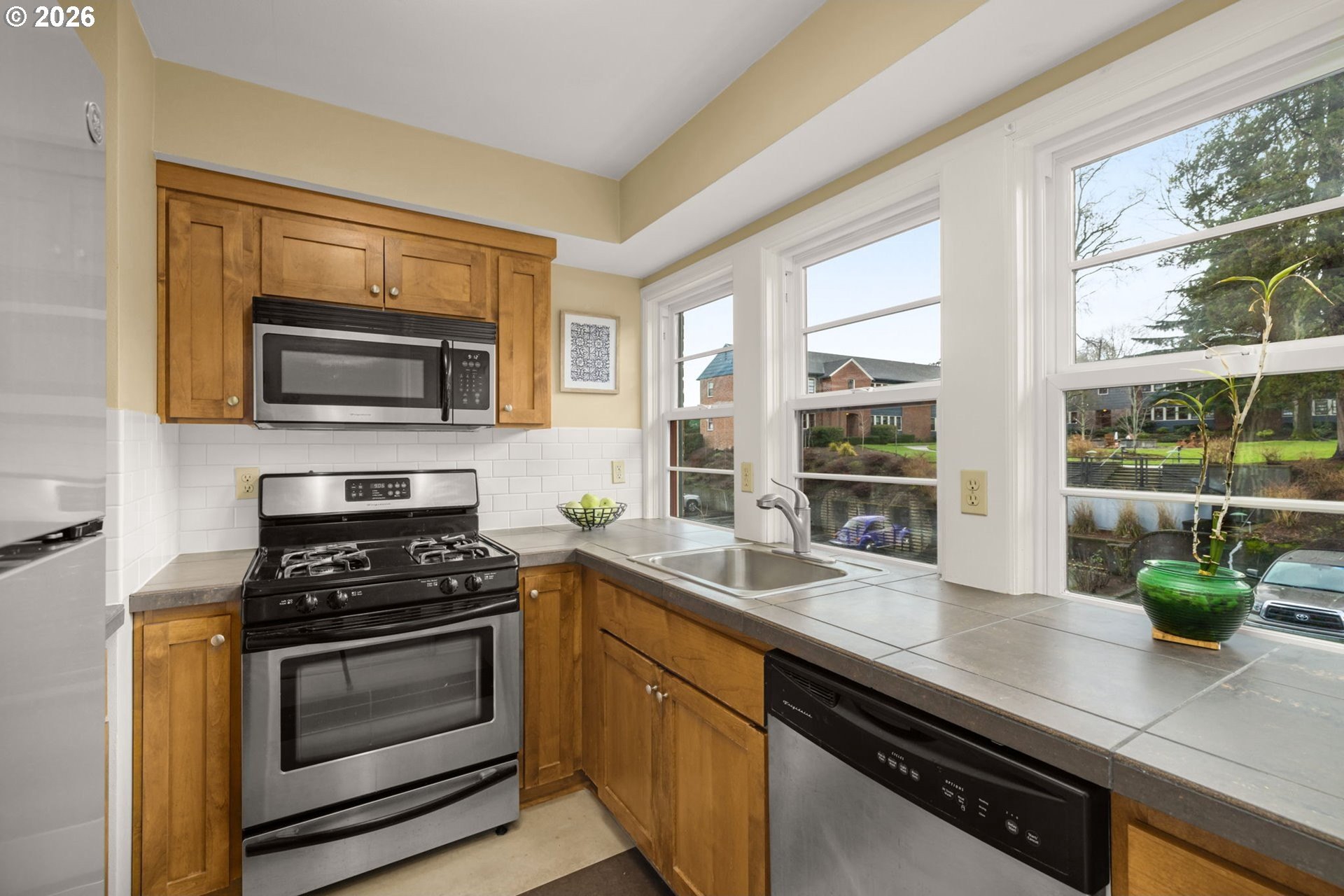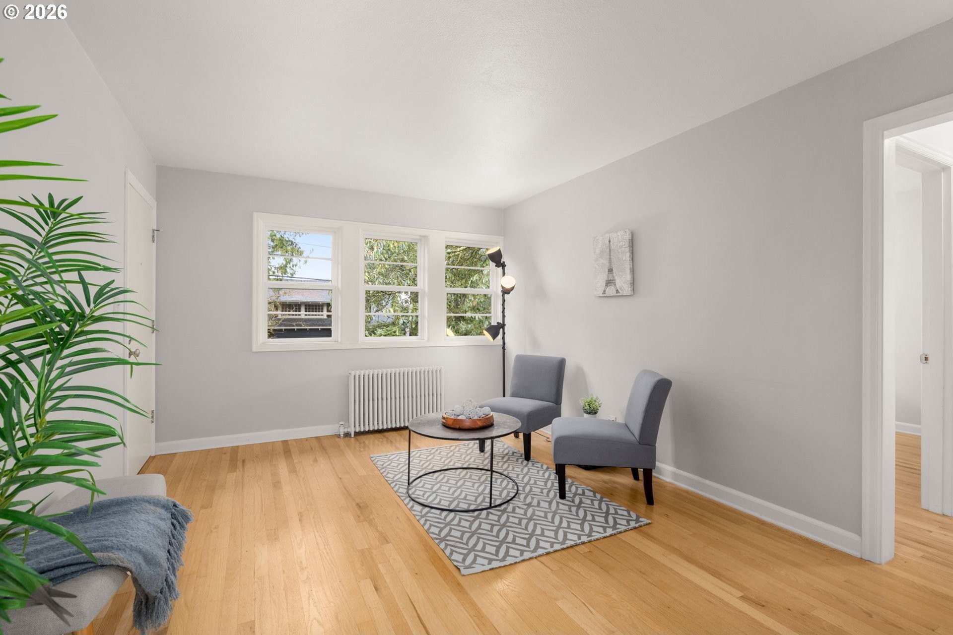 The View Condominiums offer a welcoming community feel with close proximity to Mt. Tabor, transit, charming tree-lined streets, and one of Portland's most vibrant neighborhoods. This post-war building features original hardwood floors, wide staircases, abundant large windows that fill the space with natural light throughout the day, and solid brick construction for excellent year-round insulation. The timeless character of an older building-rarely replicated today-is thoughtfully embraced here with strategic updates.This second-floor condo includes an updated kitchen and bathroom, in-unit laundry, and newer windows. The efficient layout features a comfortable living room with a dining and/or office area conveniently located adjacent to the kitchen. With only two owners sharing the same exterior entry door, privacy is a standout feature with minimal foot traffic.Enjoy a large grassy common area that feels like your own private park, complete with a seasonal fountain, mature shade trees, Adirondack chairs, and raised garden beds for residents. STORAGE: YES! A secure 9' x 4' basement storage space plus bike parking. PARKING: YES! A deeded off-street parking spot is included. PETS: YES! Up to 2 dogs and 4 pets total.A well-managed HOA covers heat (yes-heat!), water, sewer, garbage, exterior maintenance, and common areas. Investors welcome-rental cap not met.