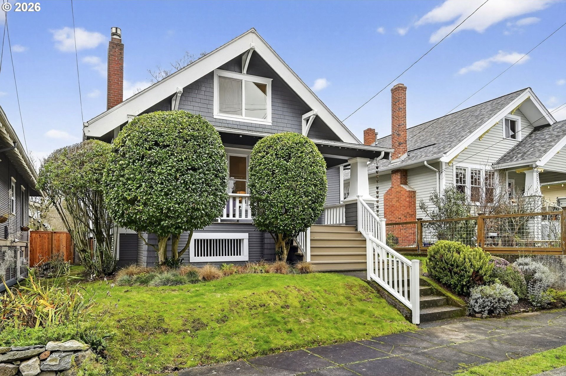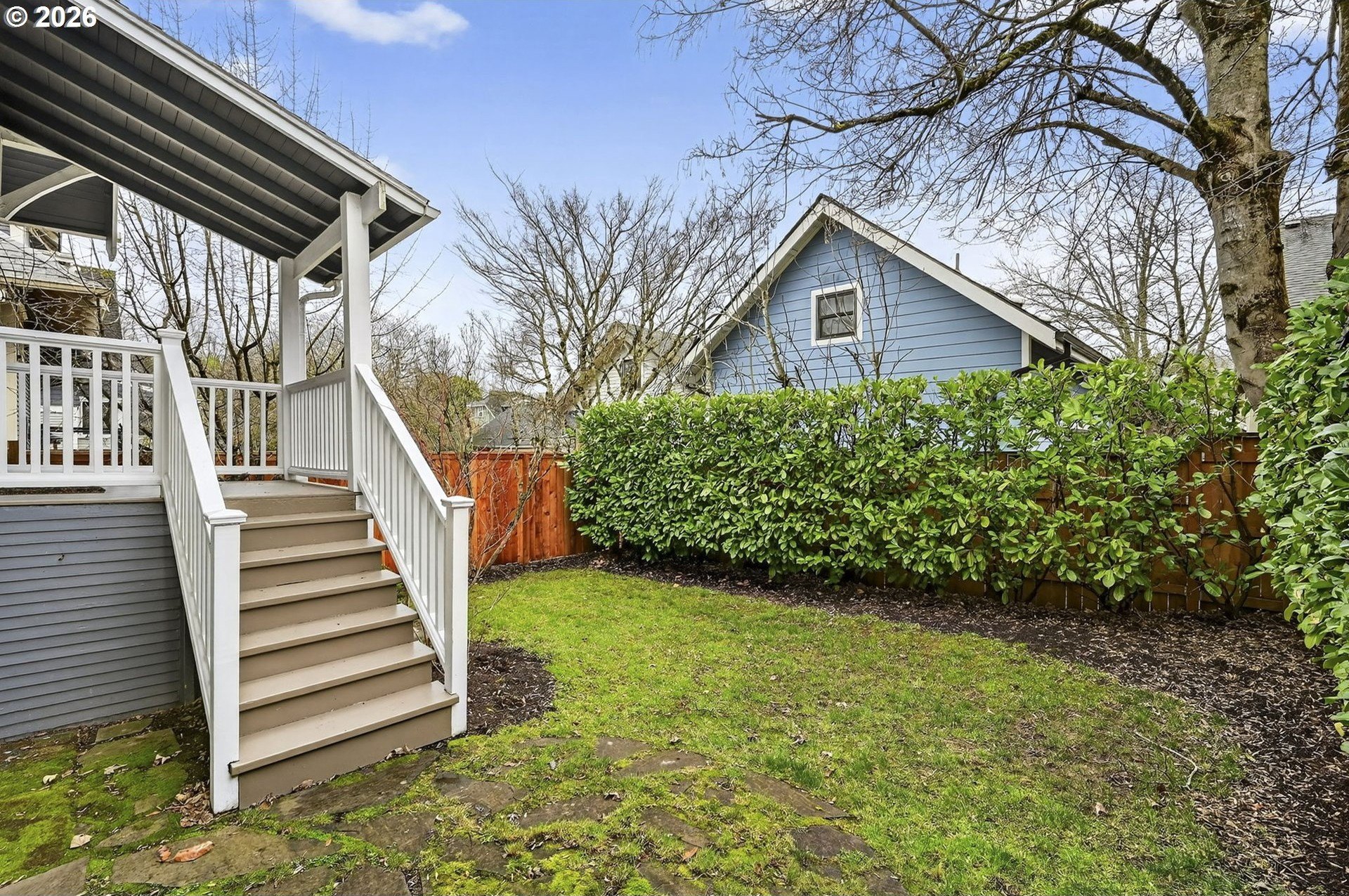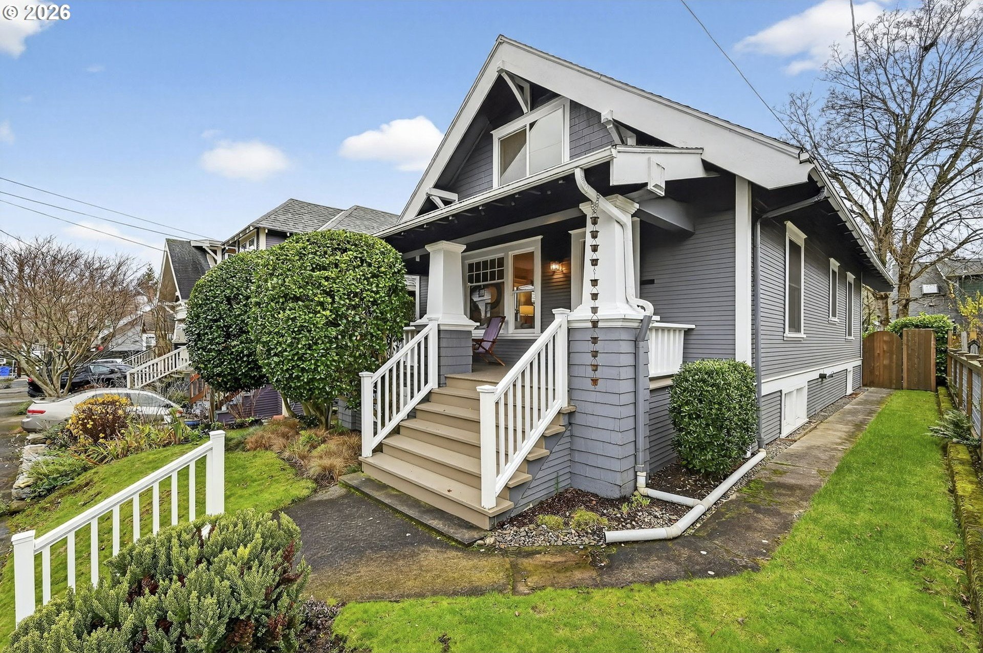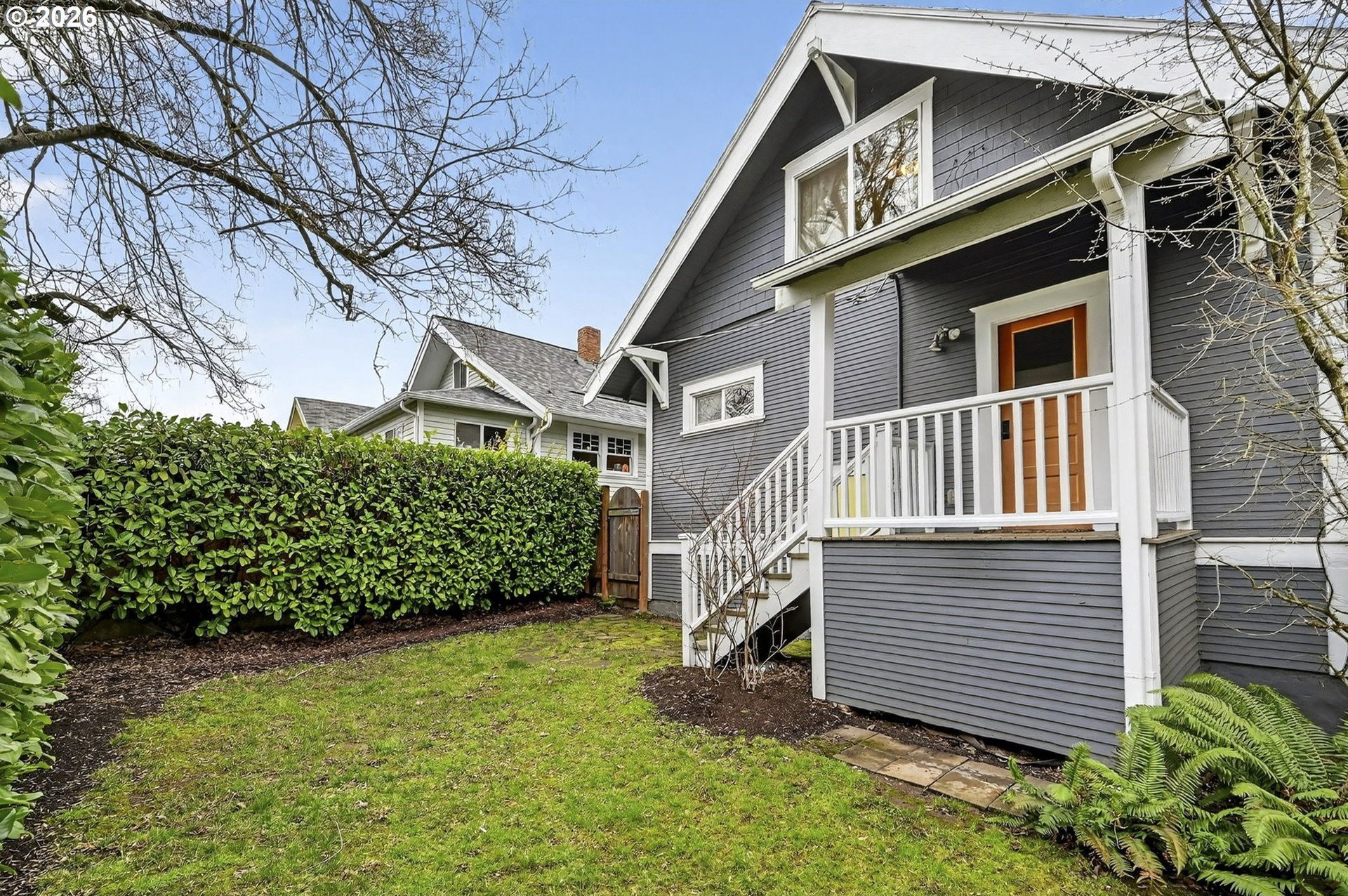 Squeaky-clean bungalow less than two blocks off Hawthorne, tucked away on a sweetheart dead end street. A classic front porch welcomes you into the charm of this solid 1911 bungalow. Oak and fir floors throughout, plus a cozy gas fireplace insert in the living room and built-ins in the dining room. Mostly newer, high-end Marvin windows throughout. The lovely second floor features a landing ideal for office space with a peek toward the West Hills, and a spacious primary bedroom with views up to Mt. Tabor Park. The unfinished basement offers a clean, blank slate with good ceiling height and an exterior entrance. Enjoy a covered back porch off the kitchen and a nicely hedged and fenced backyard perfect for summer entertaining. A beautifully maintained home that is move in ready!