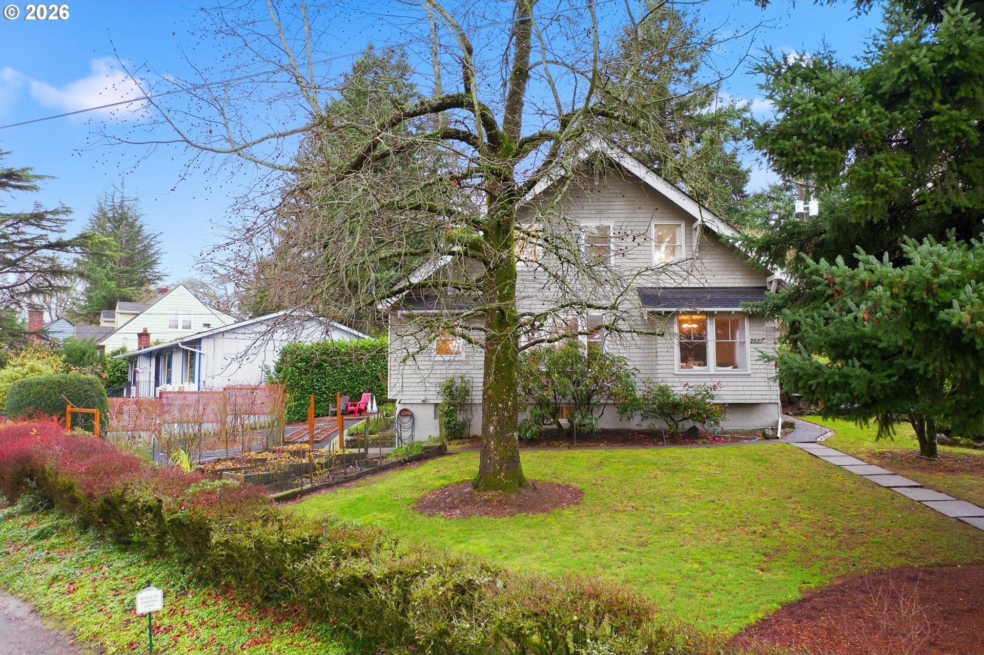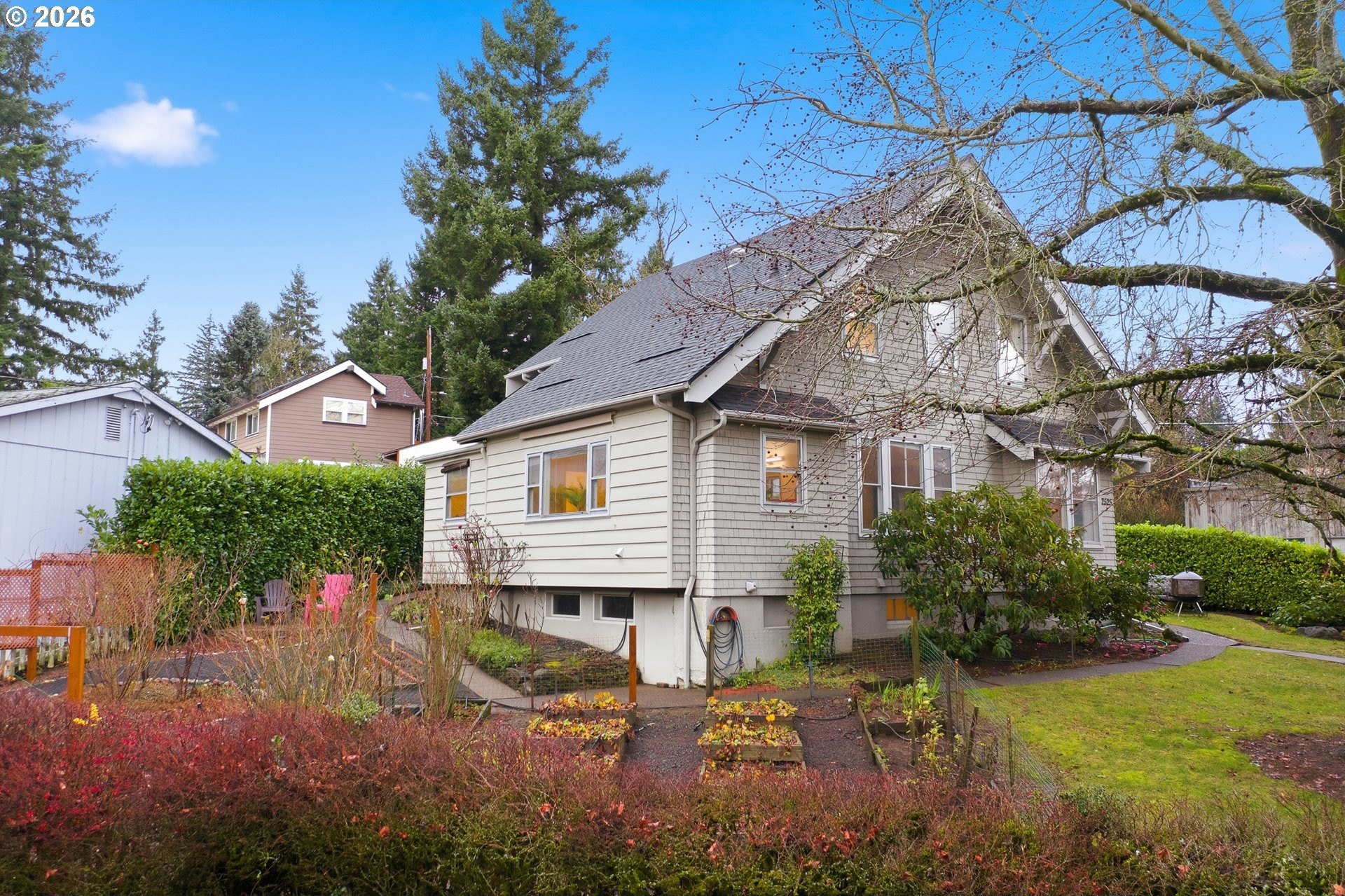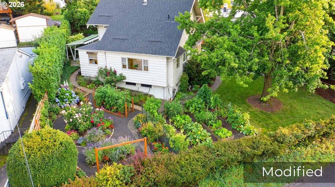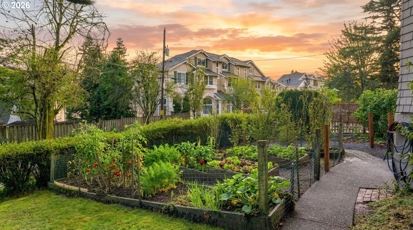 Charming 1914 Craftsman cottage. The home features 4 bedrooms, 2.5 bathrooms, and 2,472 square feet, with interiors that feel warm, welcoming, and filled with natural light. Inside, you'll find classic details throughout, paired with a series of modern updates. Outdoors, the 8,650 sq ft lot unfolds like a private sanctuary, complete with winding garden walkways, productive raised vegetable beds, quiet seating areas, and a long-established rose garden showcasing blooms that have thrived for decades. Easy maintenance watering system in place. Recent improvements include a new roof in 2024, a 200-amp electrical panel upgrade in 2025, added attic insulation, updated lighting, new water heater in 2022, a new furnace in 2020 and a fully remodeled bathroom on the upper level complete with walk-in tile shower, and tile floors. New paint throughout the home including bedrooms, kitchen cabinets, and living room. The main floor is designed for convenience, offering easy access with no steps into the home or on the first level. Featuring a bedroom with an adjoining bathroom and its own laundry room, which feels like its own private suite, making it perfect for multi-generational living possibilities. Downstairs, the basement provides additional flexibility, featuring a workshop area with a vintage wood lathe. There's an option to add washer and dryer downstairs, and plumbing is present to do so. What the owner loves about this home: the park-like setting for gardening, the large light filled living room with oversized windows overlooking the yard. The home is perfect for entertaining large parties and the outdoor patio seating area nestled in the serene landscape makes for a perfect sitting or dining area. Ideally situated near Multnomah Village and Hillsdale, with quick access to parks, trails, and downtown Portland. A special opportunity to own a well-cared-for historic property with space to garden, gather, and grow-ready to be enjoyed today. [Home Energy Score = 1. HES Report