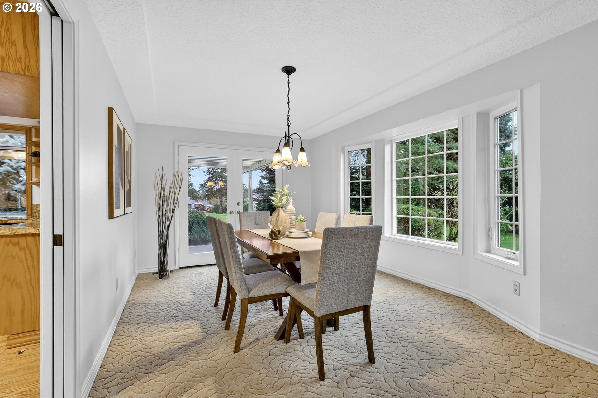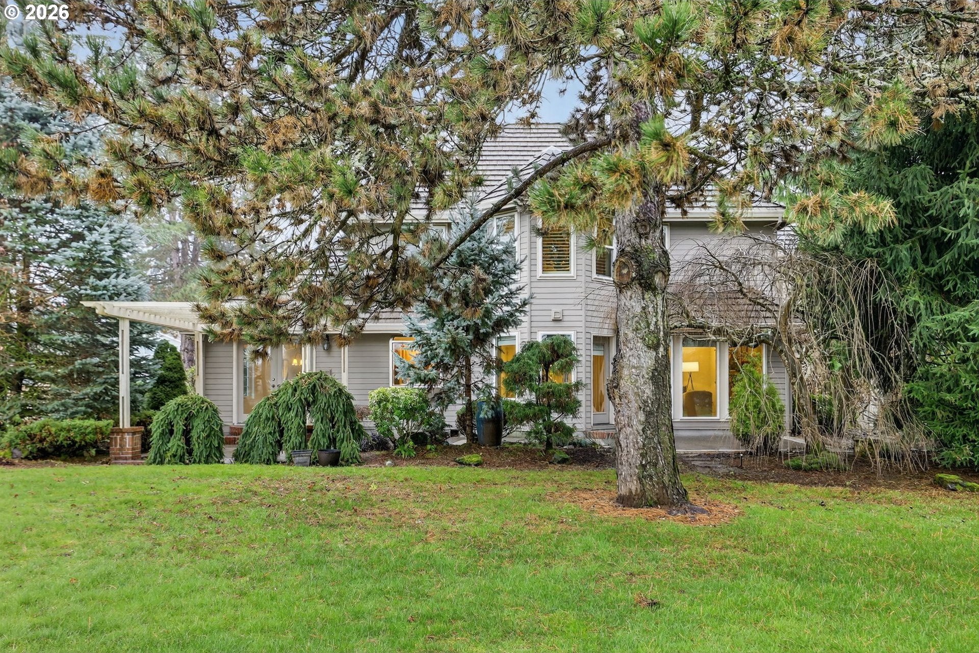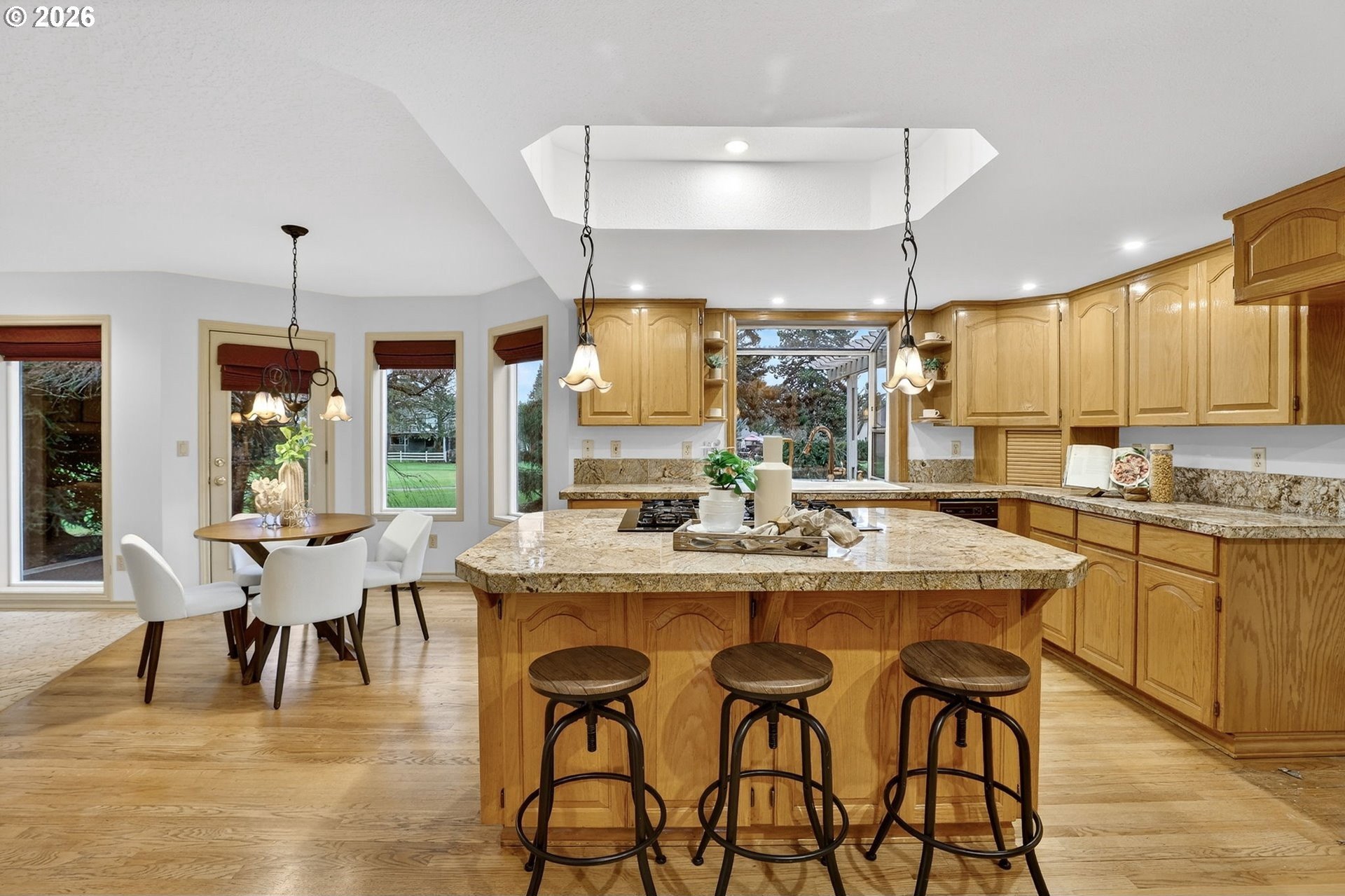 Spacious custom home backing to Green Meadows Golf Course, offering exceptional flexibility and serene views. An open entry, warm hardwood floors, and fresh interior paint create an inviting first impression. The versatile floor plan includes formal living and dining rooms, complemented by an open-concept kitchen and great room anchored by a cozy gas fireplace. With backyard access from both the great room and dining room, the layout is ideal for everyday living and effortless entertaining.The gourmet-style kitchen is perfectly positioned for gatherings and ready for your modern updates. Step outside to the beautifully landscaped backyard, where mature plantings provide privacy and peaceful golf course views. The main level also features a half bath and a flexible office or 5th bedroom-perfect for remote work or guests.Upstairs, the generous primary suite offers a gas fireplace, walk-in closet, and en-suite bath, while two additional bedrooms and a large bonus room with closets provide endless options for media, play, or additional living or sleeping space. Exceptional storage throughout, a 3-car garage, tile roof, and a prime central location near shopping, services, and Club Green Meadows-with golf, tennis, pickleball, and more-complete the package. A new refrigerator and dishwasher, along with freshly painted interiors and newly cleaned carpets, make this home ready for your personal touch.