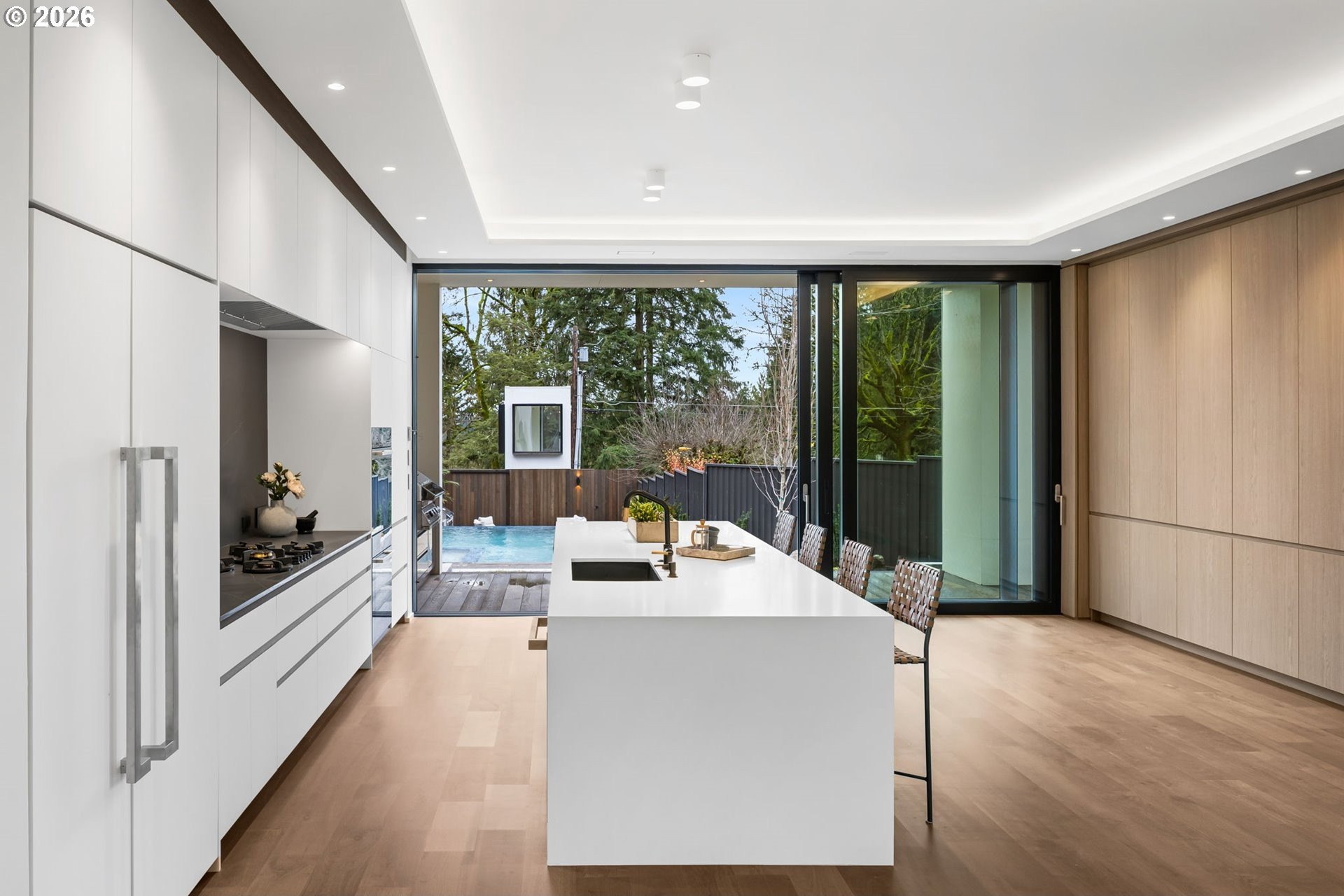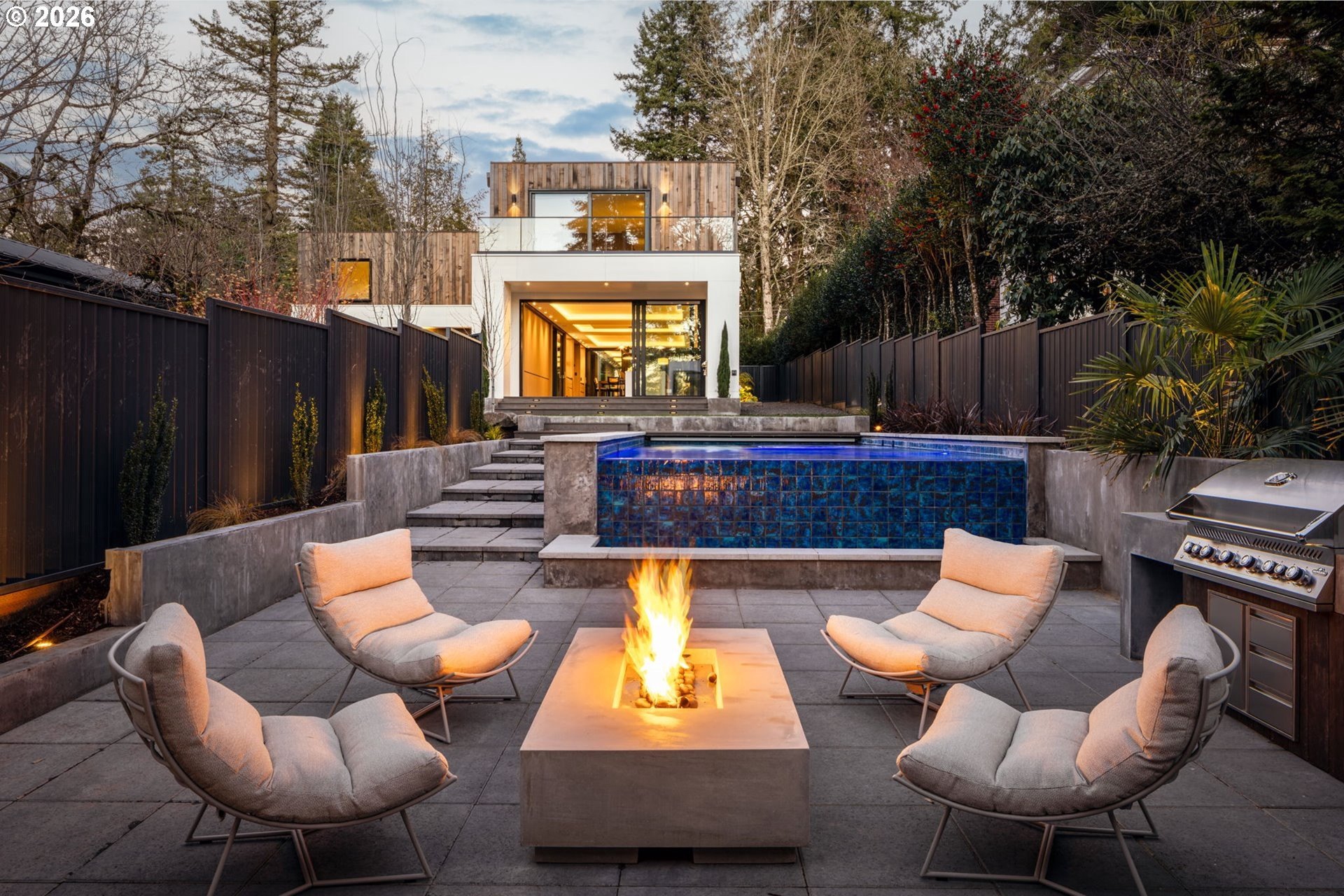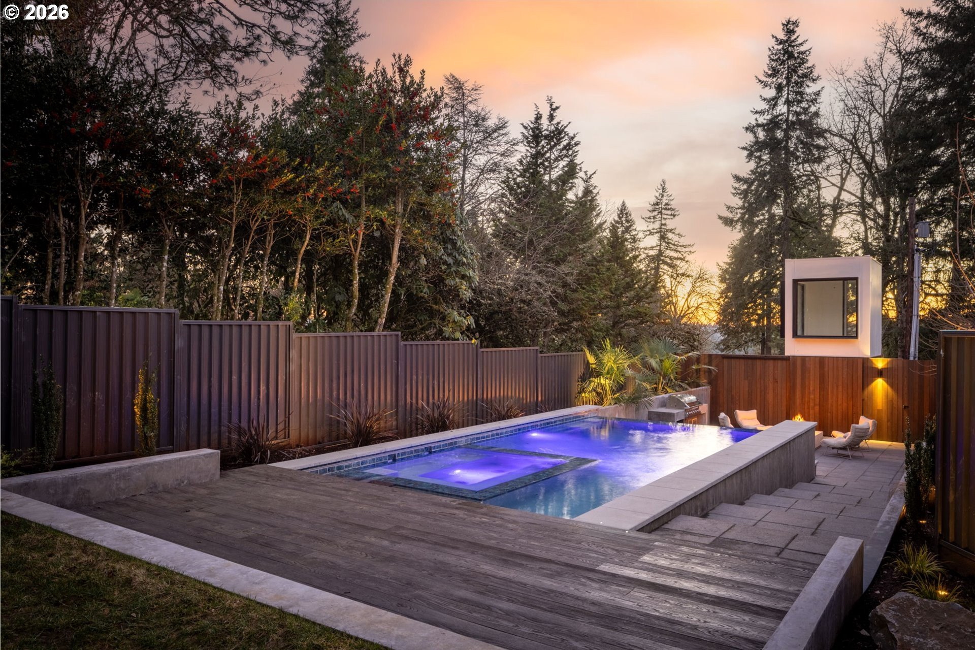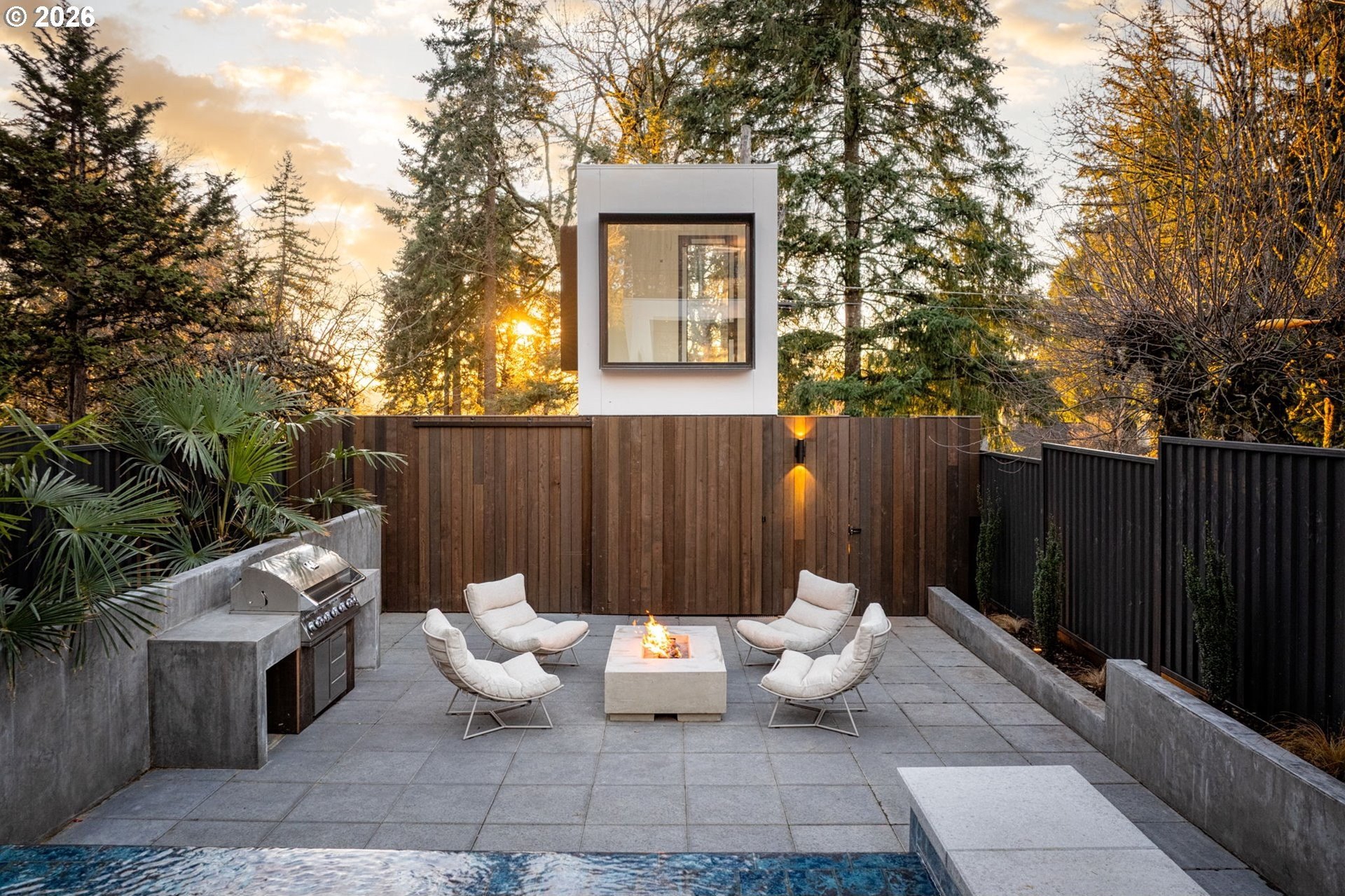 The Eden House is a rare blend of modern architecture, functional innovation, and elevated indoor-outdoor living, ideally located on revered Military Road. This architecturally custom residence features a refined open-concept great room that flows seamlessly to resort-style outdoor entertaining spaces. A striking infinity-edge pool serves as both centerpiece and water feature, cascading to a lower patio with built-in fire pit. Multiple outdoor zones include built-in BBQs on both the kitchen-level deck and lower patio, offering exceptional versatility for entertaining. The high-style chef's kitchen showcases custom inset cabinetry, slab countertops and backsplash, double Miele ovens, and a sleek, integrated Pitt Burner cooktop system, perfectly balancing form and function. The primary suite is a private wellness retreat with steam room and sauna, while the spa-inspired primary shower is fully capped with a skylight-one of five thoughtfully placed skylights that flood the home with natural light and dramatic architectural presence. The upper level includes three guest bedrooms: two connected by a Jack-and-Jill bath and a private en suite guest room. A main-level study with adjacent full bath adds flexibility for work-from-home or guest living. A detached structure enhances the property's versatility, ideal as a yoga studio, art studio, or creative retreat. Architectural integrity is elevated with custom Glo windows and doors and warm clear cedar siding, completing a home inspired by international design and defined by thoughtful craftsmanship and refined modern living.