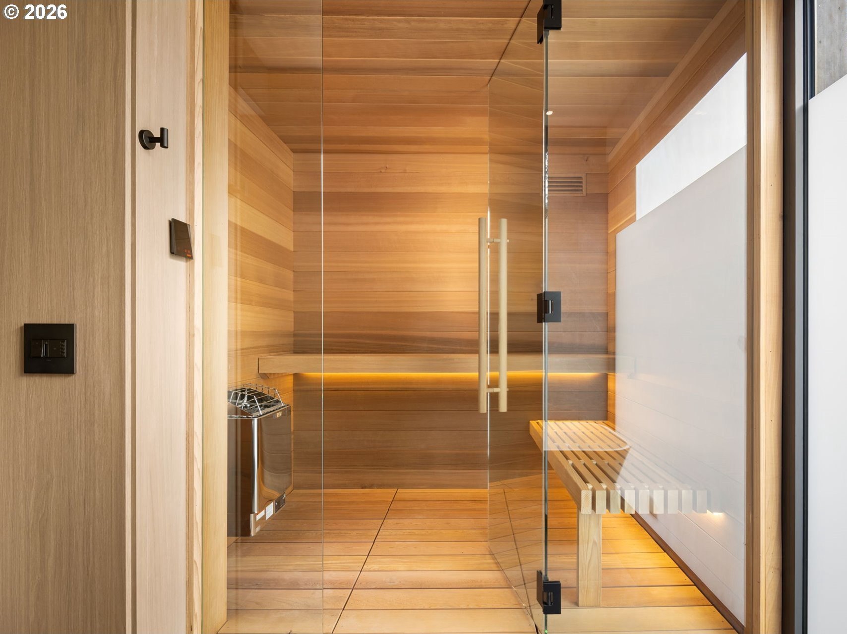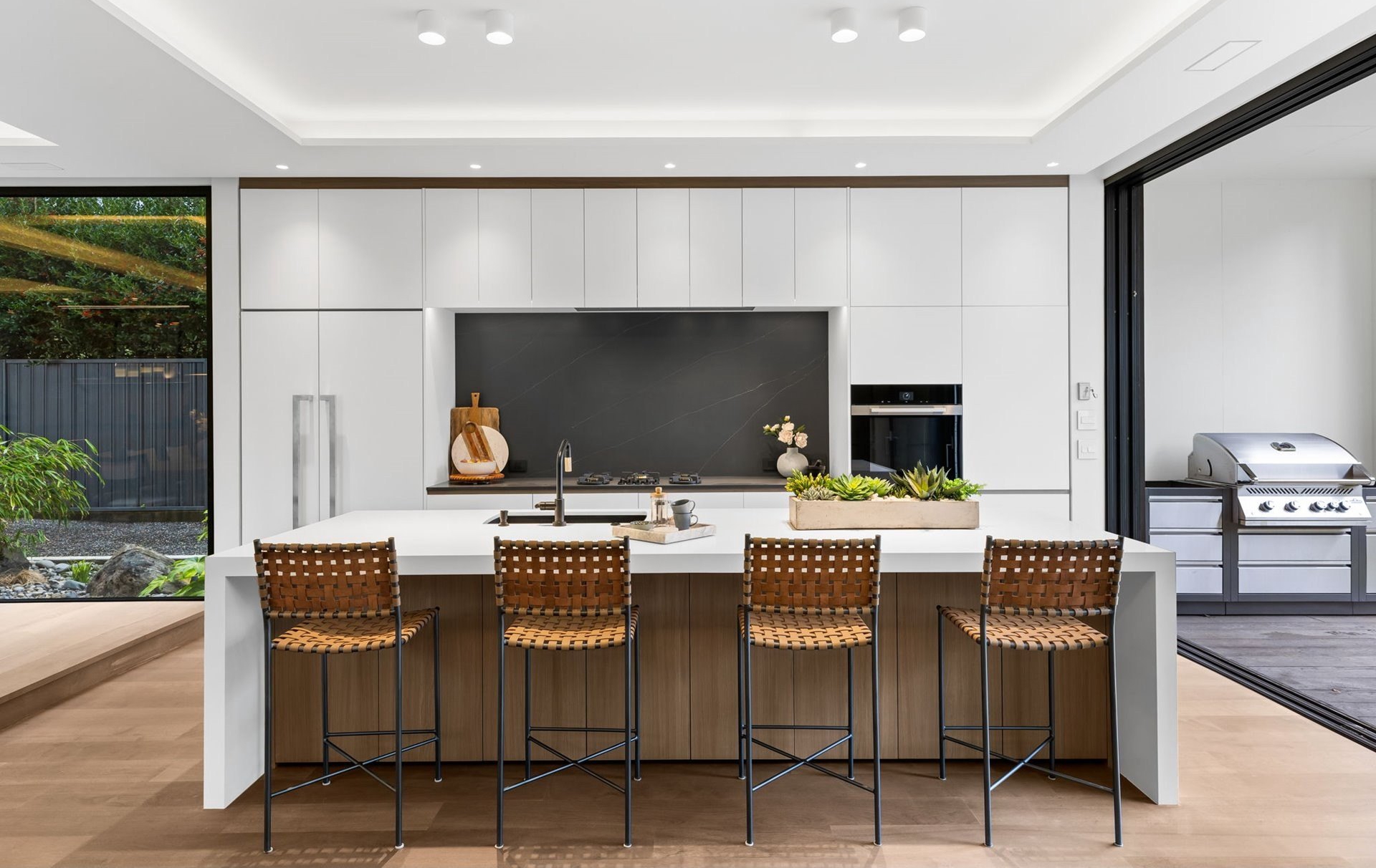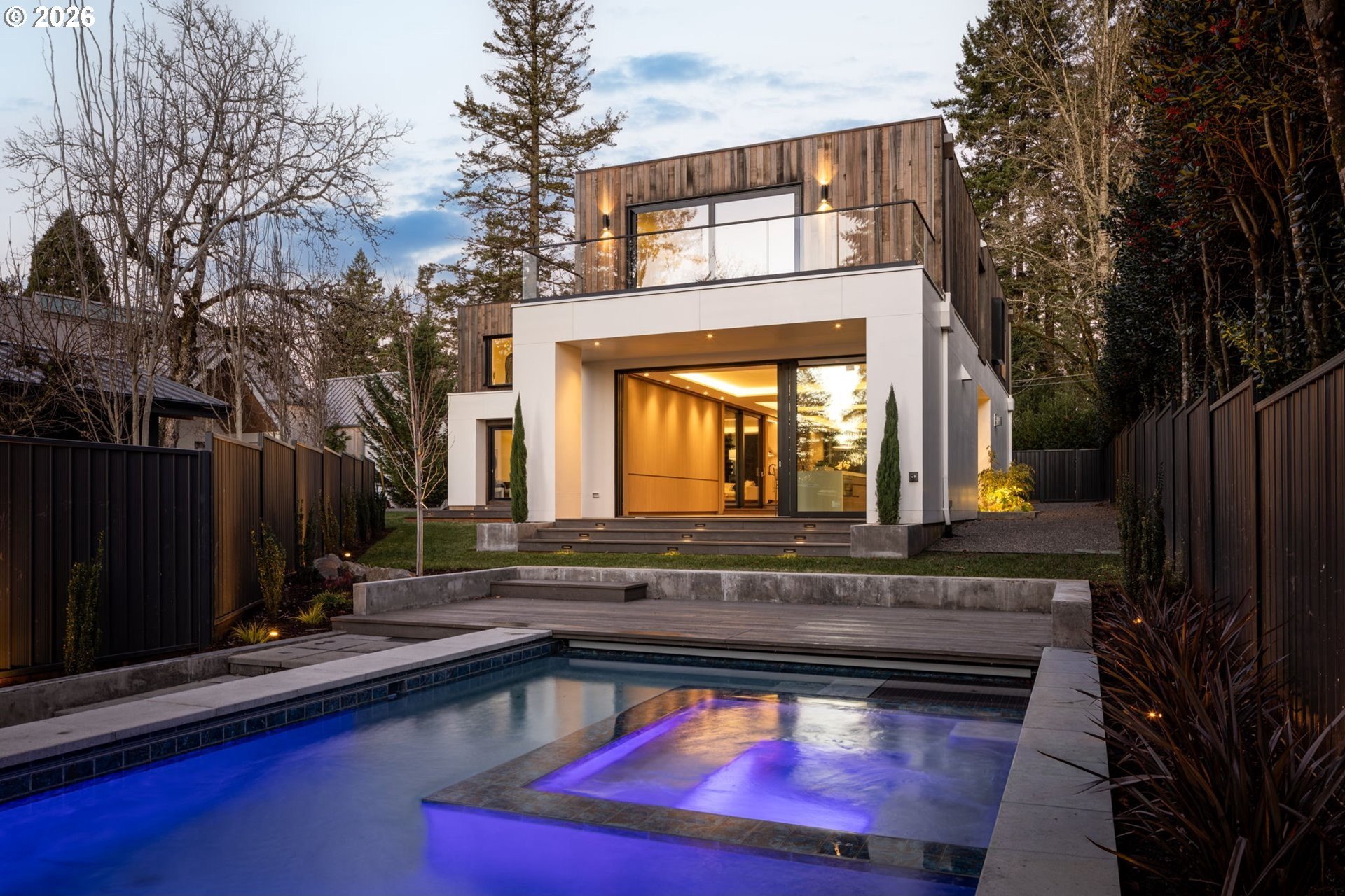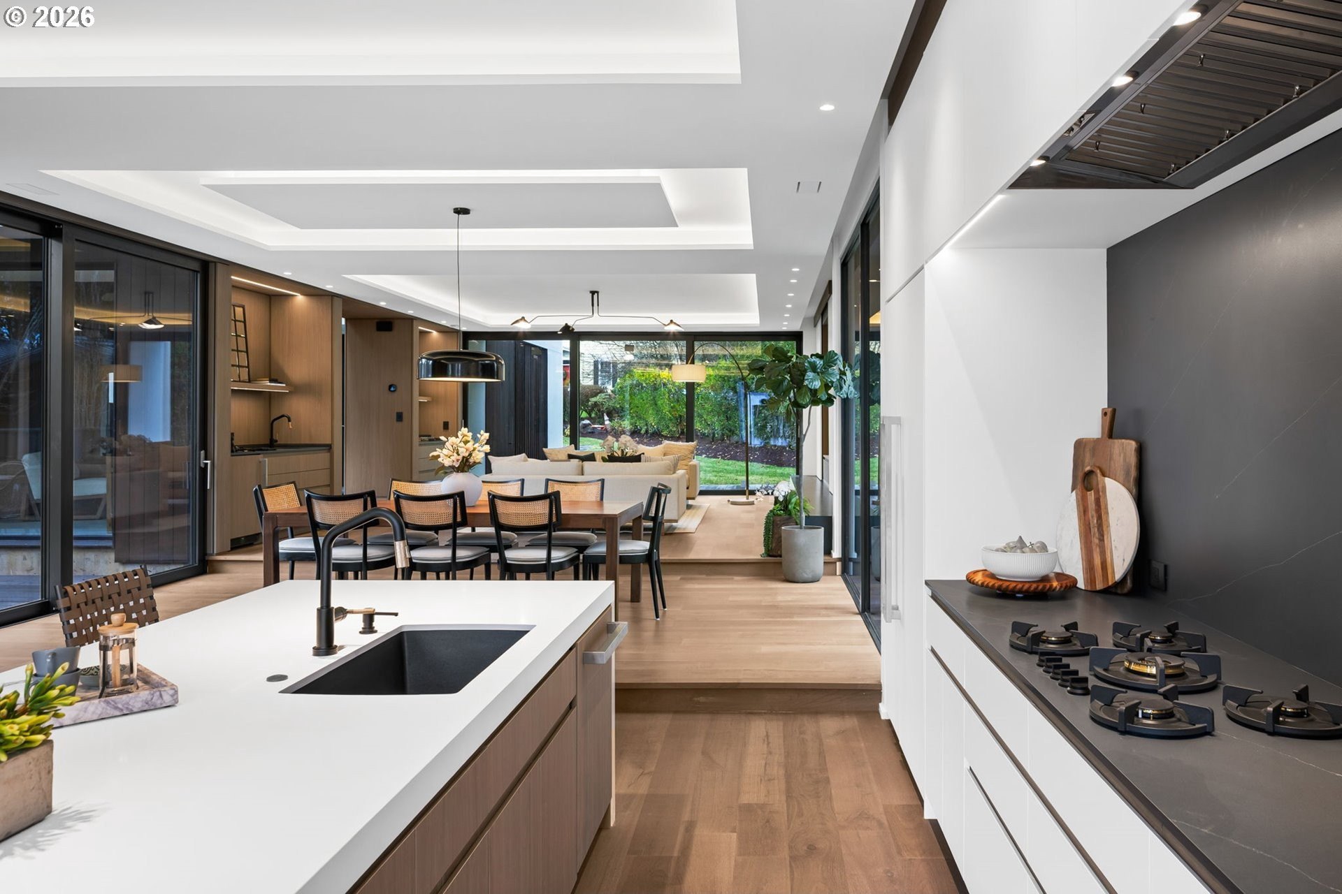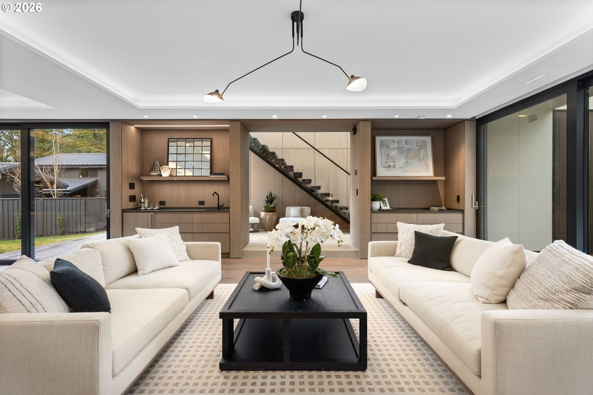 The Eden House is a rare blend of modern architecture, functional innovation, and elevated indoor-outdoor living, ideally located on revered Military Road. This architecturally custom residence features a refined open-concept great room that flows seamlessly to resort-style outdoor entertaining spaces. A striking infinity-edge pool serves as both centerpiece and water feature, cascading to a lower patio with built-in fire pit. Multiple outdoor zones include built-in BBQs on both the kitchen-level deck and lower patio, offering exceptional versatility for entertaining. The high-style chef's kitchen showcases custom inset cabinetry, slab countertops and backsplash, double Miele ovens, and a sleek, integrated Pitt Burner cooktop system, perfectly balancing form and function. The primary suite is a private wellness retreat with steam room and sauna, while the spa-inspired primary shower is fully capped with a skylight-one of five thoughtfully placed skylights that flood the home with natural light and dramatic architectural presence. The upper level includes three guest bedrooms: two connected by a Jack-and-Jill bath and a private en suite guest room. A main-level study with adjacent full bath adds flexibility for work-from-home or guest living. A detached structure enhances the property's versatility, ideal as a yoga studio, art studio, or creative retreat. Architectural integrity is elevated with custom Glo windows and doors and warm clear cedar siding, completing a home inspired by international design and defined by thoughtful craftsmanship and refined modern living.