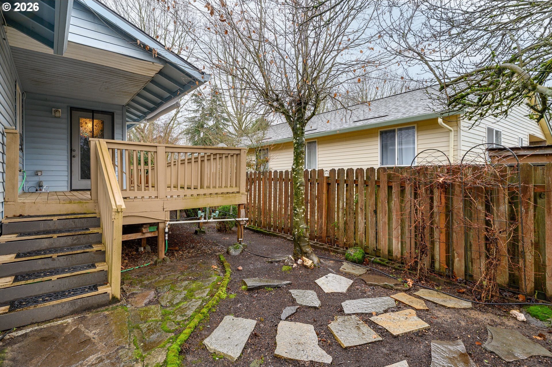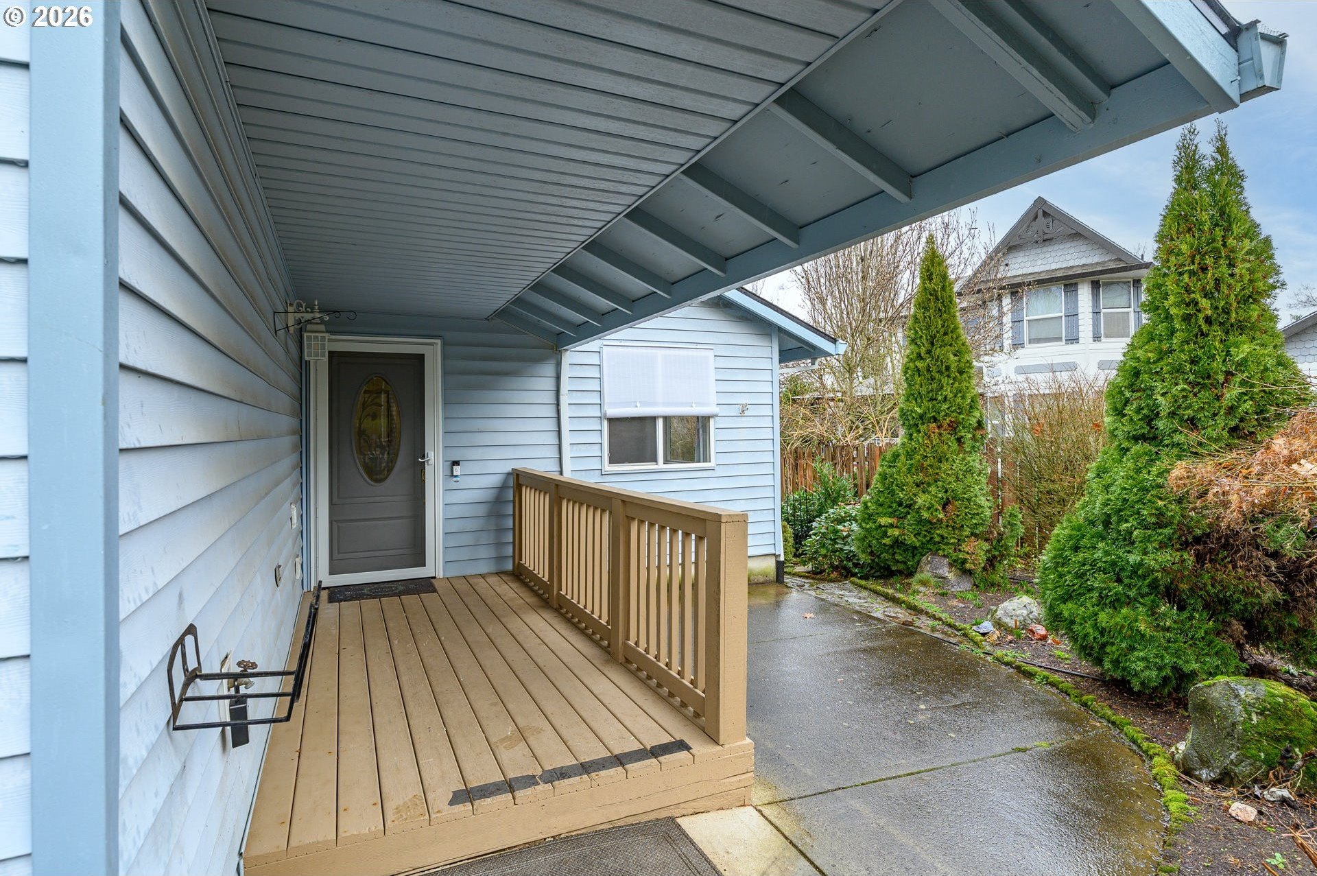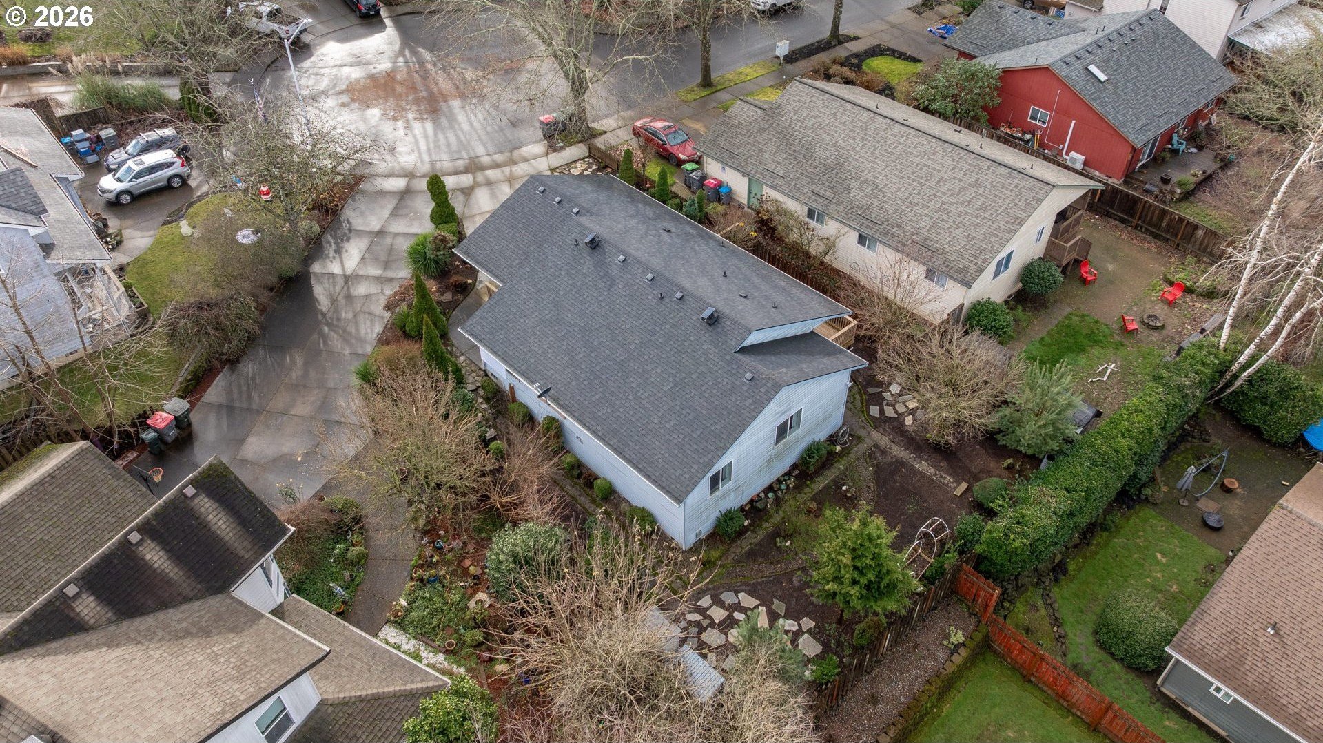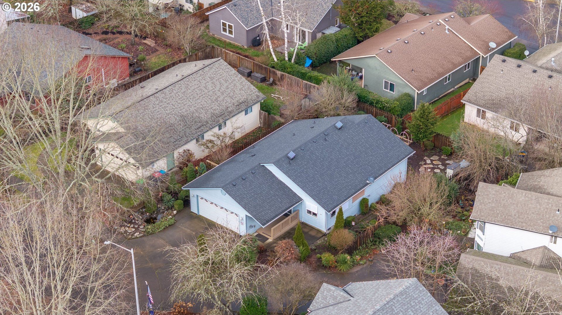 Located at the end of a peaceful cul-de-sac, this 1,216 sq ft single-level home offers privacy and a functional, easy-living layout. The open floor plan creates a welcoming flow for everyday living and provides an opportunity for a new owner to add their own personal touches. Recent updates include a newer roof with gutter guards and a new living room window that fills the space with natural light. The washer and dryer, approximately three years old, and the refrigerator are included. Step outside to a covered deck overlooking a landscaped, low-maintenance yard with a calming water feature, an ideal spot to relax. Enjoy the benefits of cul-de-sac living with minimal traffic and added privacy. The neighborhood offers access to the Westside Pedestrian Trail, featuring a 1.31-mile walking path to the park.