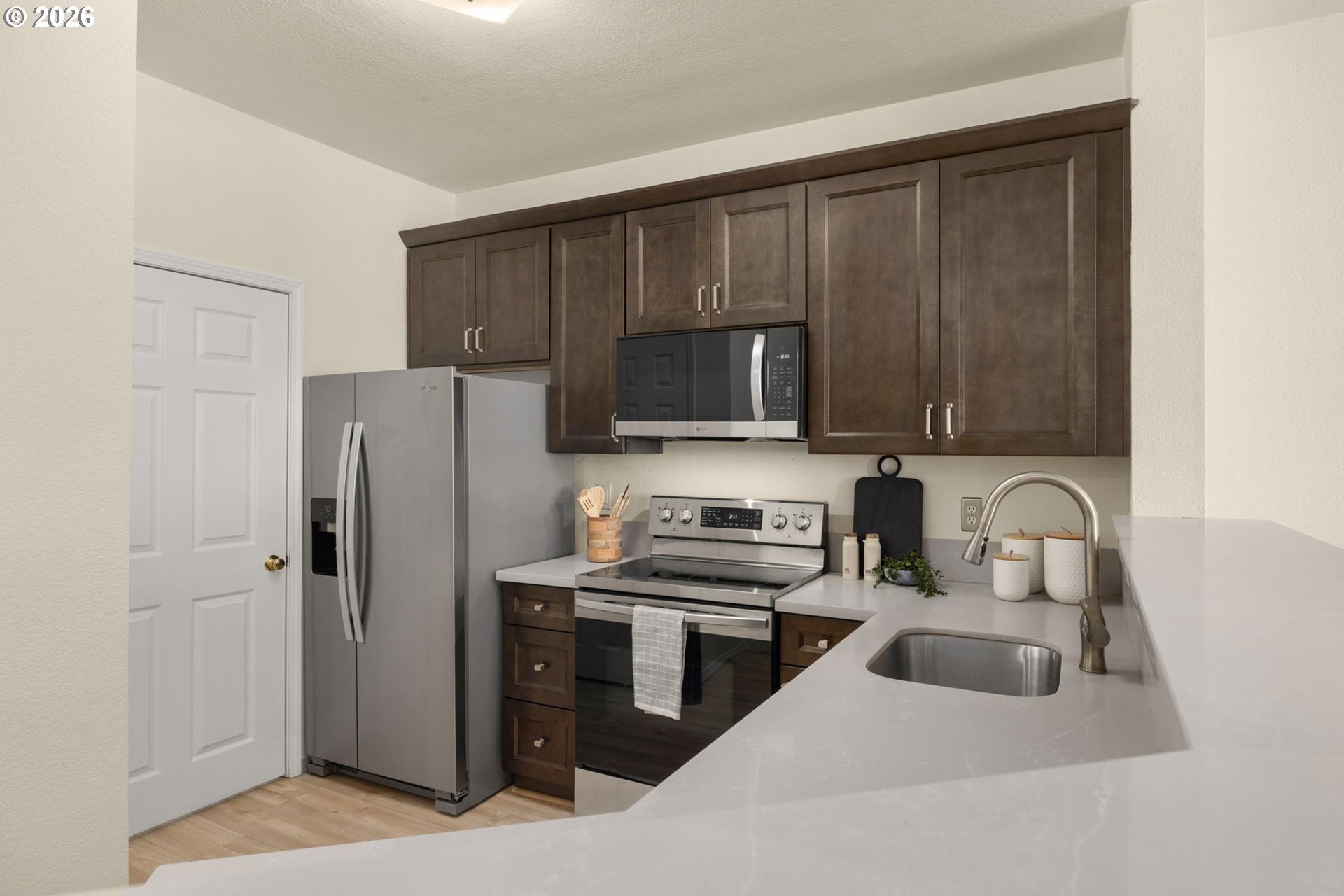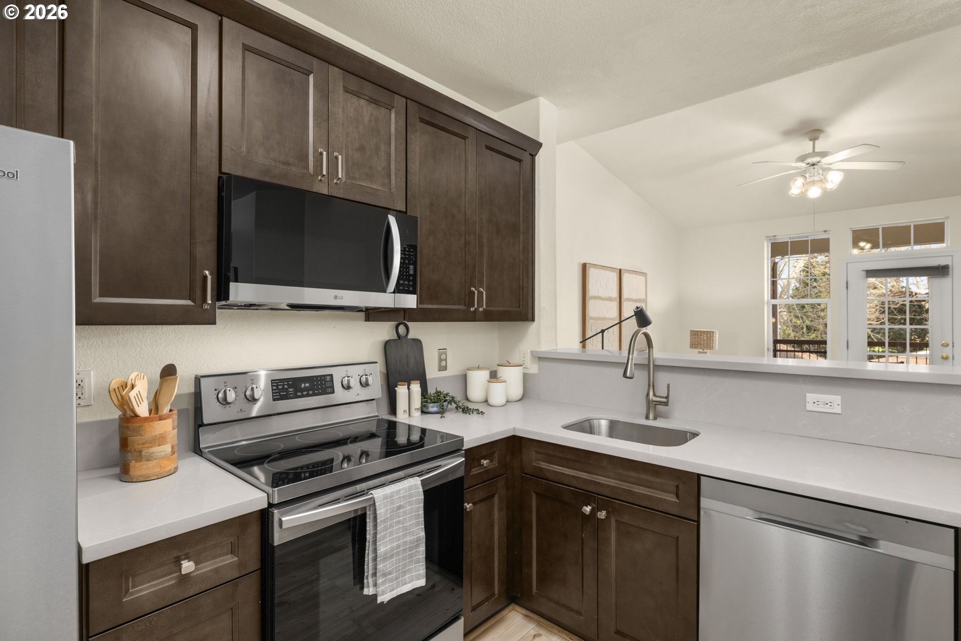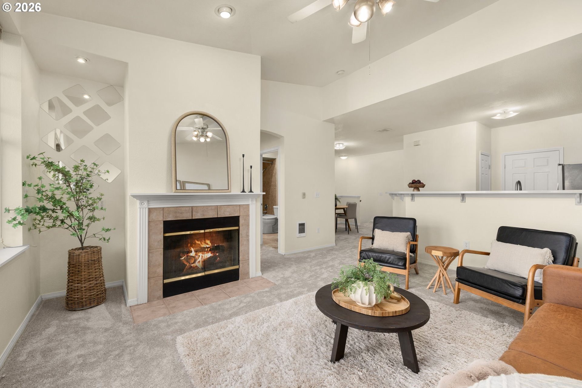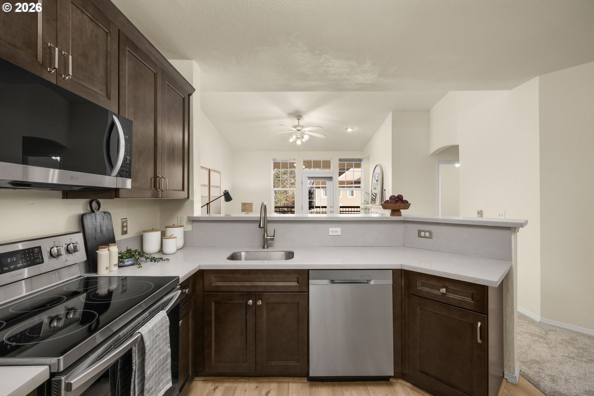 Live the coveted Orenco Station lifestyle in this beautifully updated and maintained one bedroom, one bath condominium located within walking distance to all the wonderful conveniences the Orenco Station/Platform District has to offer. This lovely light and bright unit has been tastefully updated with new carpet & paint throughout the home. The kitchen was recently updated with stylish cabinetry, beautiful quartz counter tops, stainless appliances, pantry, and laminate flooring. Relax in front of your own crackling wood burning fireplace in the spacious vaulted living room or retire to the ample bedroom retreat and enjoy the large light-dousing bay windows. The bathroom has an updated vanity, oversized soaking tub, tile flooring and closet for linens & towels. Enjoy sipping a cup of morning coffee while greeting your neighbors from your covered balcony or access more storage in your outdoor closet. The deep attached one car garage has an additional storage area and an extra covered carport spot, while the nearby visitor parking spots are convenient for visiting friends and family. This unit is perfectly nestled in a nice quiet location within this professionally landscaped and well-managed community - just a short walk to the clubhouse, and swimming pool, as well as neighboring dog park, restaurants, the seasonal Orenco Farmer's Market, Intel campus and the Orenco Max stop. Once you've experienced this Orenco Station lifestyle, nowhere else will do...