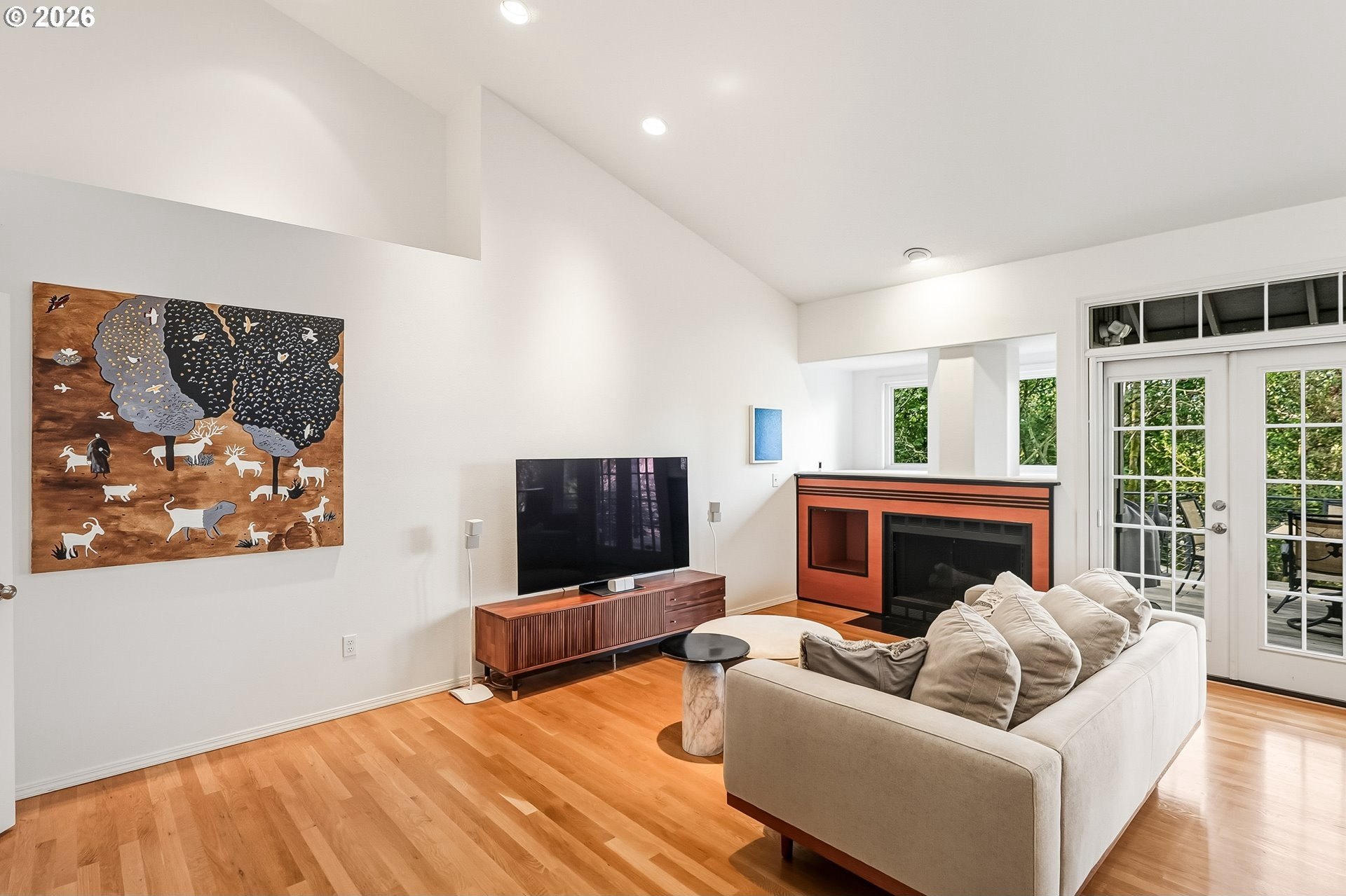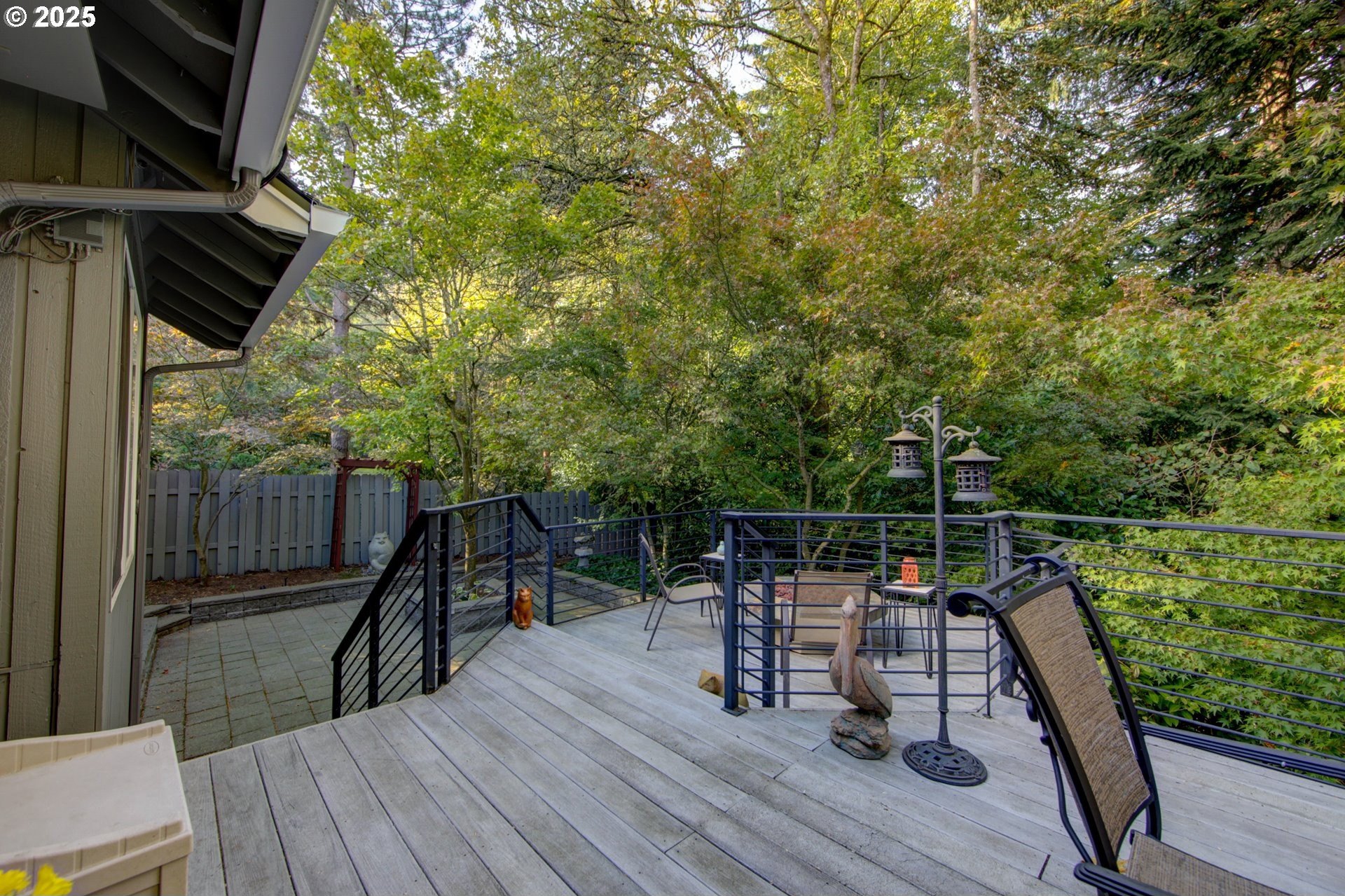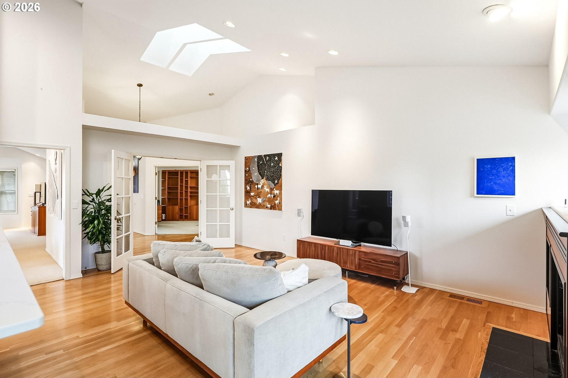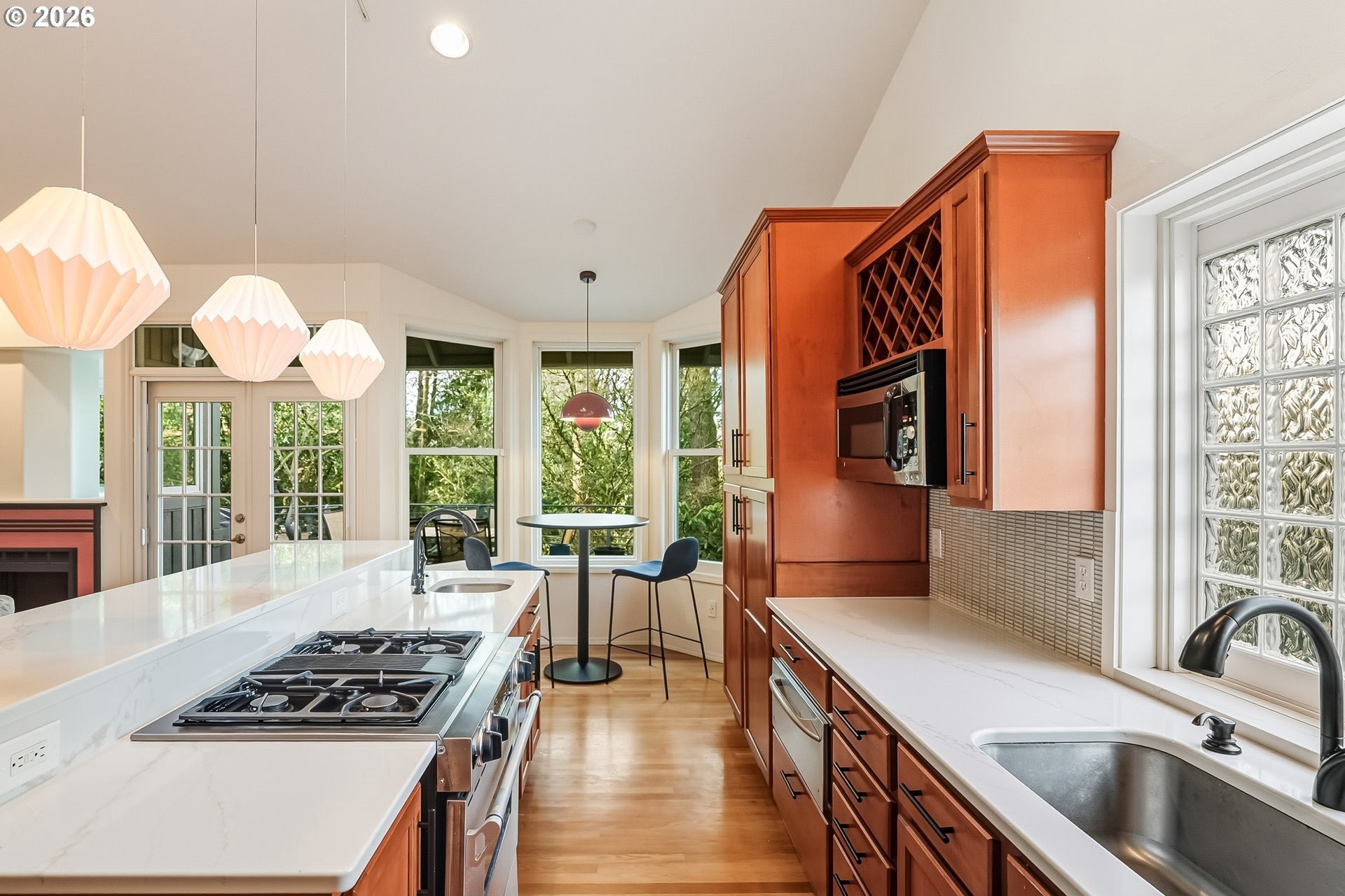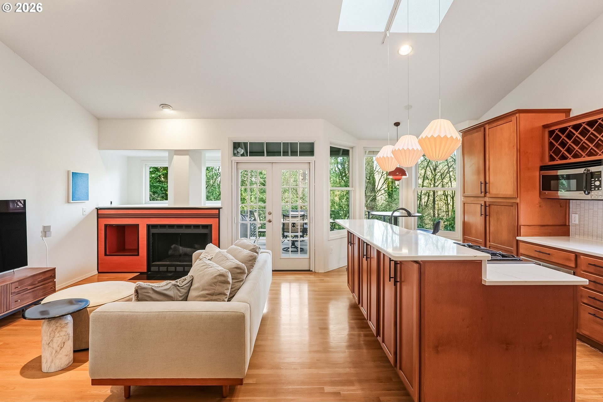 Expansive single-level home offering high ceilings, abundant natural light, and a private green space backdrop located on over a quarter-acre. Exceptionally maintained and thoughtfully updated, this home boasts original hardwood floors and skylights that bring light into every corner of the home. The chef's kitchen is designed for entertaining with new quartz countertops and tile backsplash (2021), an expansive island with integrated storage and prep sink, food-warming cabinet, premium stainless steel appliances including JennAir gas range, built-in microwave, and a cozy breakfast nook. Recent improvements include new Andersen windows and skylights, custom up-down window treatments, updated lighting fixtures, a new solar tube, and newer interior paint. The primary suite features vaulted ceilings and a spacious ensuite with a large walk-in closet, walk-in shower, jetted soaking tub, and double sinks with granite countertops. Two additional bedrooms offer flexibility, with one ideal for a home office or guest space. The living room showcases hardwood floors, a gas fireplace, high ceilings with a skylight, and French doors that open to the backyard. Outside, a multi-level deck and custom paver patio create an exceptionally private setting surrounded by mature trees and fully fenced grounds, backing directly to green space. All of this is just minutes from Bridgeport Village, parks, and major freeways, offering convenience without sacrificing privacy.