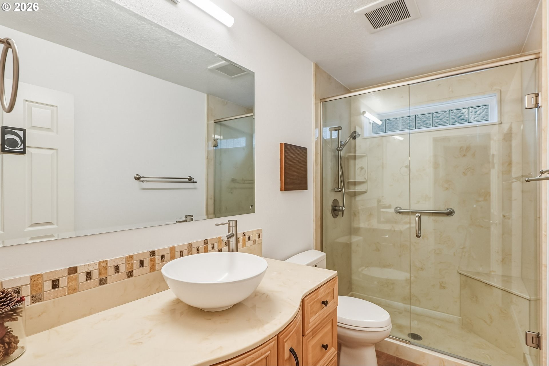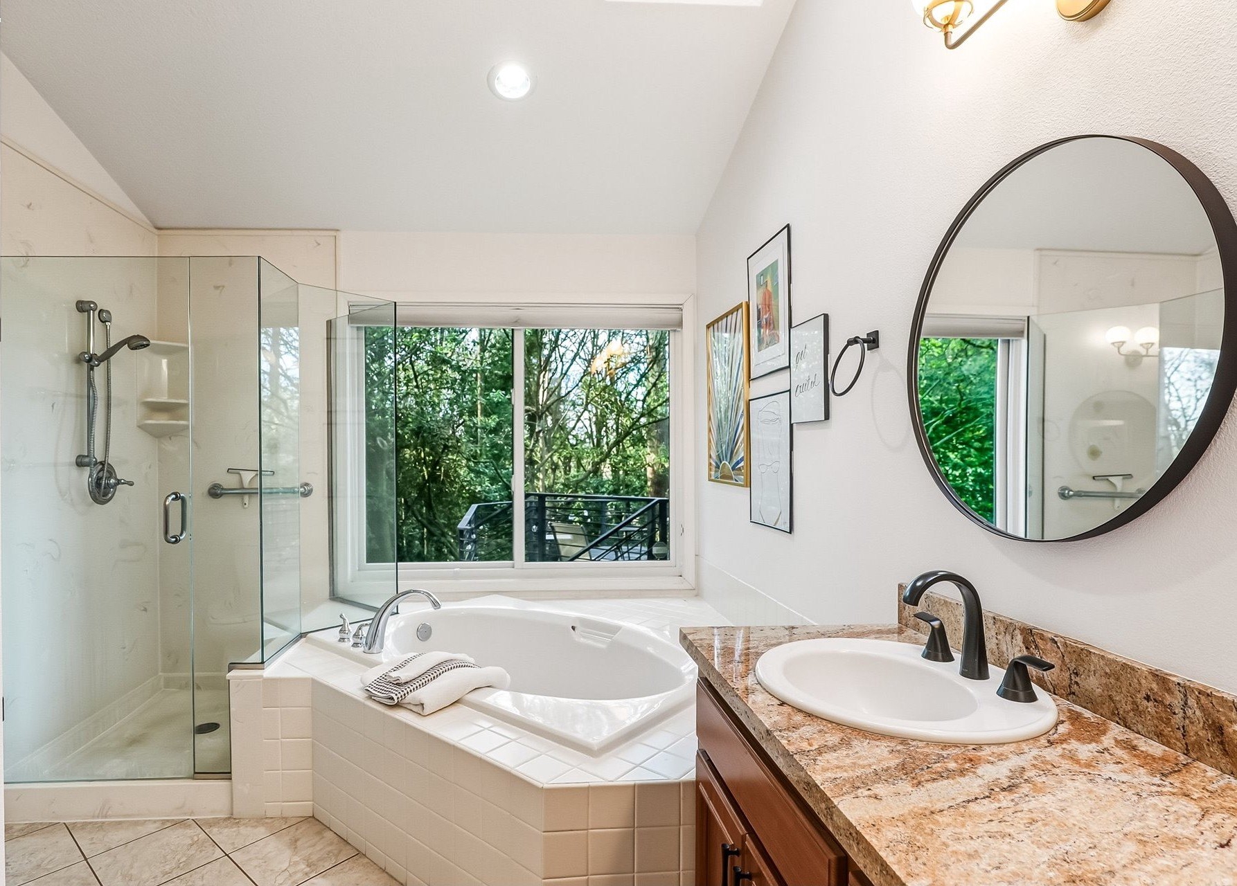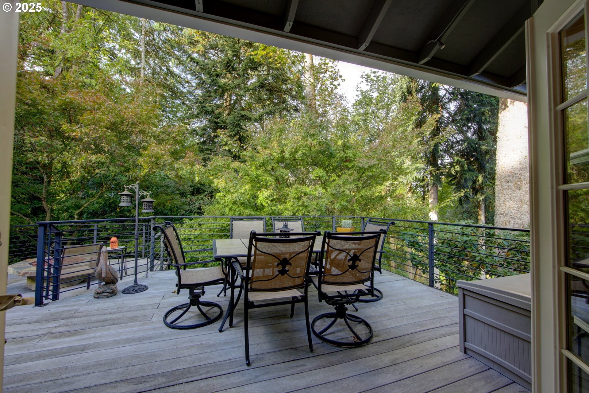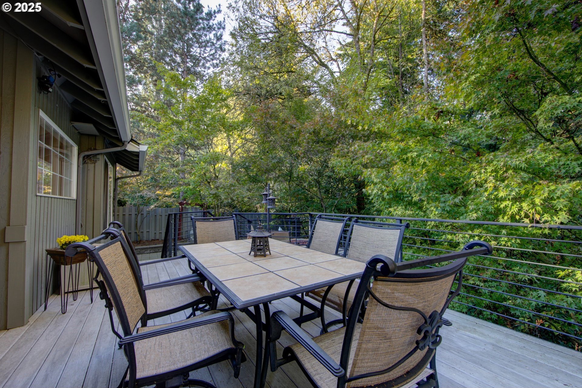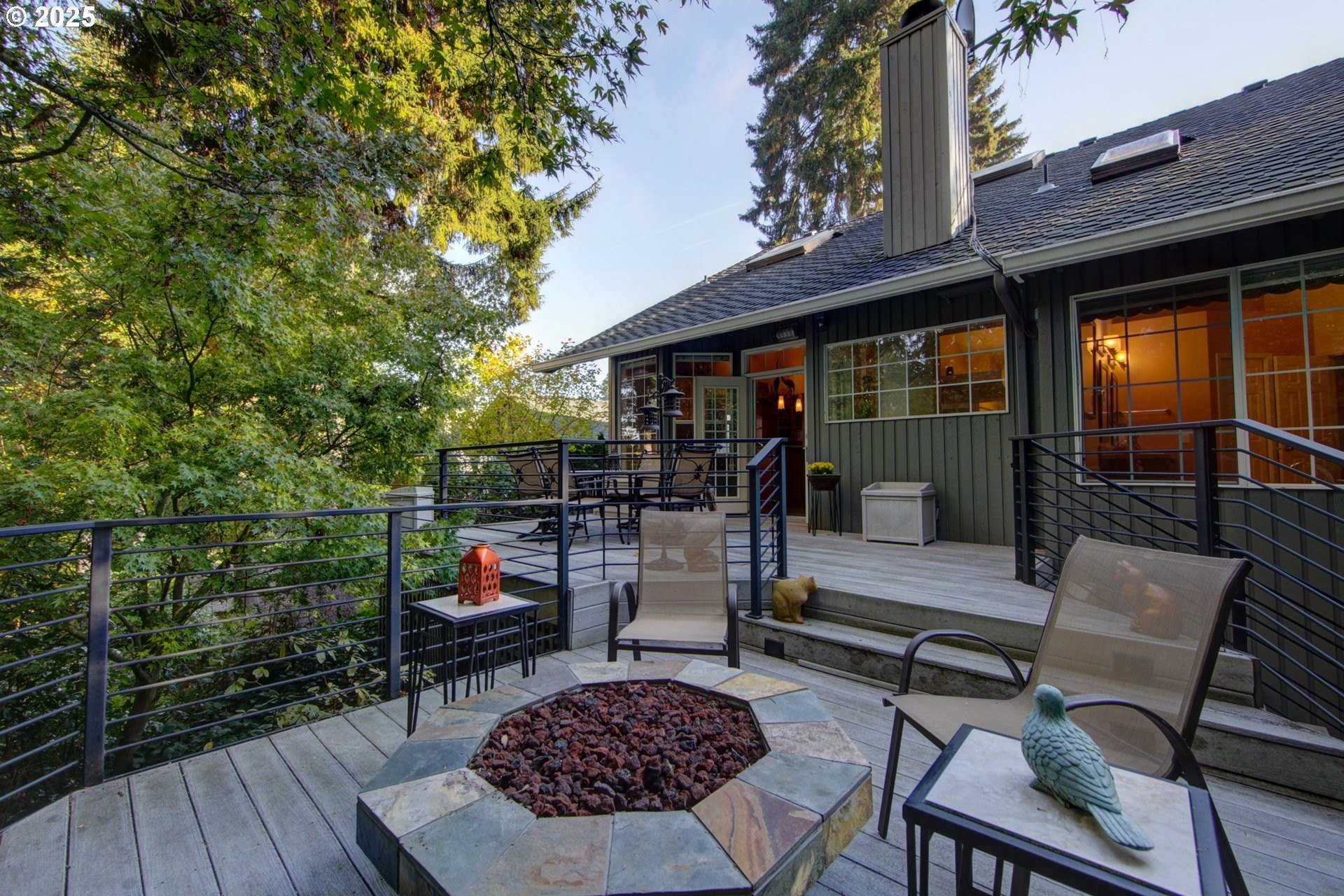 Expansive single-level home offering high ceilings, abundant natural light, and a private green space backdrop located on over a quarter-acre. Exceptionally maintained and thoughtfully updated, this home boasts original hardwood floors and skylights that bring light into every corner of the home. The chef's kitchen is designed for entertaining with new quartz countertops and tile backsplash (2021), an expansive island with integrated storage and prep sink, food-warming cabinet, premium stainless steel appliances including JennAir gas range, built-in microwave, and a cozy breakfast nook. Recent improvements include new Andersen windows and skylights, custom up-down window treatments, updated lighting fixtures, a new solar tube, and newer interior paint. The primary suite features vaulted ceilings and a spacious ensuite with a large walk-in closet, walk-in shower, jetted soaking tub, and double sinks with granite countertops. Two additional bedrooms offer flexibility, with one ideal for a home office or guest space. The living room showcases hardwood floors, a gas fireplace, high ceilings with a skylight, and French doors that open to the backyard. Outside, a multi-level deck and custom paver patio create an exceptionally private setting surrounded by mature trees and fully fenced grounds, backing directly to green space. All of this is just minutes from Bridgeport Village, parks, and major freeways, offering convenience without sacrificing privacy.