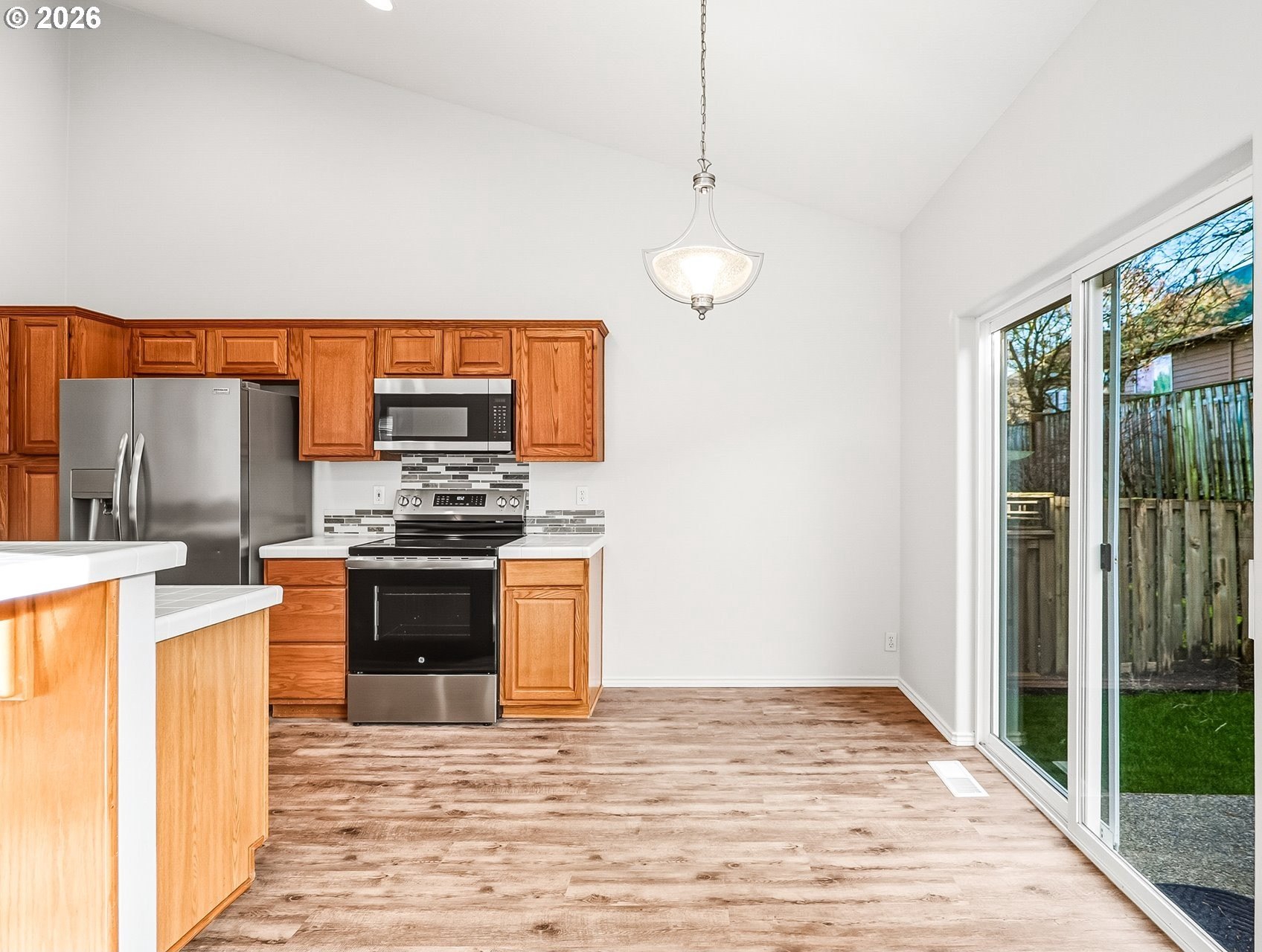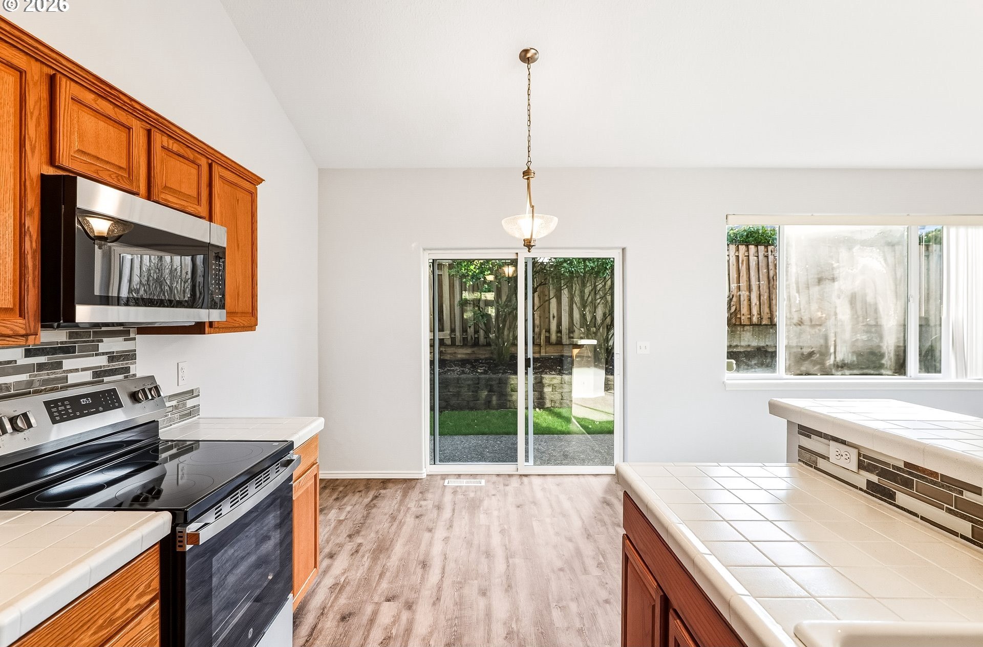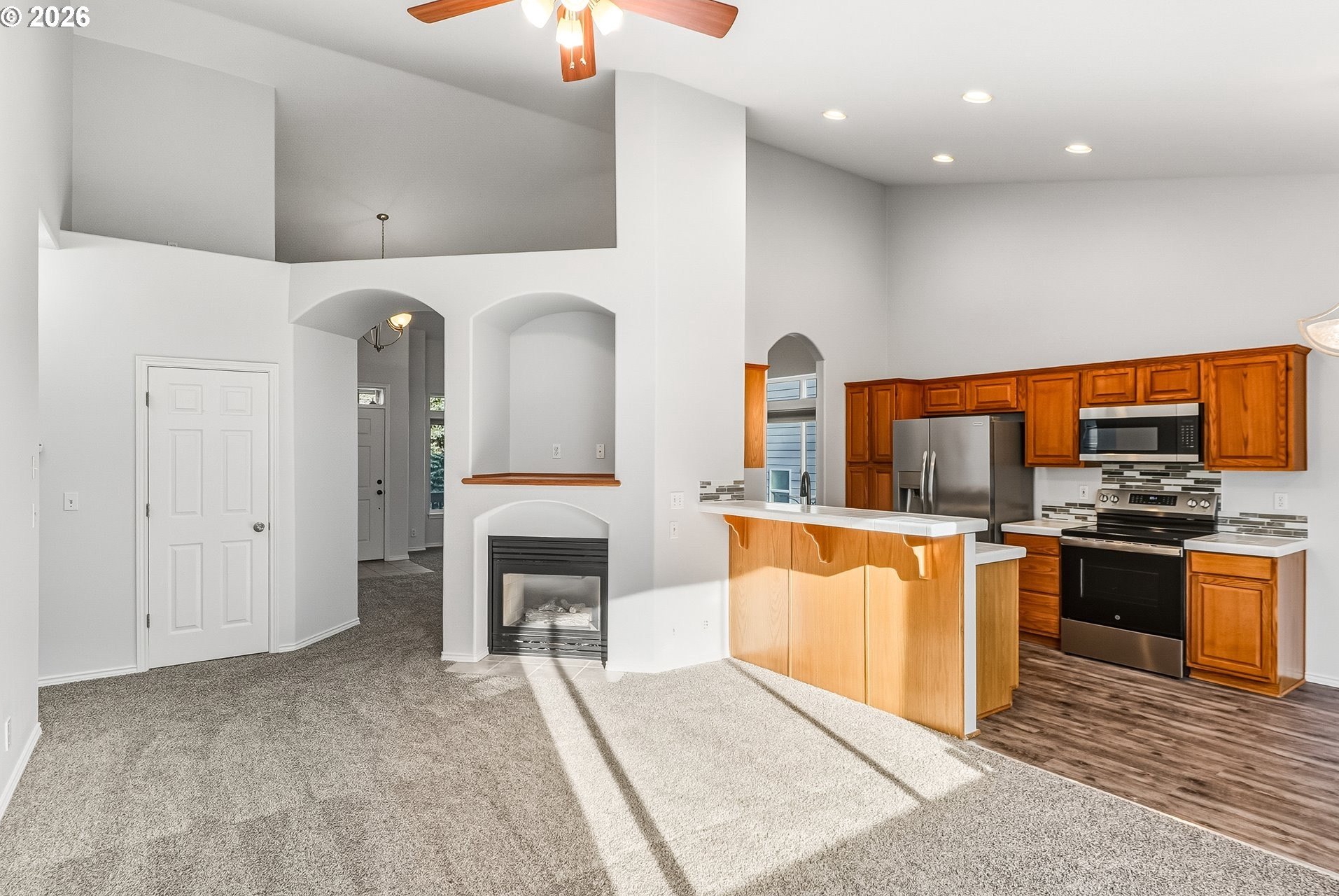 Single-level living in the highly coveted Woodhaven neighborhood. This well cared for home offers high ceilings throughout and a thoughtful layout designed for comfort and everyday living. Recent updates include new carpet, fresh interior paint, a new range, and a newer roof. The living room features vaulted ceilings and a cozy double-sided fireplace that connects seamlessly to the family room, creating a warm and inviting great room feel. The kitchen includes tile backsplash, an eat bar, stainless steel appliances, built-in microwave, disposal, and a dining nook with vaulted ceilings and sliding glass doors to the backyard. The family room offers additional living space with vaulted ceilings, ceiling fan, and shared fireplace, ideal for relaxing or gathering. The primary bedroom features vaulted ceilings, double sinks, a walk-in shower, and a walk-in closet with organizer. Two additional bedrooms provide flexibility, including one with a walk-in closet and closet organizer. Additional highlights include A/C, dedicated laundry with storage, and a fully fenced backyard with lawn, patio, and a large porch, perfect for outdoor enjoyment. Conveniently located near top-rated schools, parks, trails, and just minutes from Old Town Sherwood.