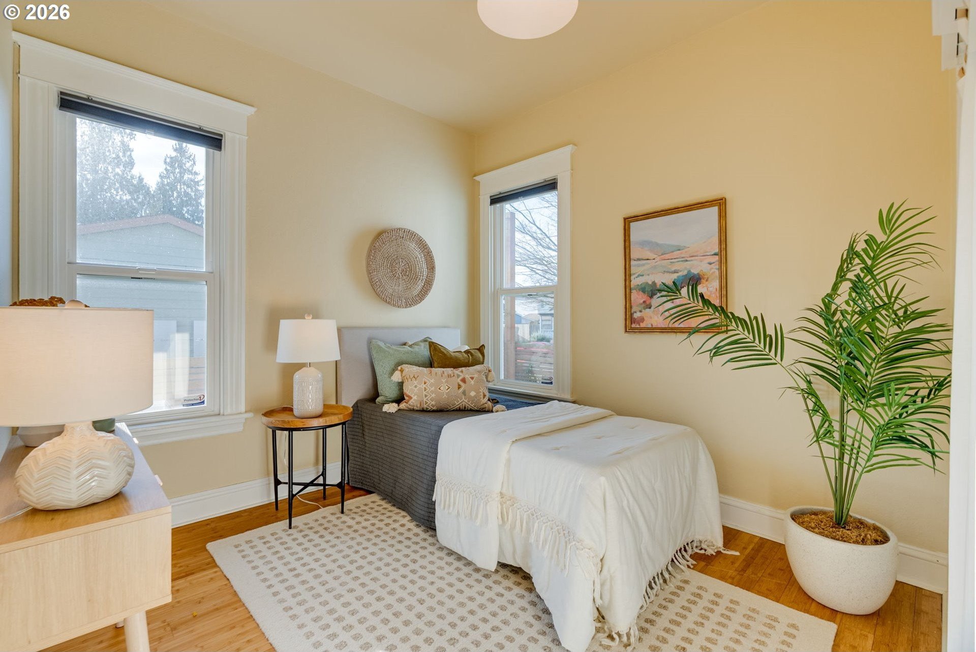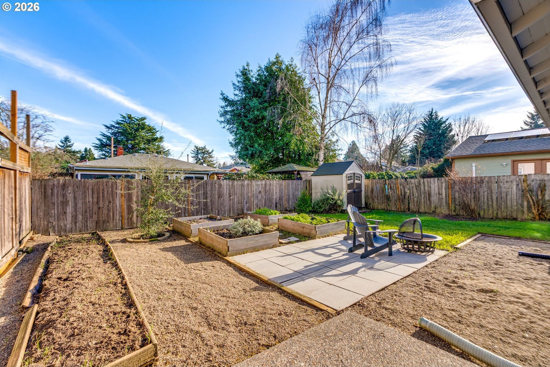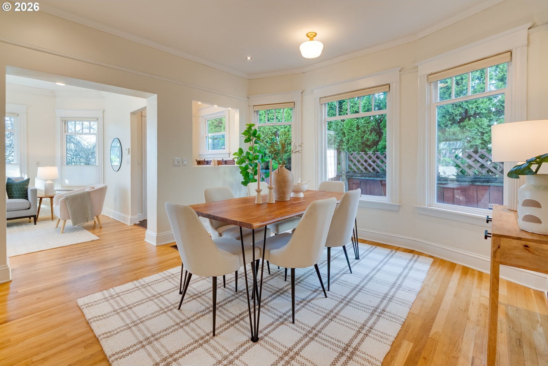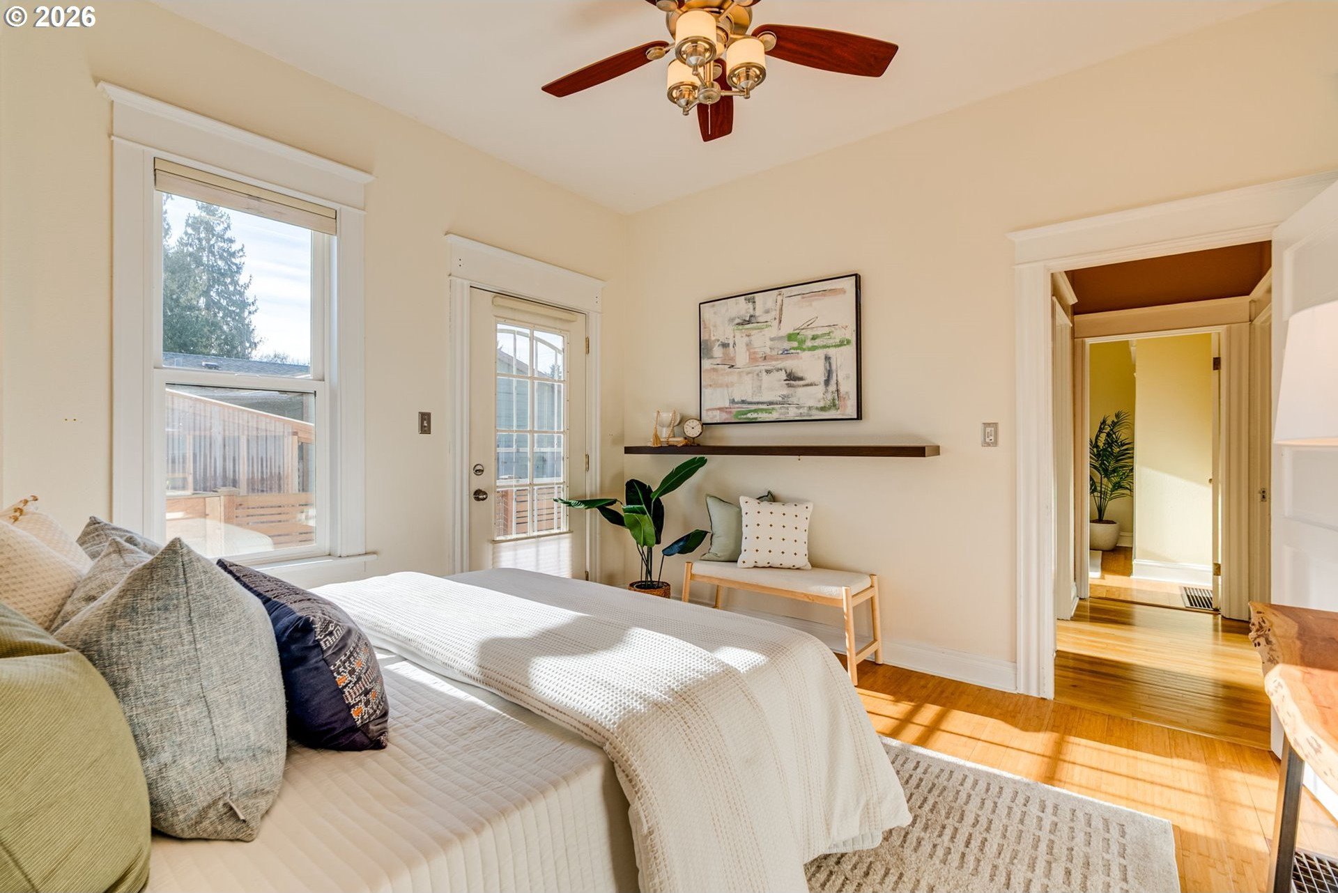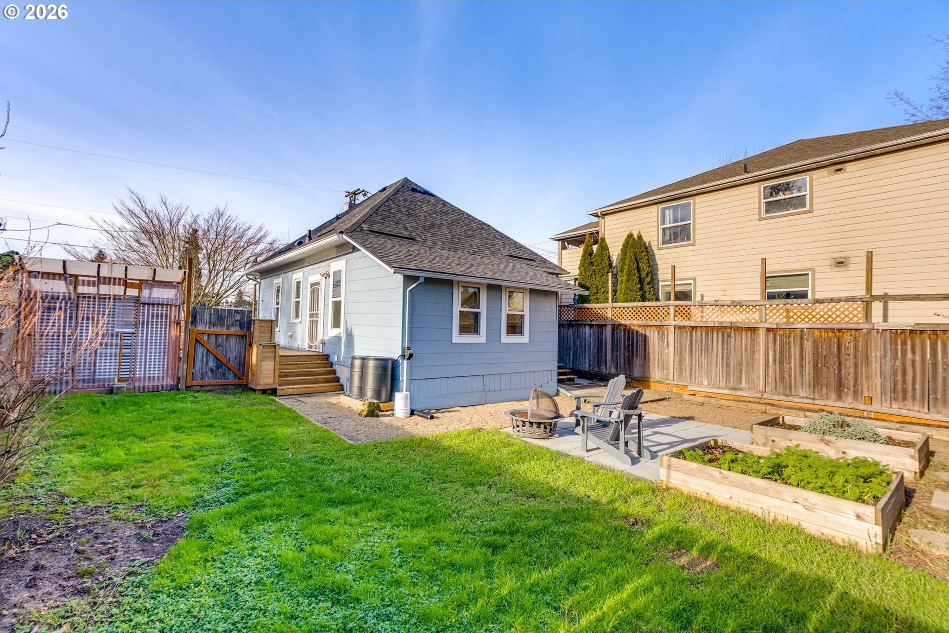 Welcome to this charming, updated, and cozy 1903 St. Johns home. A brick path framed by mature plantings guides you to the front porch, and a formal tiled entry invites you to hang your coat and stay a while. Warm wood floors, high ceilings, an exposed brick reveal, and a subtle architectural bay projection wall bring character to the living room, which also opens to a sunny south-facing deck that extends the living space. Filtered light through the mature maple tree out front is a delight through three seasons. Wood floors and original moulding continue throughout, with a large dining room featuring another bay projection wall. The connected floor plan balances openness with definition and allows for a lovely flow of natural light. The modernized kitchen offers ample counter space, glass cabinets, great storage, a double sink, and stainless steel appliances. The spacious primary bedroom includes a walk-in closet and direct access to the south-facing deck, and the updated bathroom is generous in size. The basement provides abundant storage and space for hobbies, while a roomy unfinished attic presents additional potential. Outside, enjoy a newer patio designed for summer dining, cozy fires, gardening, or simply lounging on sunny days, along with a recently tiled back porch. The raised beds are ready for your urban garden. Notable improvements include a brand new 2025 roof with transferable warranty, newer water heater, modern double-pane windows, and high-efficiency gas furnace with central AC for year-round comfort. Conveniently close to Pier Park, Forest Park access, St. Johns Farmers Market, downtown St. Johns, and multiple grocery options, this is an exceptionally walkable and nature-connected location.