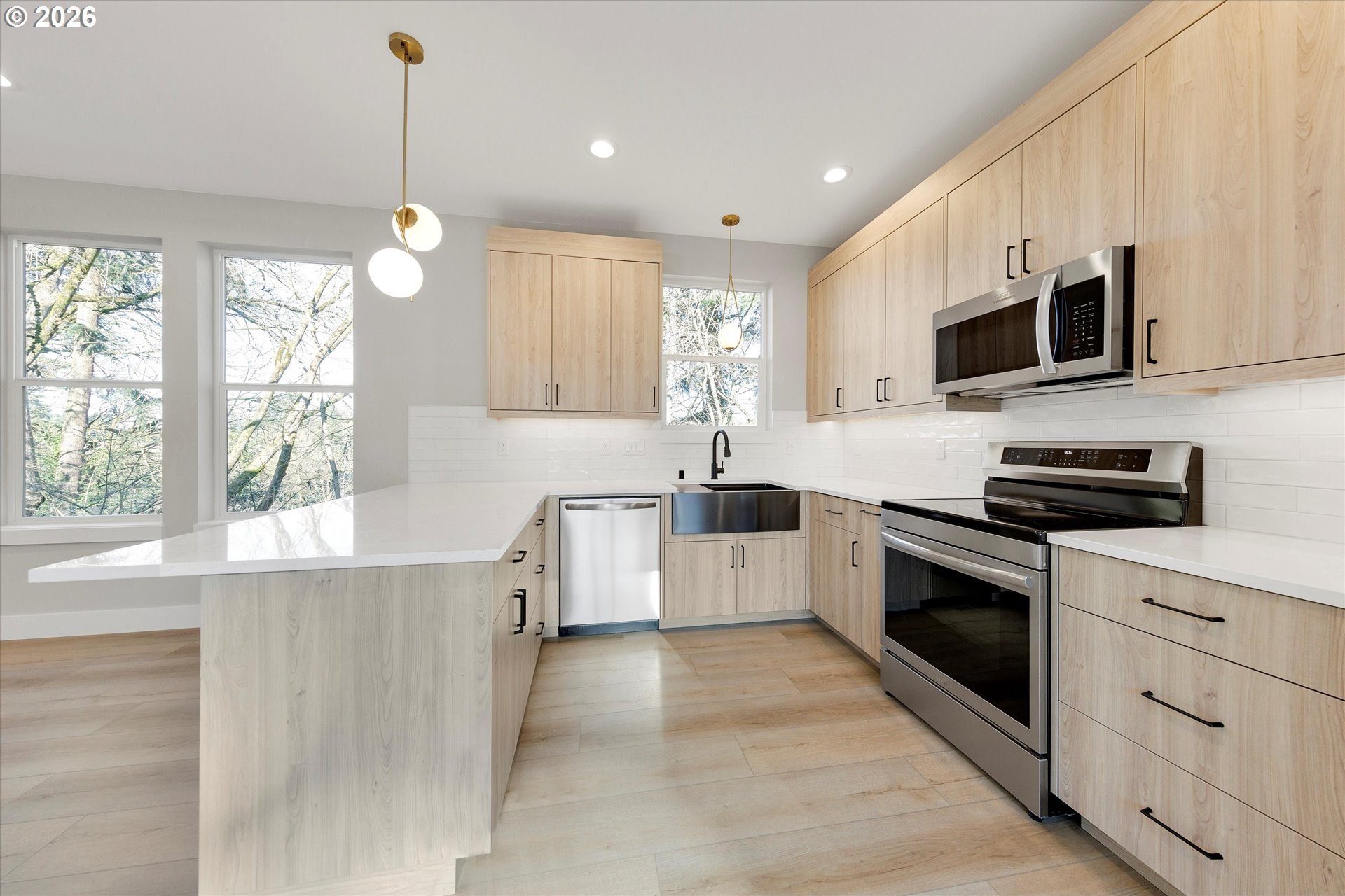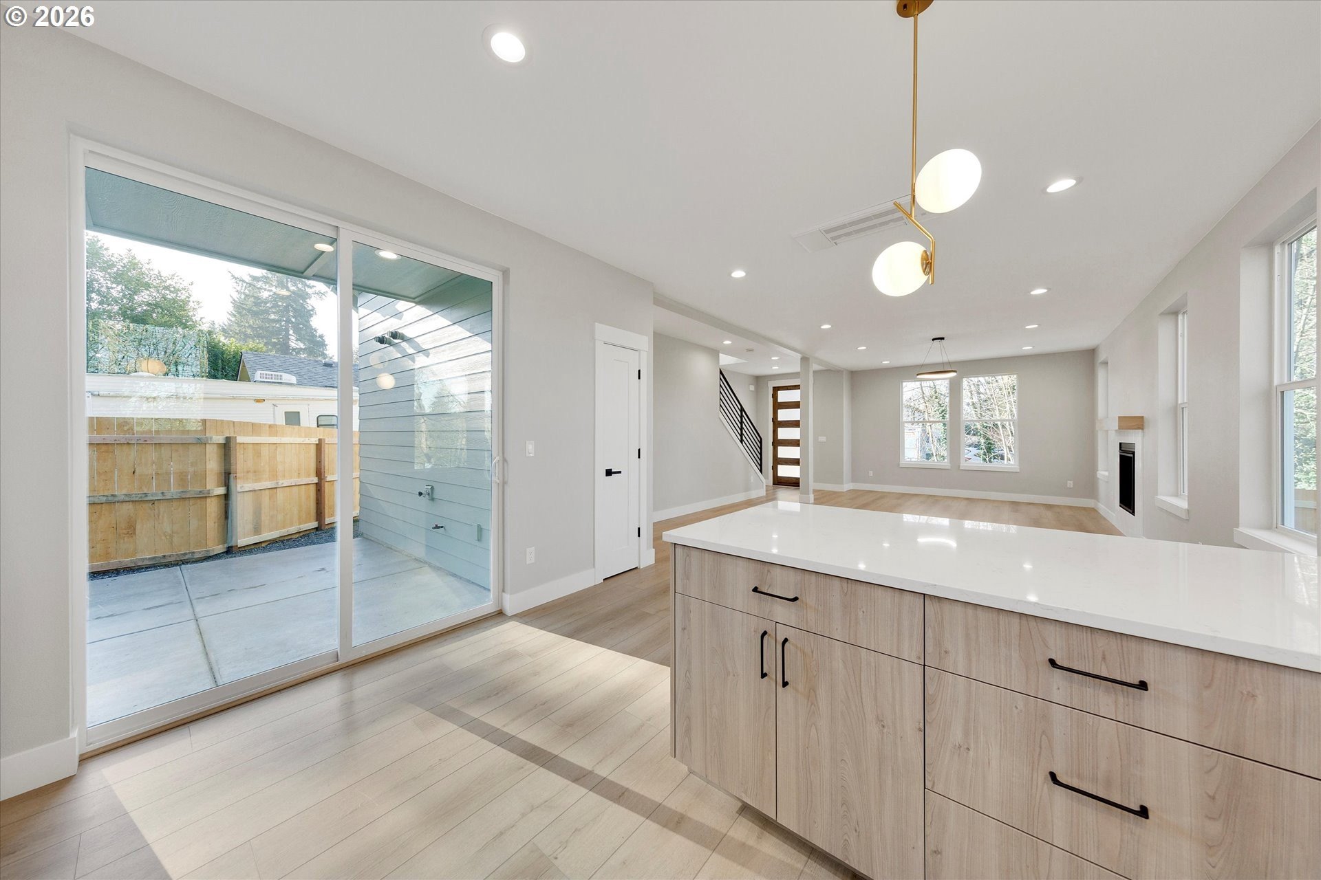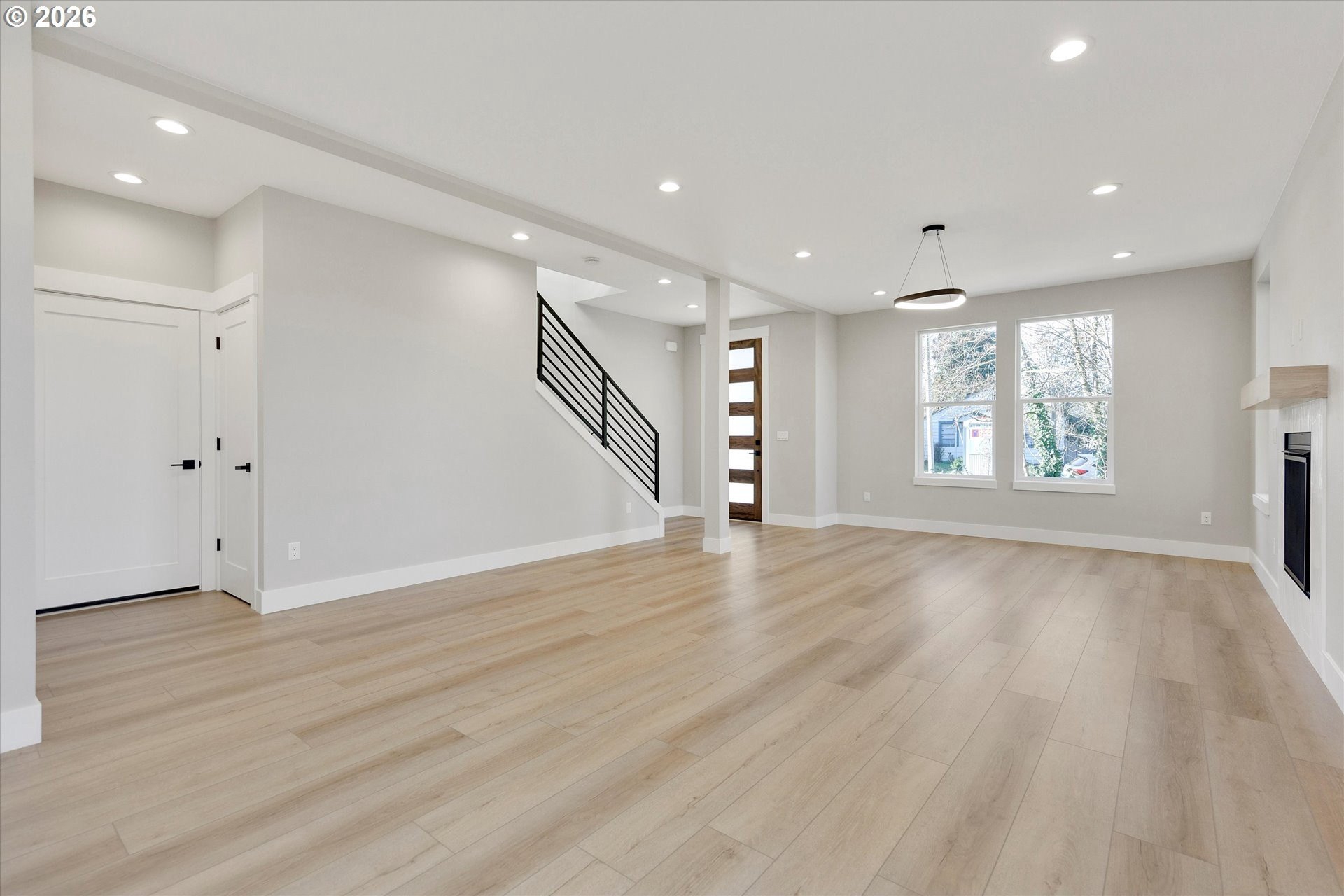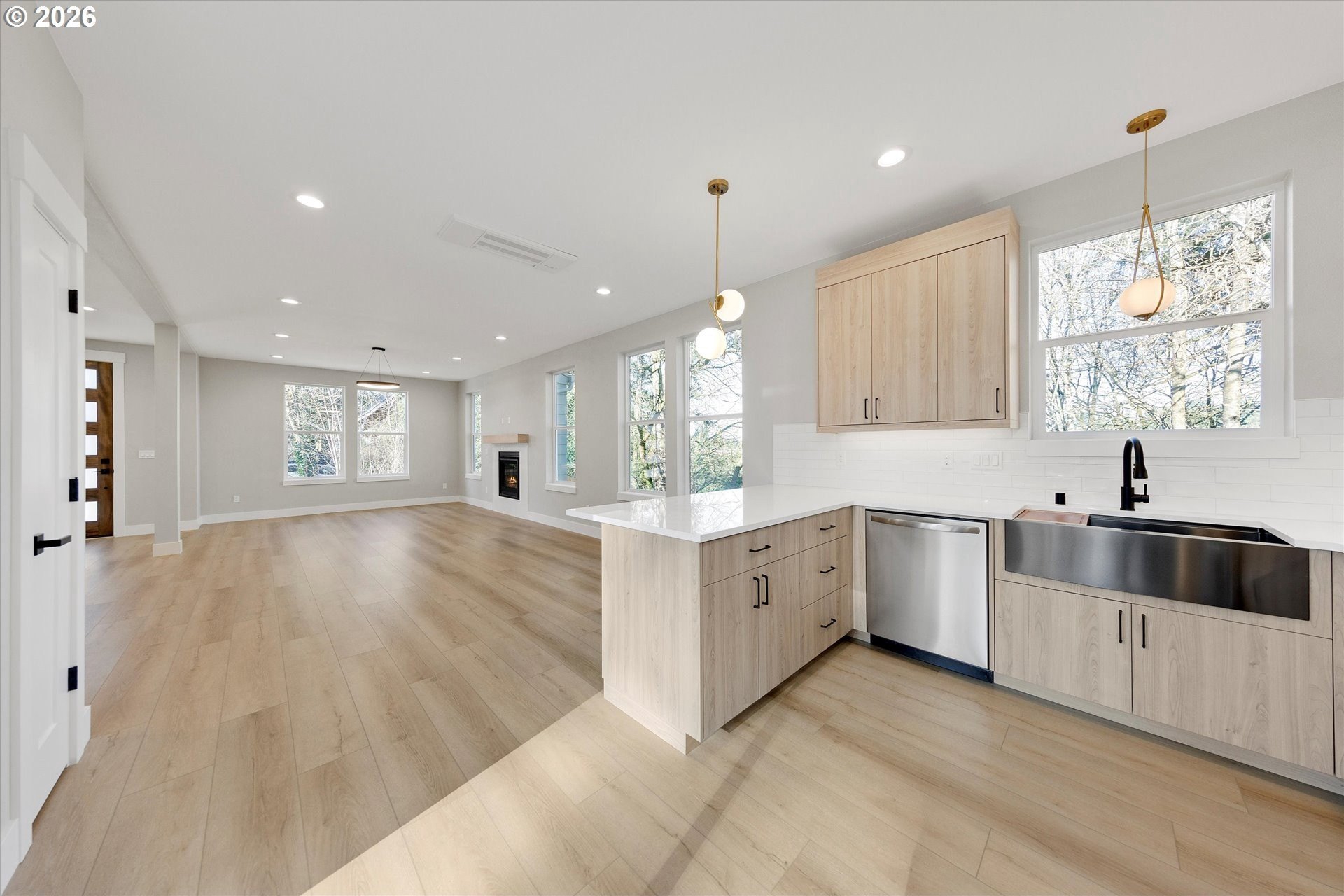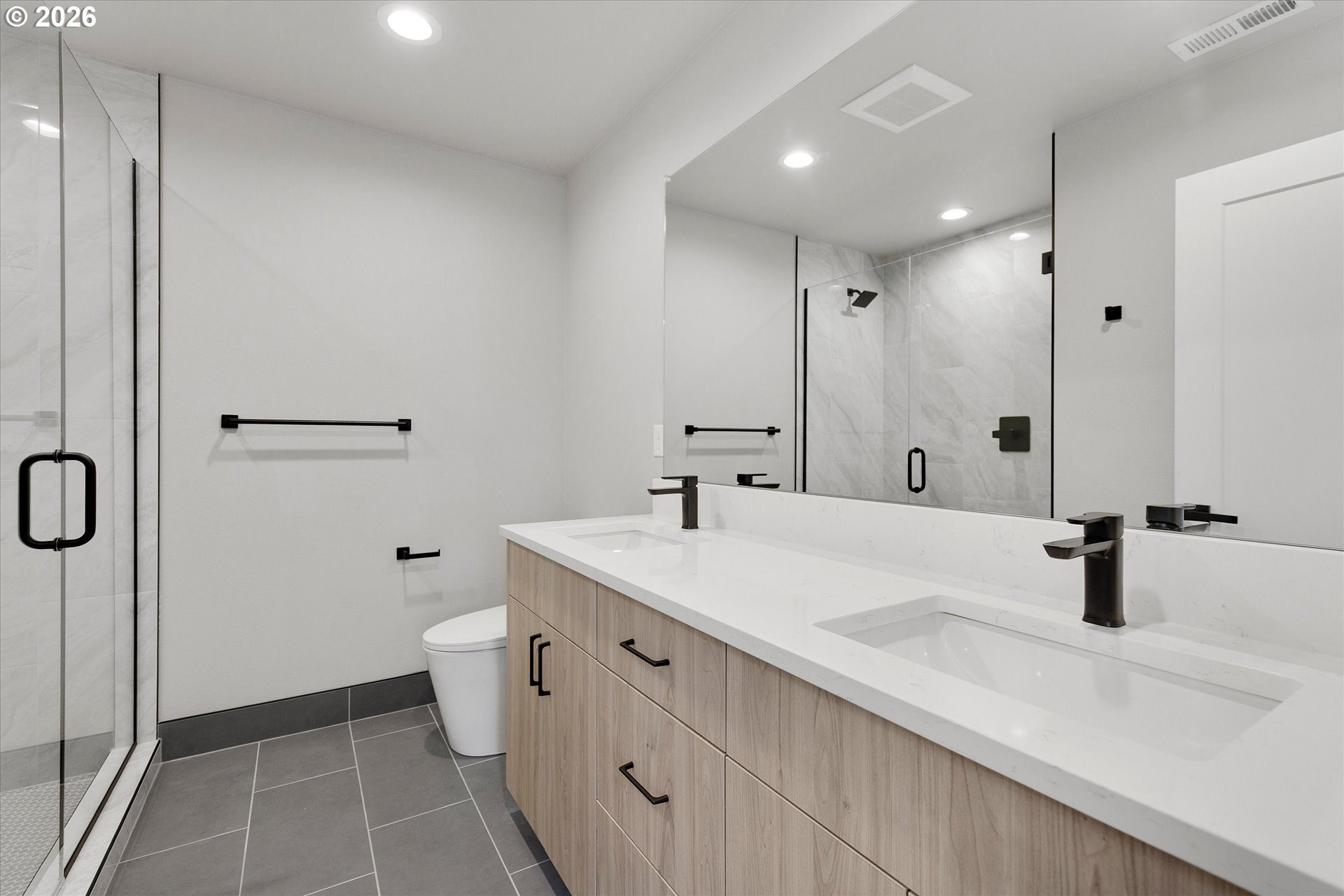 Discover this stunning new construction home set on an expansive 9,000+ sq. ft. lot, offering exceptional privacy and a tranquil, green-buffered setting. From the moment you step inside, an abundance of windows fills the home with natural light and frames serene outdoor views, seamlessly blending indoor and outdoor living. Thoughtful design and meticulous craftsmanship are evident throughout. The open-concept main level effortlessly connects the bright great room with a cozy fireplace, the formal dining area, and the beautifully appointed kitchen-perfect for both entertaining and everyday living. An oversized sliding door extends the living space to a generous covered patio with a BBQ gas hook up, and backyard ideal for relaxing or hosting gatherings. The kitchen features custom cabinetry with under-mount cabinet lighting , quartz countertops, a full suite of stainless steel appliances including refrigerator, and a pantry. Durable laminate flooring flows throughout the main floor, adding style and functionality. Ascend upstairs via a stair case with custom metal railings and step into a sunlit-high ceiling hallway leading to three spacious bedrooms. The primary suite with vaulted ceilings offers a large walk-in closet and a spa-inspired bathroom with a walk-in shower, dual vanity, and heated tile floors. Additional bathroom upstairs also feature heated tile flooring for year-round comfort. Practical amenities enhance everyday living, including a spacious laundry room with built-ins, central heating and cooling upstairs, and a mini-split system on the main level. The oversized garage is equipped with a quiet garage door opener, remotes, and keypad. A dead-end ally behind the lot, and no neighbors peeking in from every direction! Ideally located just minutes from downtown Vancouver, this home provides easy access to shopping, dining, entertainment, and quick freeway access makes it a commuter's dream. Builder's warranty and seller's concessions are available.